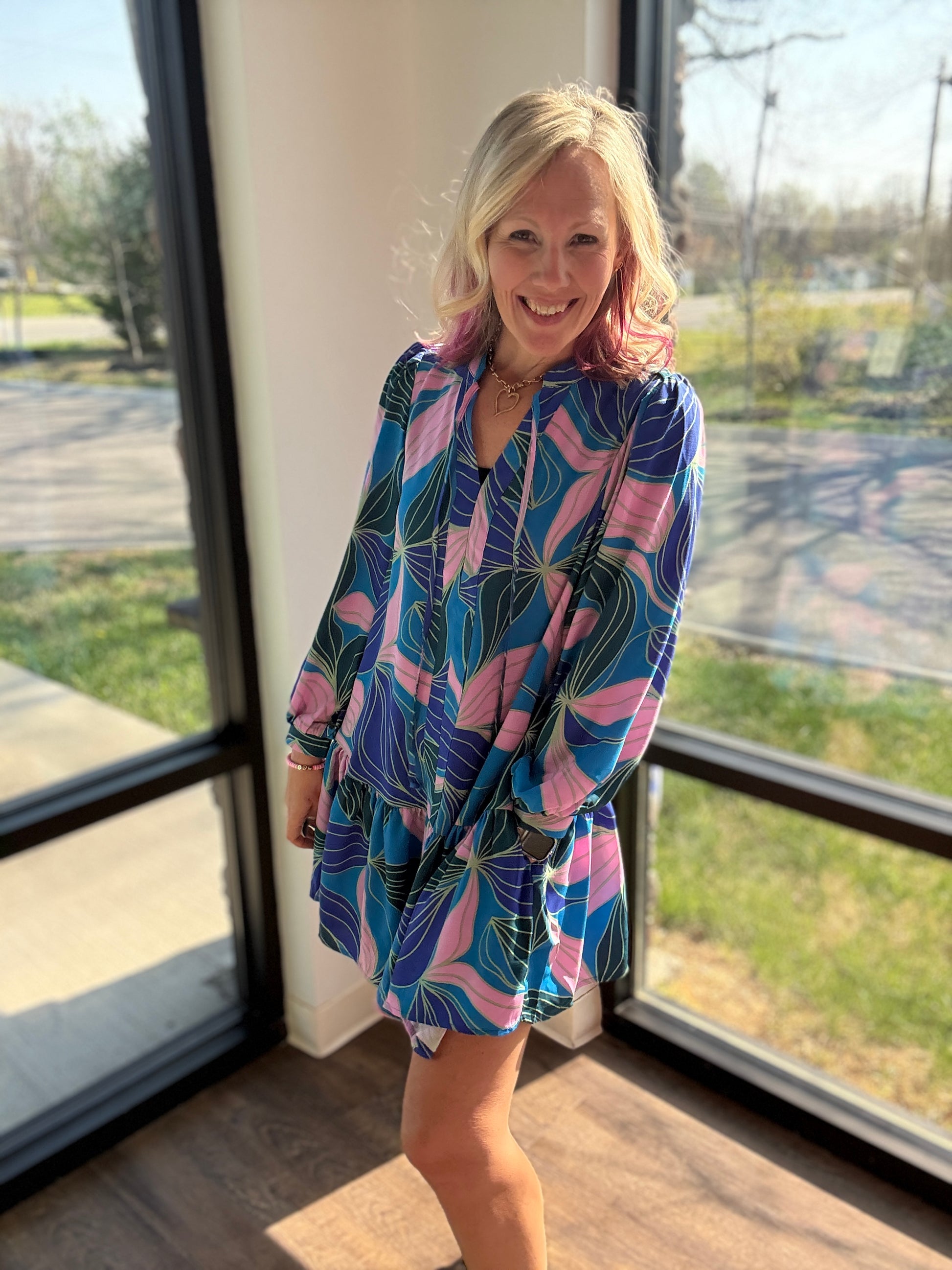 Bright, breezy, and effortlessly beautiful — the Glow Over Blue Dress is the kind of piece that instantly lifts your look. Designed in a vibrant cobalt blue with a soft floral and leaf pattern, it brings the perfect mix of bold color and feminine detail.