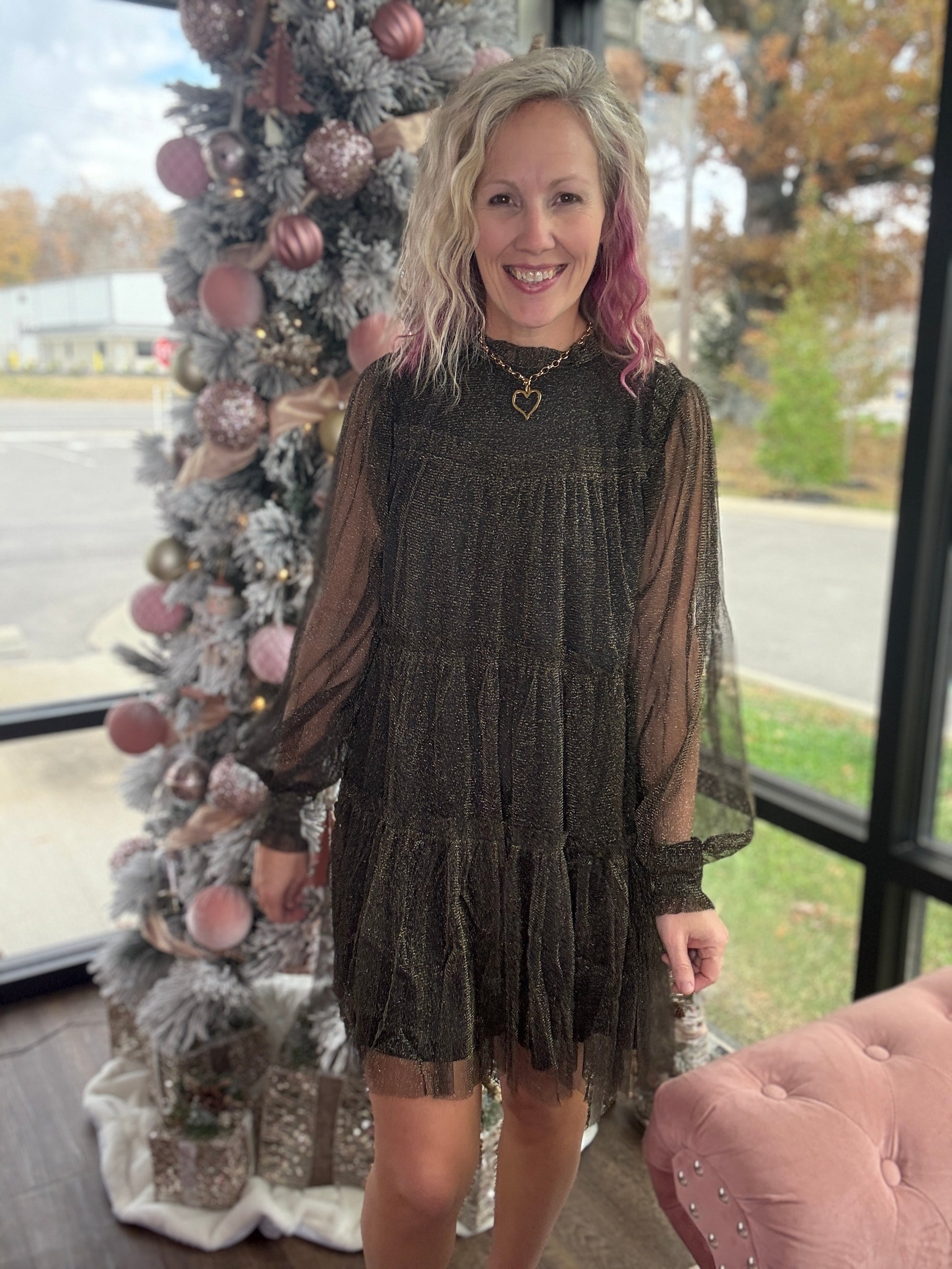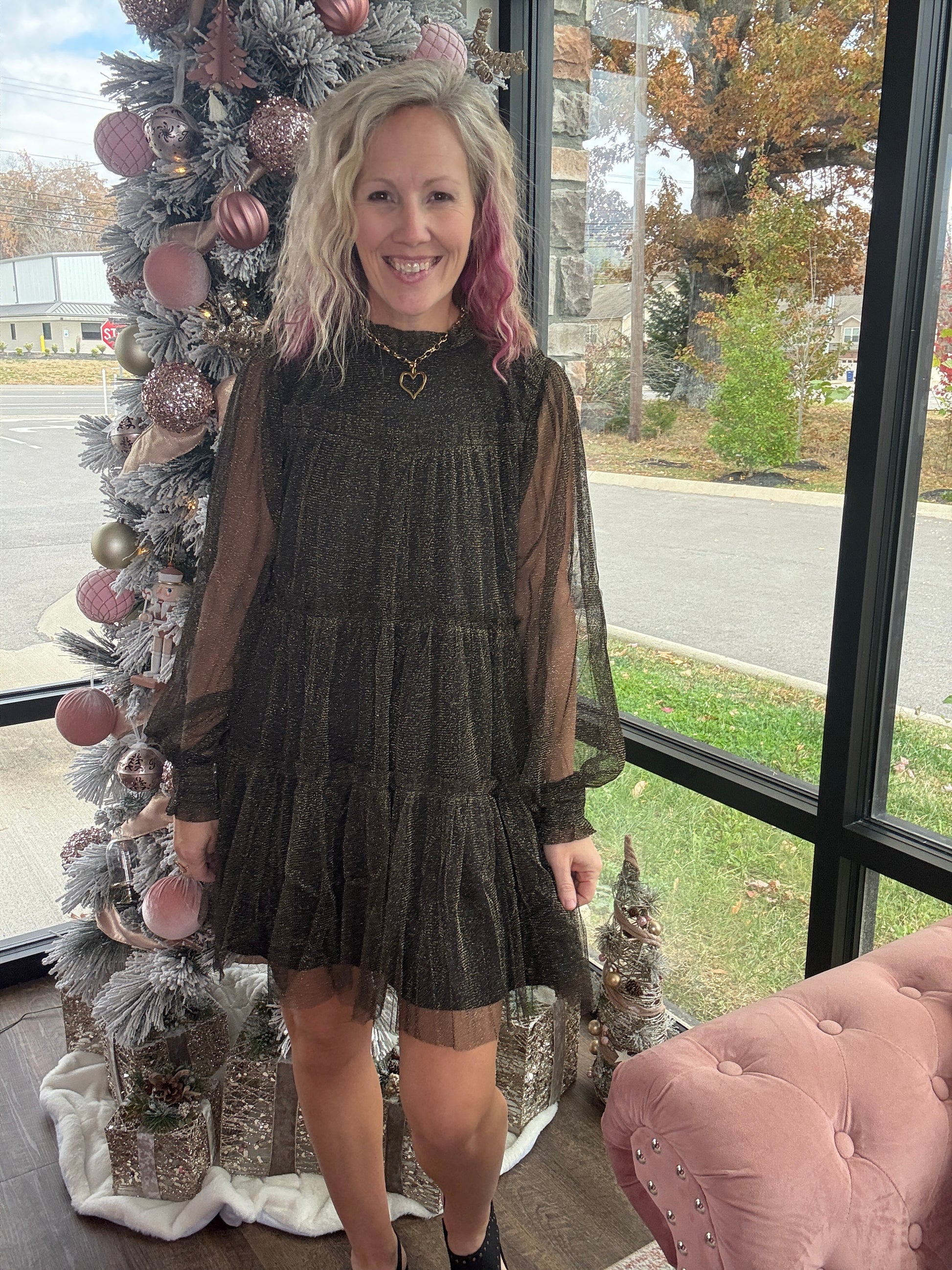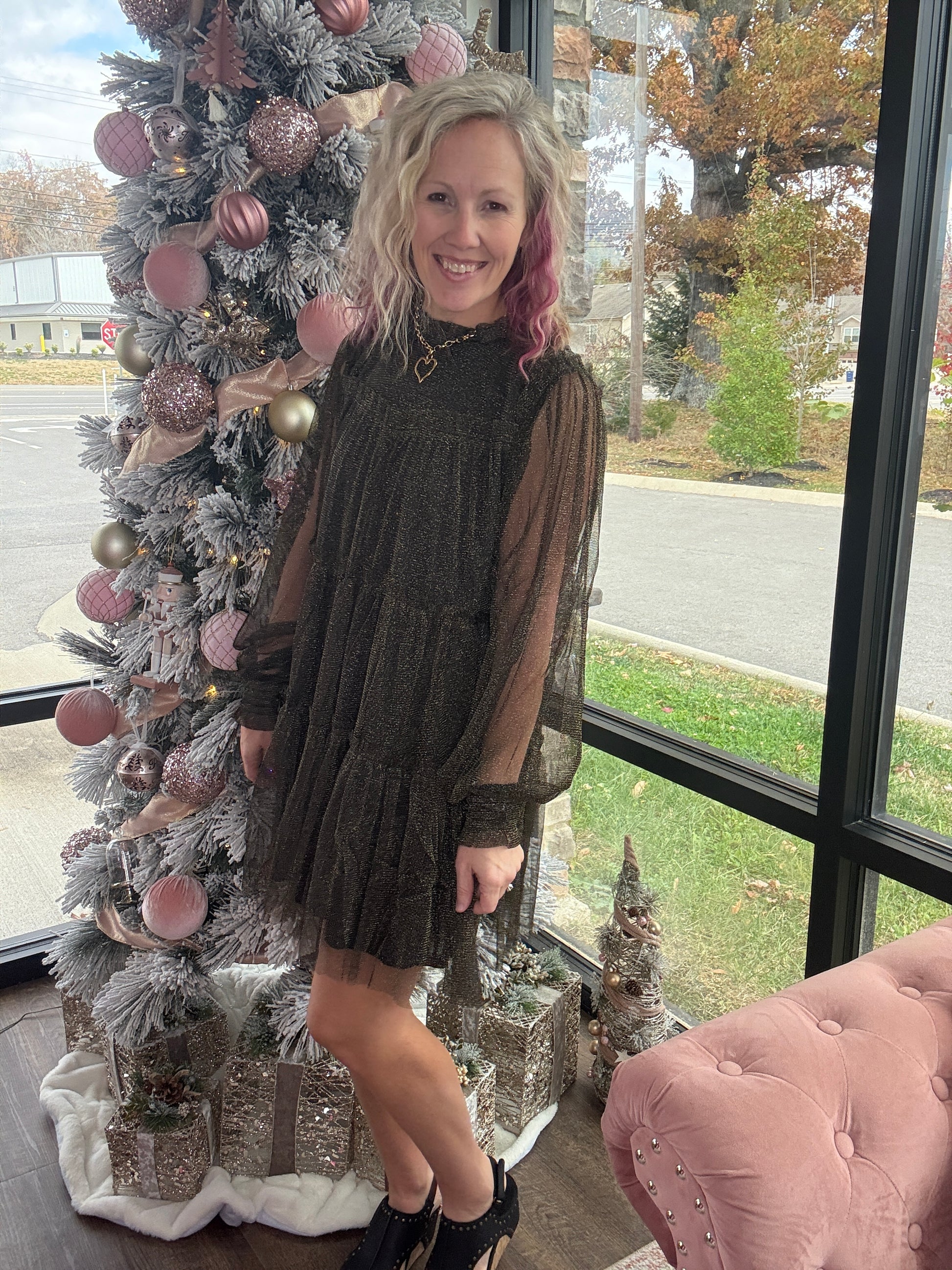 The Golden Glow Dress brings just the right amount of sparkle to every seasonal celebration. Featuring a classic black underlay topped with a shimmering gold chiffon overlay, this dress catches the light beautifully without feeling over the top. The above-the-knee length keeps it flirty and festive, making it perfect for Christmas gatherings, New Year’s parties, and all the holiday events in between. Effortless to wear and stunning from every angle, it’s the standout piece your wardrobe needs for the season.