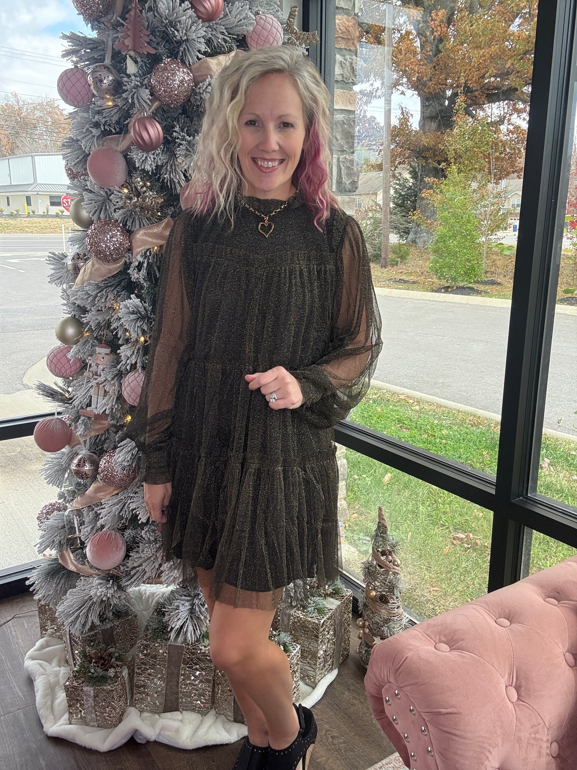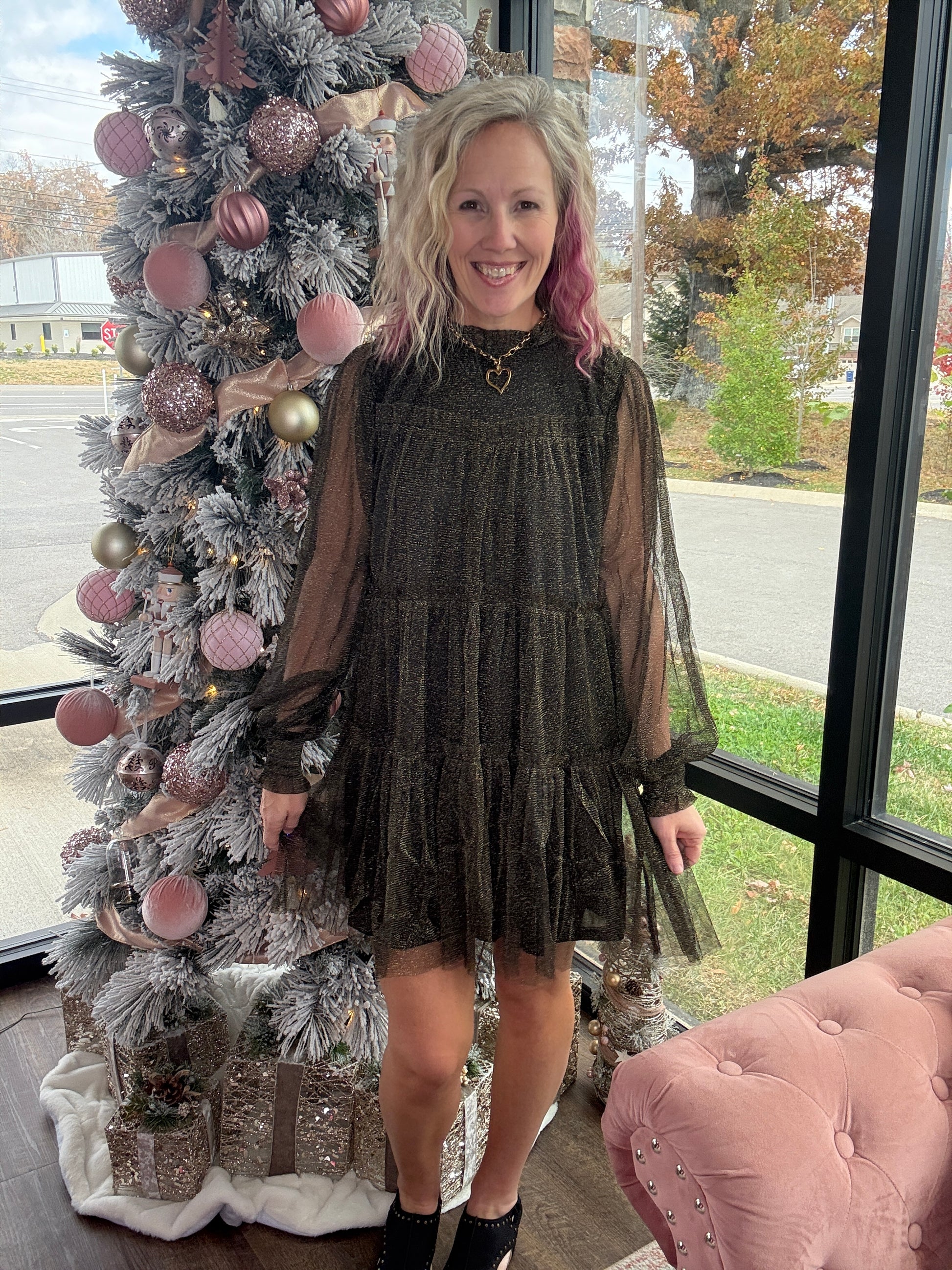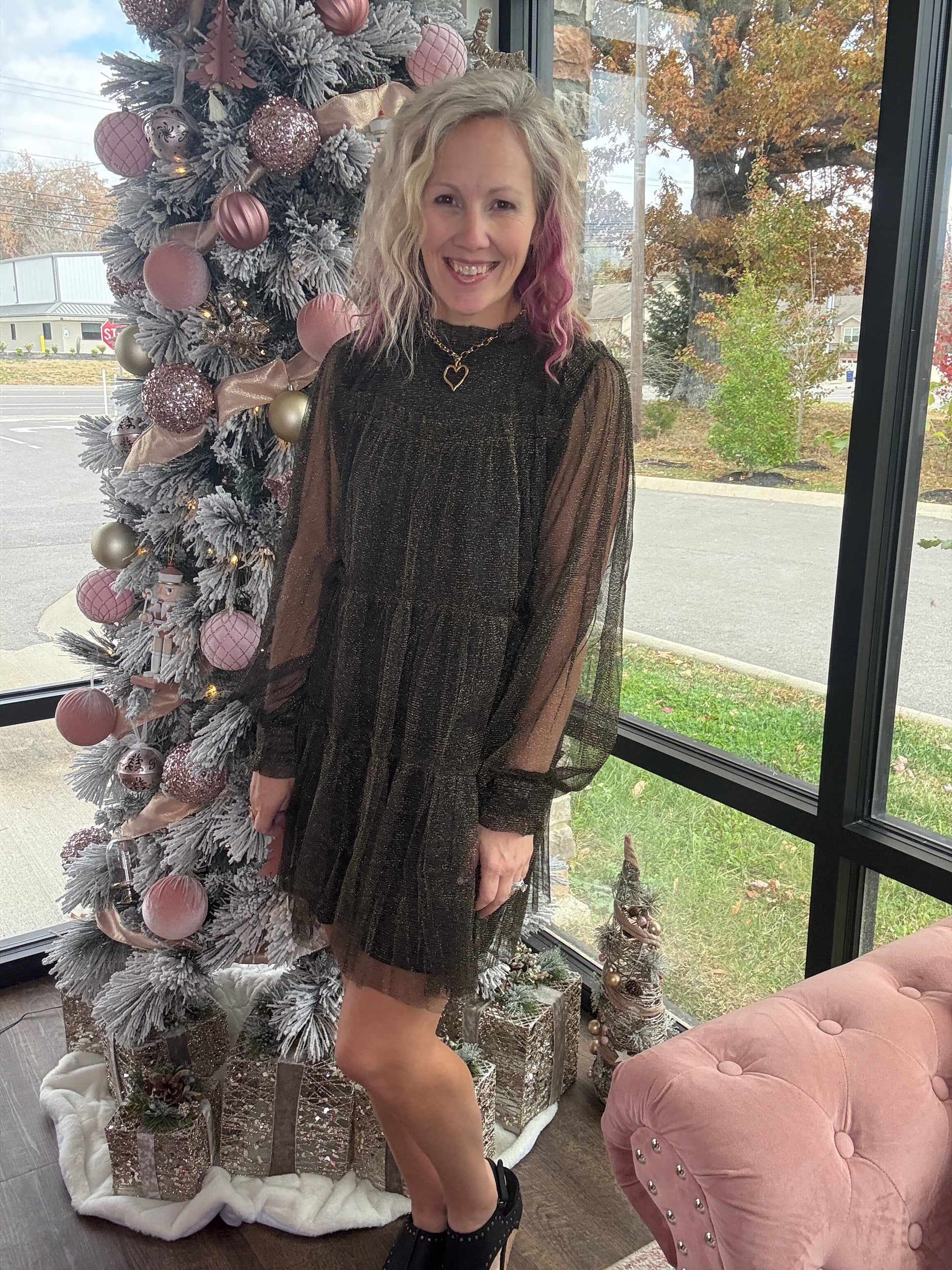 The Golden Glow Dress brings just the right amount of sparkle to every seasonal celebration. Featuring a classic black underlay topped with a shimmering gold chiffon overlay, this dress catches the light beautifully without feeling over the top. The above-the-knee length keeps it flirty and festive, making it perfect for Christmas gatherings, New Year’s parties, and all the holiday events in between. Effortless to wear and stunning from every angle, it’s the standout piece your wardrobe needs for the season.