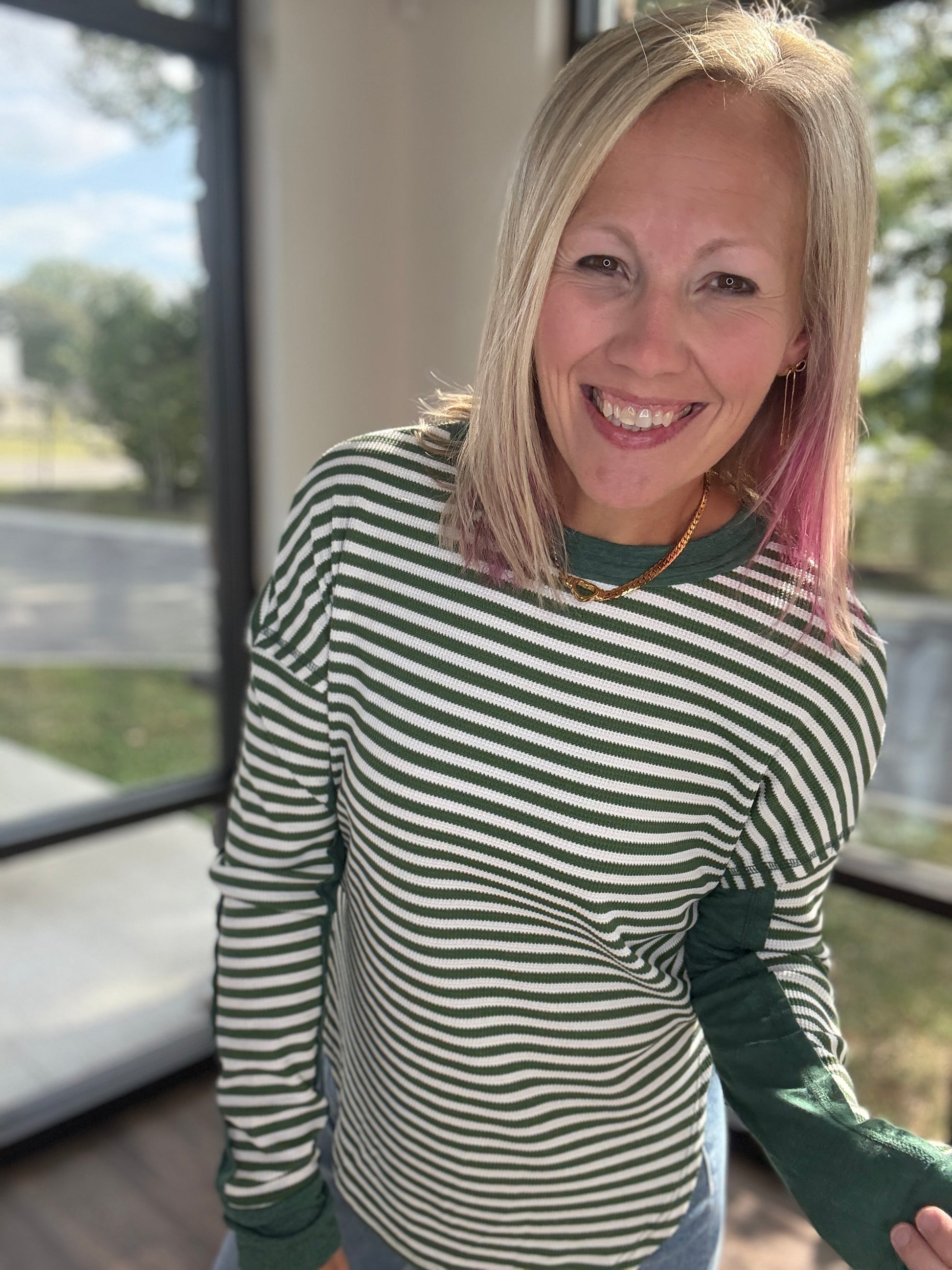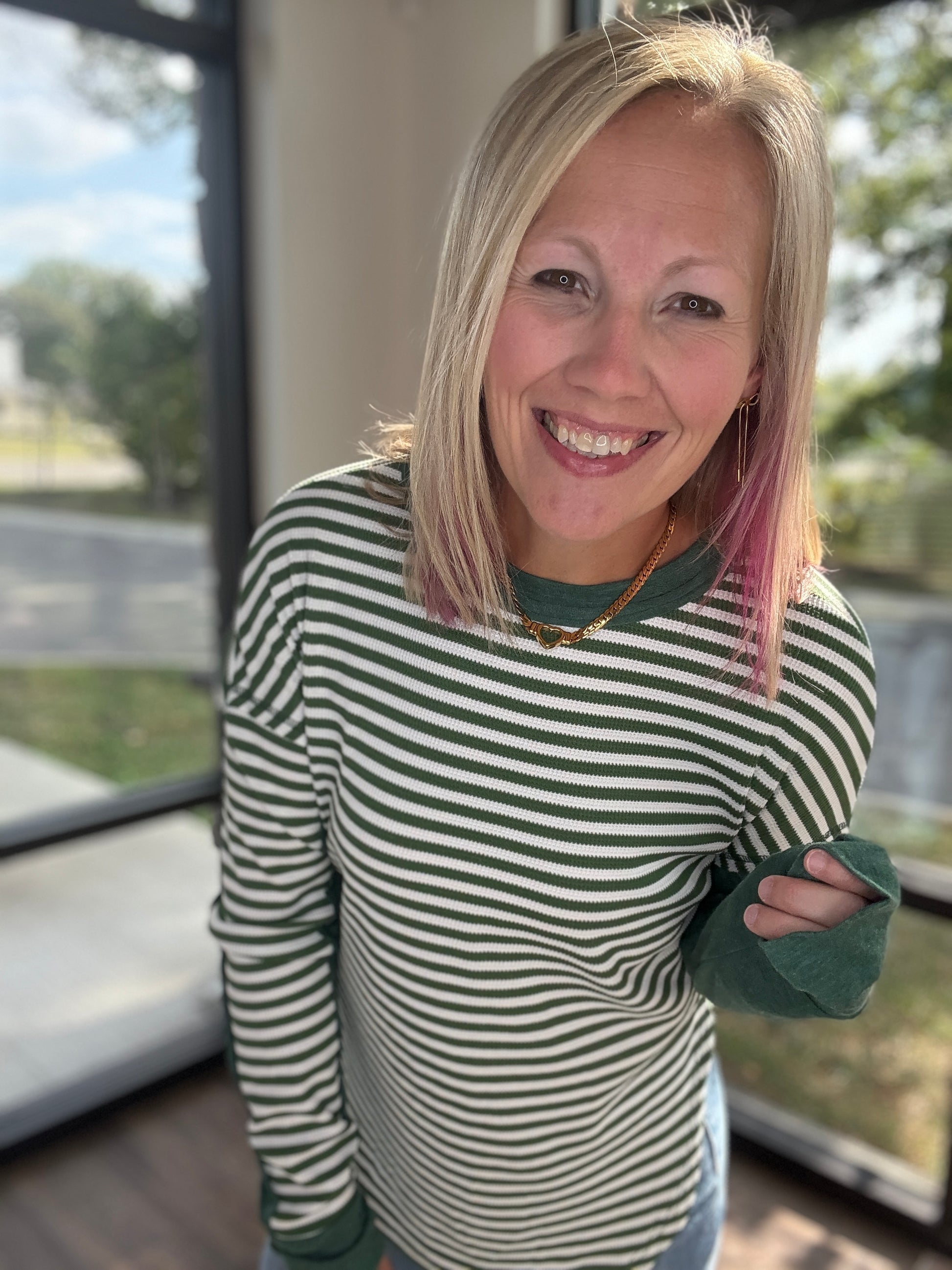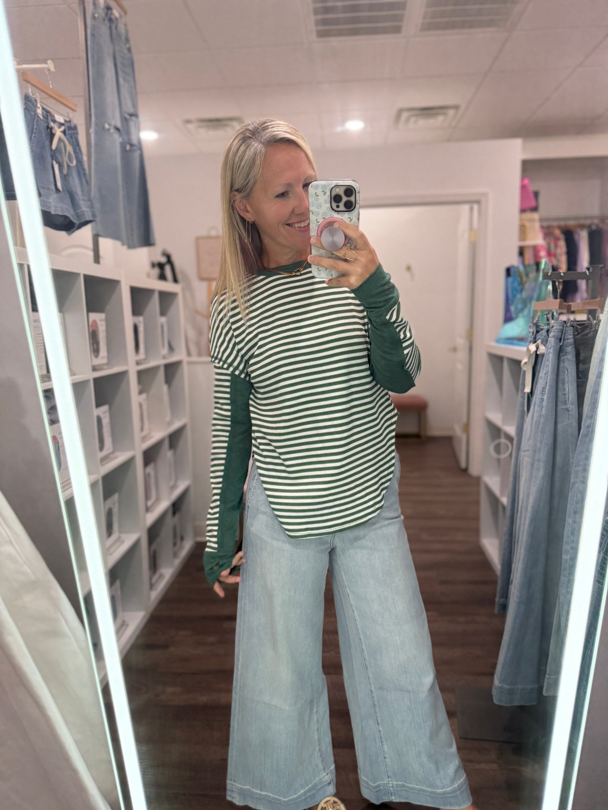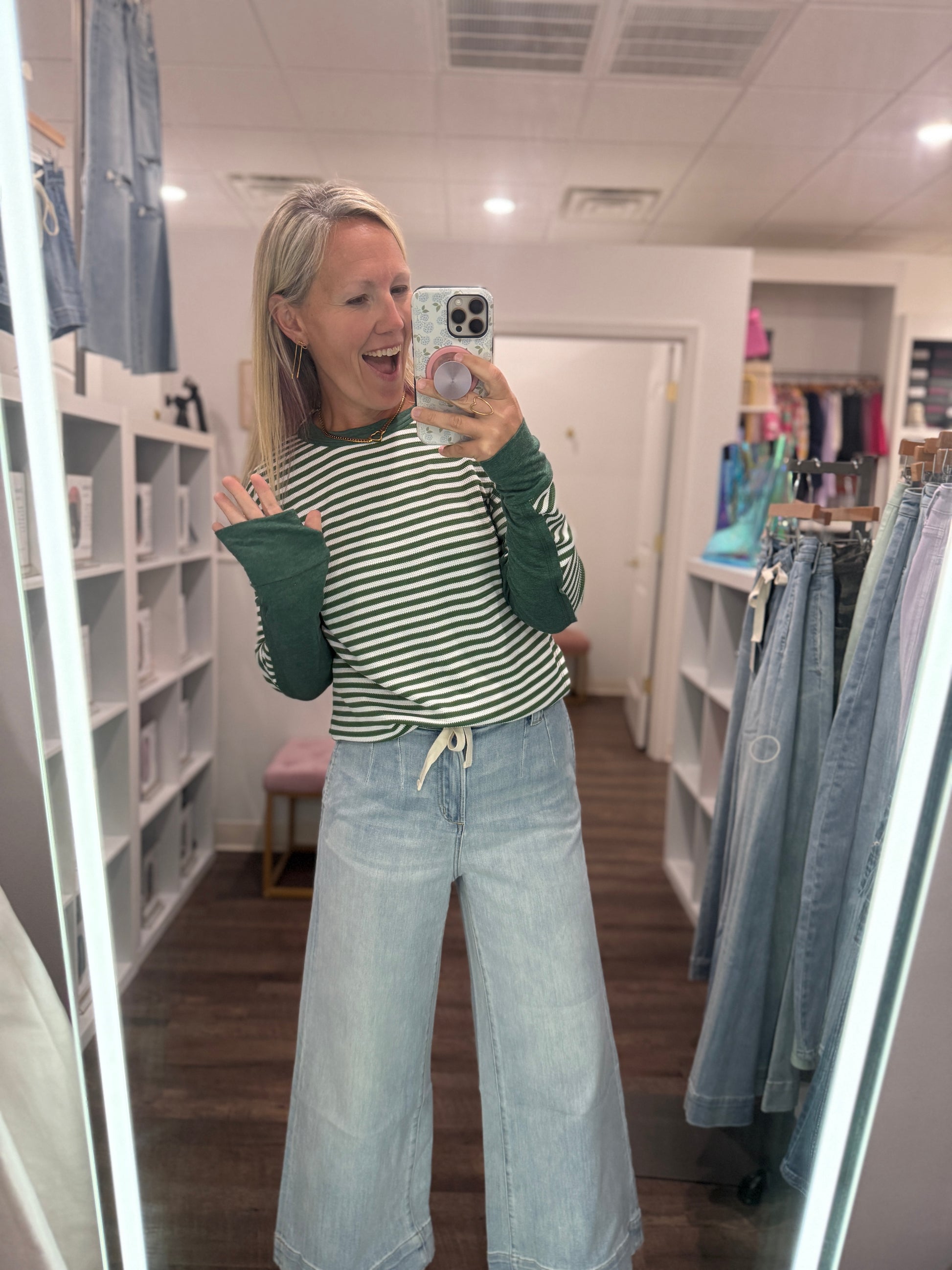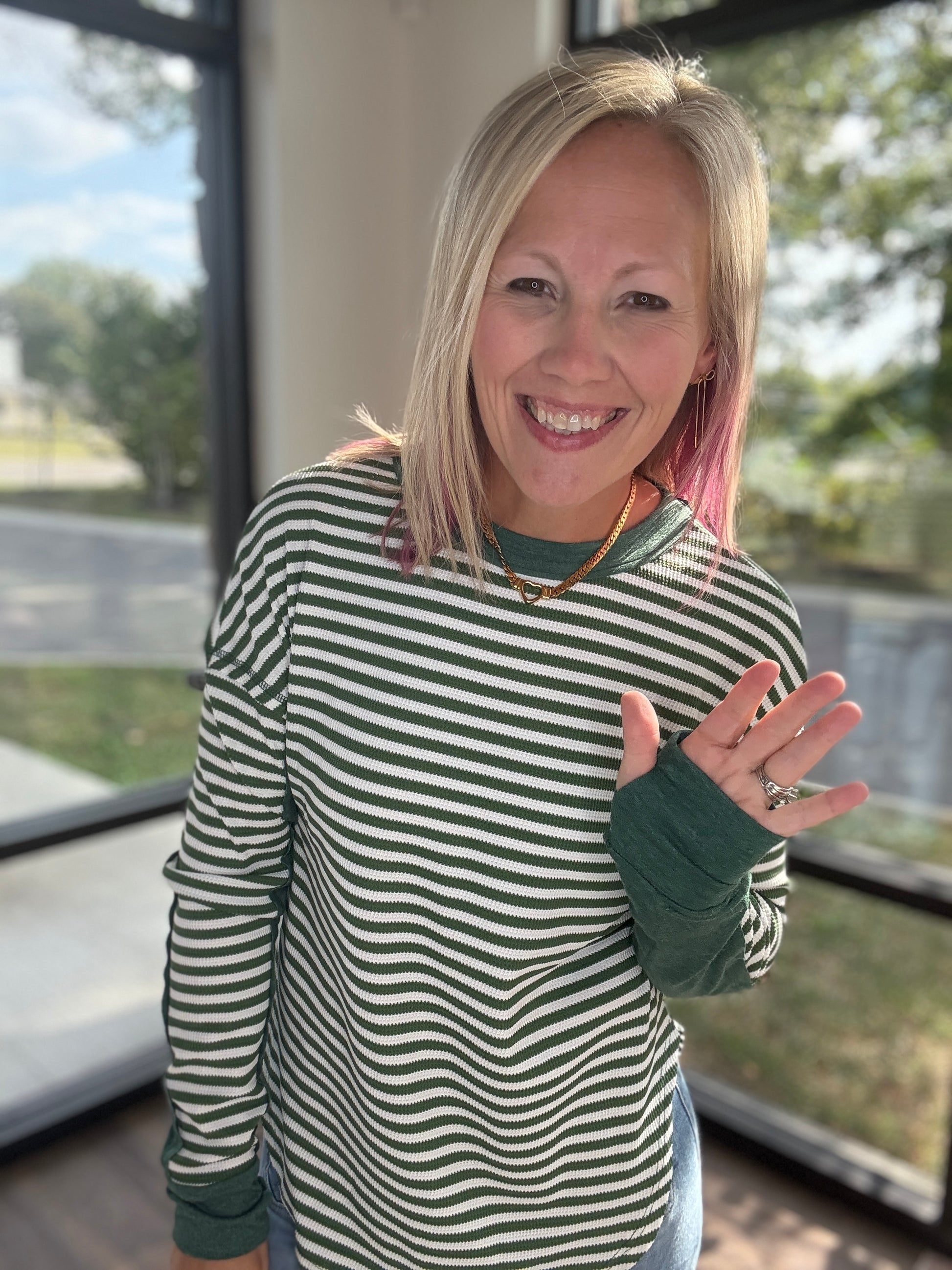 The earthy green and cream stripes bring instant autumn vibes, while the long sleeves come with built-in thumb holes (because cozy hands are happy hands). Easy to throw on with jeans, leggings, or layered under a vest, it’s the kind of top you’ll reach for on repeat.