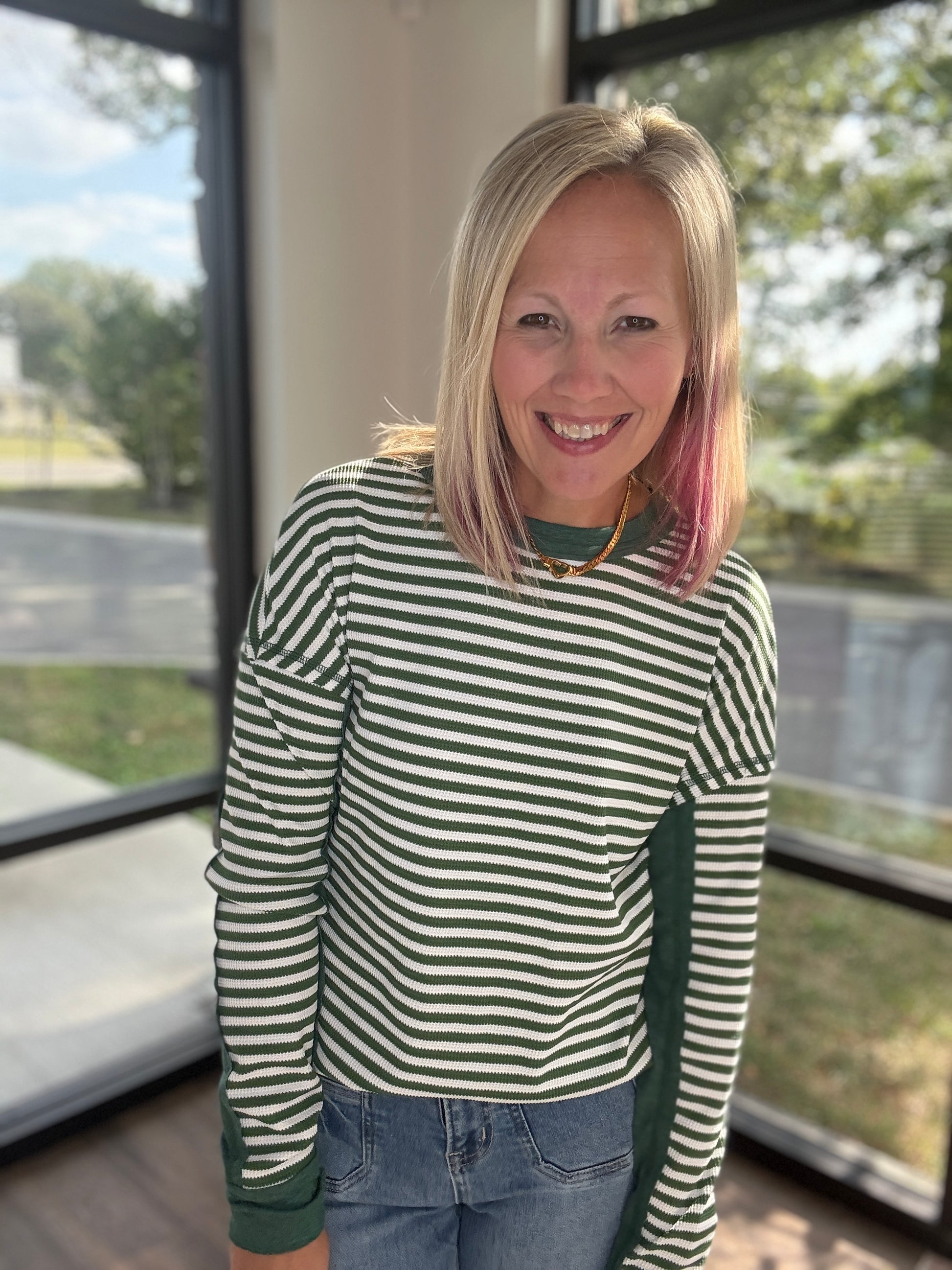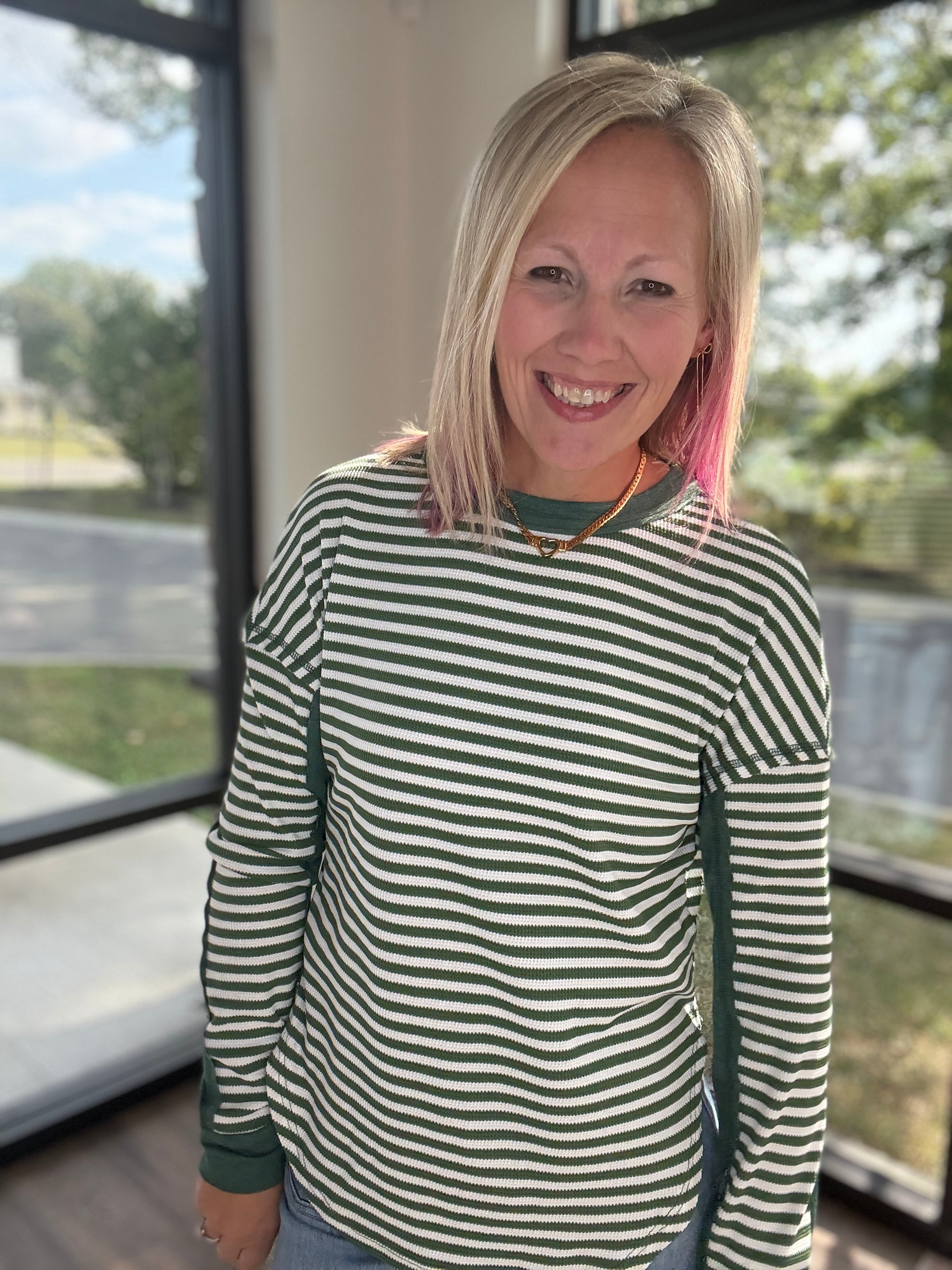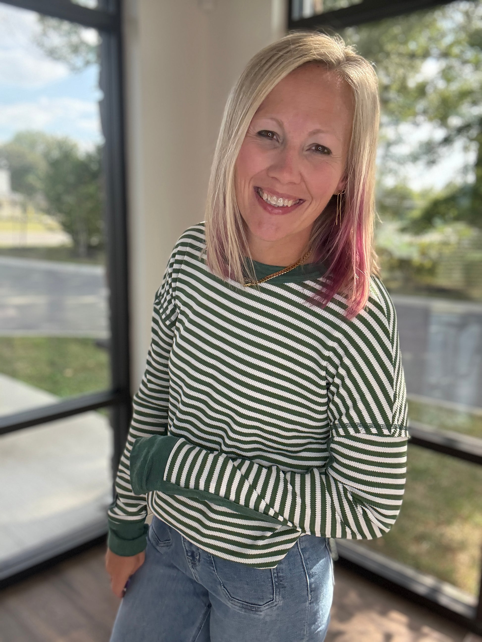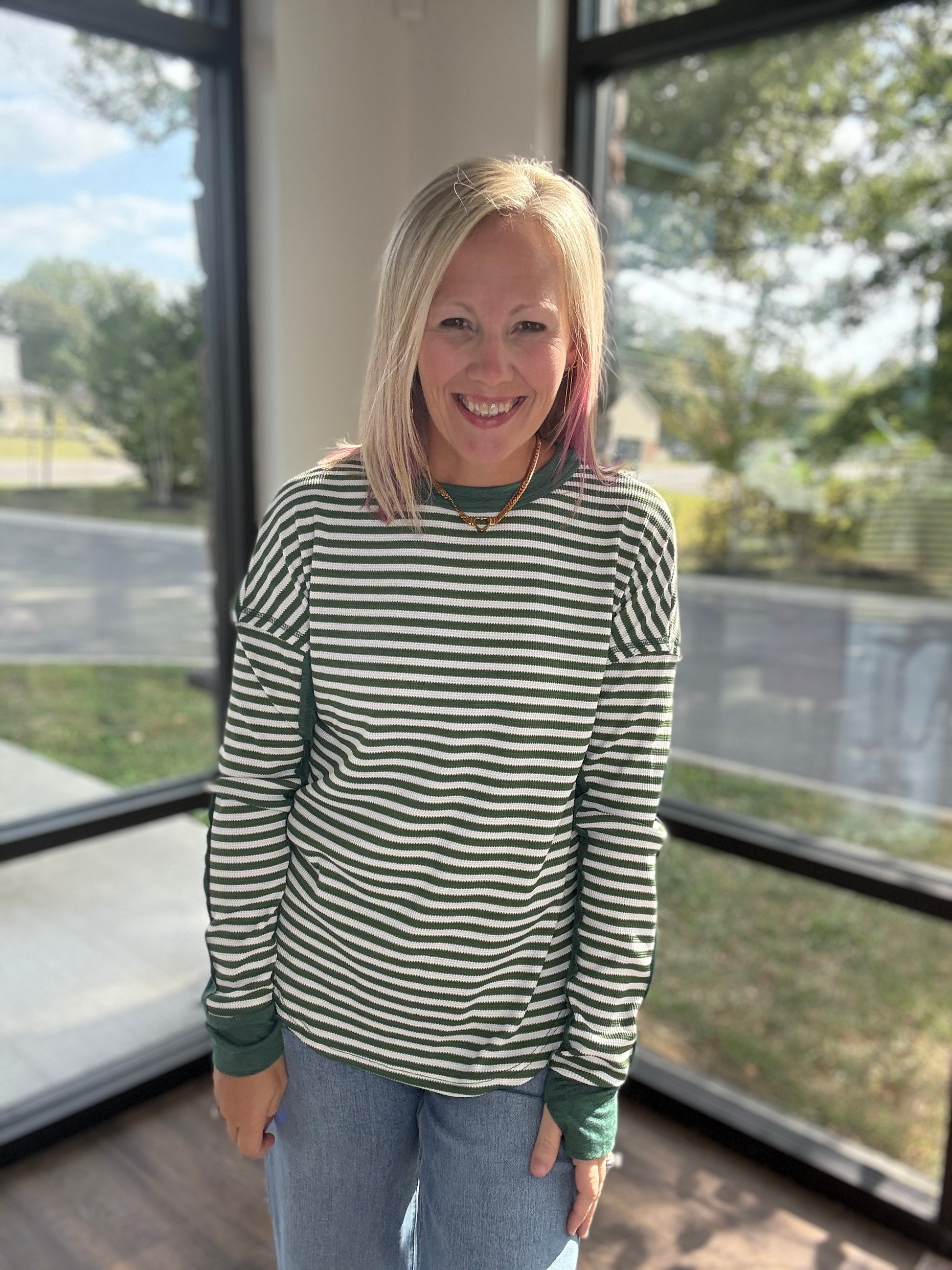 The Green + Cream Stripe Waffle Top is giving all the cozy fall feels with a side of effortlessly cute. Made from soft waffle knit with a perfectly textured feel, it features raw hem details for that lived-in, laid-back look you love.