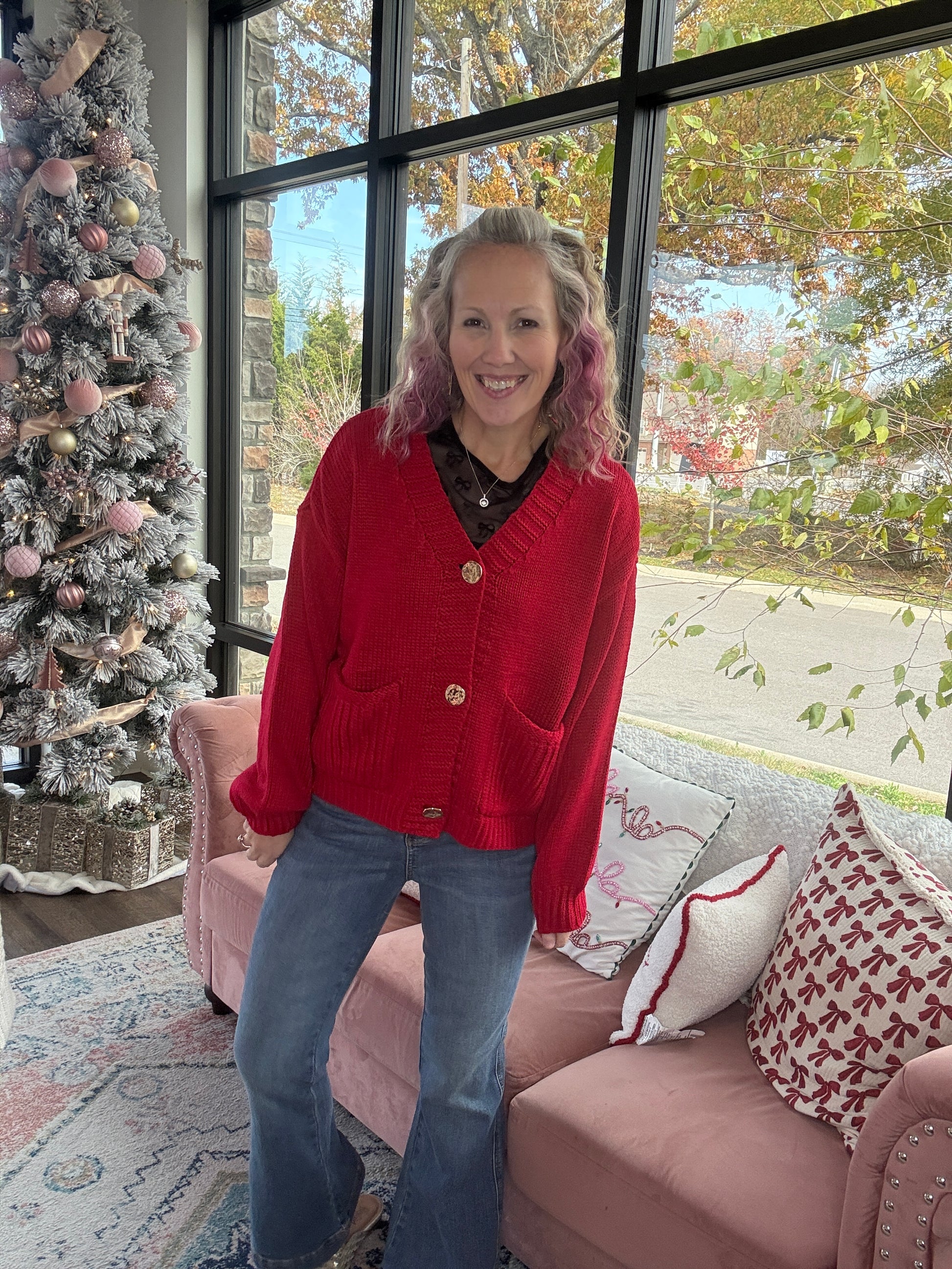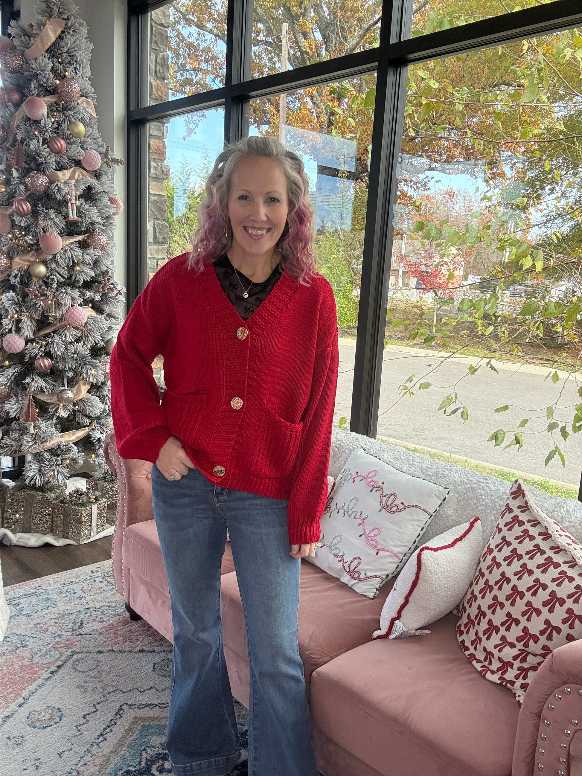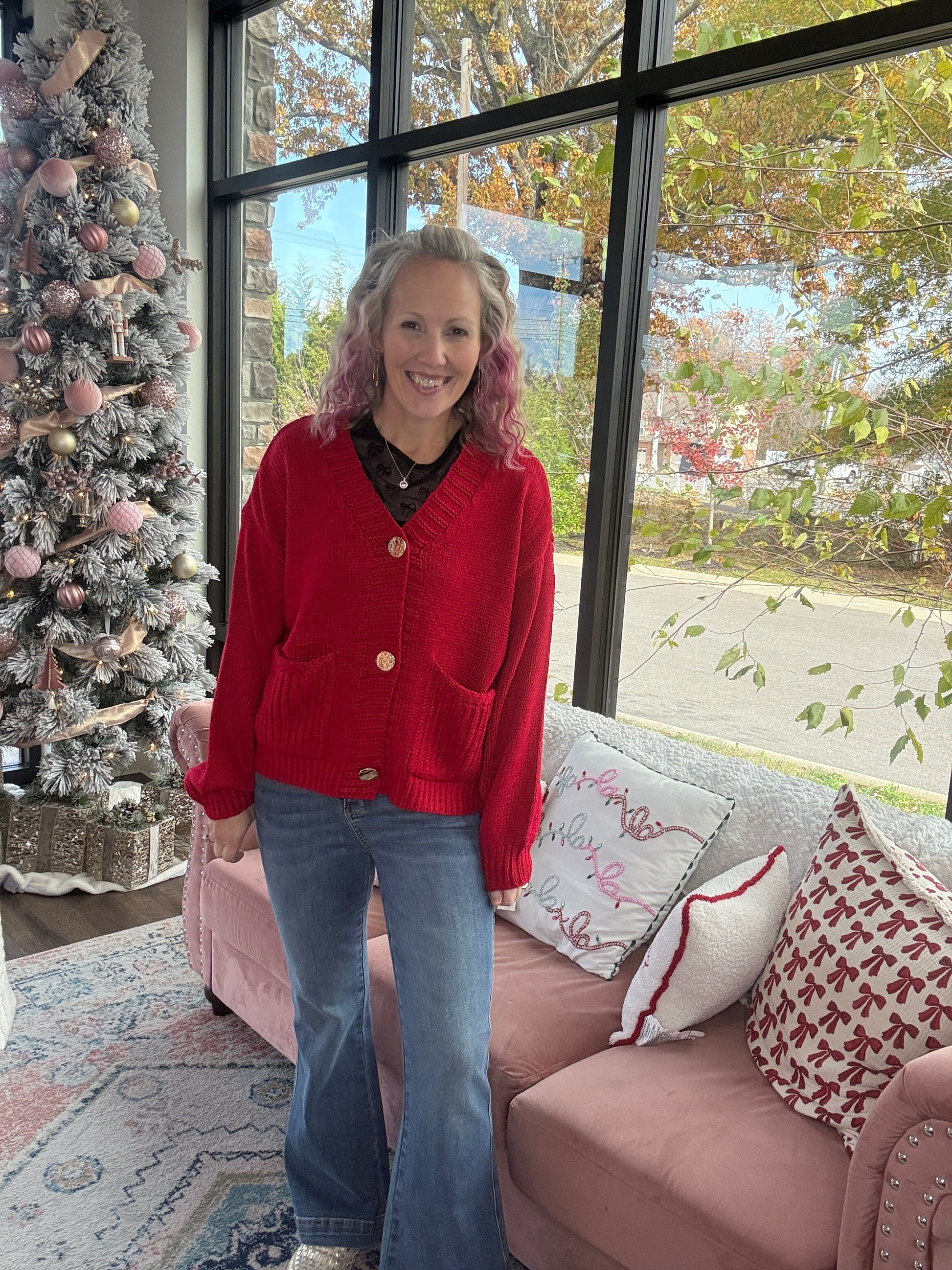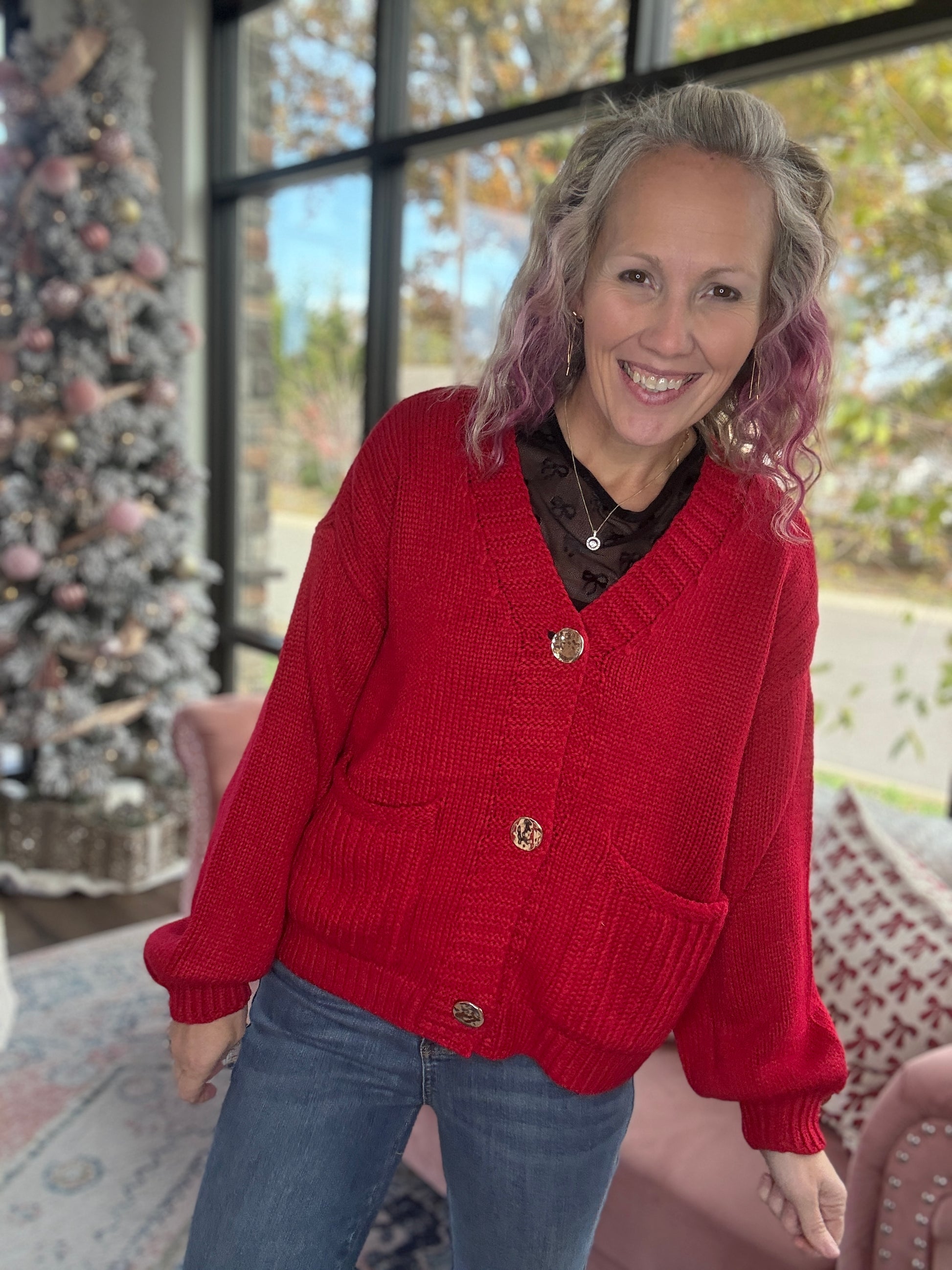 The Harper Knit Cardigan is a bold, timeless layer designed to stand out in your wardrobe well beyond one season. Made in a rich red chunky knit, this button-up cardigan features oversized gold buttons and front patch pockets for a polished, elevated look. The fit is relaxed without being bulky, making it easy to style with denim, trousers, or even layered over dresses.