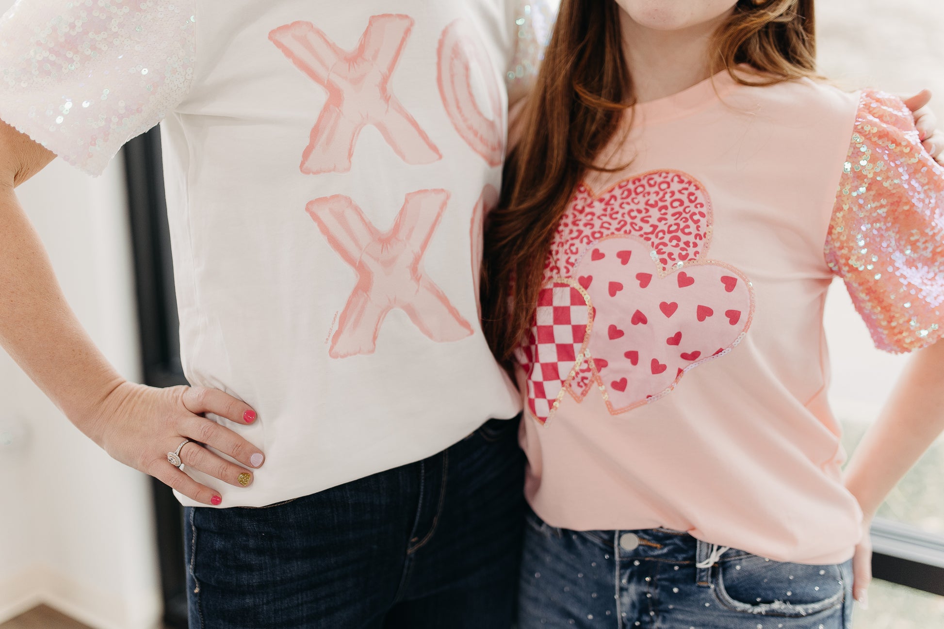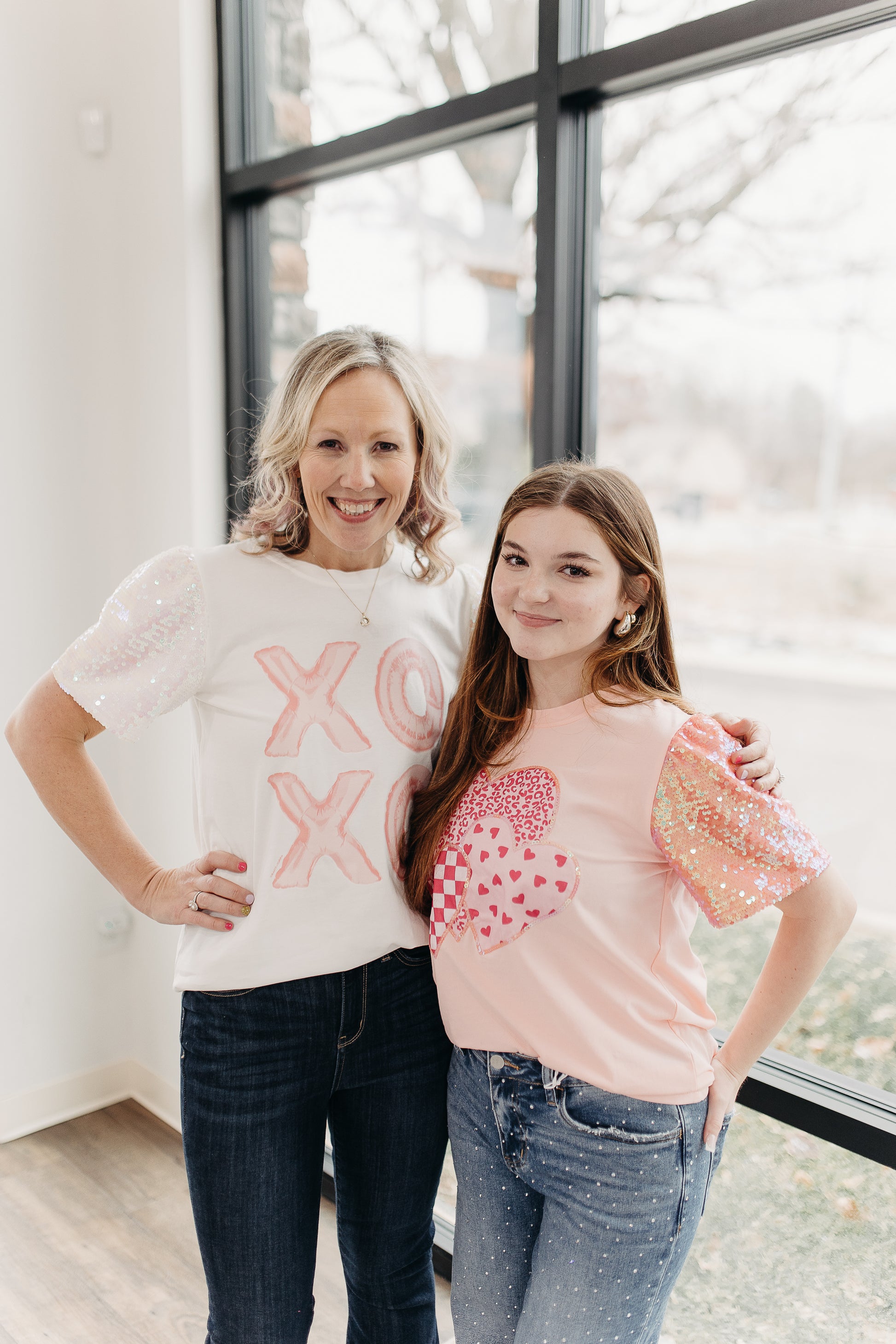 For the love of sequins! We are loving this fun top with hearts and pink sequins sleeves! Super soft knit bodice with fun sequins sleeves!