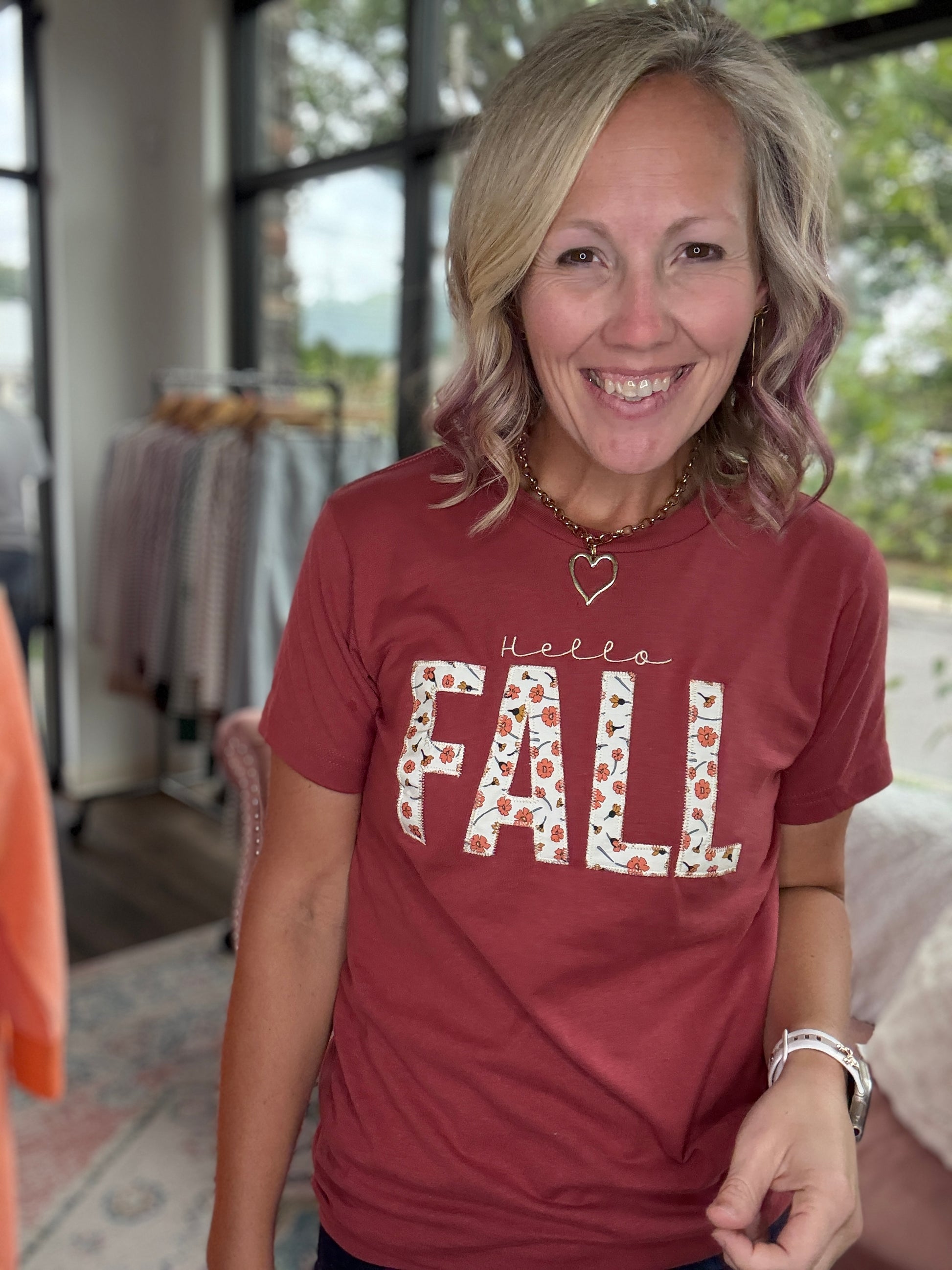 Welcome the season in cozy style with the Hello Fall Appliqué Tee. This warm brown tee features the sweetest embroidered “FALL” letters, each with charming appliqué detail that adds texture and personality.