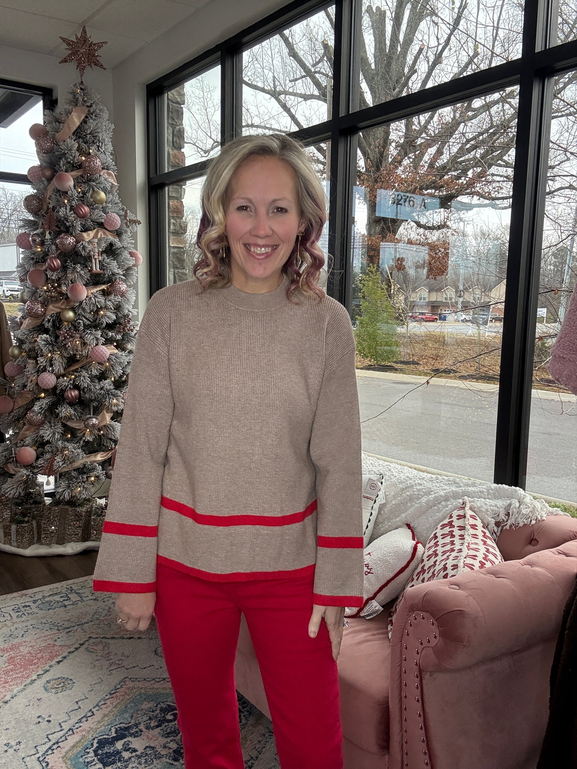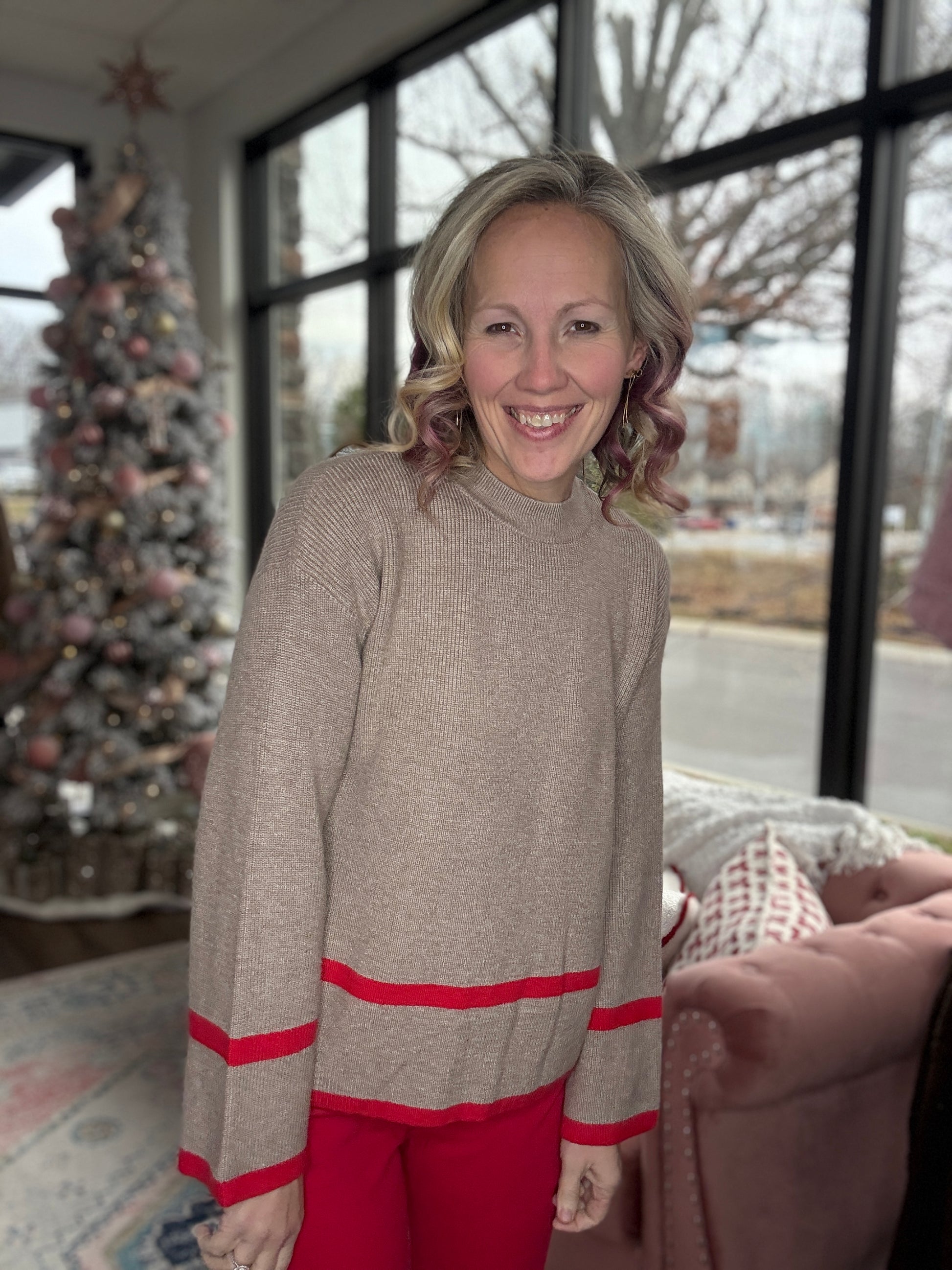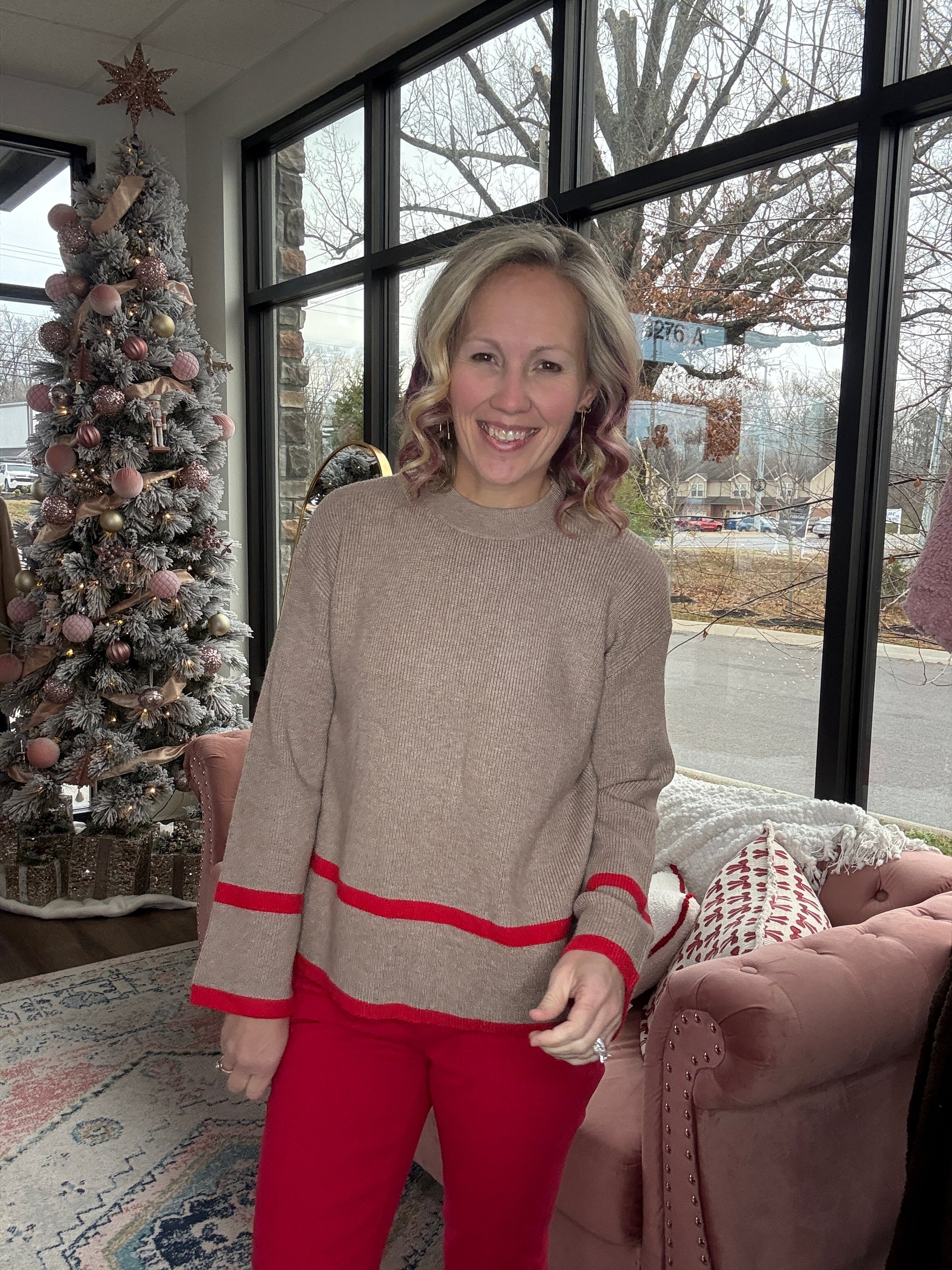 A timeless piece with a subtle pop of festive color