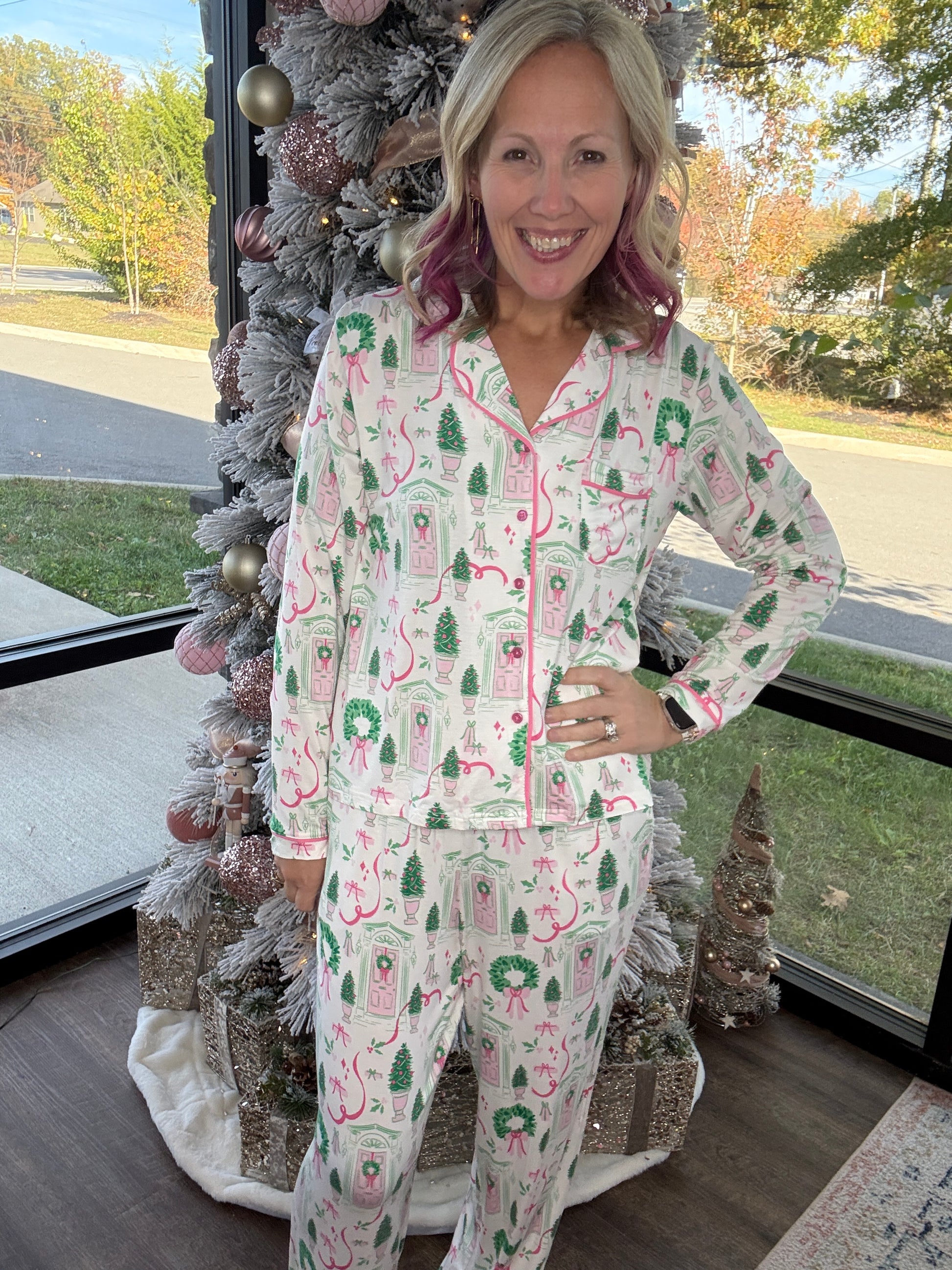 Introducing our Home for Christmas Pajama Set, where comfort meets festive charm. Perfect for sipping cocoa by the tree or enjoying Christmas morning in cozy style, this pajama set brings holiday cheer to every moment. Featuring a long-sleeve button-front top with a classic collar and straight-leg pants with an adjustable drawstring, our Home for Christmas Pajama Set combines classic holiday style with all-day comfort.