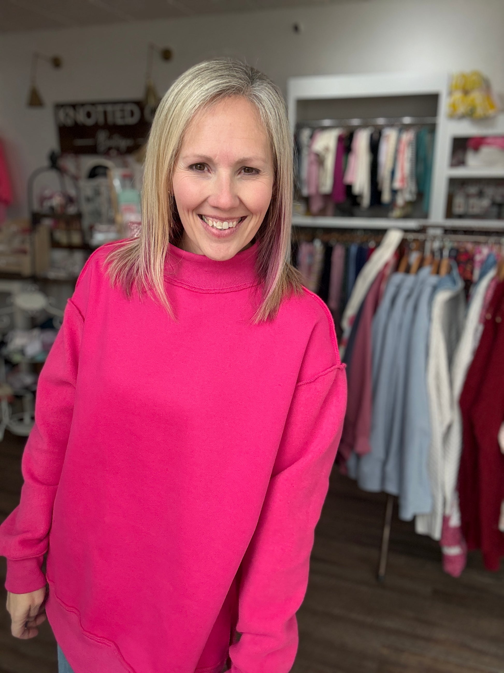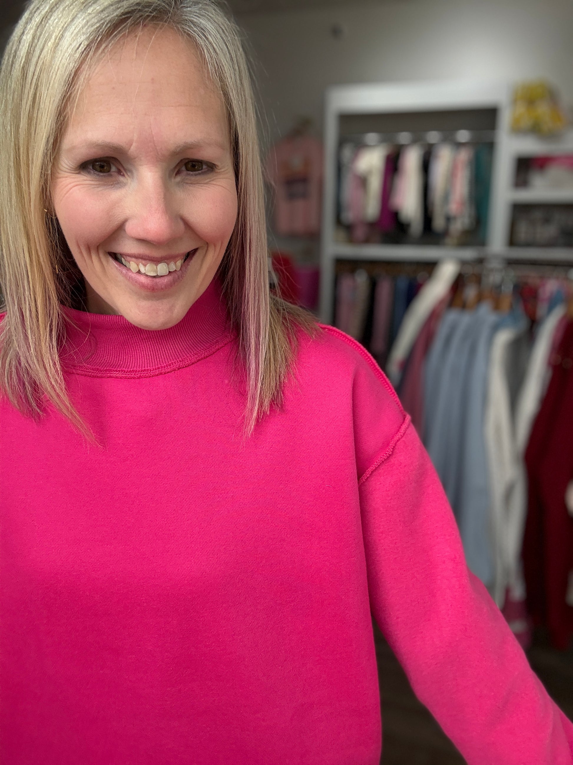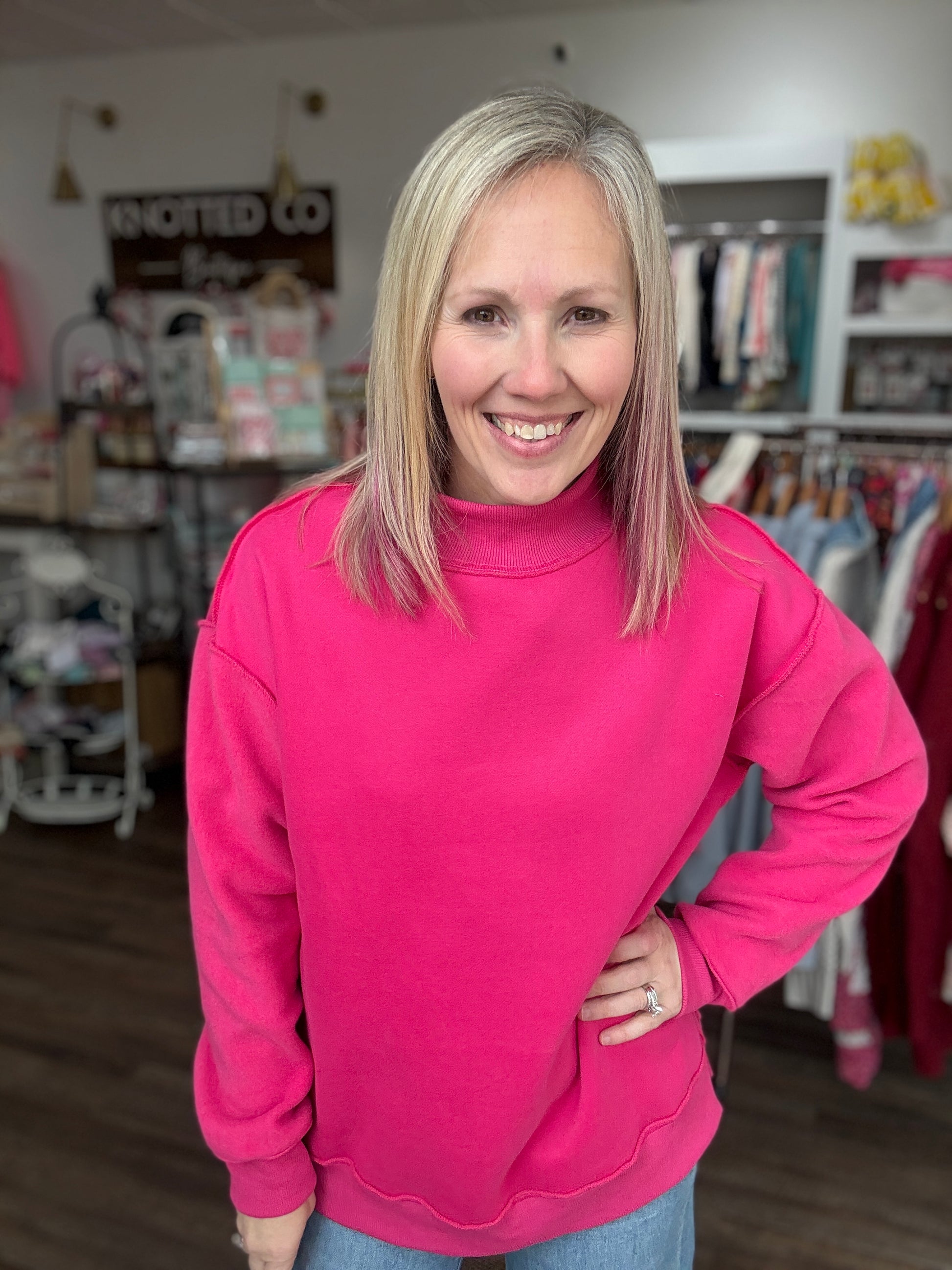 Double the style, double the fun. The Inside Out Icon Mockneck is the ultimate statement sweatshirt for trend lovers who want versatility without sacrificing comfort. Designed in a bold hot pink, this oversized favorite can be worn two ways—flip it inside out for an edgy, raw vibe or keep it classic for a clean, polished look.