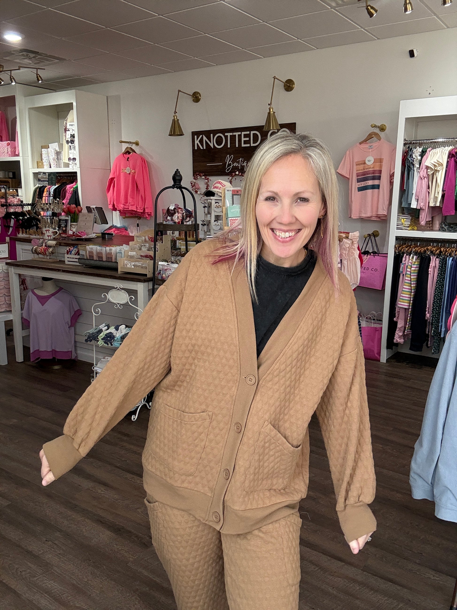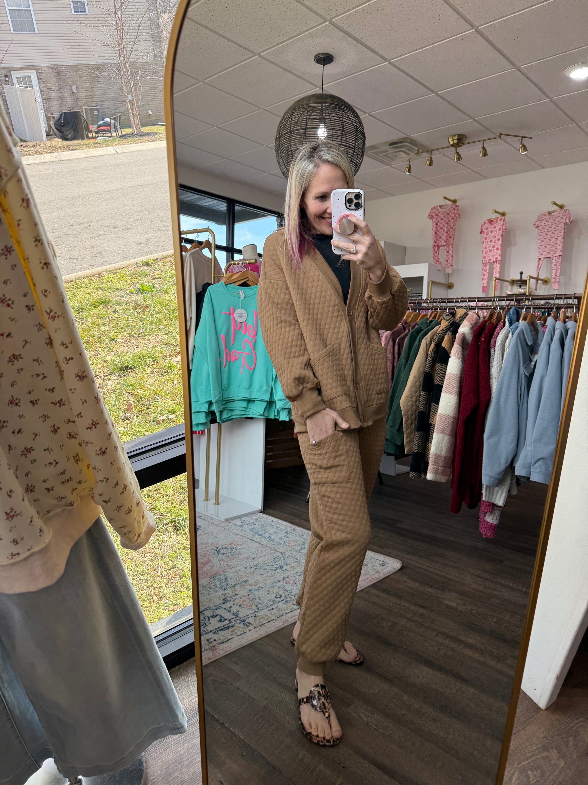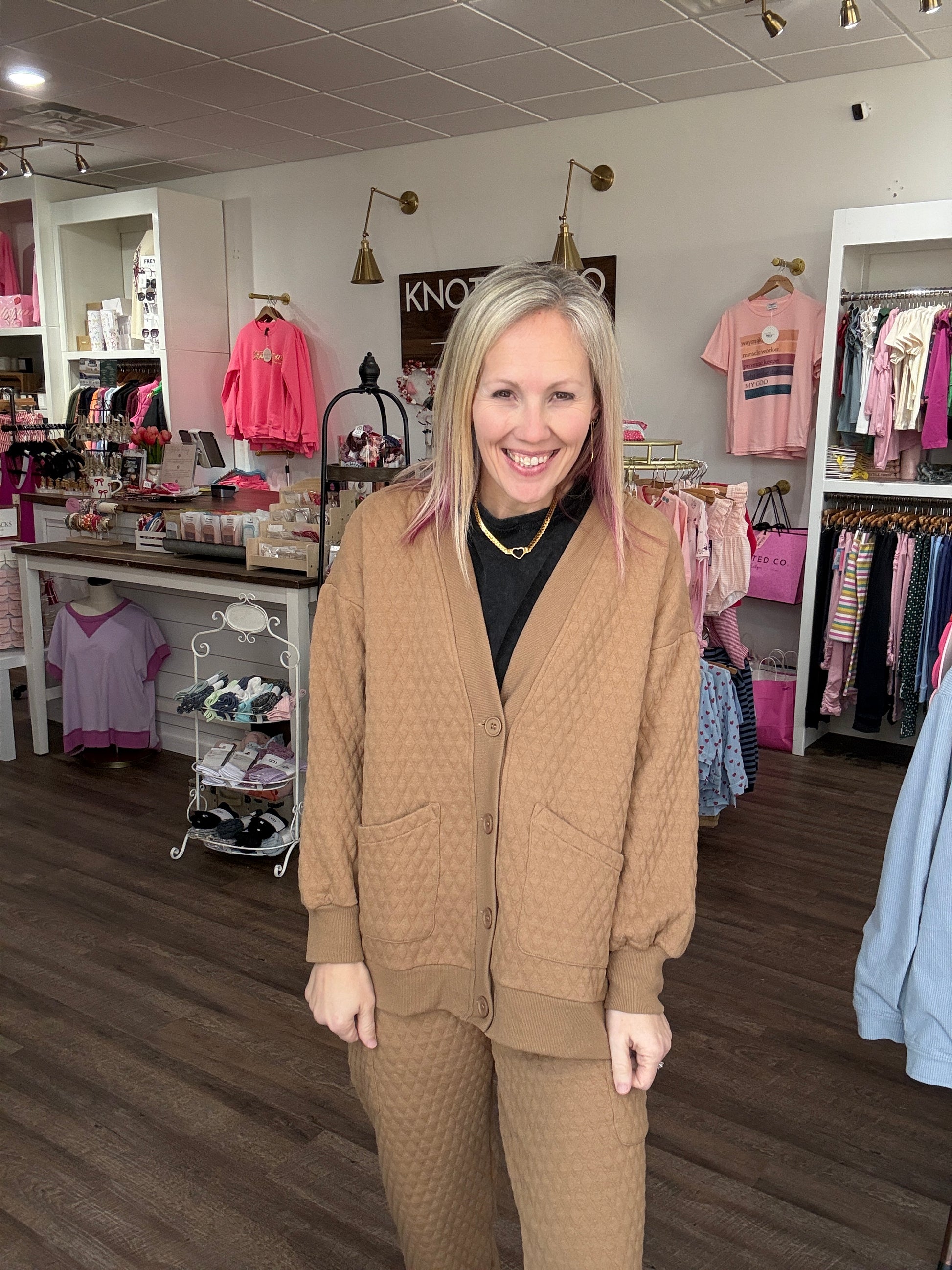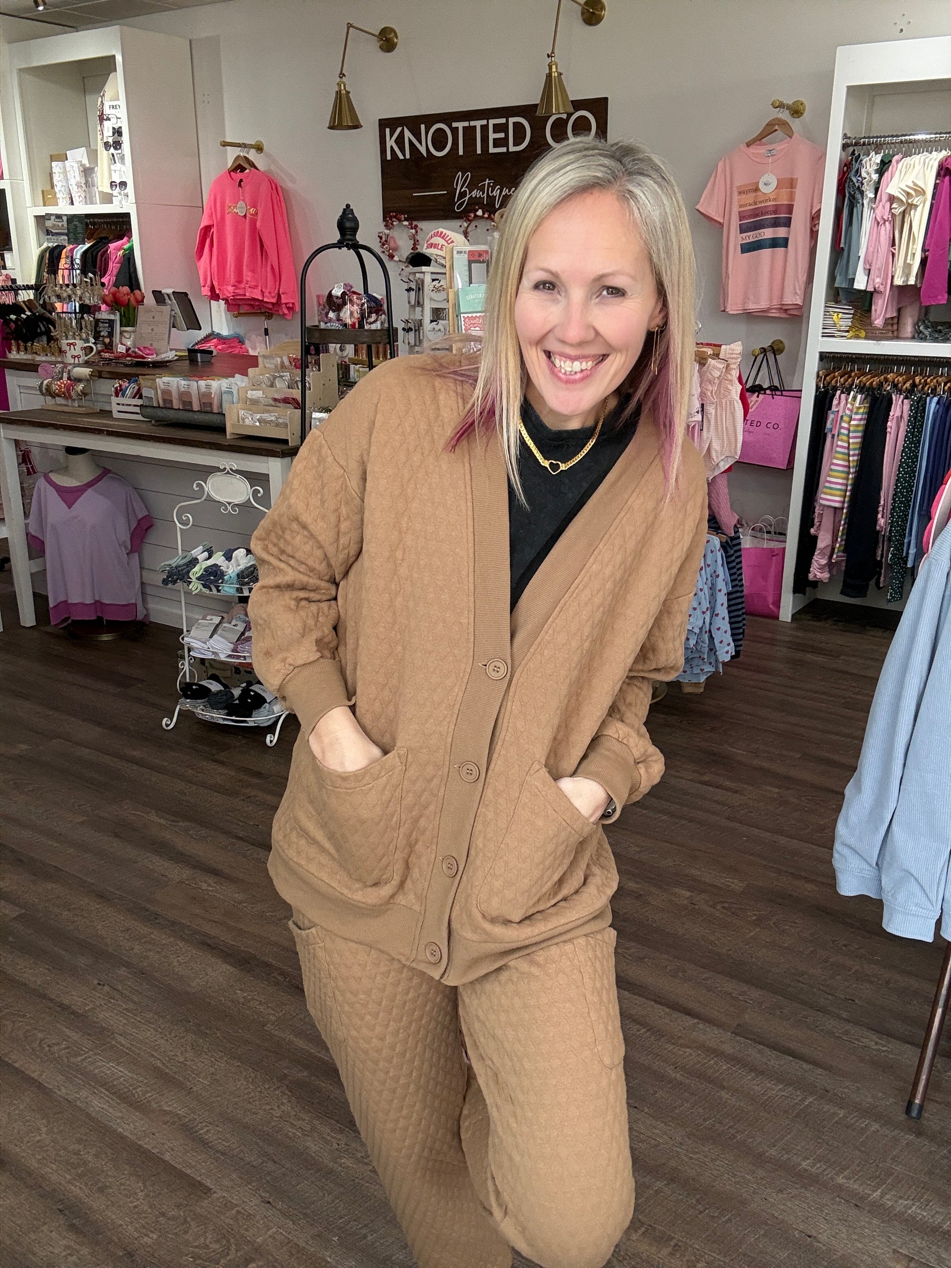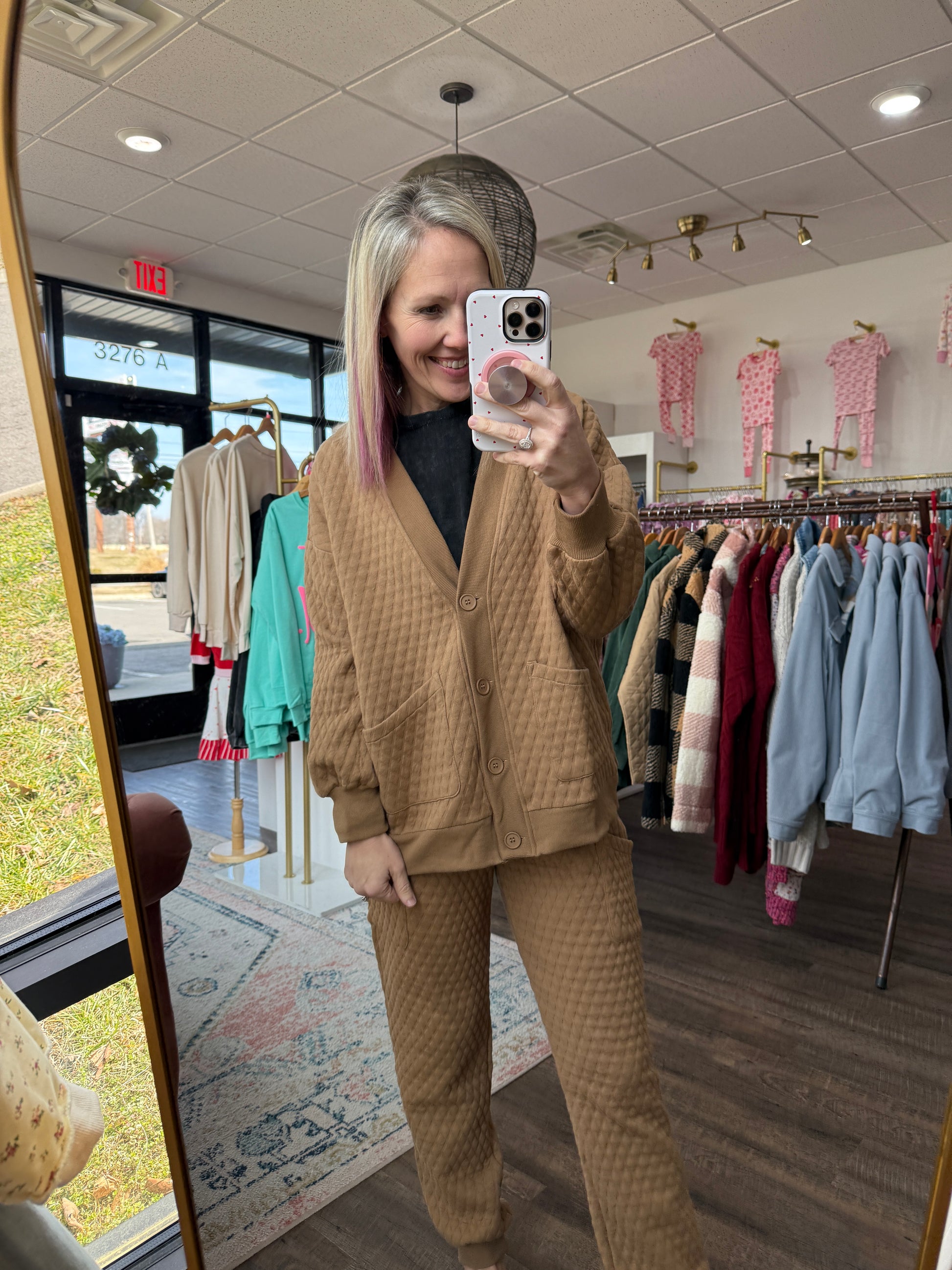 Where comfort meets elevated style—the Latte Luxe Quilted Set is the definition of effortless polish. Designed in a rich mocha, coffee-inspired hue, this matching cardigan and pant duo features a quilted texture that instantly gives designer vibes while keeping the fit relaxed and wearable.
