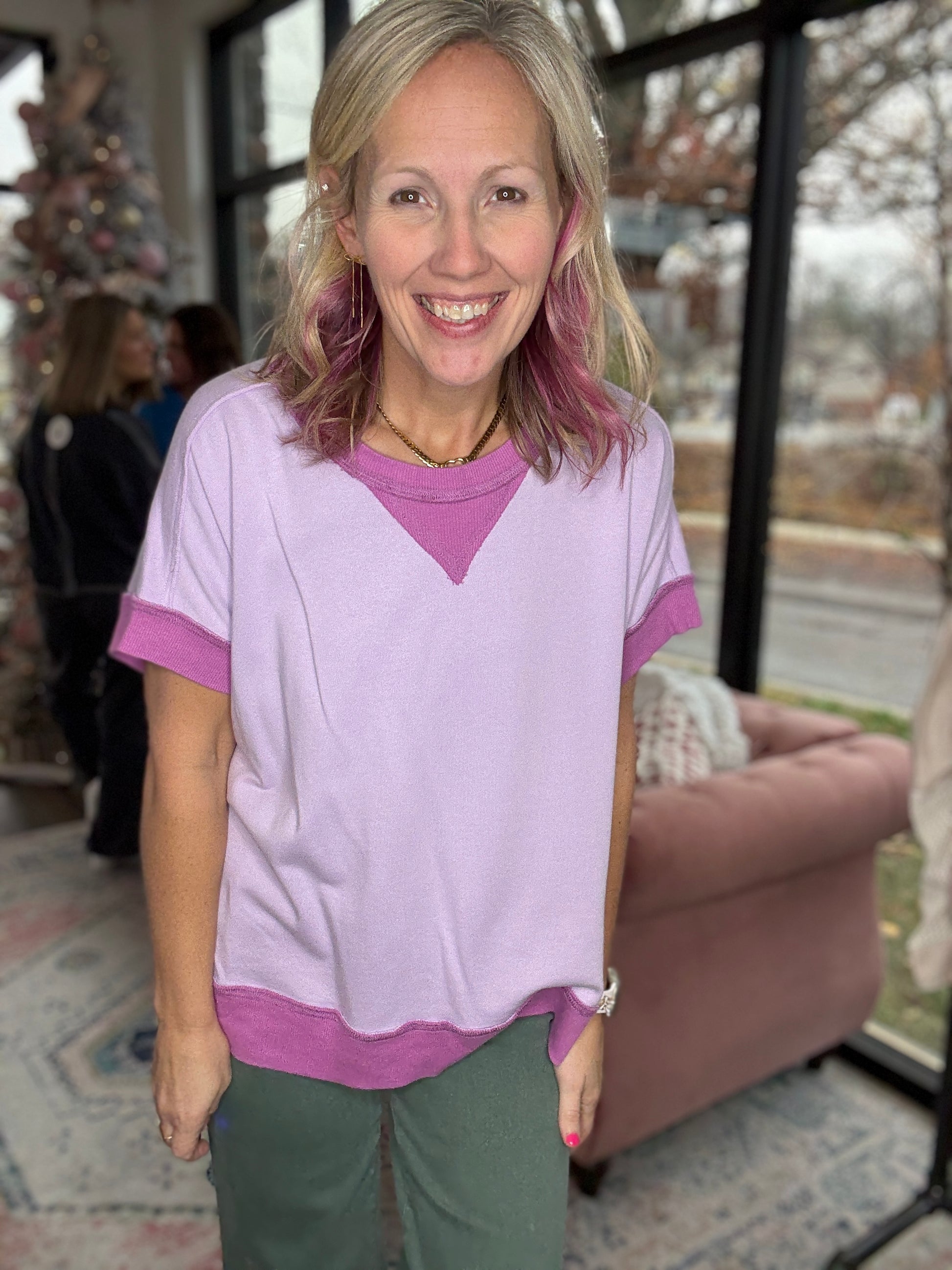 The Lavender Duo Relaxed Top is an easy, everyday piece with a soft, laid-back feel. Designed in a two-tone lavender palette, this short sleeve top features a darker purple trim at the neckline and sleeves for a clean, color-blocked look. The banded waist offers gentle structure without being tight, maintaining the top’s comfortable and oversized silhouette.