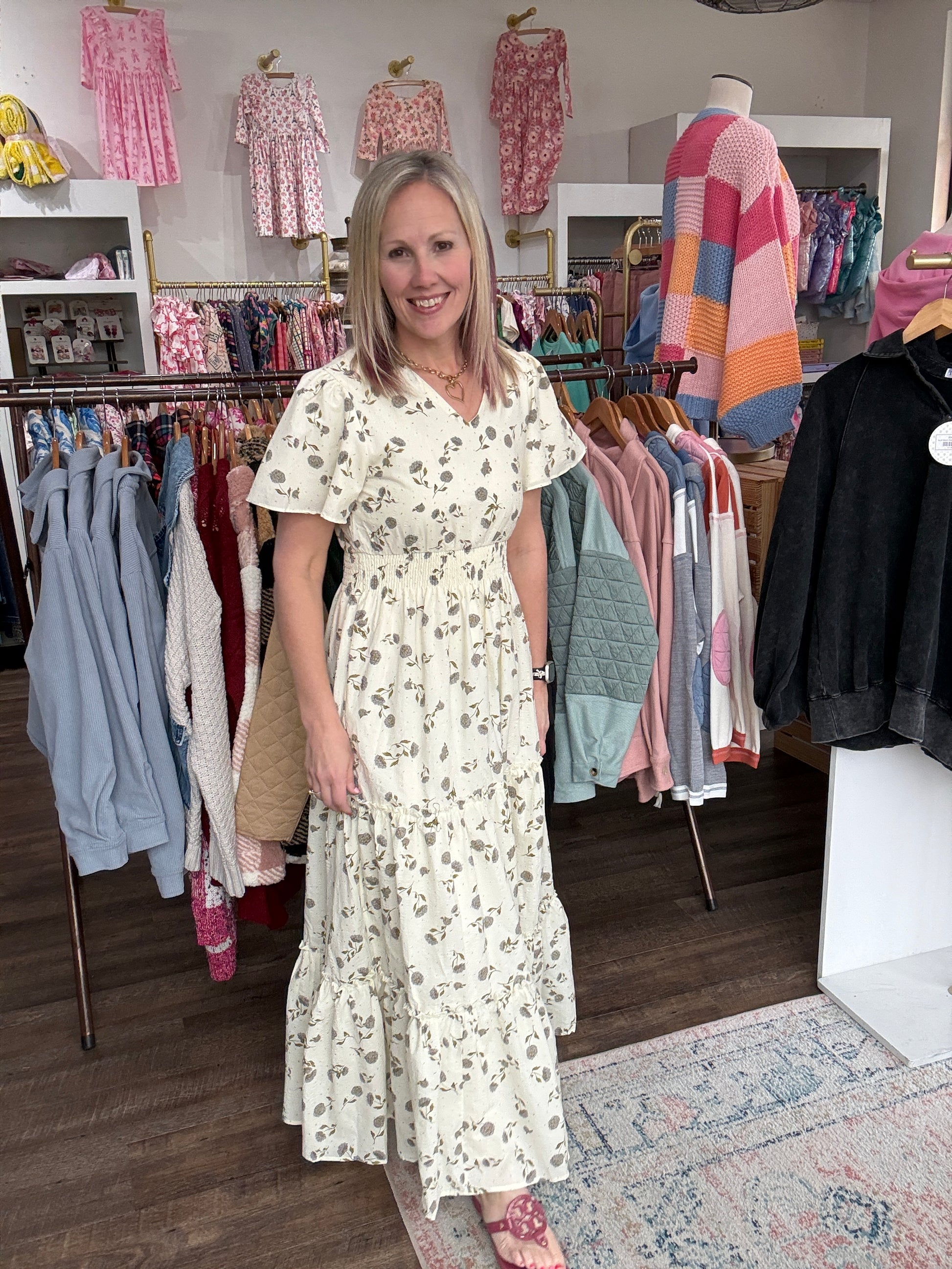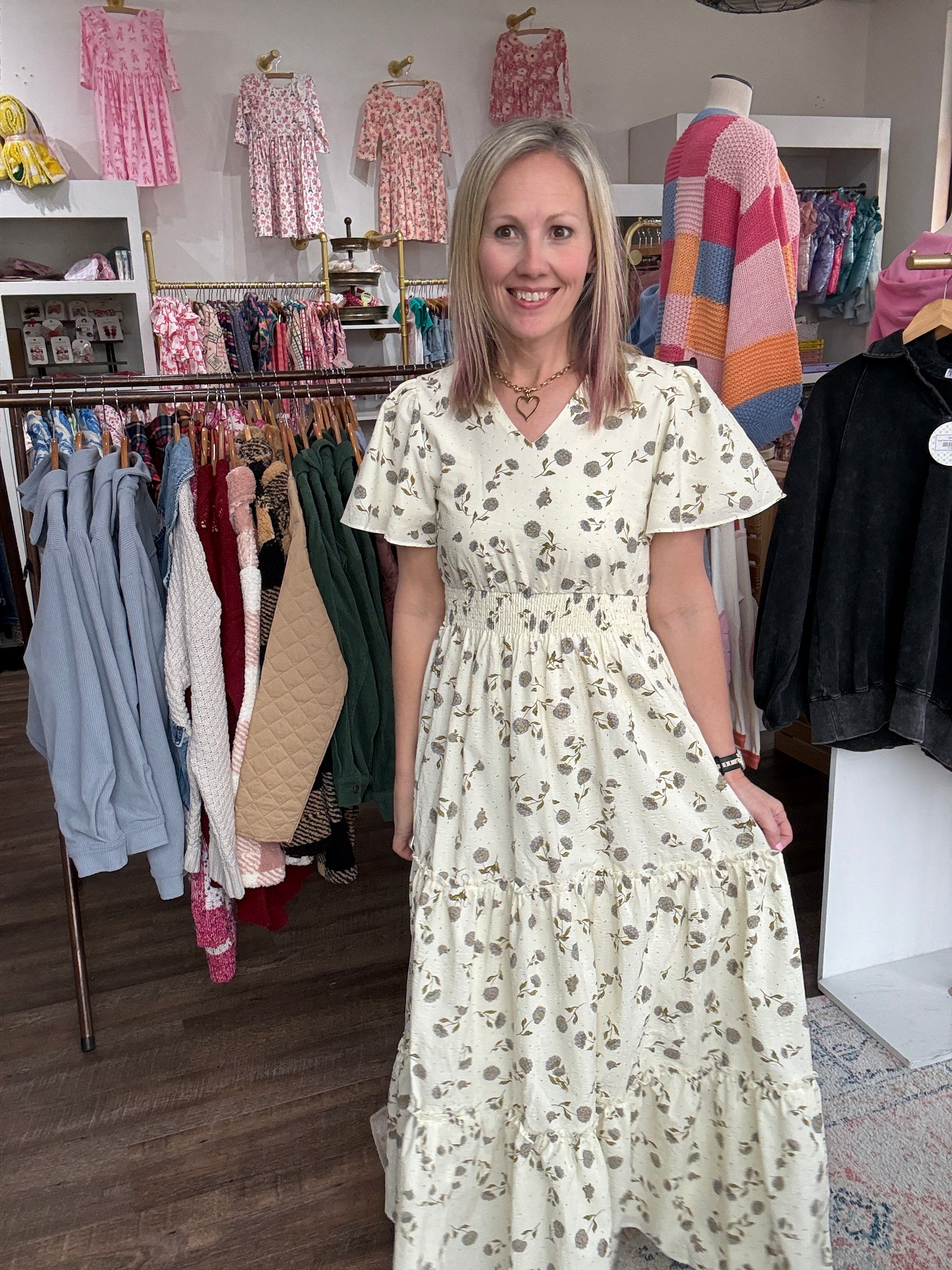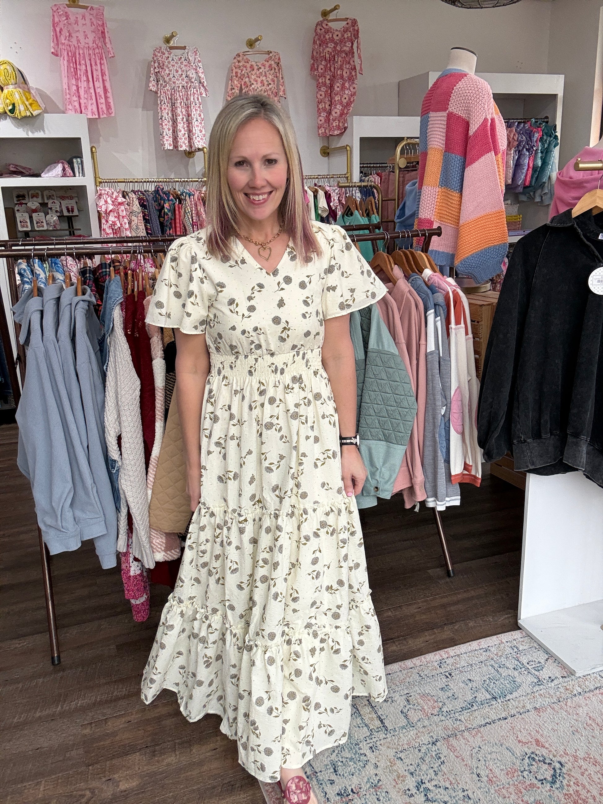 Soft, romantic, and effortlessly feminine — the Lavender Hydrangea Dress is made for easy spring days and special moments alike. Designed with a flattering elastic waist and flowy full-length silhouette, this dress moves beautifully and feels as comfortable as it looks.