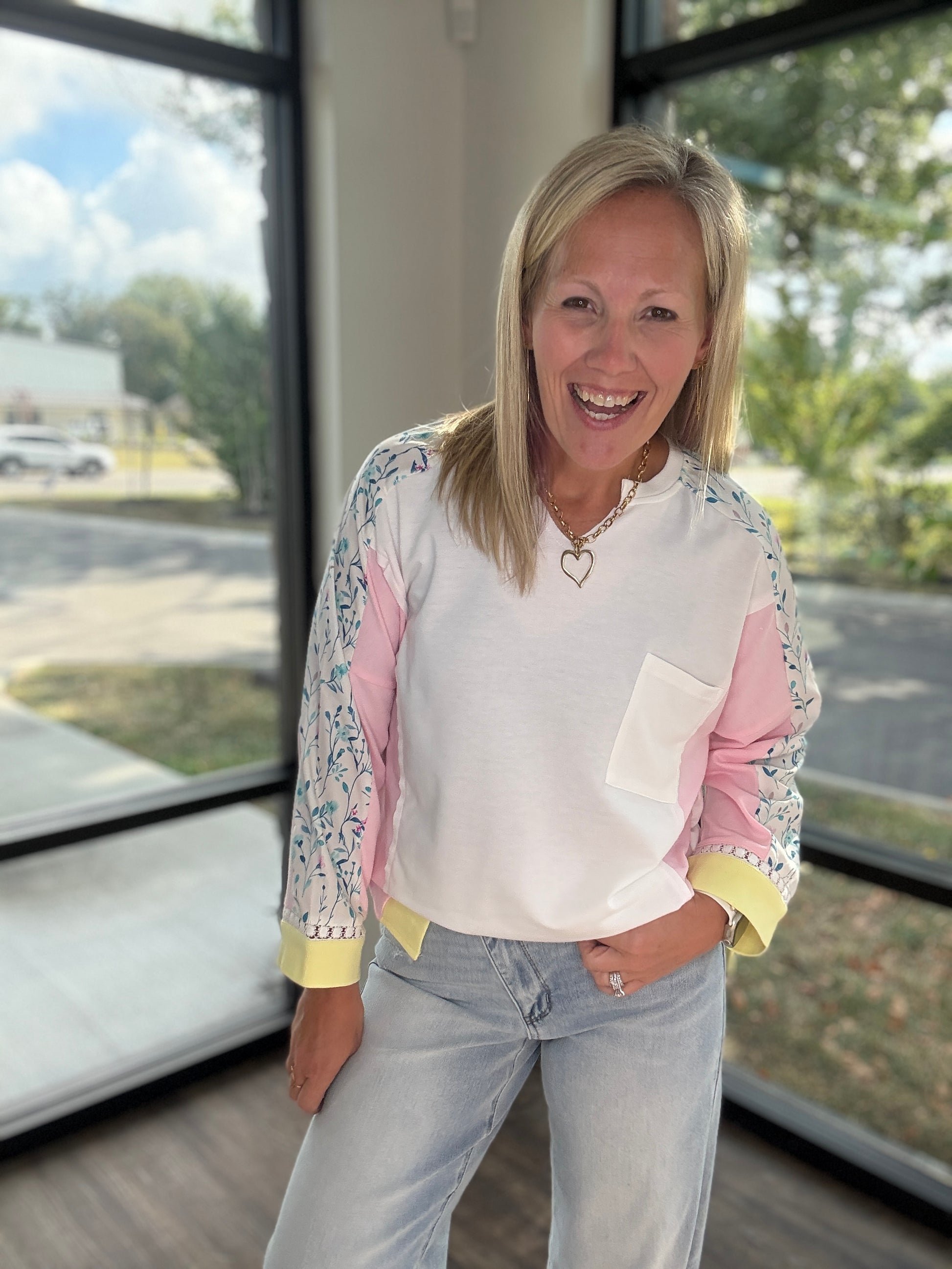The Lavender Lime Floral Top is where cozy meets colorful. Crafted in a soft, lightweight knit perfect for fall layering, it features a flattering v-neckline, relaxed fit, and a front pocket for that laid-back touch.