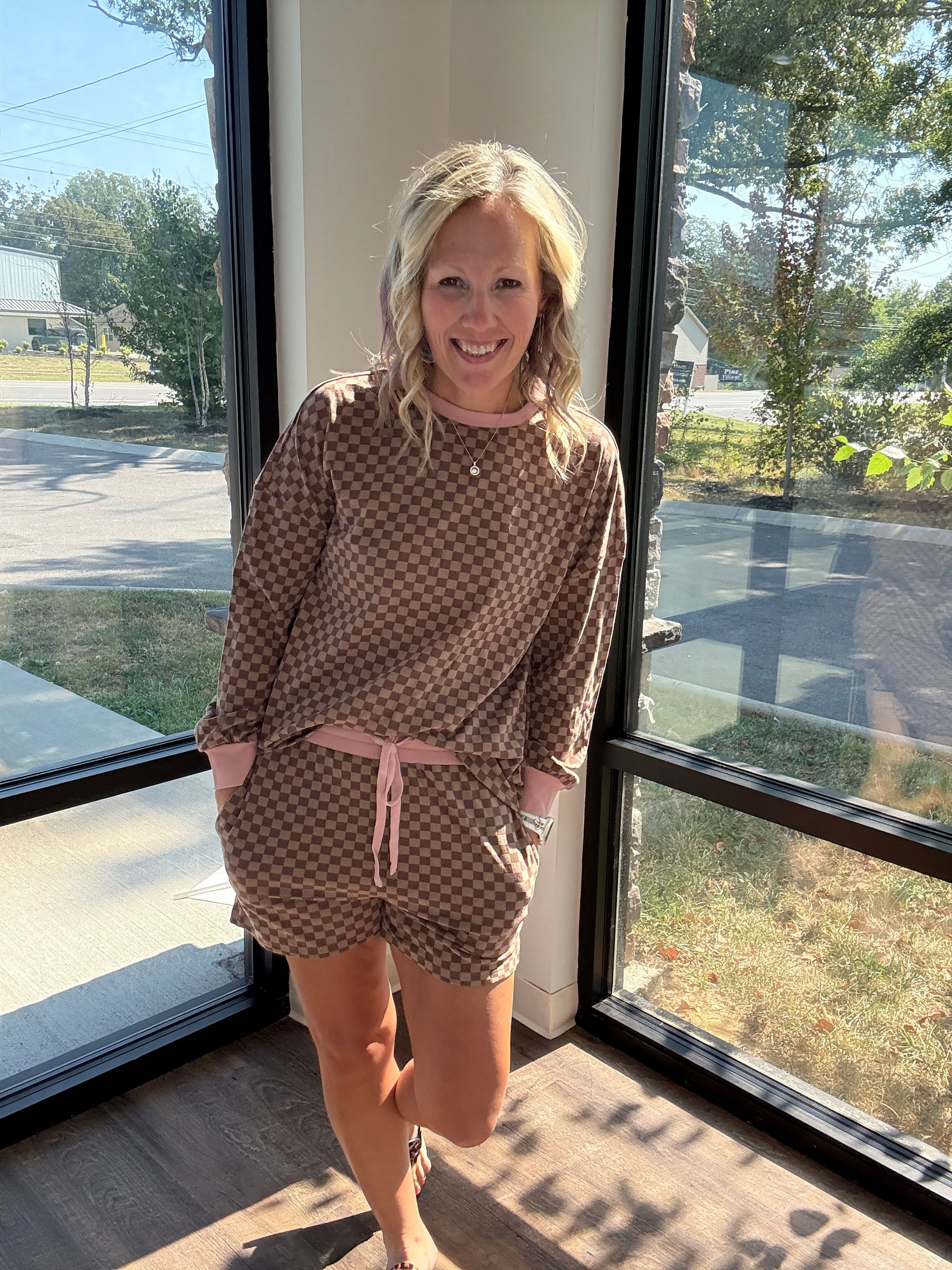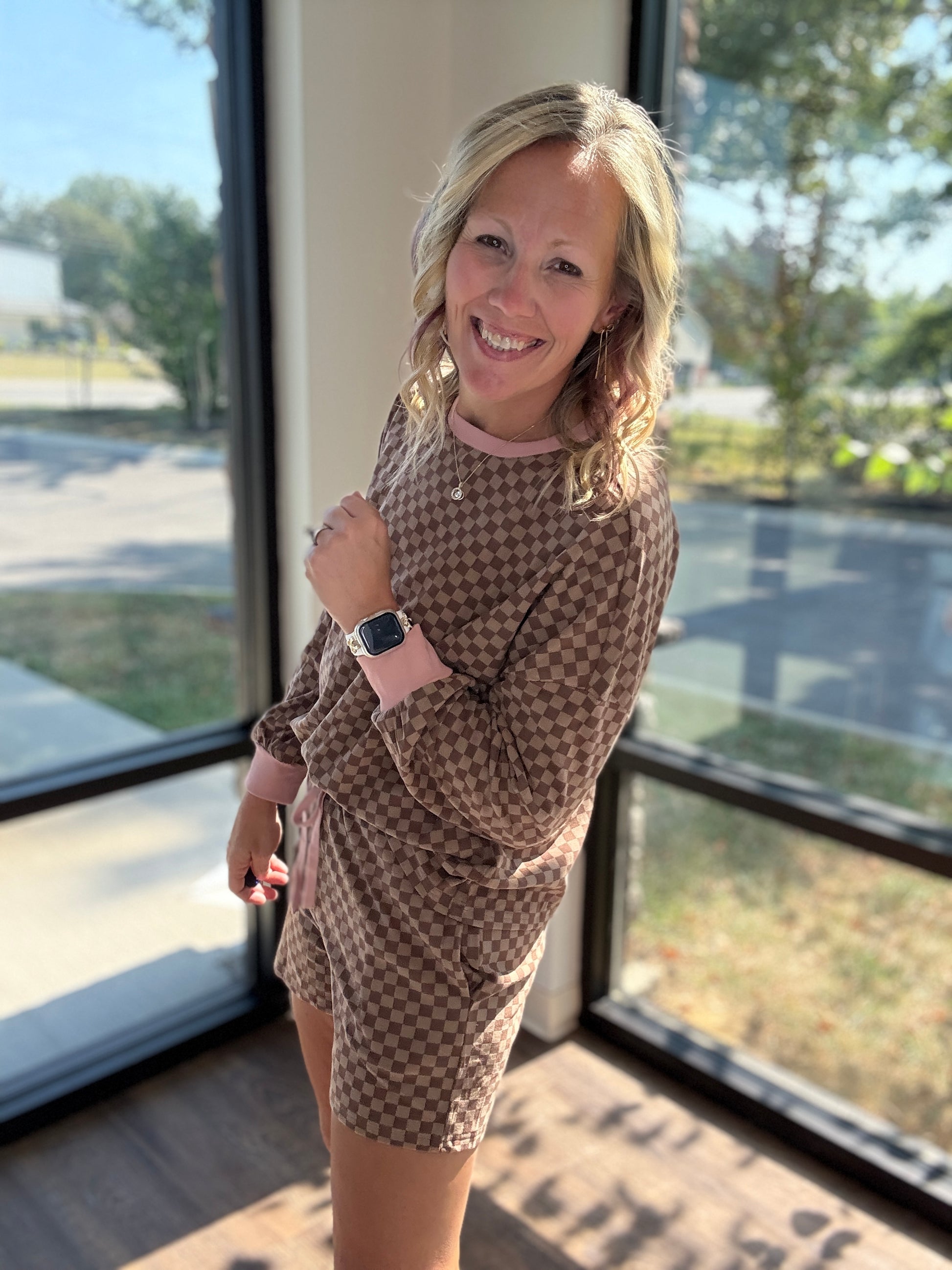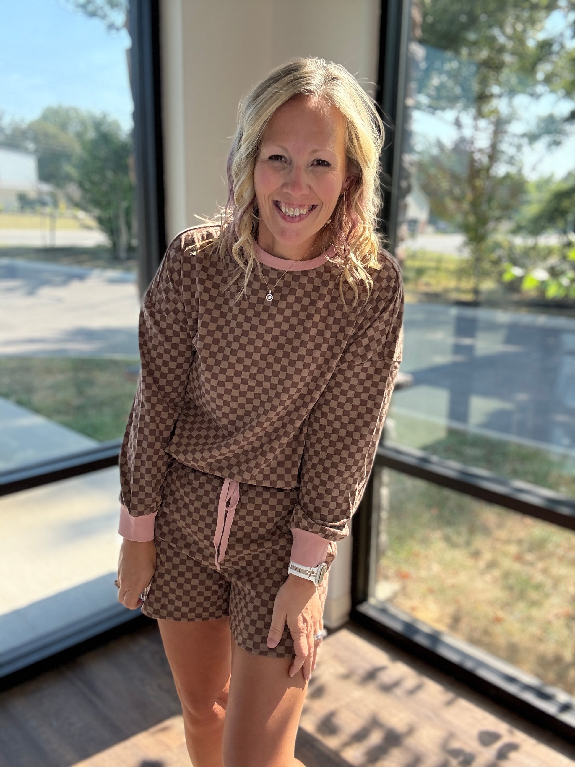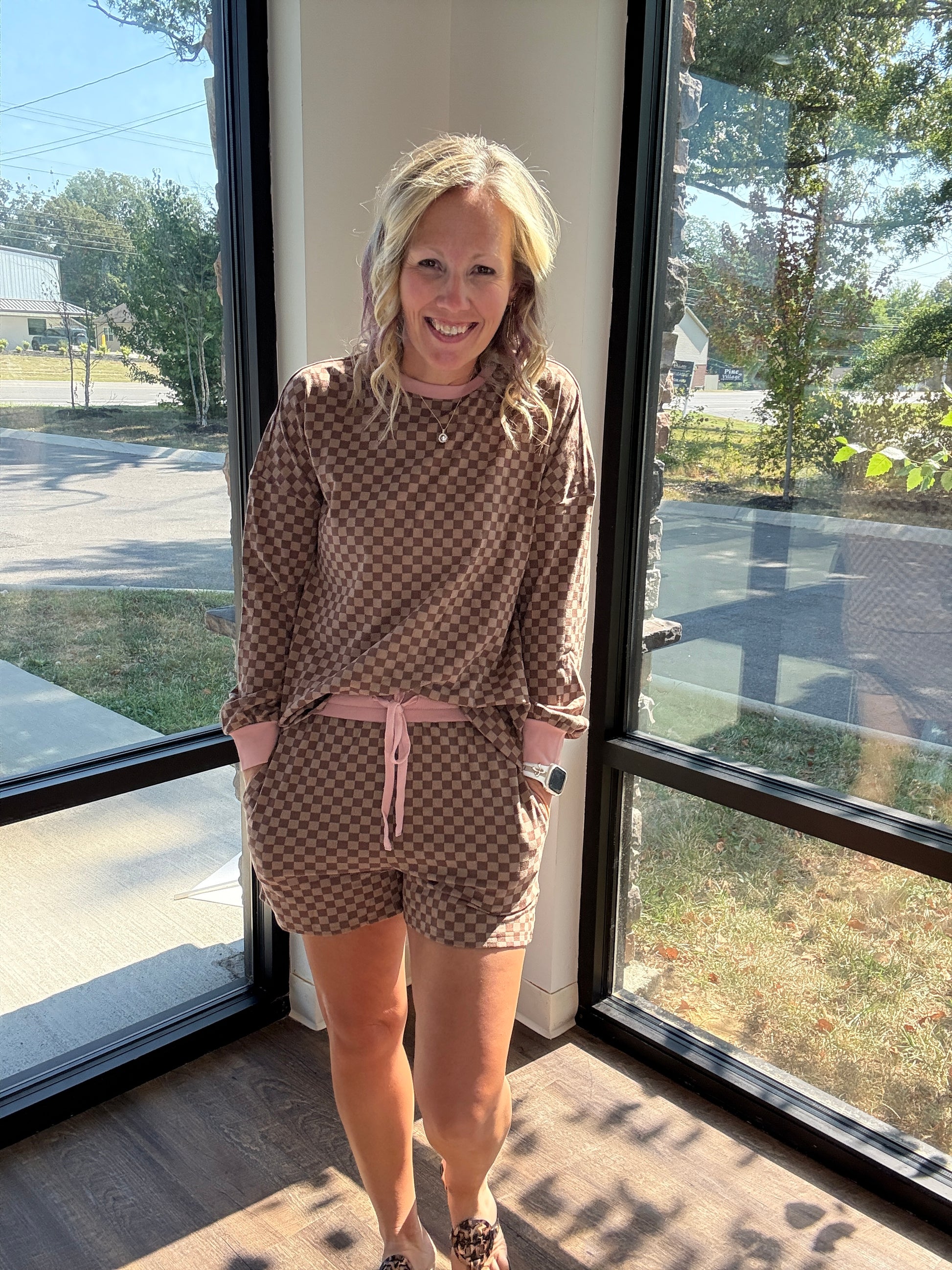 Cozy up in the Maple & Rose Check Set—a fall favorite with a playful twist. This ultra-soft brown checkered short set features delicate pink trim details that add just the right pop of color. The long sleeve top keeps things cozy while the elastic waist shorts with pockets bring all the comfort. Whether you're lounging at home or grabbing coffee on a crisp morning, this set is the definition of cute and comfy. A must-have for your fall wardrobe lineup.