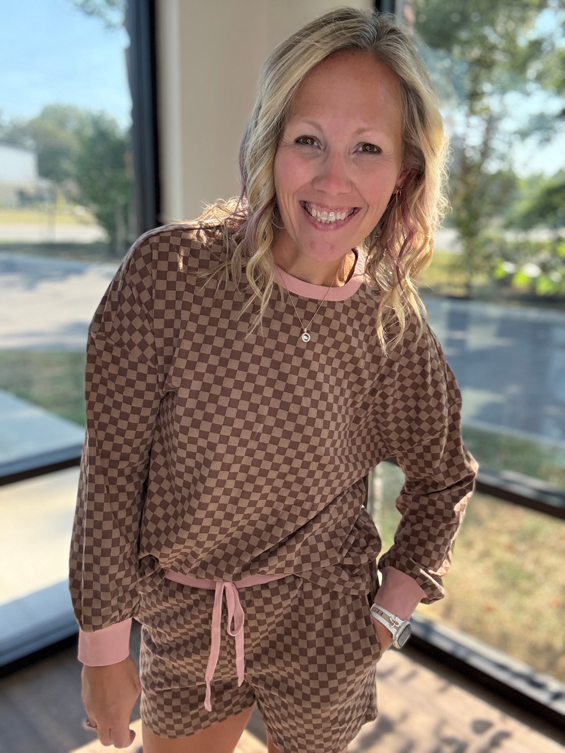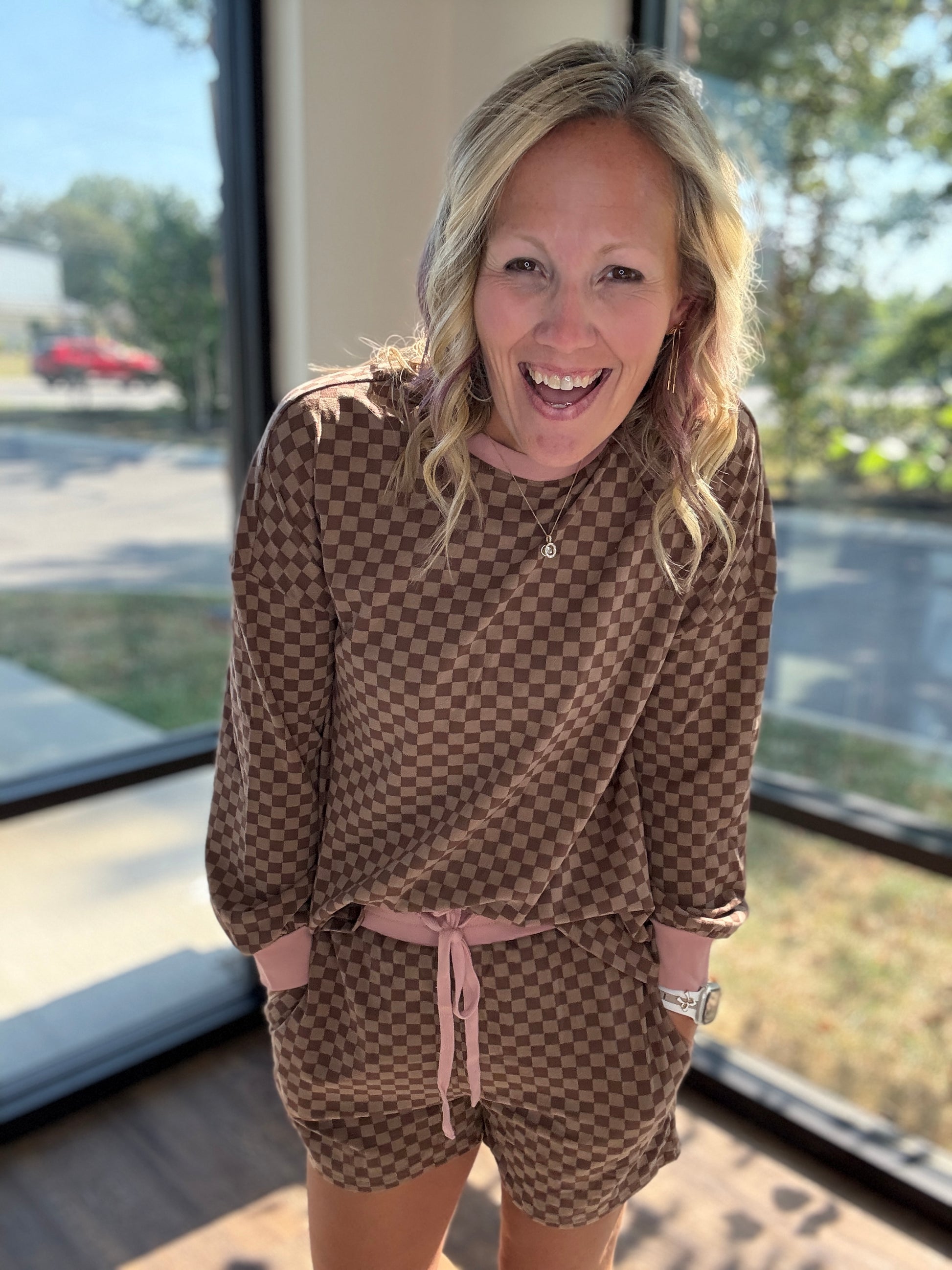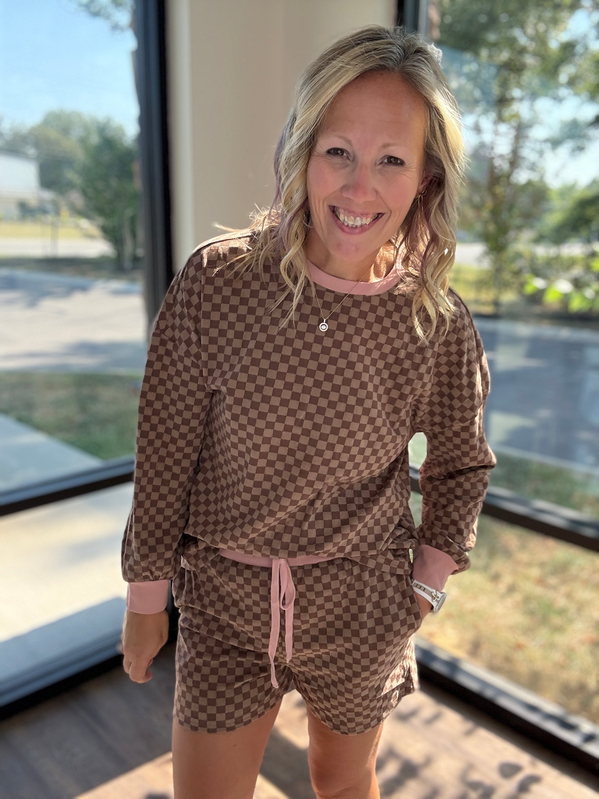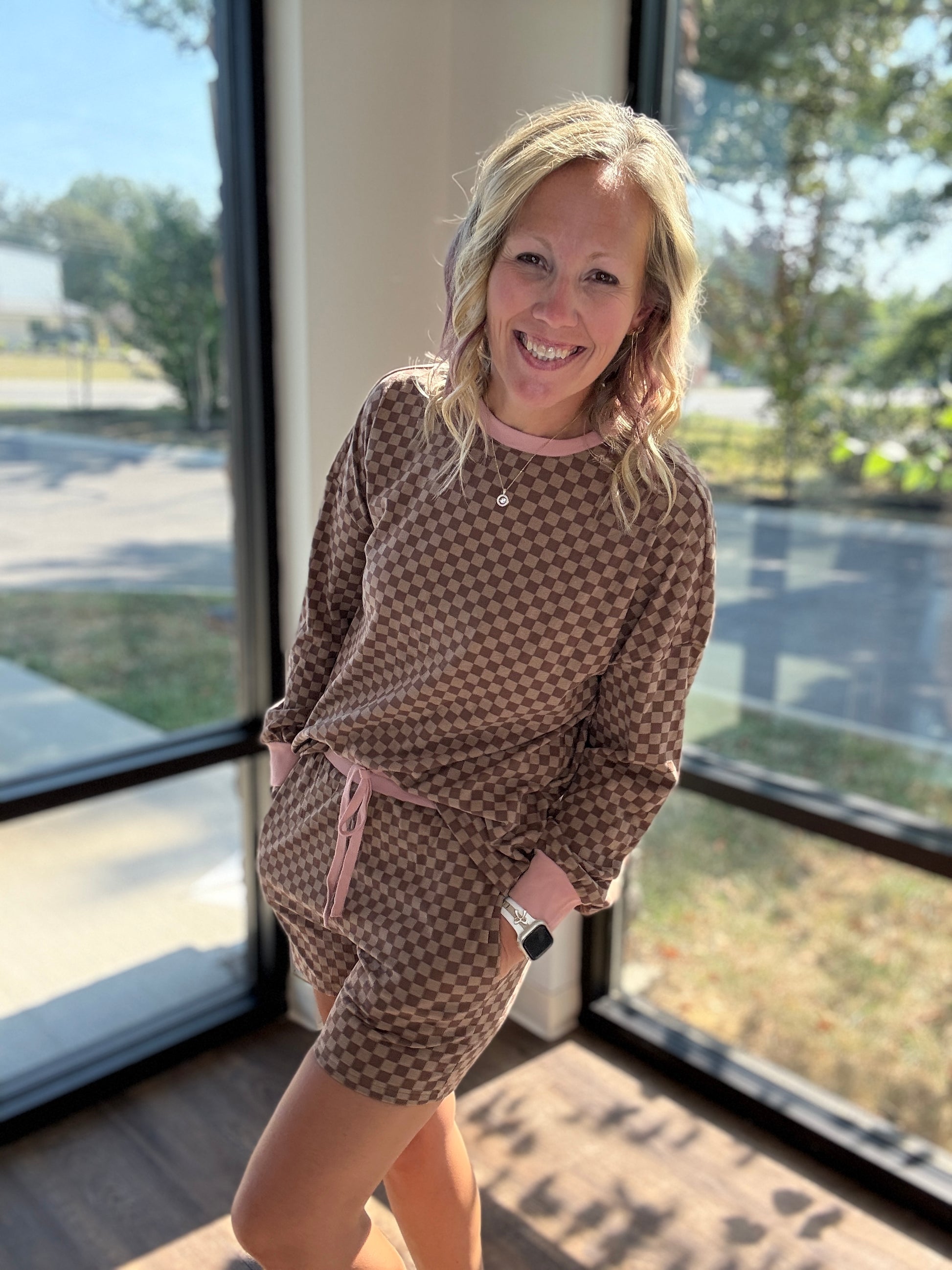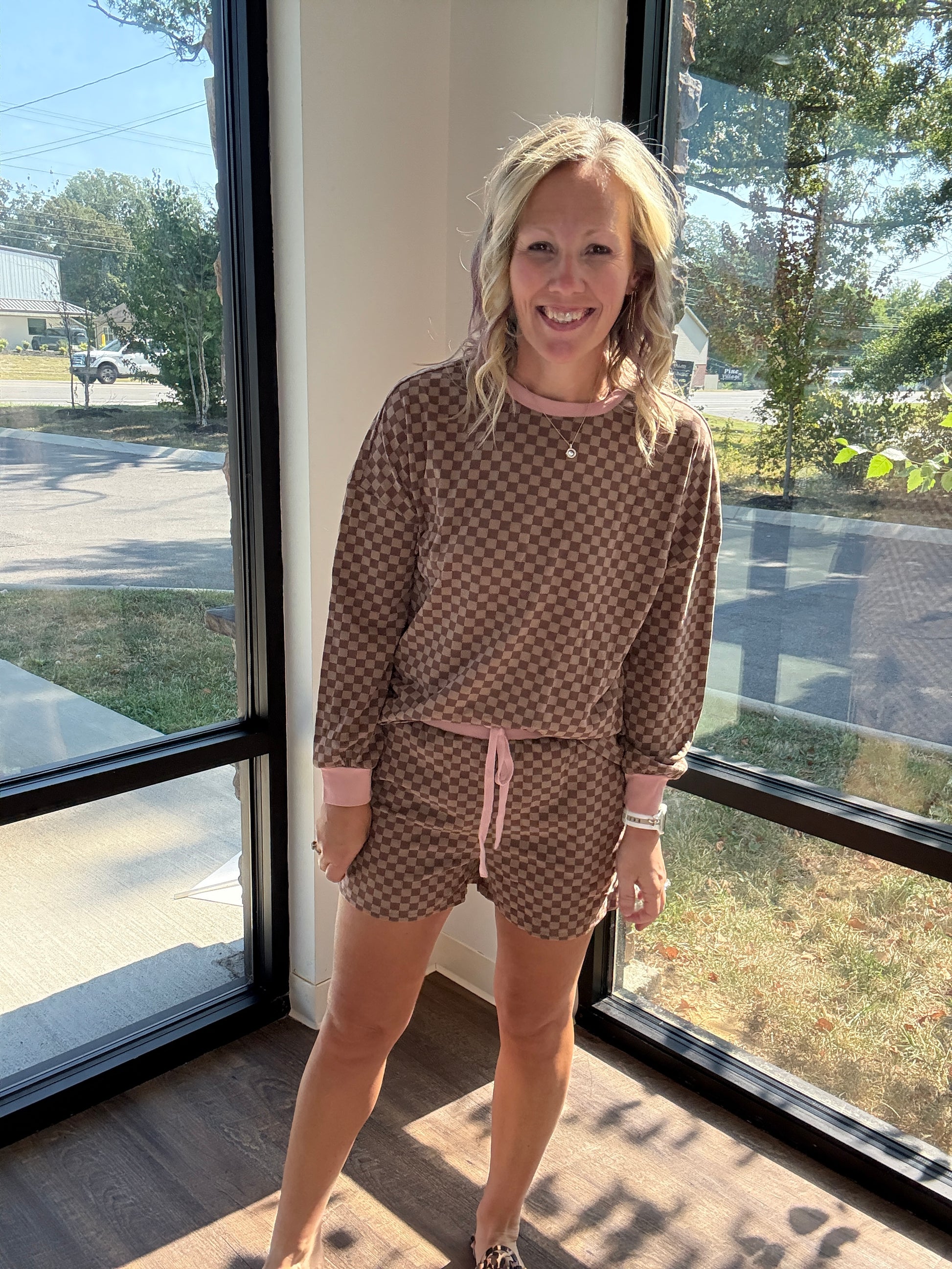 Cozy up in the Maple & Rose Check Set—a fall favorite with a playful twist. This ultra-soft brown checkered short set features delicate pink trim details that add just the right pop of color. The long sleeve top keeps things cozy while the elastic waist shorts with pockets bring all the comfort. Whether you're lounging at home or grabbing coffee on a crisp morning, this set is the definition of cute and comfy. A must-have for your fall wardrobe lineup.