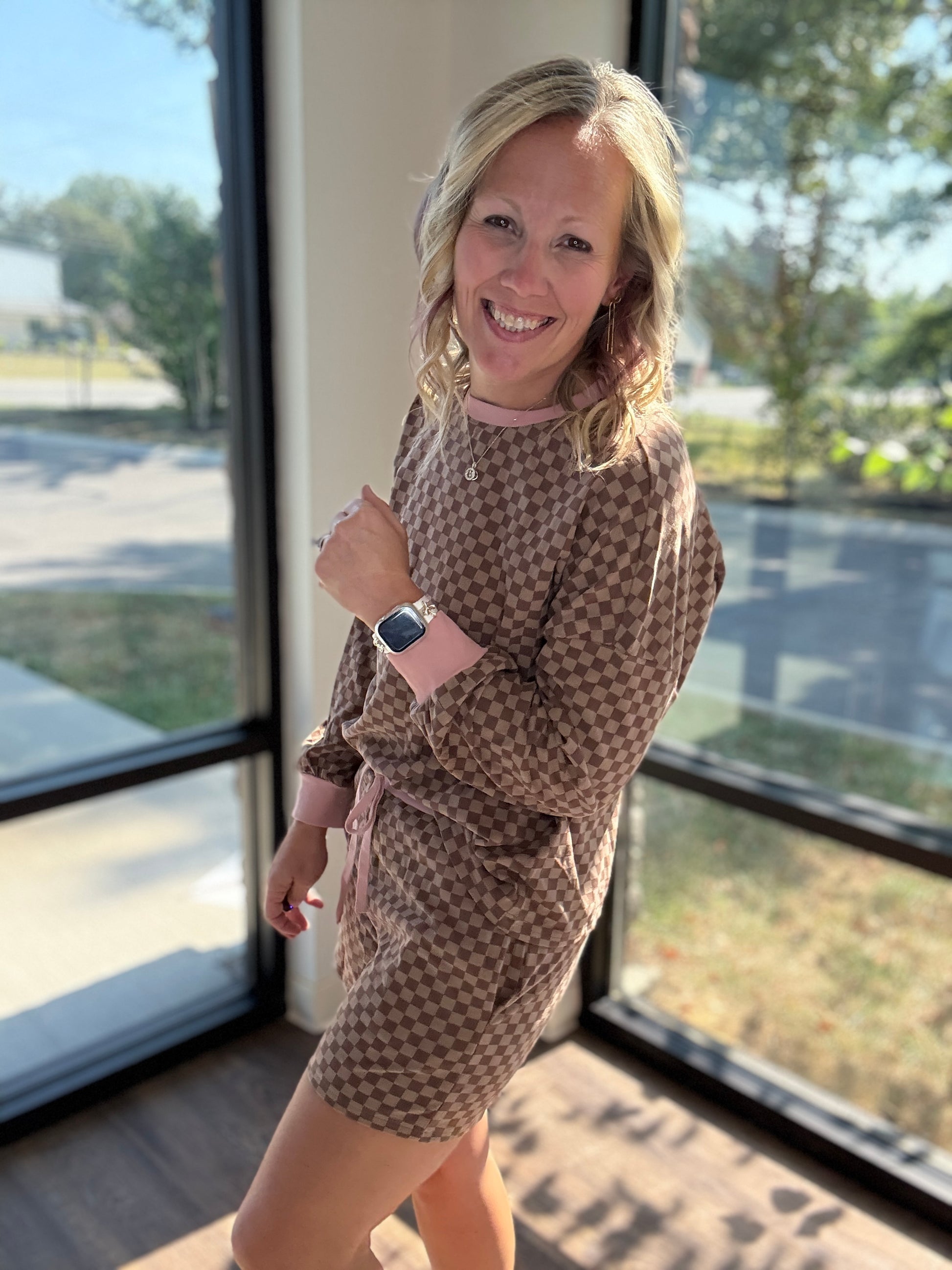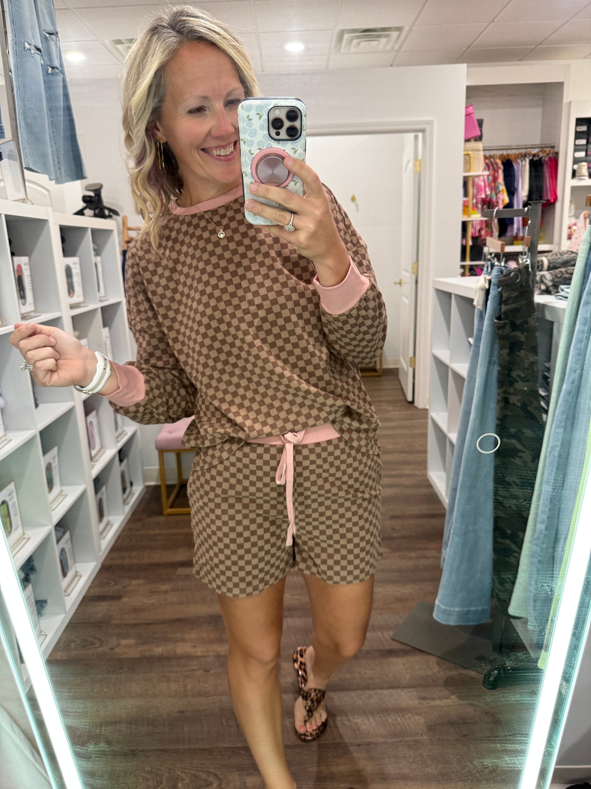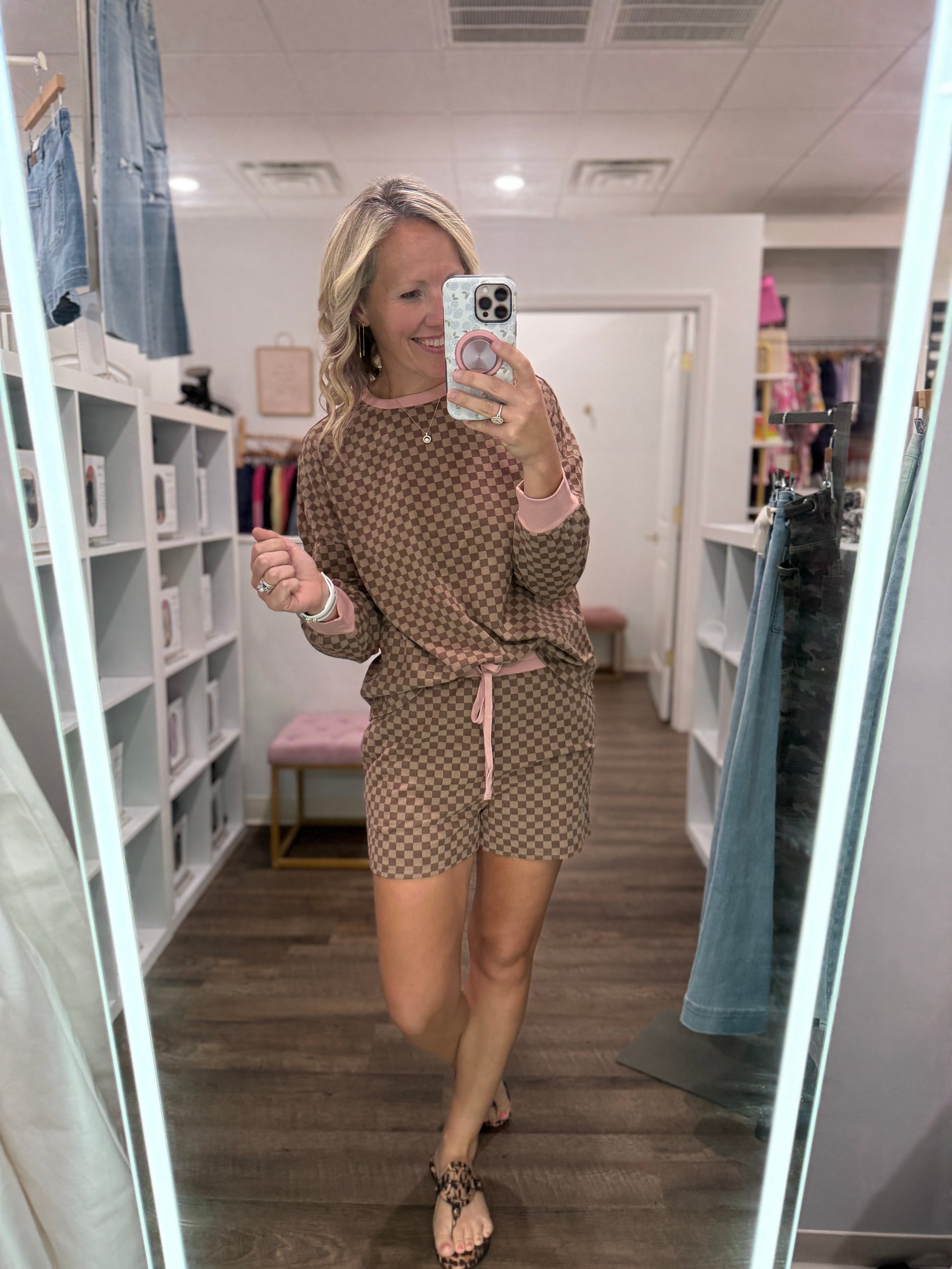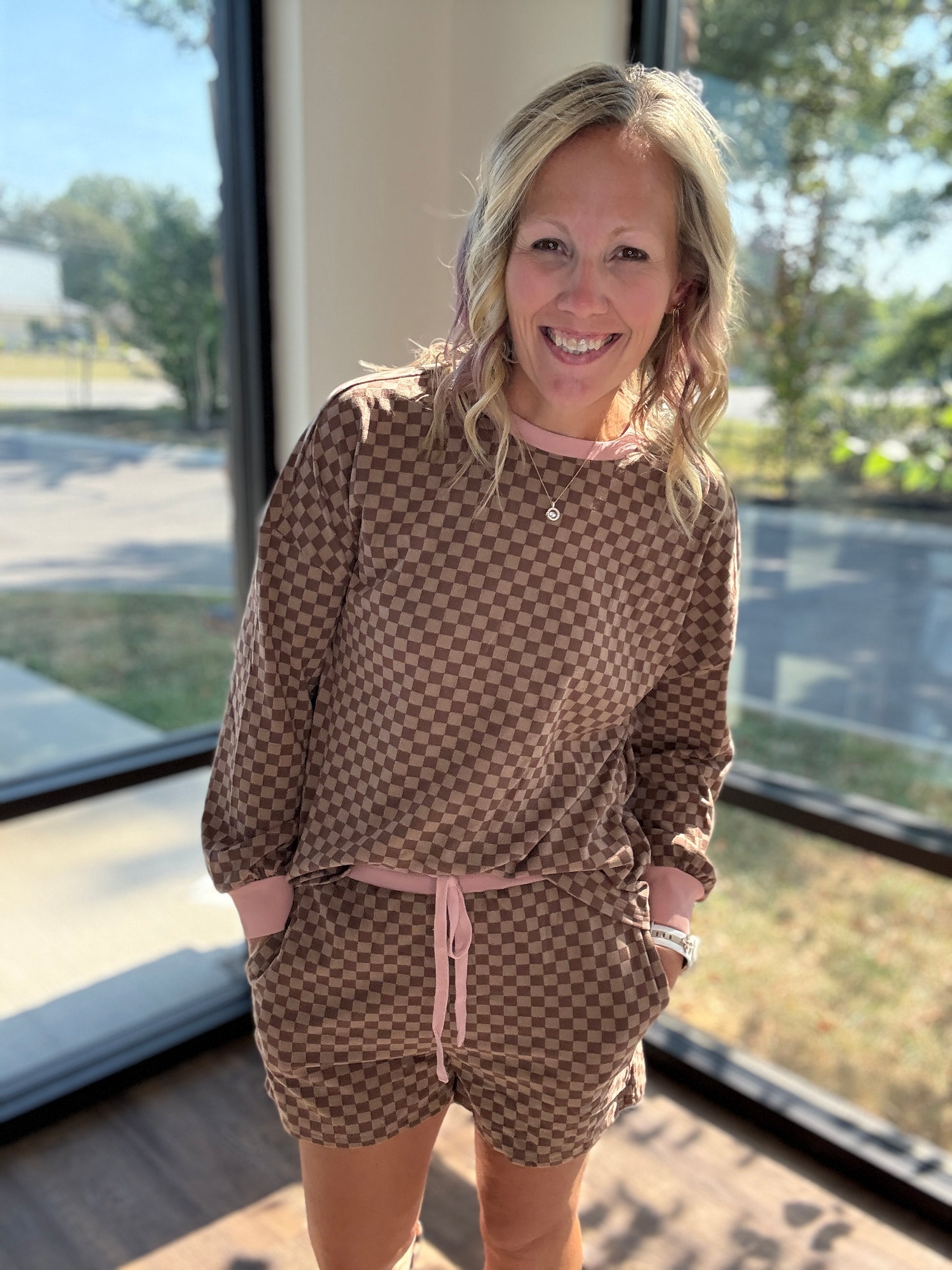 Cozy up in the Maple & Rose Check Set—a fall favorite with a playful twist. This ultra-soft brown checkered short set features delicate pink trim details that add just the right pop of color. The long sleeve top keeps things cozy while the elastic waist shorts with pockets bring all the comfort. Whether you're lounging at home or grabbing coffee on a crisp morning, this set is the definition of cute and comfy. A must-have for your fall wardrobe lineup.