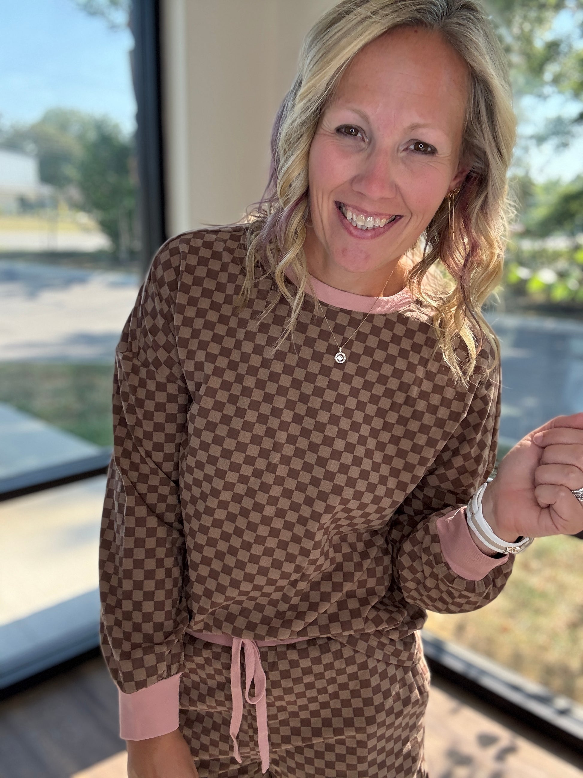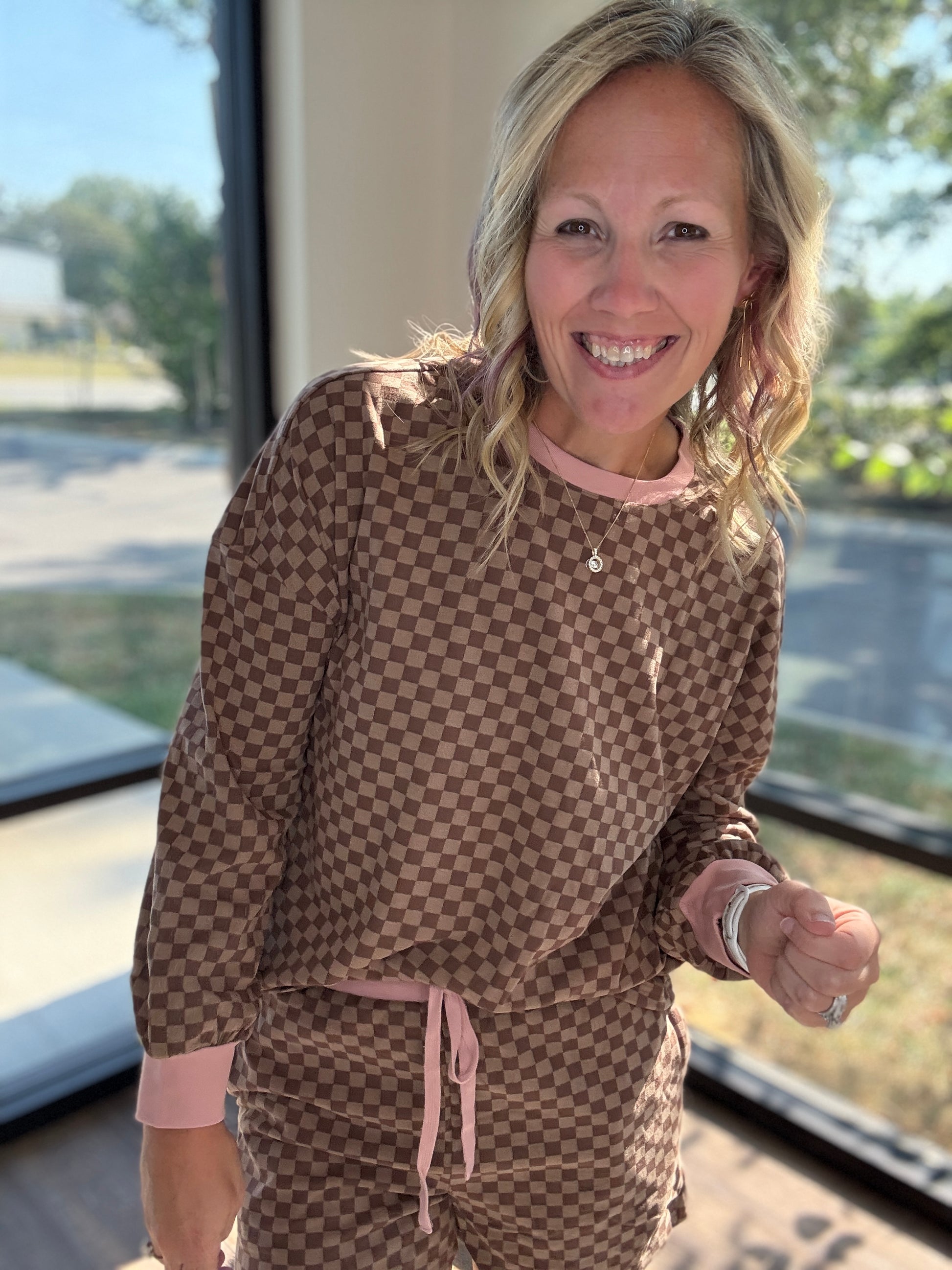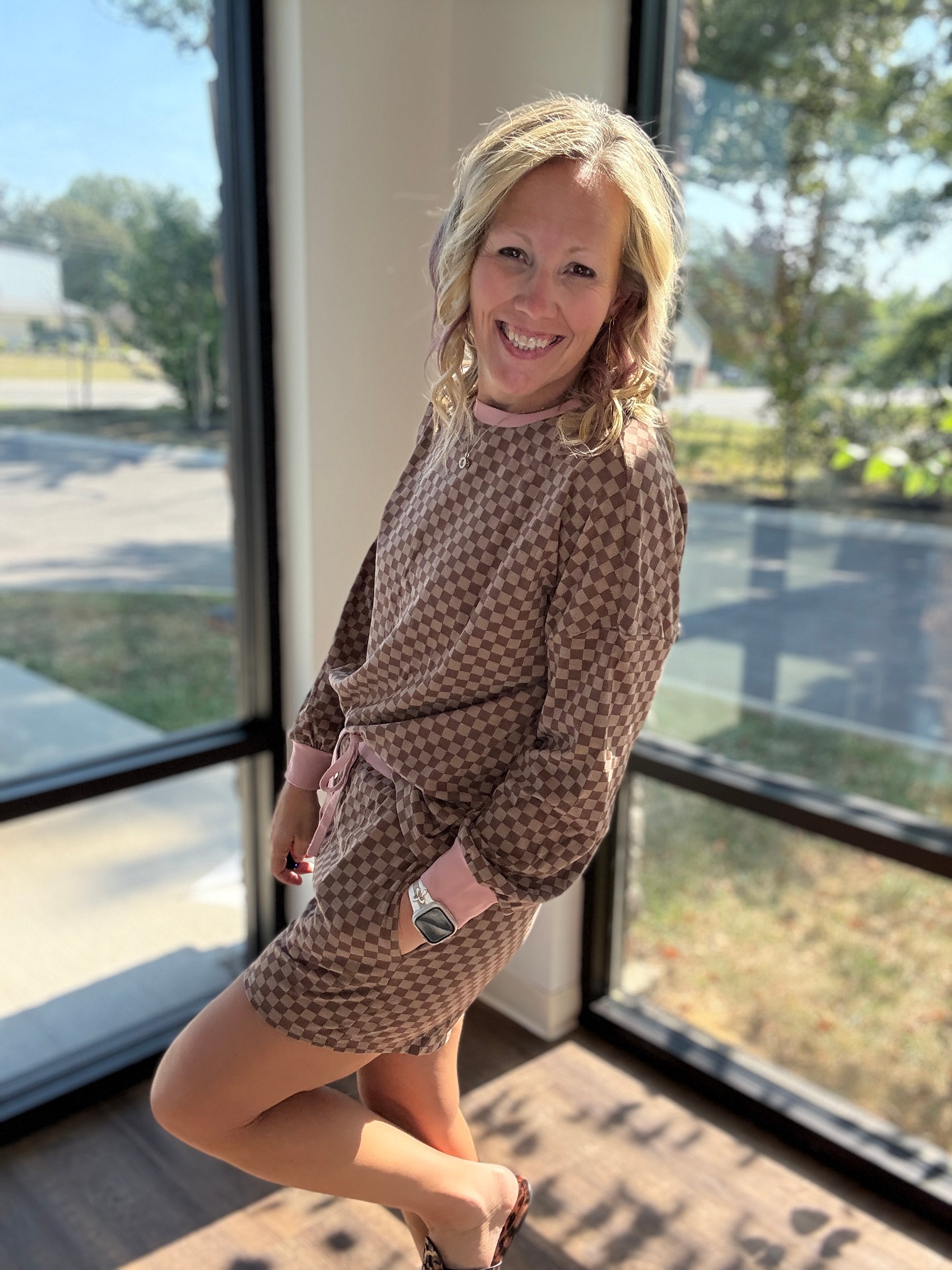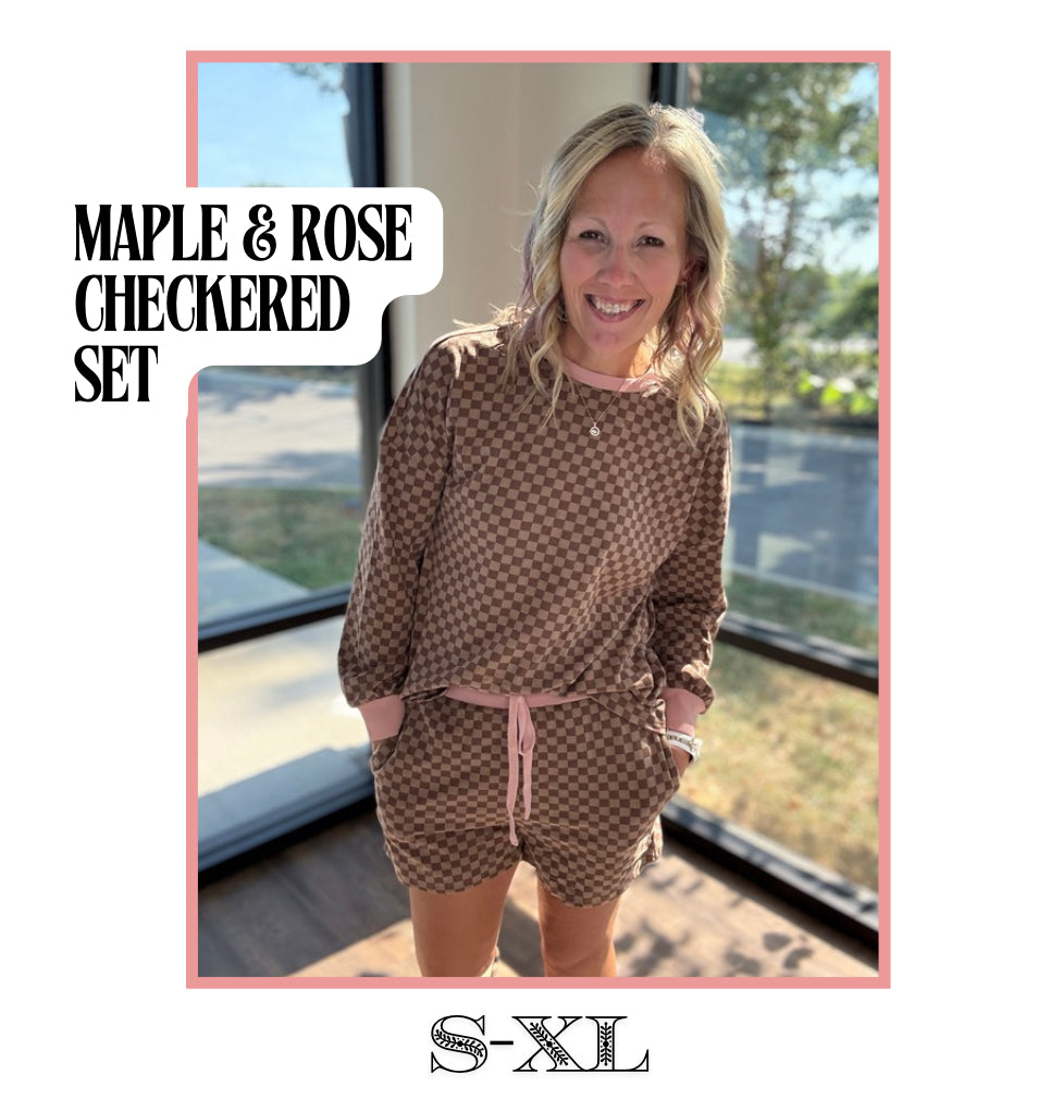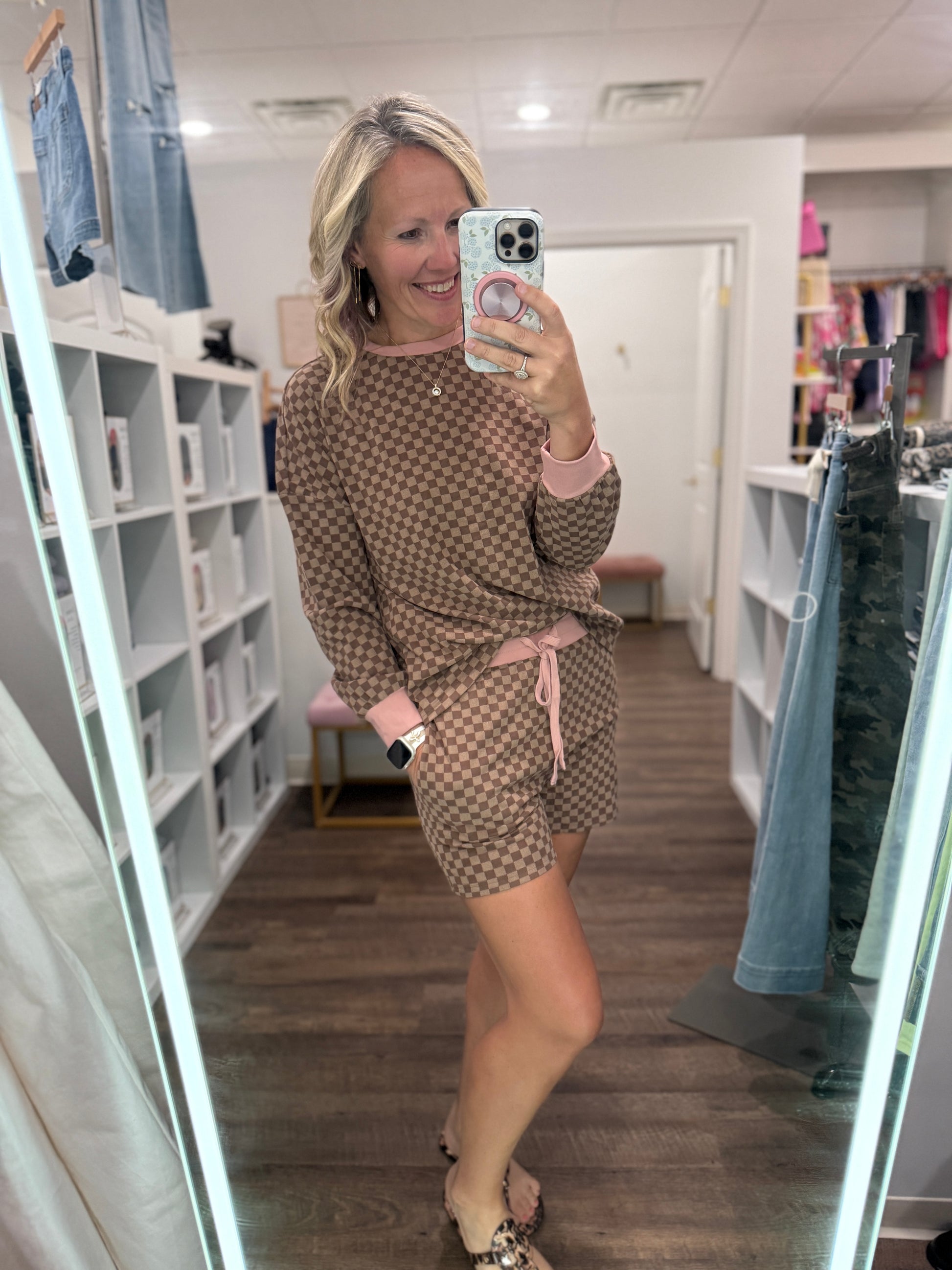 Cozy up in the Maple & Rose Check Set—a fall favorite with a playful twist. This ultra-soft brown checkered short set features delicate pink trim details that add just the right pop of color. The long sleeve top keeps things cozy while the elastic waist shorts with pockets bring all the comfort. Whether you're lounging at home or grabbing coffee on a crisp morning, this set is the definition of cute and comfy. A must-have for your fall wardrobe lineup.