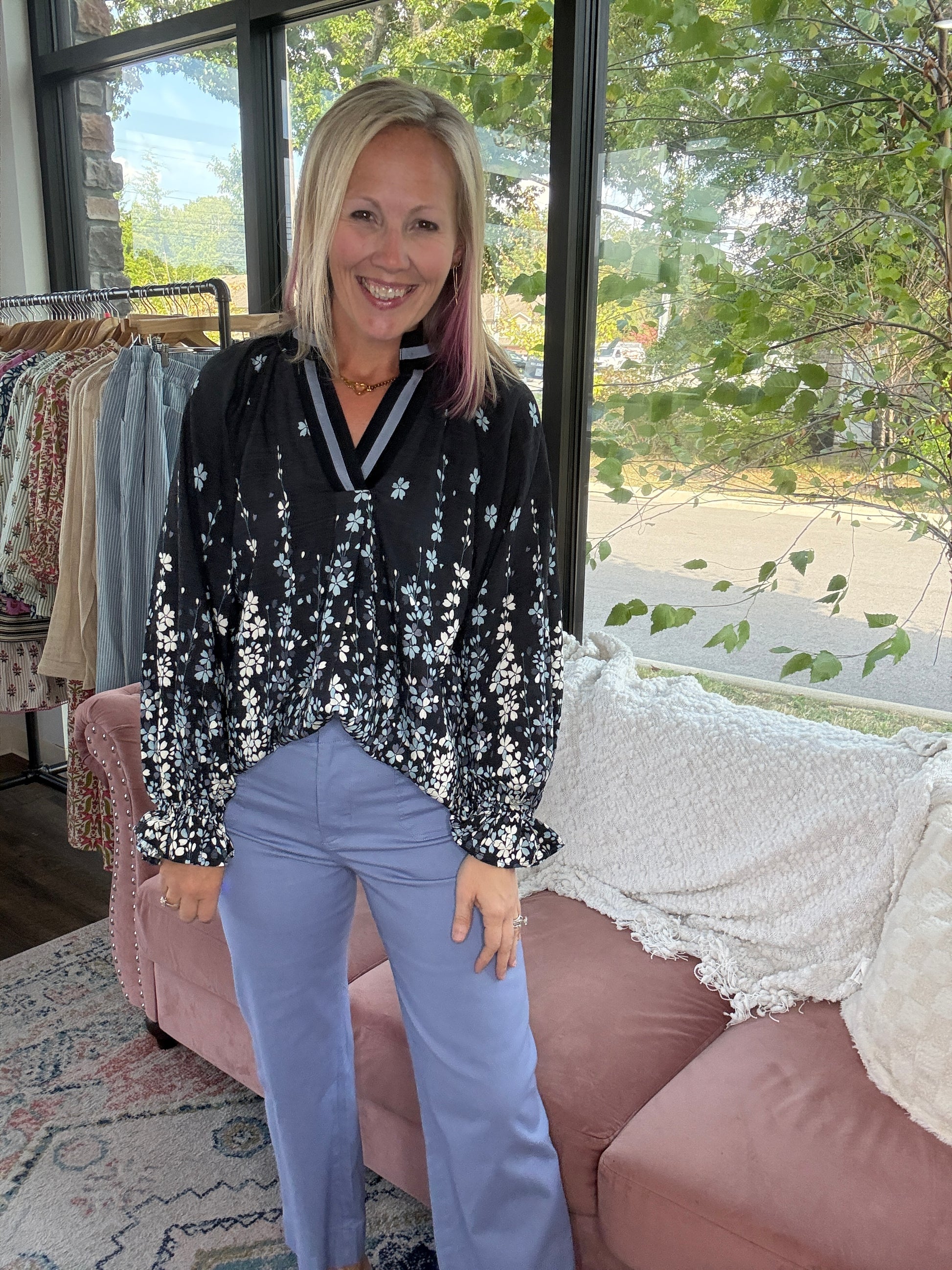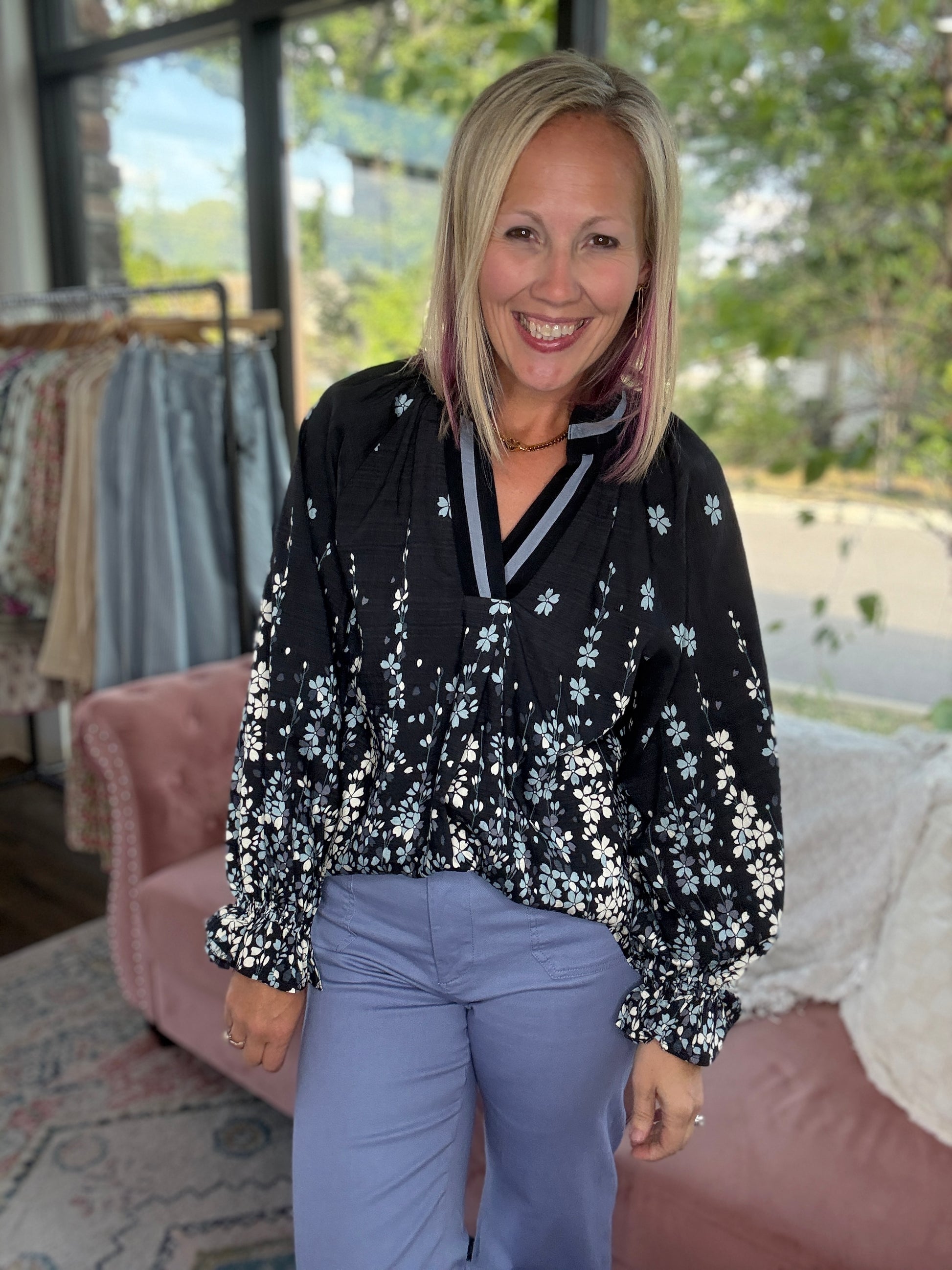 Bring effortless charm to your wardrobe with the Meadow Muse Blouse. Featuring a split V-neck, collared neckline, and long balloon sleeves, this flowy top balances feminine details with relaxed ease. Contrast binding adds a subtle, polished touch, while the floral vine print keeps it fresh and versatile. Perfect paired with denim for a casual look or styled with tailored pants for a more elevated outfit. Lightweight, breezy, and endlessly wearable — a true wardrobe favorite.