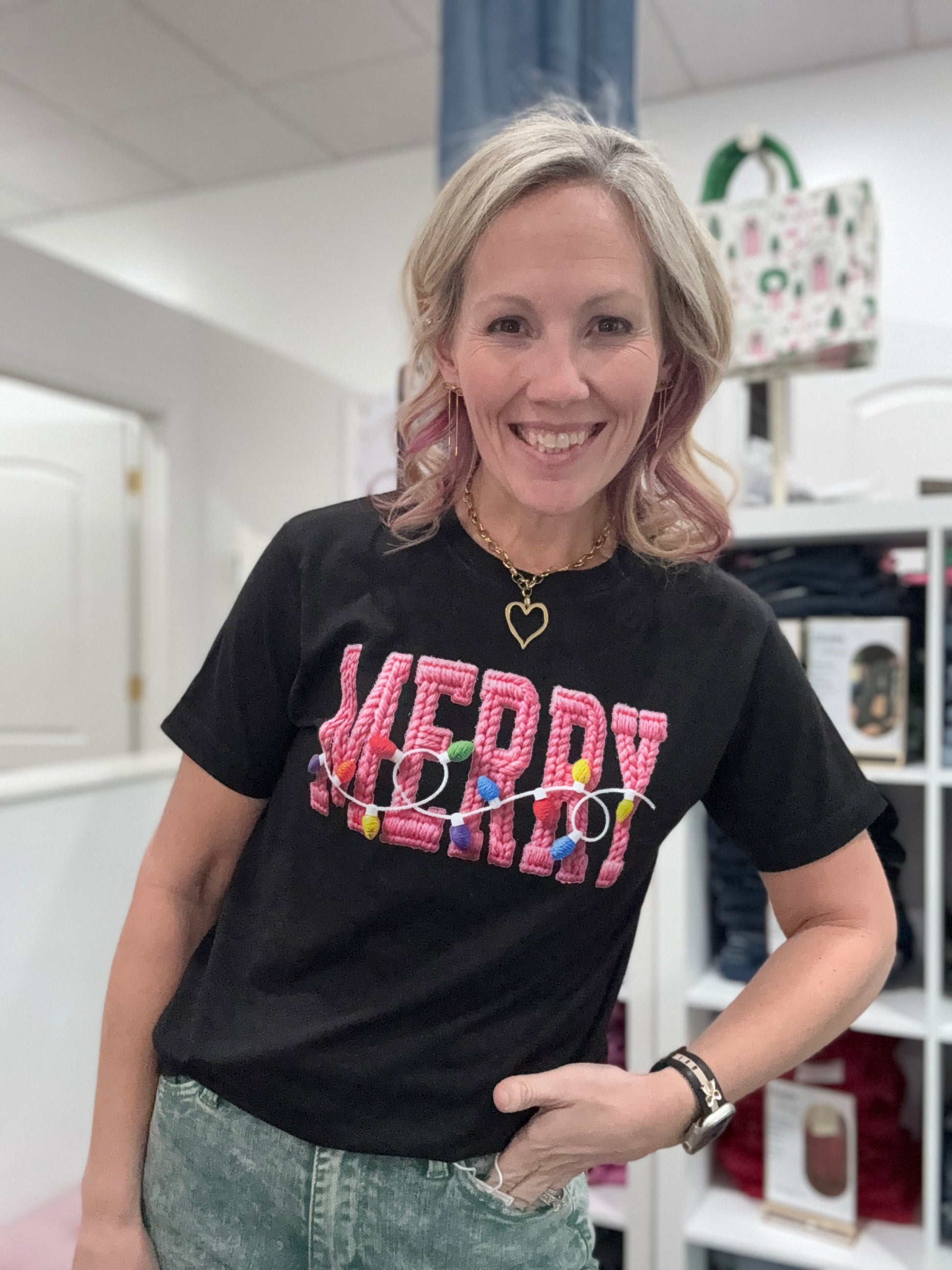 Say hello to the cutest festive tee of the season! Our Merry & Bright Yarn Tee features a playful 3-D yarn–style “Merry” in the sweetest shade of pink, topped with a whimsical string of colorful lights for that perfect holiday pop. Black Tee.