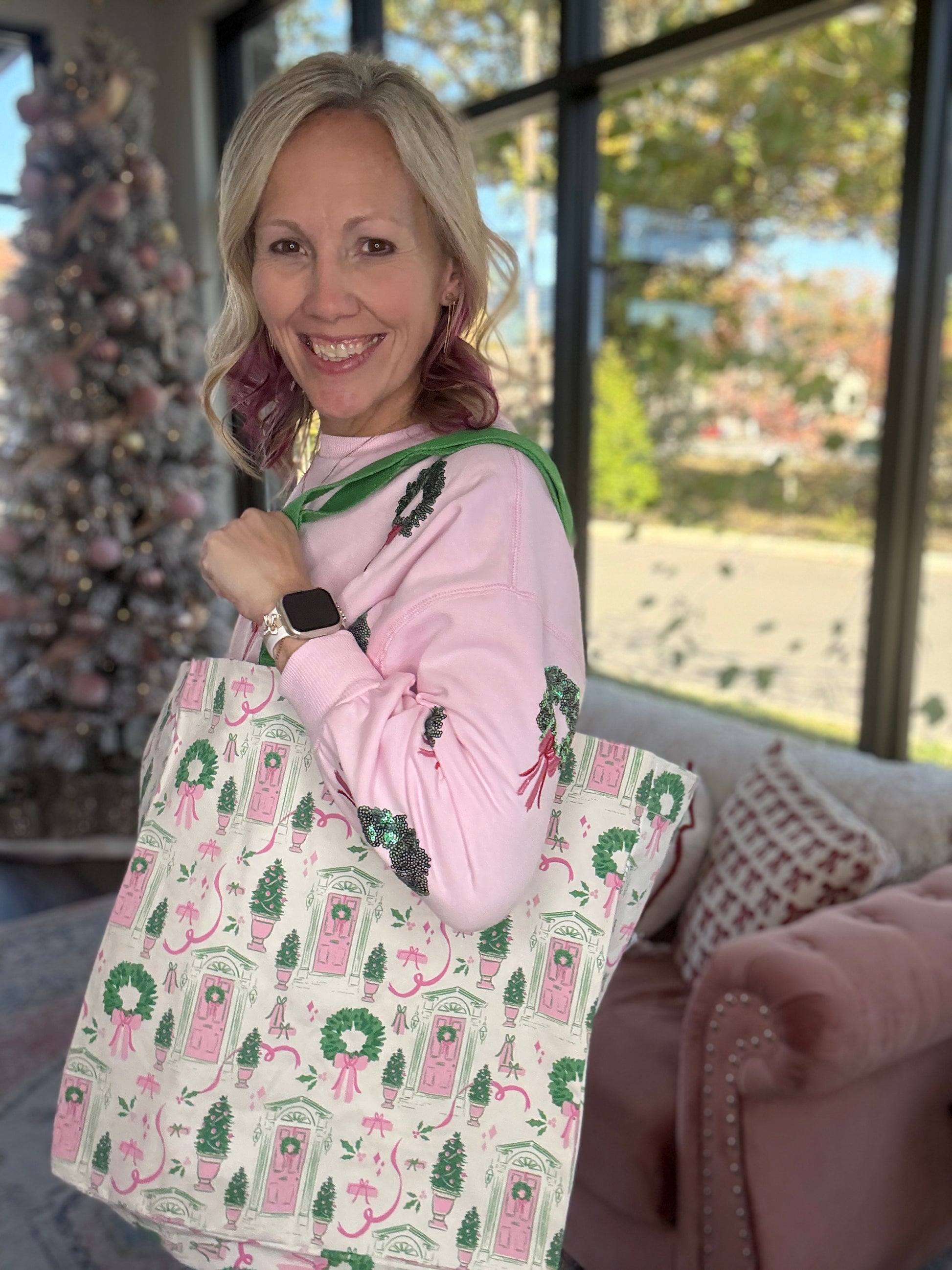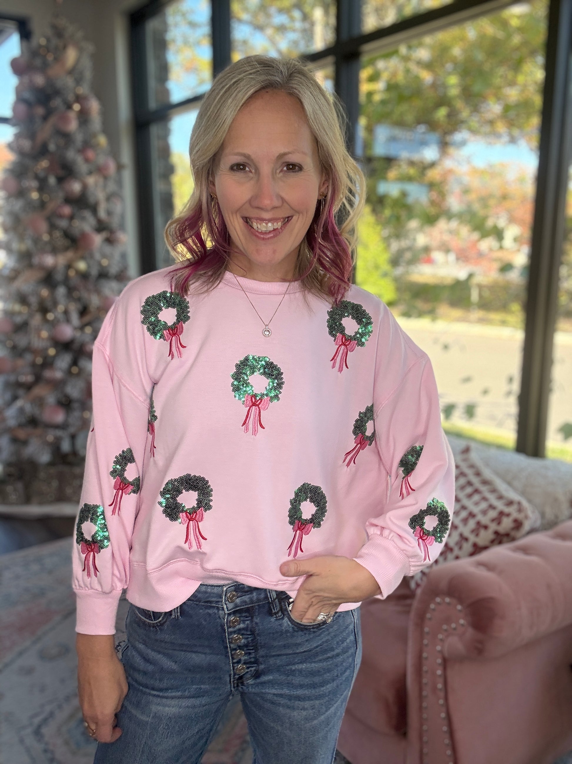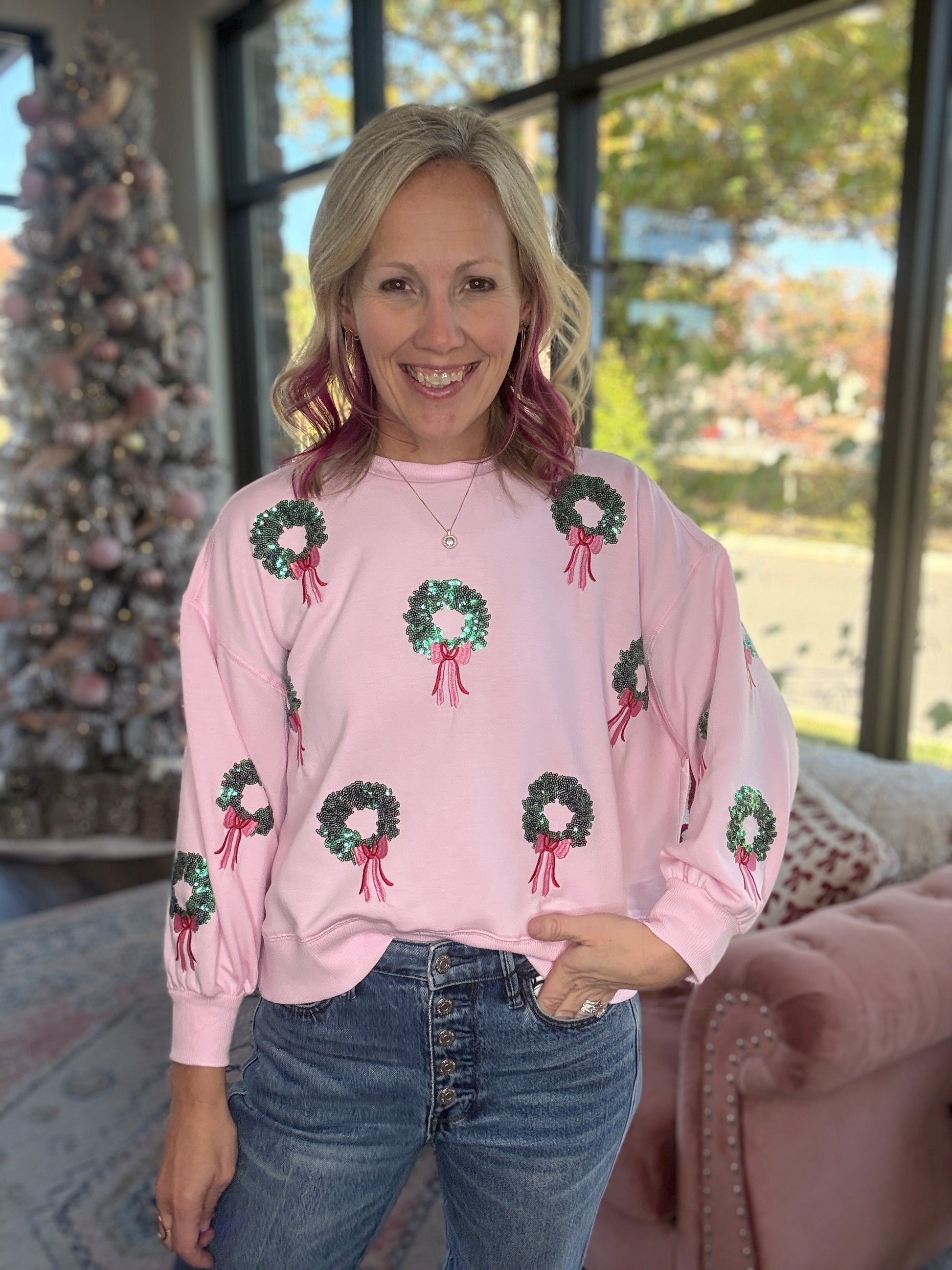 The Merry in Pink Sweatshirt brings a soft and feminine touch to holiday dressing. Designed in a light pink fleece, this cozy pullover features sequin wreath accents topped with matching pink bows, creating a festive look that stays sweet and polished.
