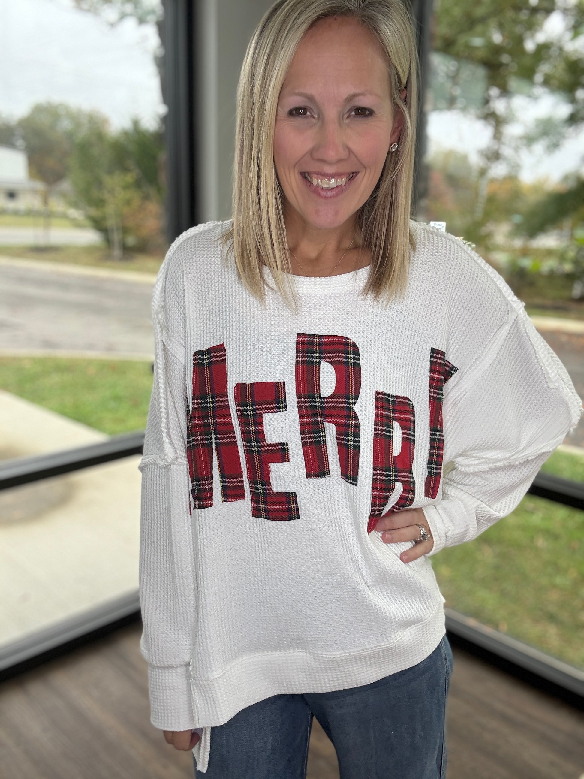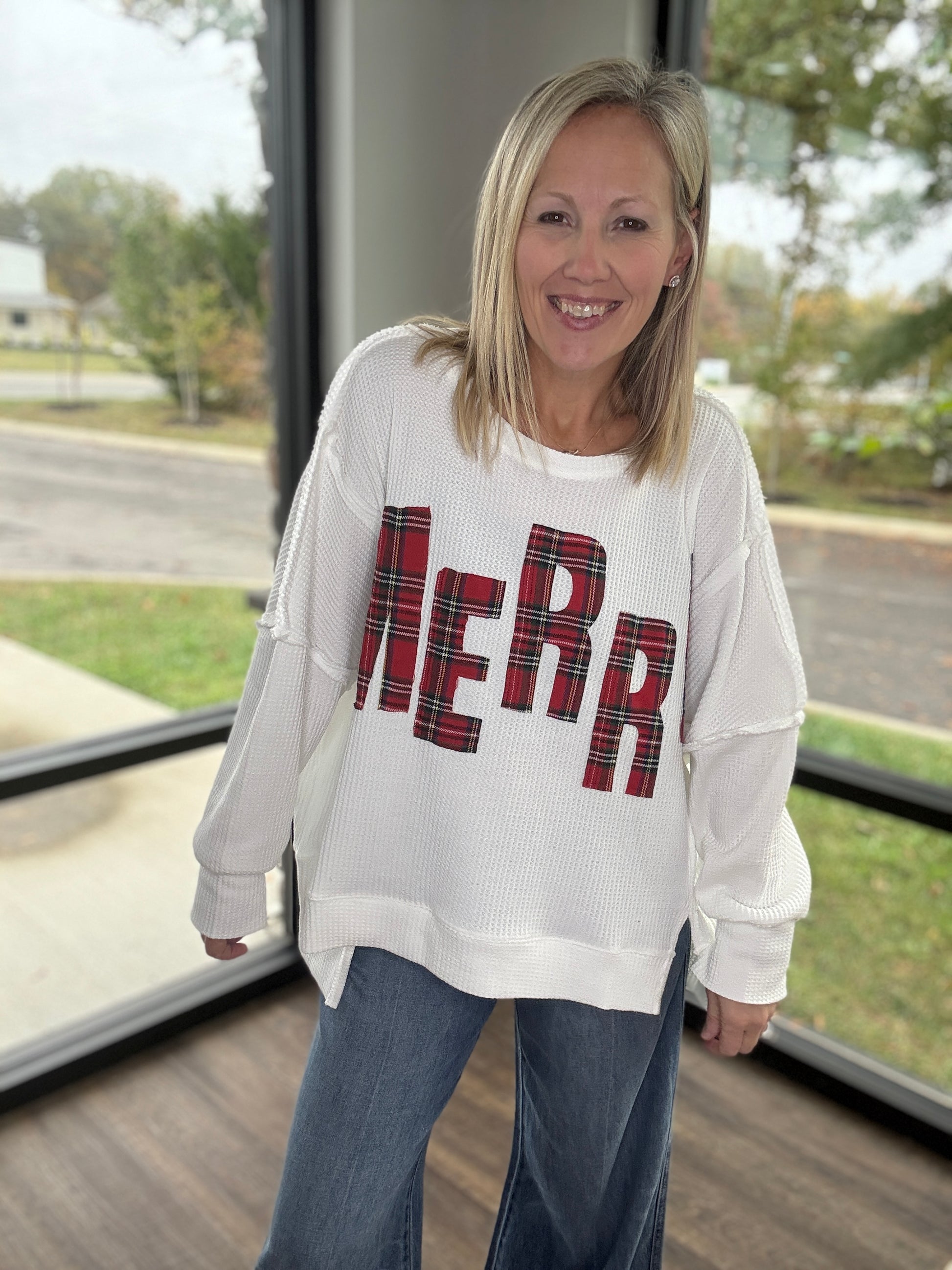Get cozy and festive in the Merry & Plaid Waffle Thermal — the ultimate Christmas sweatshirt for all your merry moments! 🎄 Made with a soft, textured waffle knit and featuring bold red plaid “MERRY” lettering across the front, this oversized thermal brings all the holiday charm with effortless comfort.