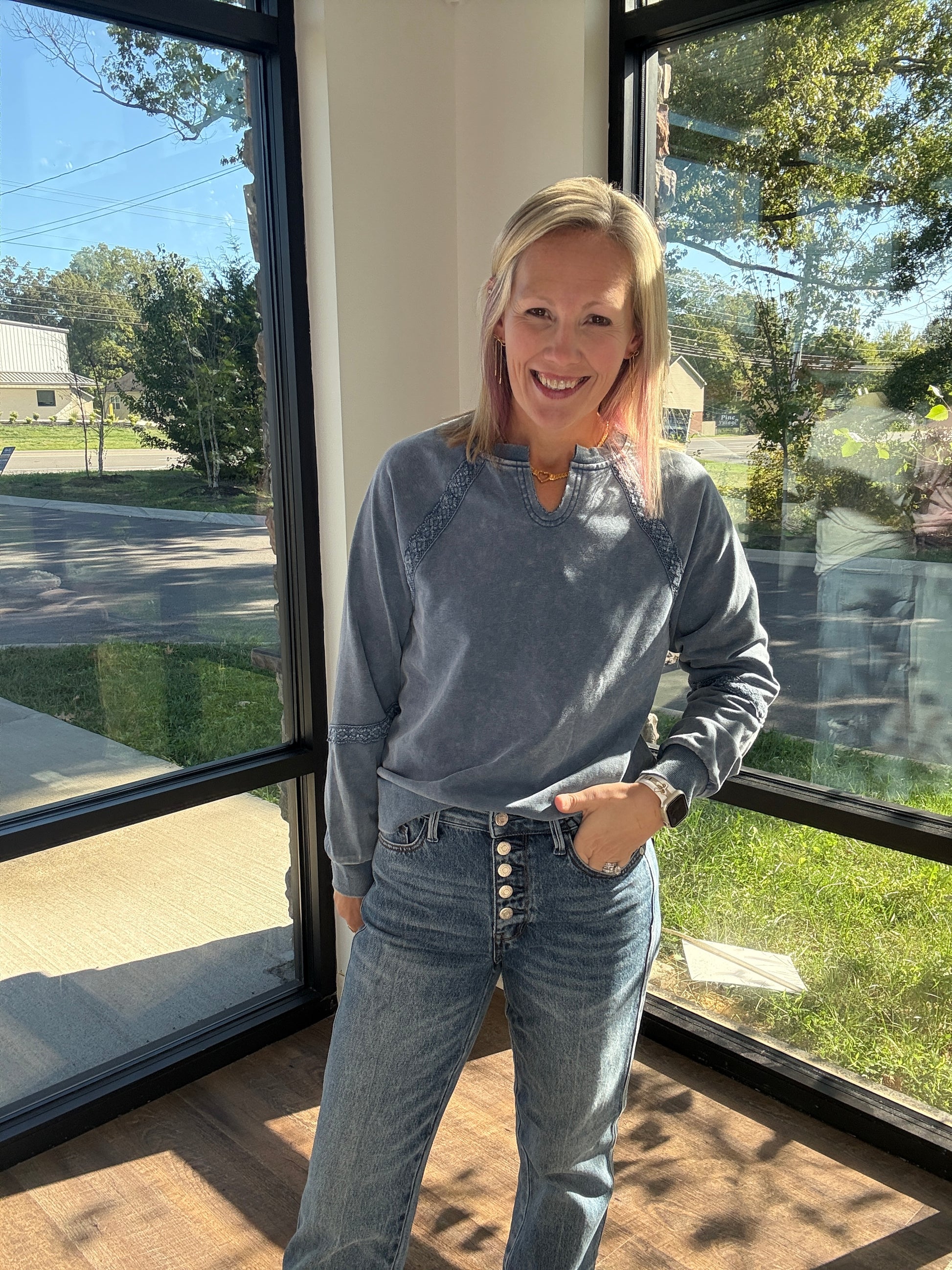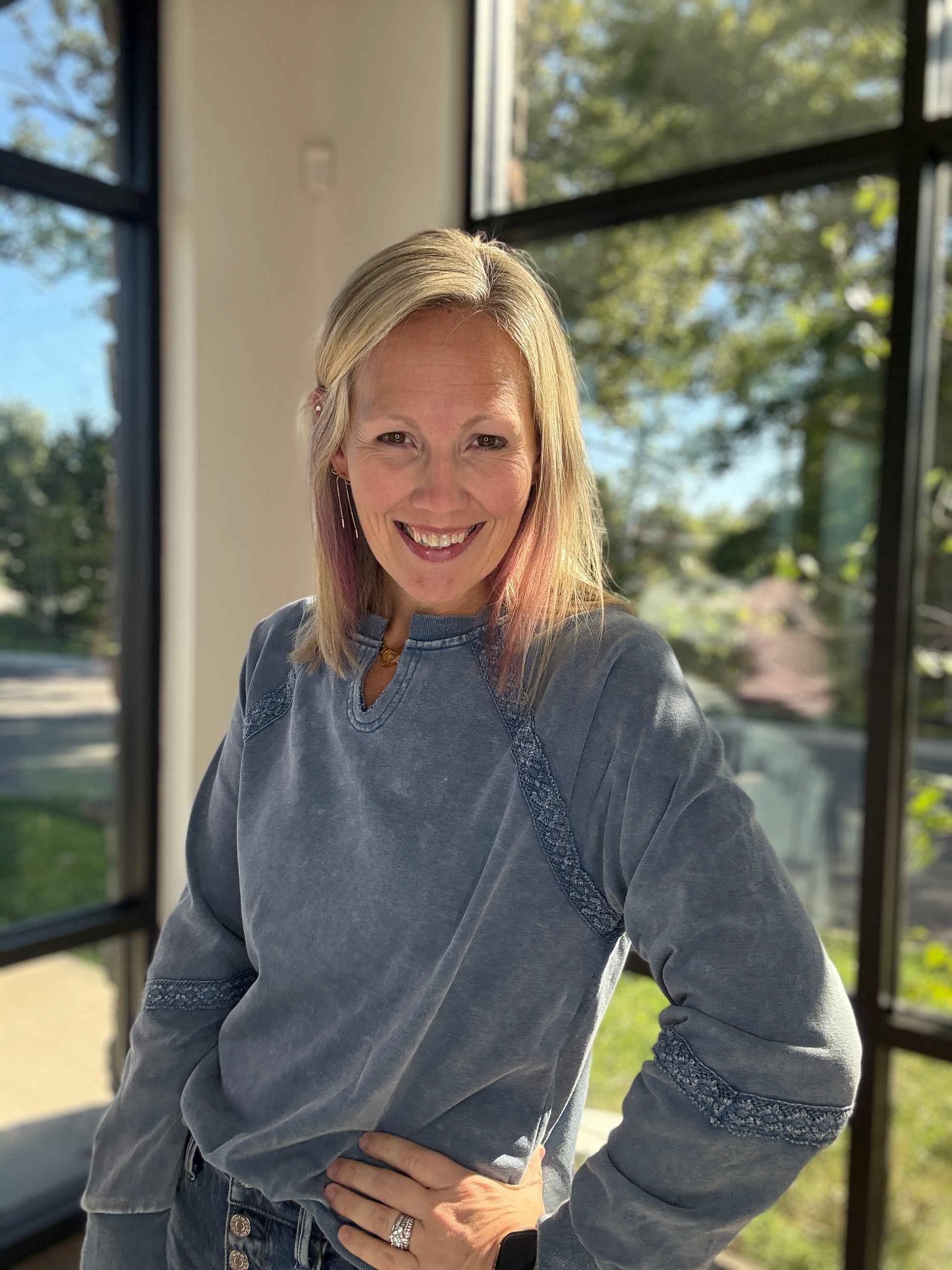 Cozy meets chic with the Mineral Lace Patch Sweatshirt — your new go-to for effortless style this season. Designed in a soft mineral wash finish (available in olive, pink, and blue), this loose-fit sweatshirt has a relaxed, lived-in vibe you’ll love. The feminine lace patch detail runs from the front to the back, giving it a touch of elegance while keeping it casual and comfy. With its easy V-neckline and roomy fit, it’s perfect for layering over tanks or pairing with your favorite denim. A sweatshirt that’s equal parts cozy and elevated — exactly what your fall wardrobe’s been waiting for. 🍂