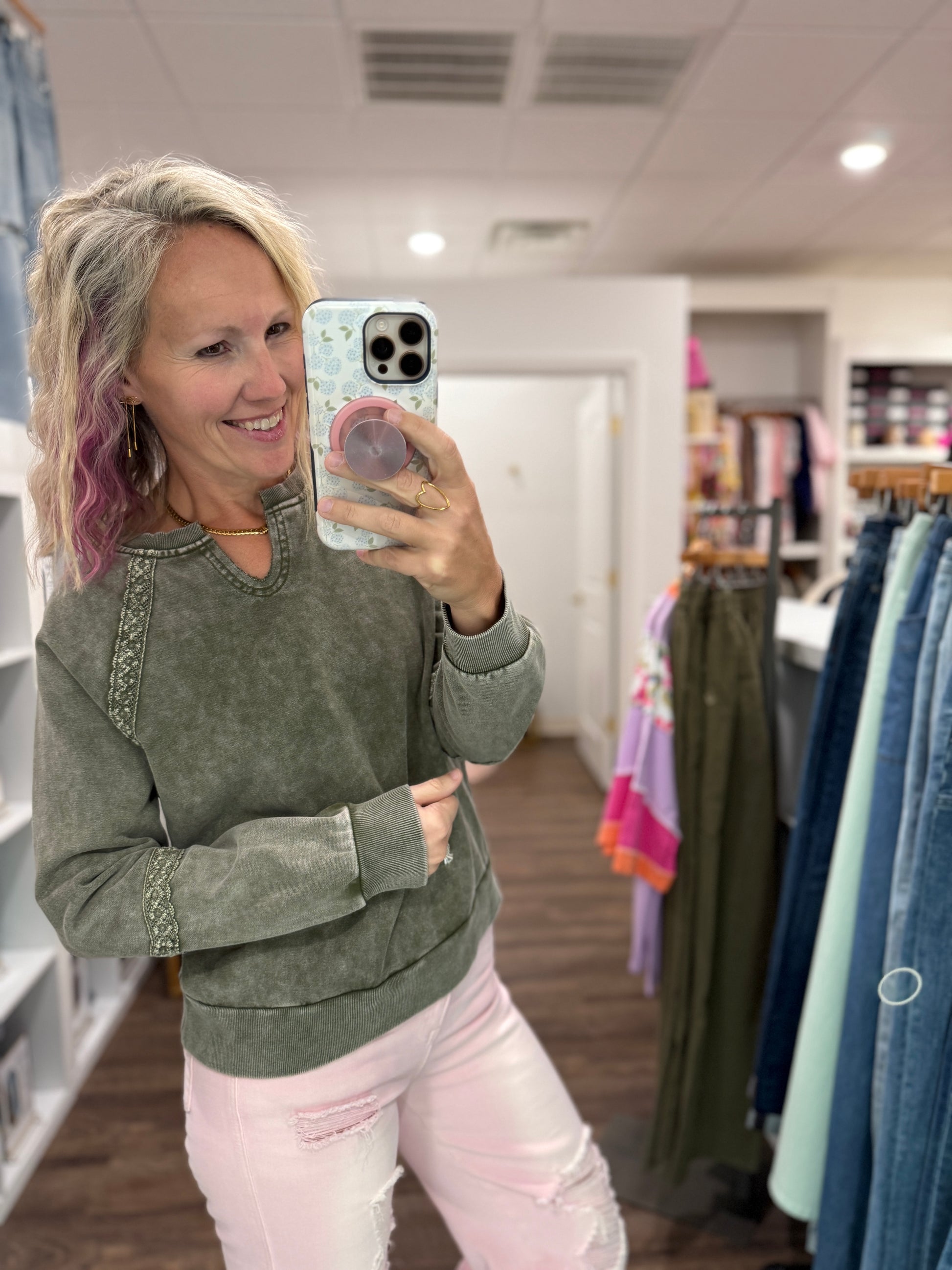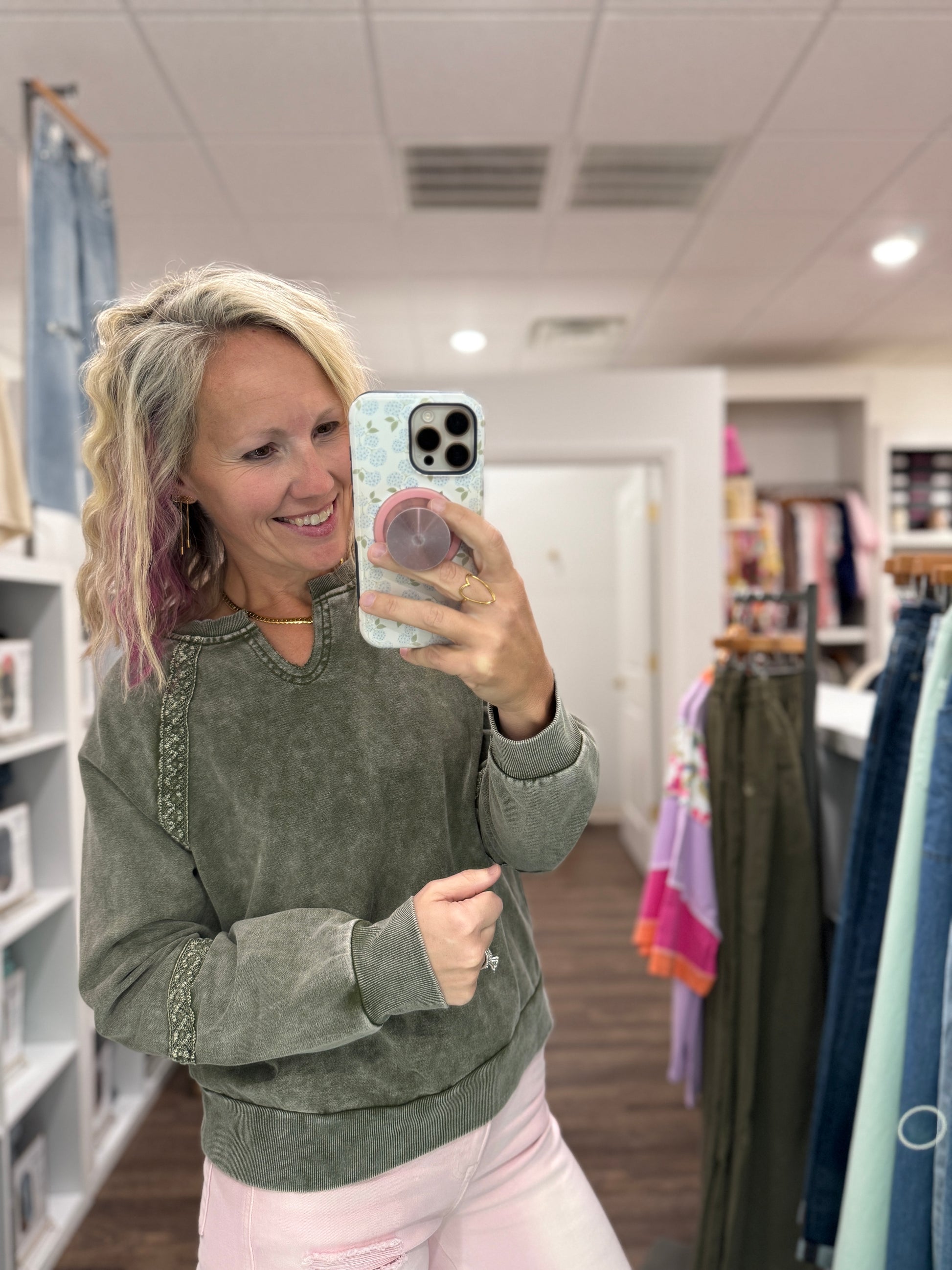 Cozy meets chic with the Mineral Lace Patch Sweatshirt — your new go-to for effortless style this season. Designed in a soft mineral wash finish (available in olive or purple), this loose-fit sweatshirt has a relaxed, lived-in vibe you’ll love. The feminine lace patch detail runs from the front to the back, giving it a touch of elegance while keeping it casual and comfy. With its easy V-neckline and roomy fit, it’s perfect for layering over tanks or pairing with your favorite denim. A sweatshirt that’s equal parts cozy and elevated — exactly what your fall wardrobe’s been waiting for. 🍂