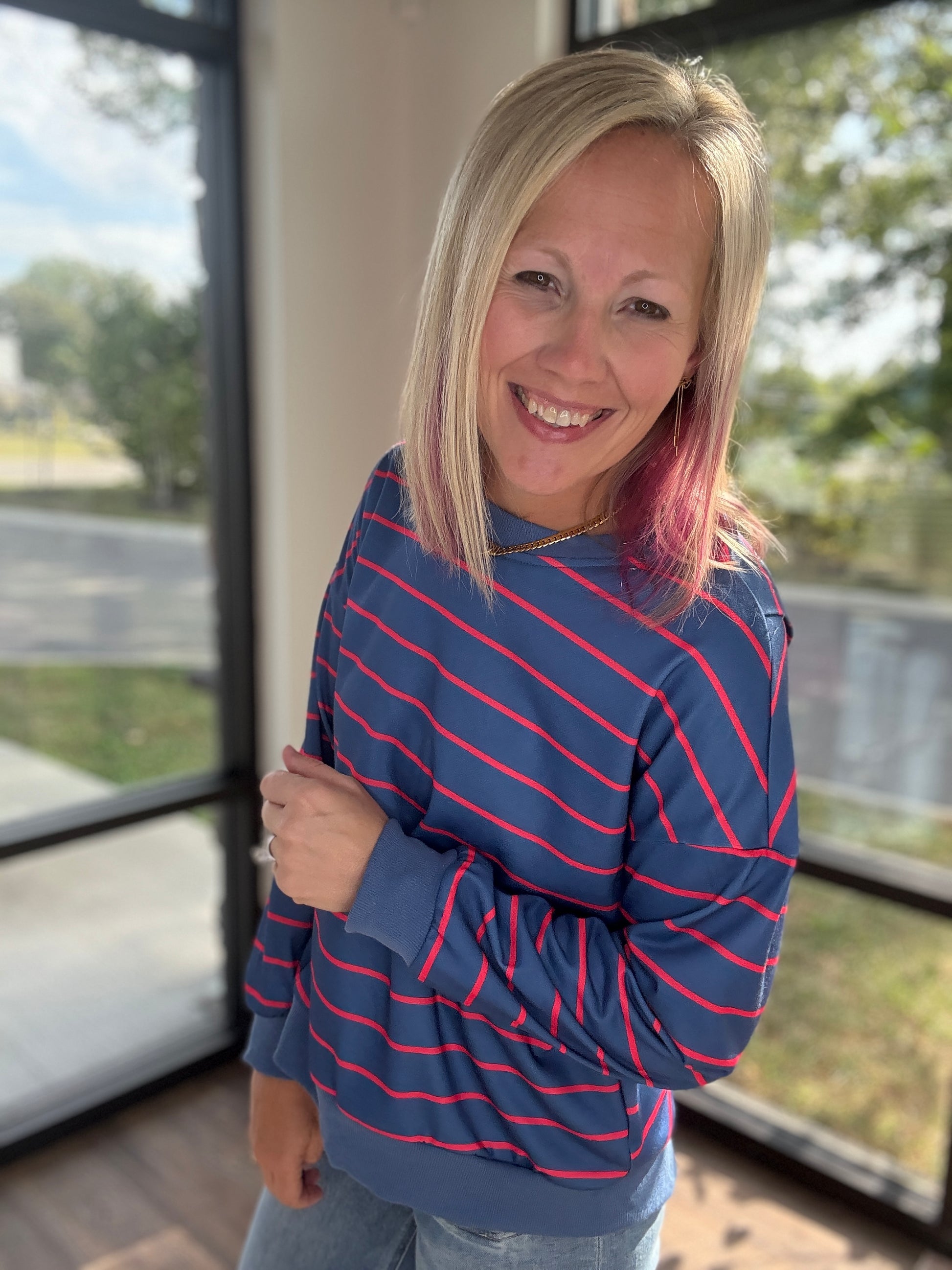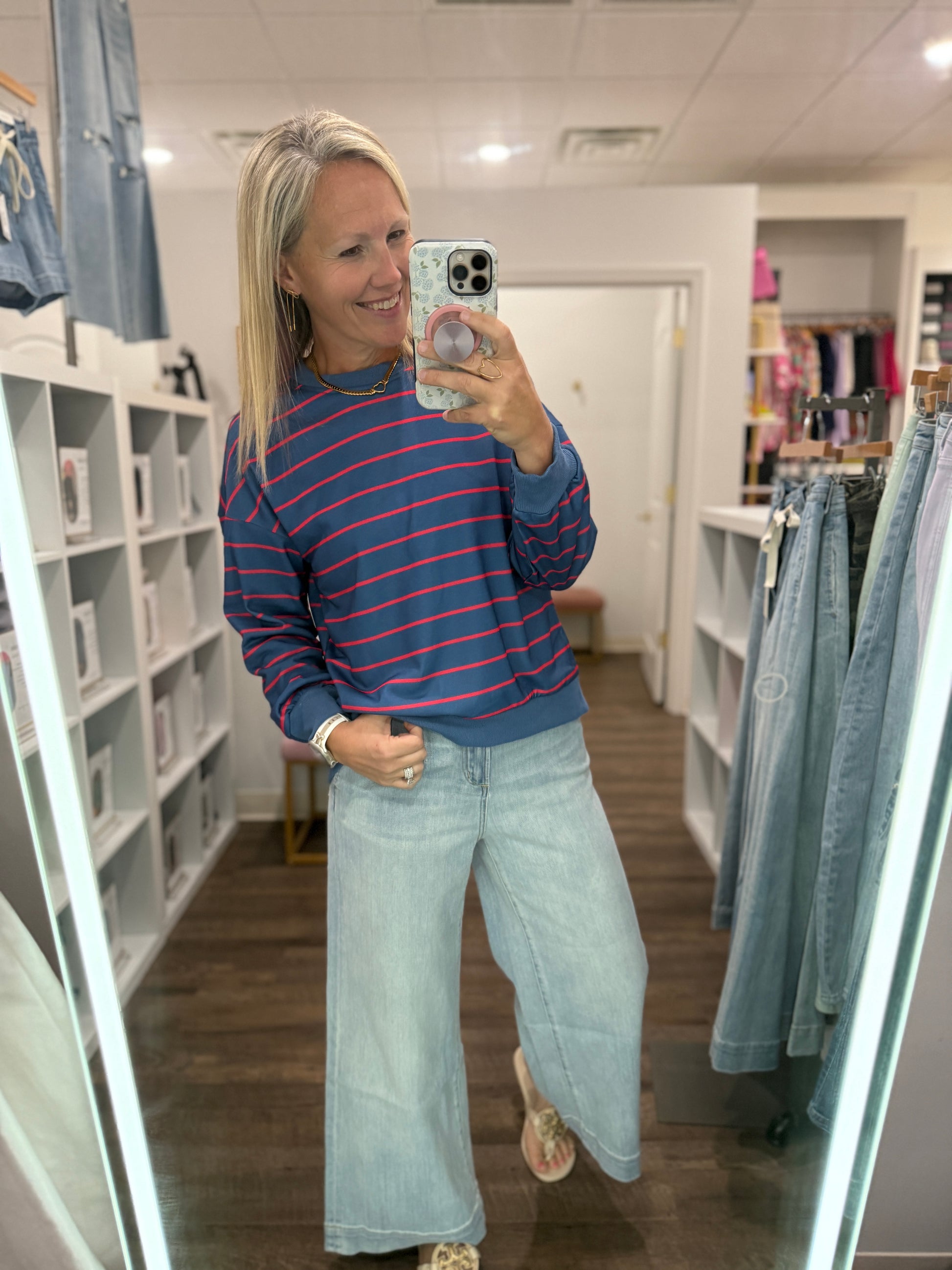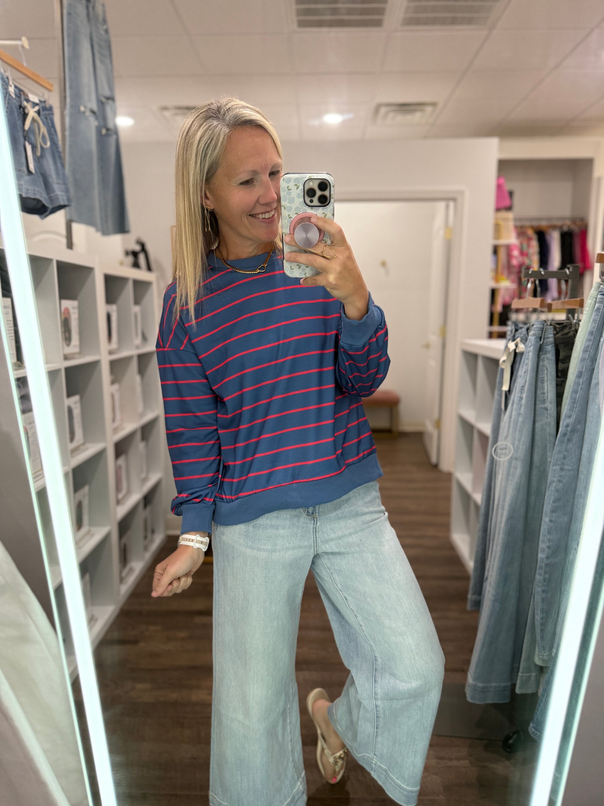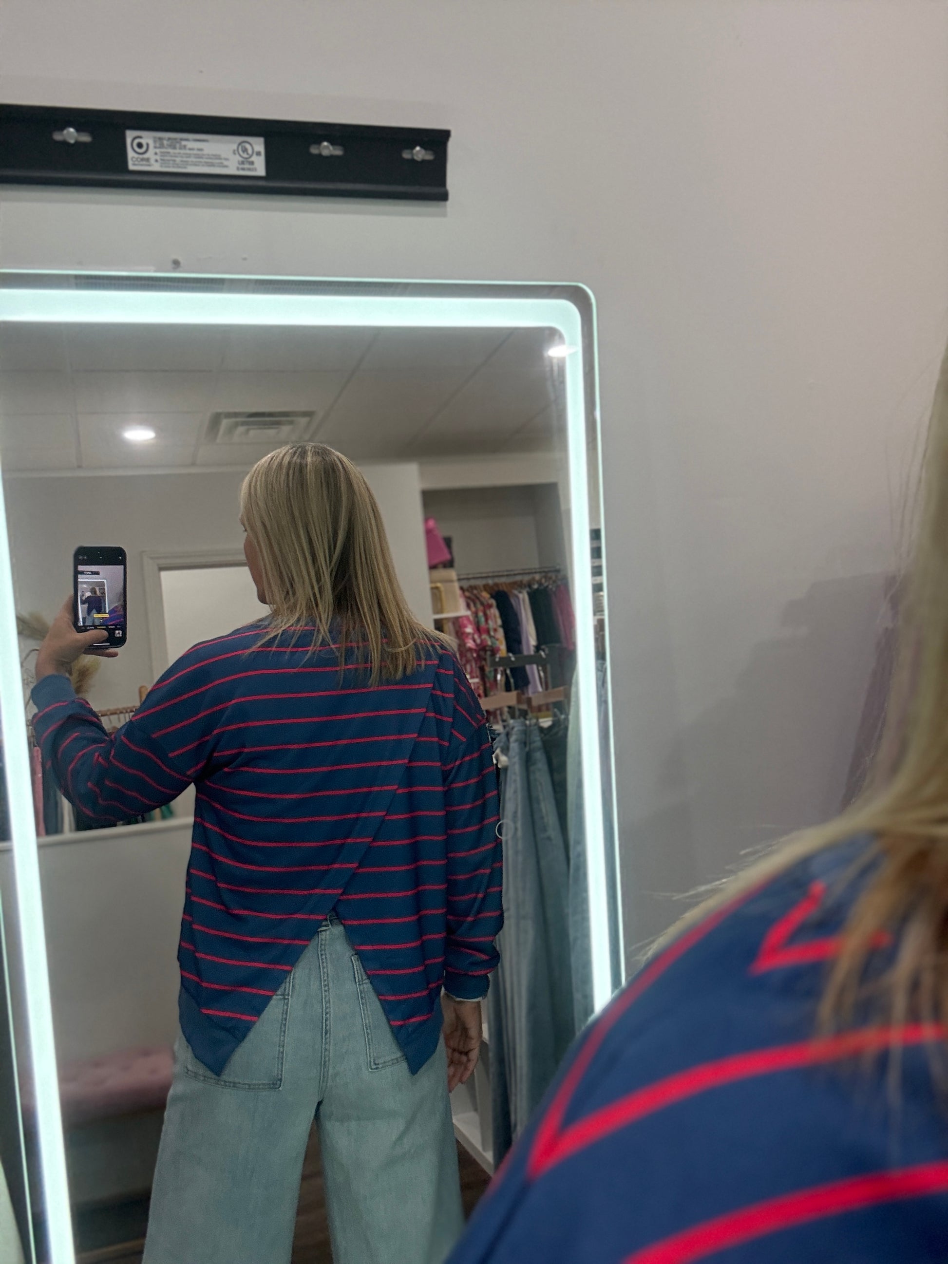 The Navy + Red Stripe Criss Cross Back Top is classic with a twist — literally. A rich navy base is accented with a bold red stripe for that timeless, sporty-chic vibe, while the back steals the show with a playful criss cross design that’s just the right amount of unexpected.