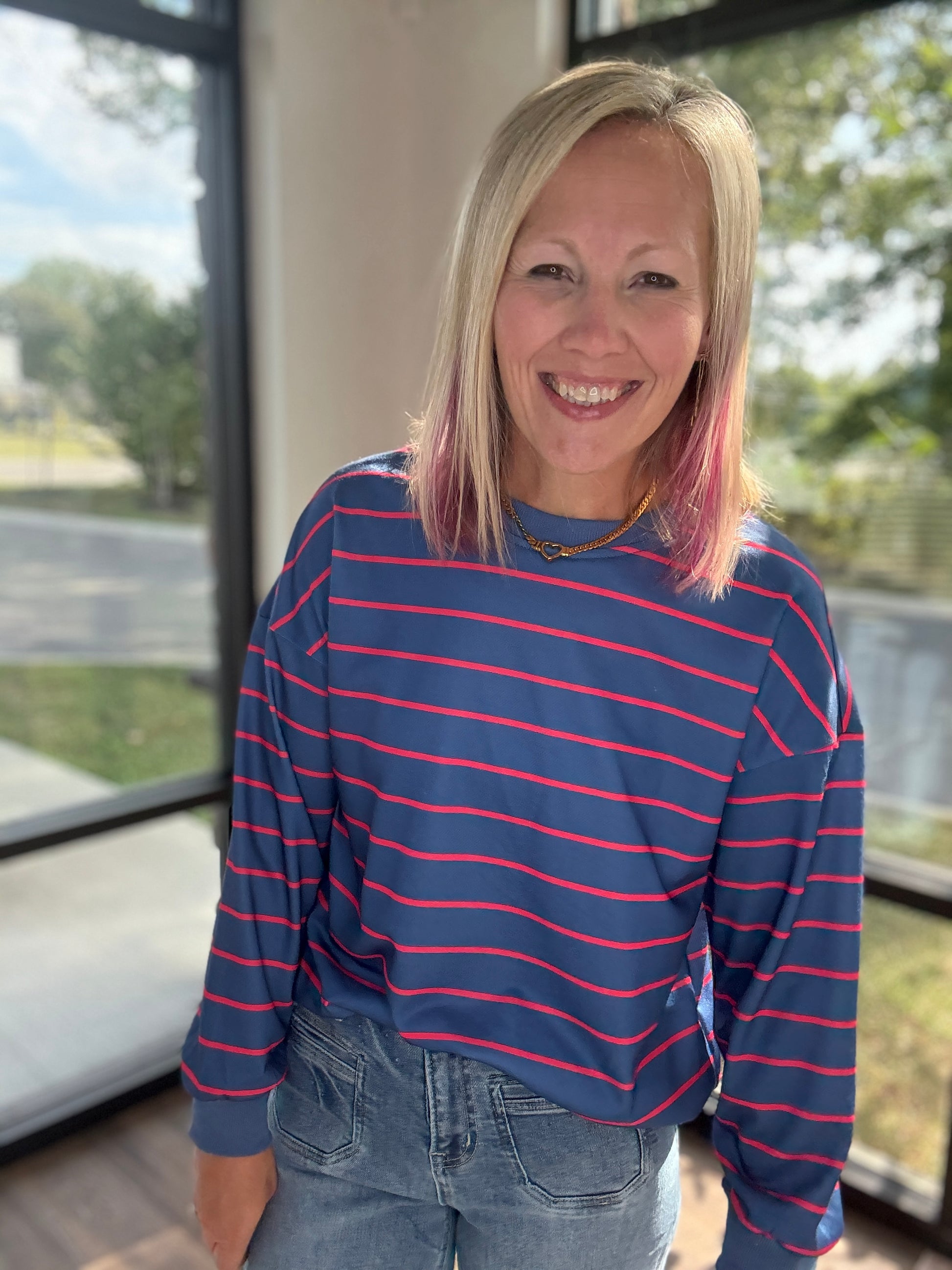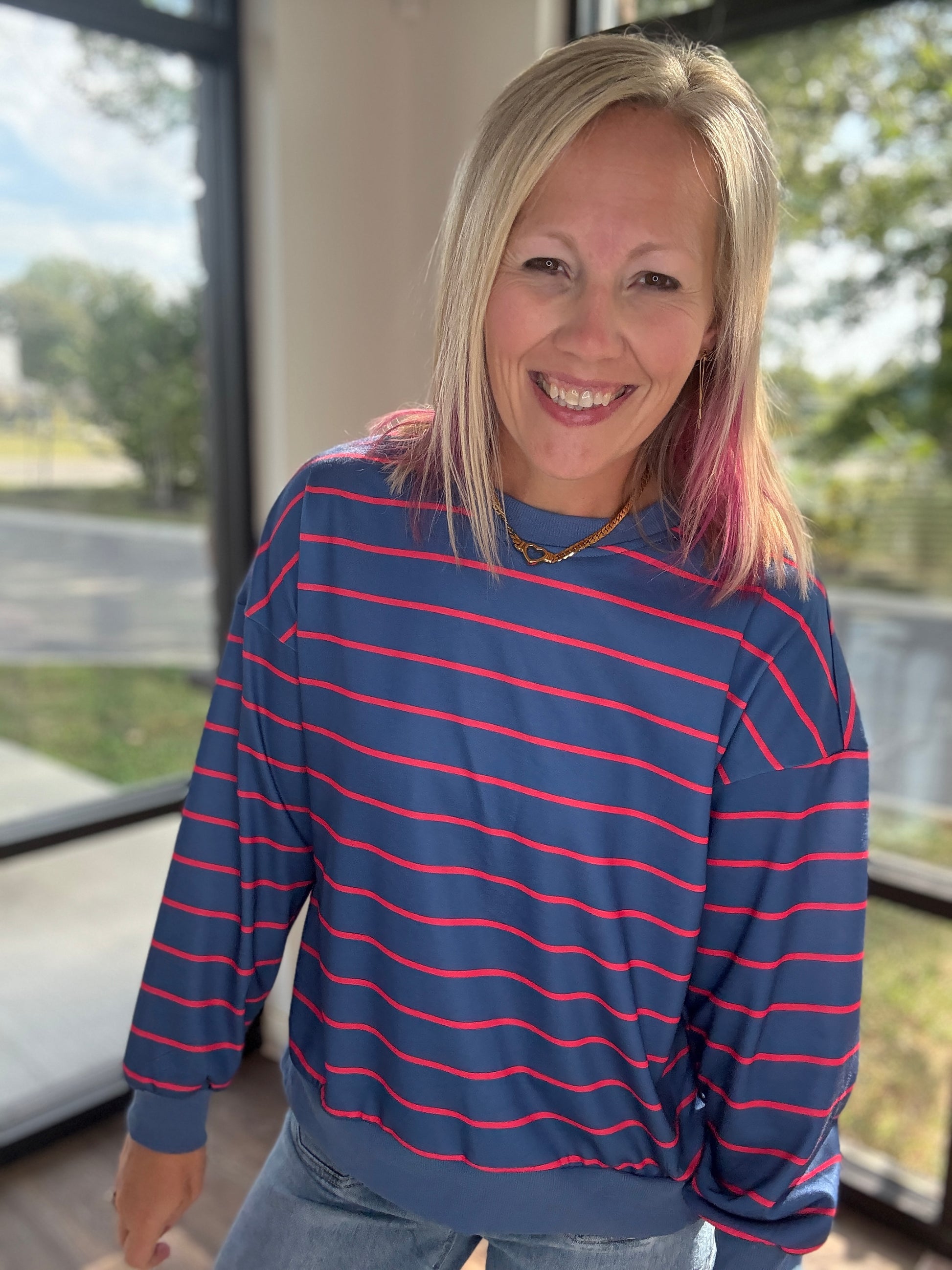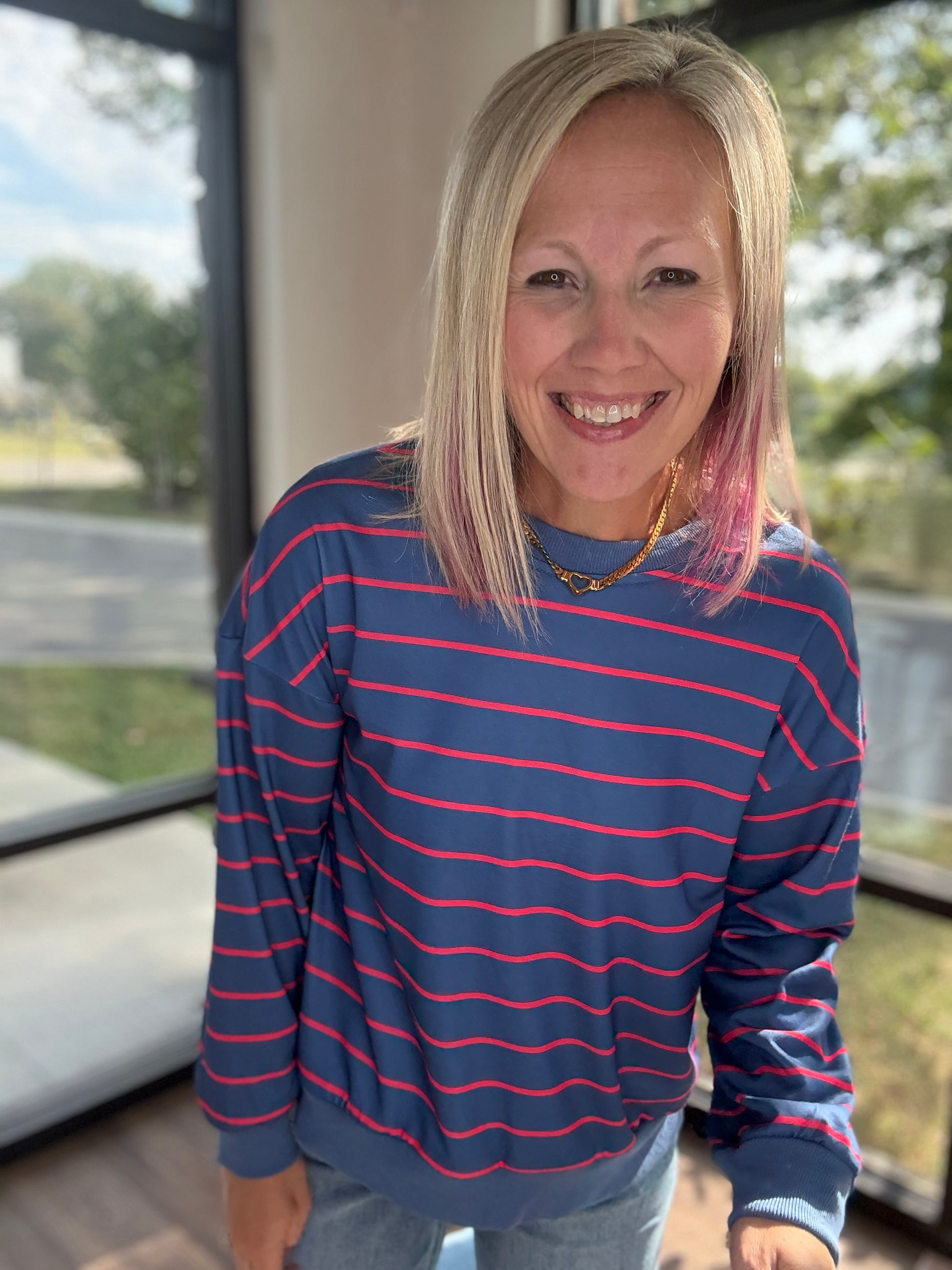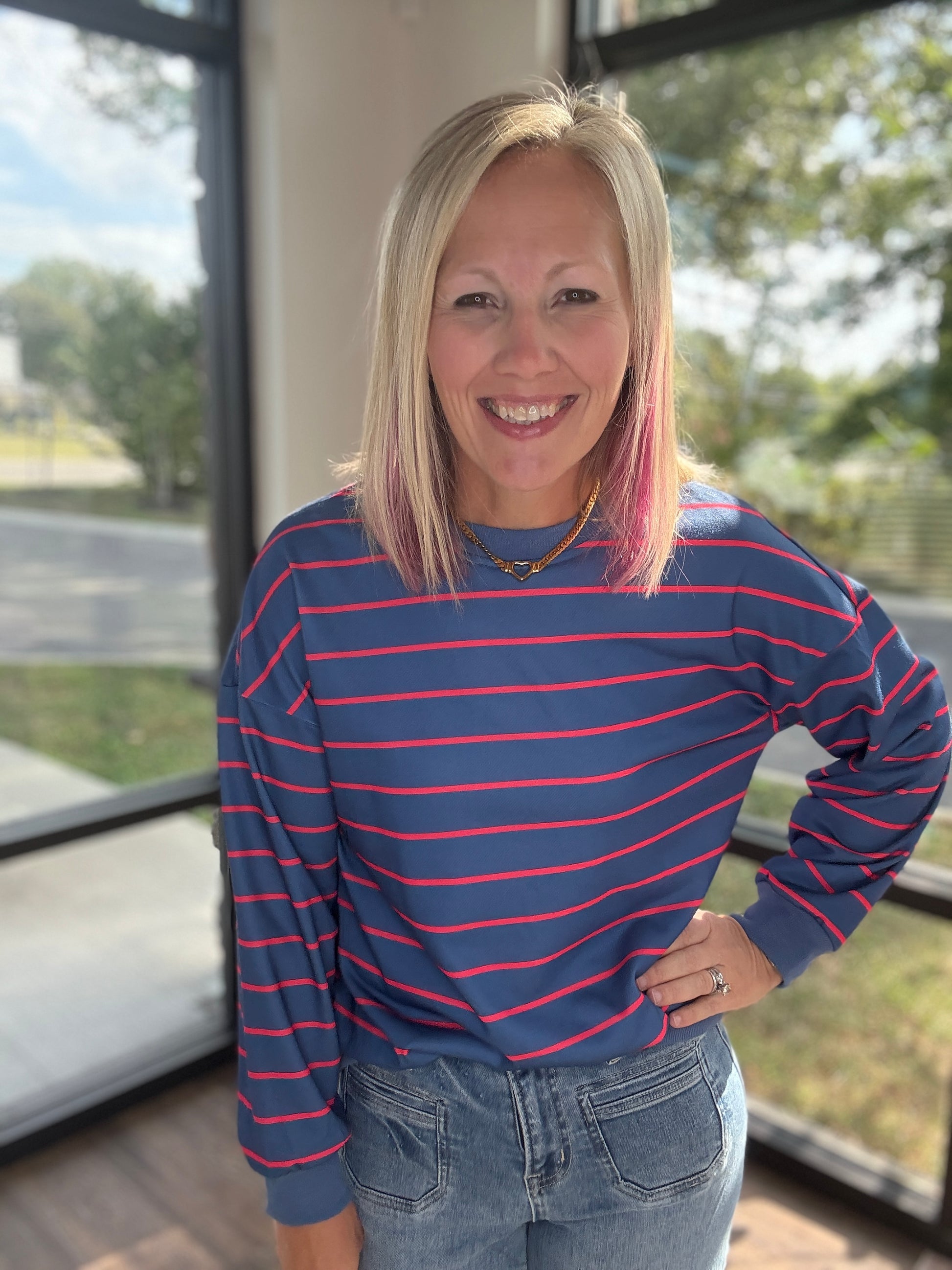 The Navy + Red Stripe Criss Cross Back Top is classic with a twist — literally. A rich navy base is accented with a bold red stripe for that timeless, sporty-chic vibe, while the back steals the show with a playful criss cross design that’s just the right amount of unexpected.
