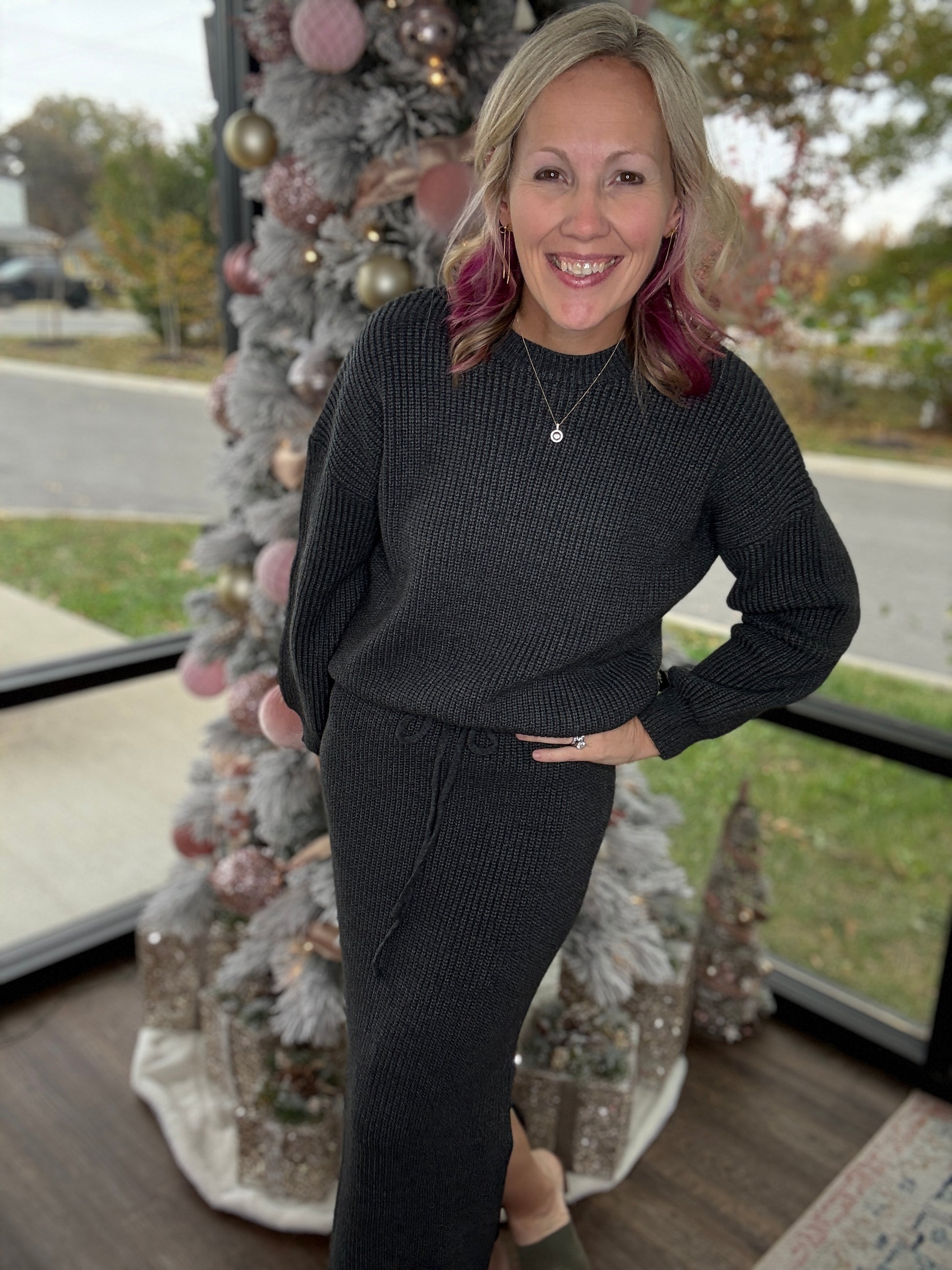 Wear it with the matching sweater for an effortless set or style it with tees, bodysuits, or button-downs for everyday versatility. This is the kind of piece that feels just as good as it looks—simple, elevated, and endlessly wearable.