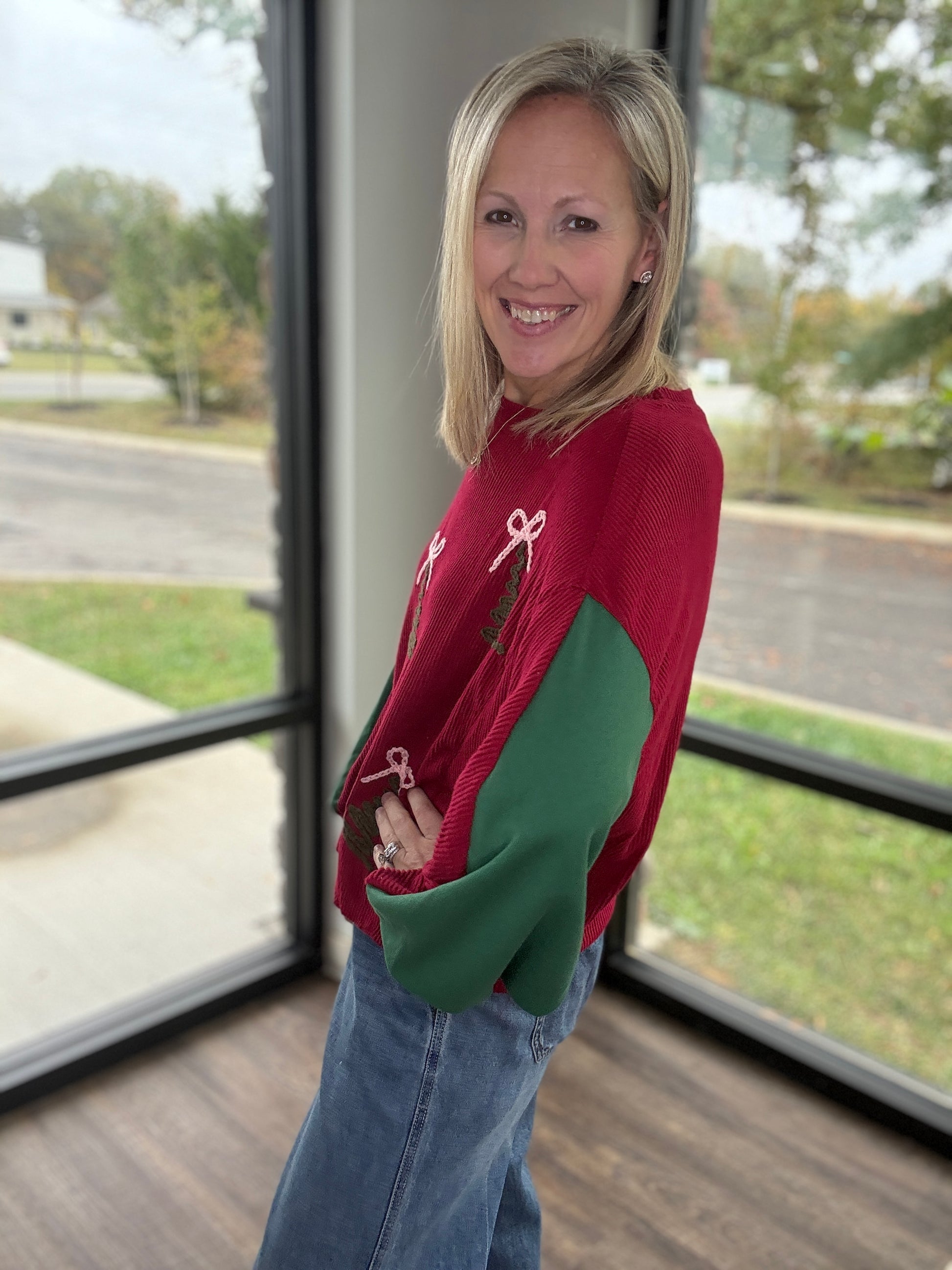 Bring on the holiday cheer with the Oh Christmas Tree Sweater — a festive favorite that’s as merry as it is cozy! 🎄✨ Made in a classic Christmas red, this soft knit sweater features yarn-sewn Christmas trees adorned with the sweetest pink bows for a playful pop of color and texture.