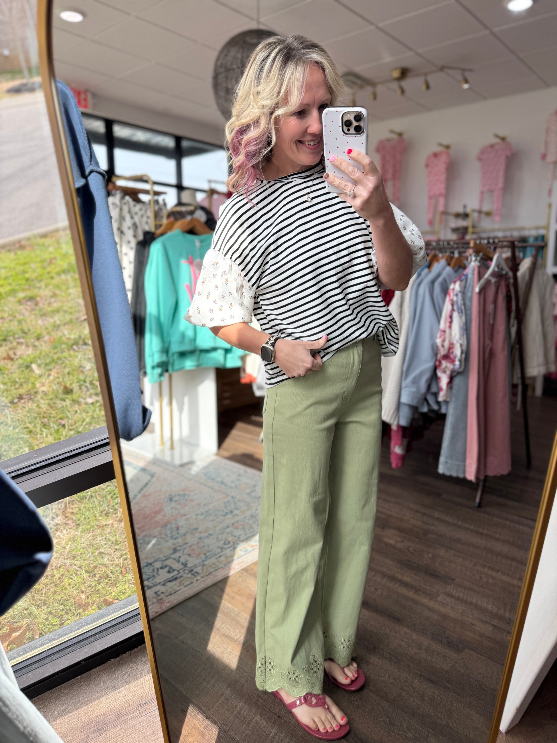 Perfect for brunch dates, showers, church Sundays, or just dressing up your everyday look, they bring boutique charm in all the right ways. Available in pink and green, they pair beautifully with simple tees, flowy blouses, or lightweight sweaters.