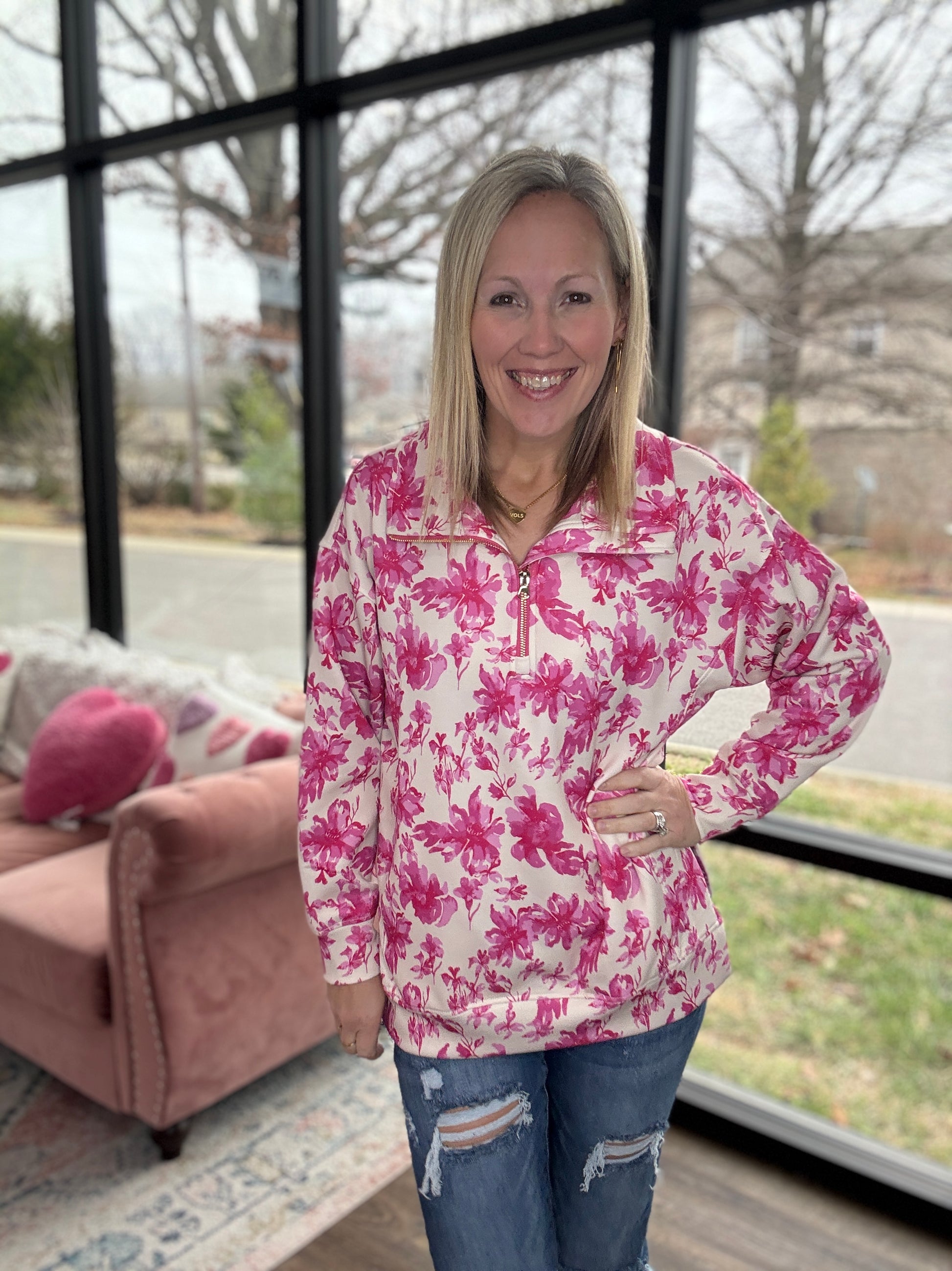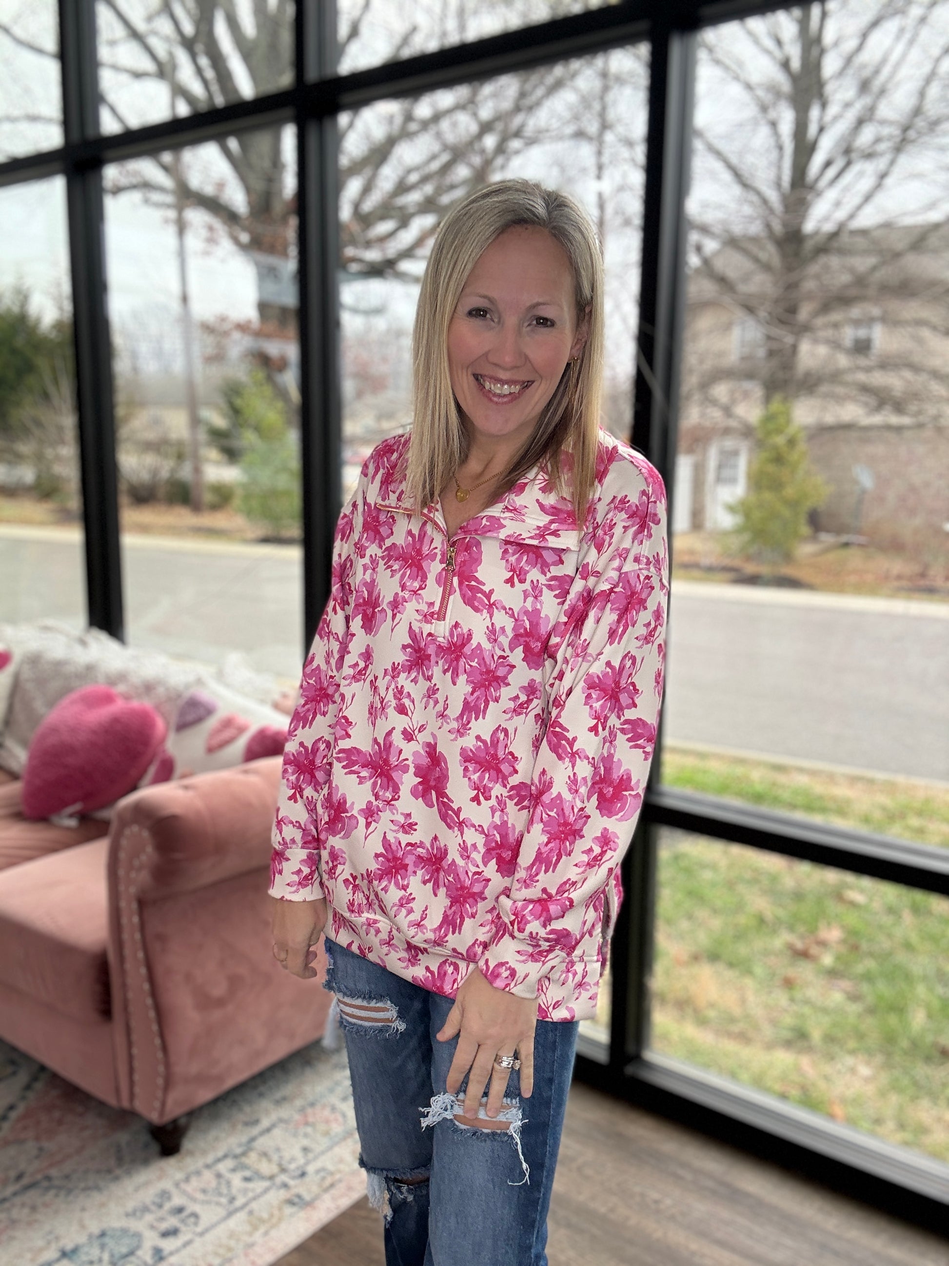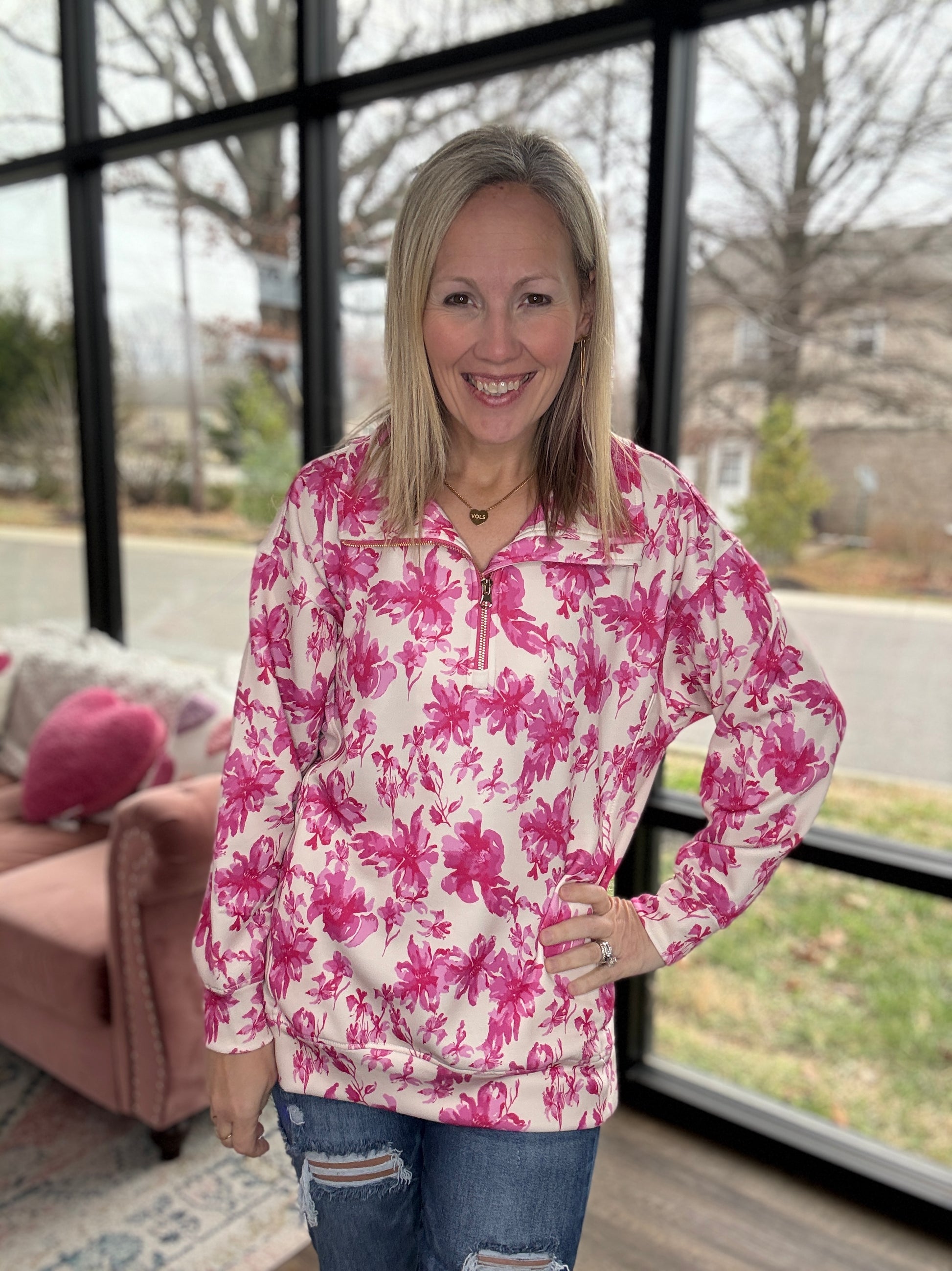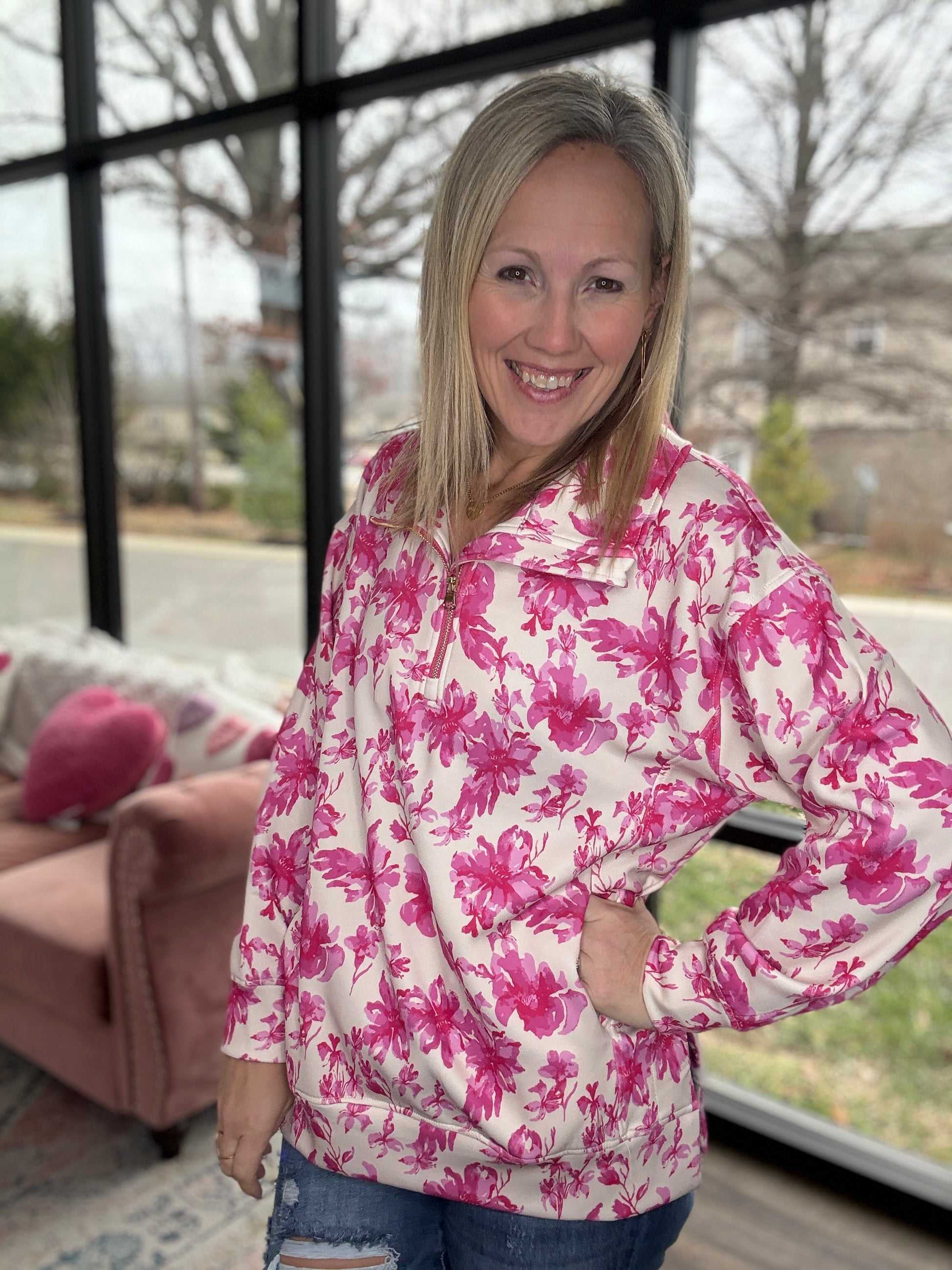 Wrap yourself in elegant comfort with the Pink Blossom Luxe Quarter Zip Pullover. Crafted from a premium, ultra-soft fabric, this stunning piece features a beautiful pink floral pattern accented with a gold quarter-zip for a polished, boutique finish.