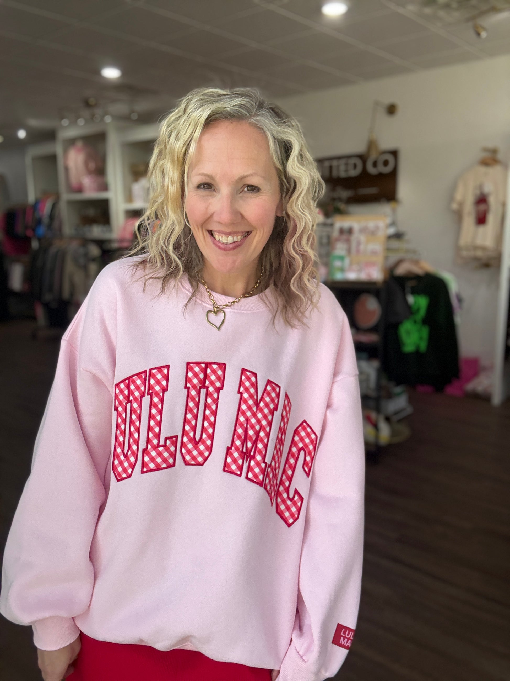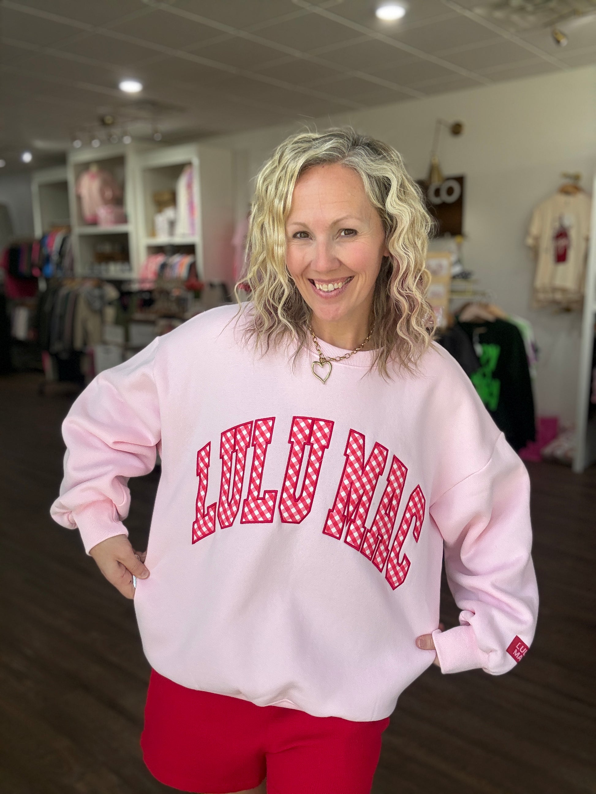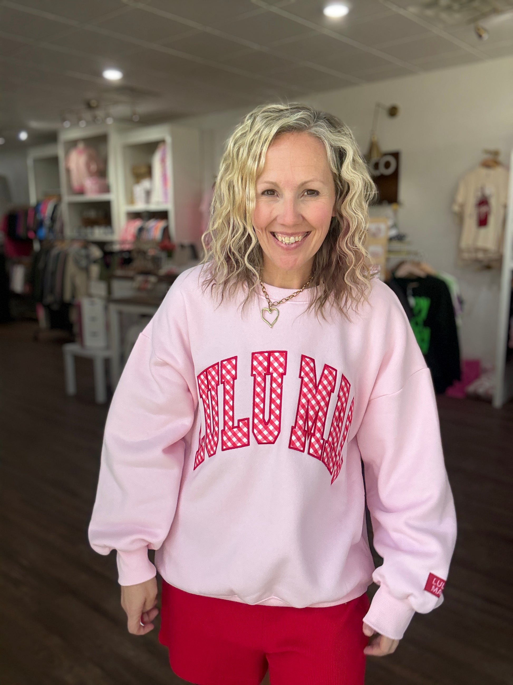 Sweet, bold, and full of charm — the Gingham Heart Lulu Mac Sweatshirt is the perfect blend of cozy comfort and standout style. Designed in a beautiful pink hue, this sweatshirt features the beloved Lulu Mac graphic with charming red gingham details that give it a playful, feminine touch.