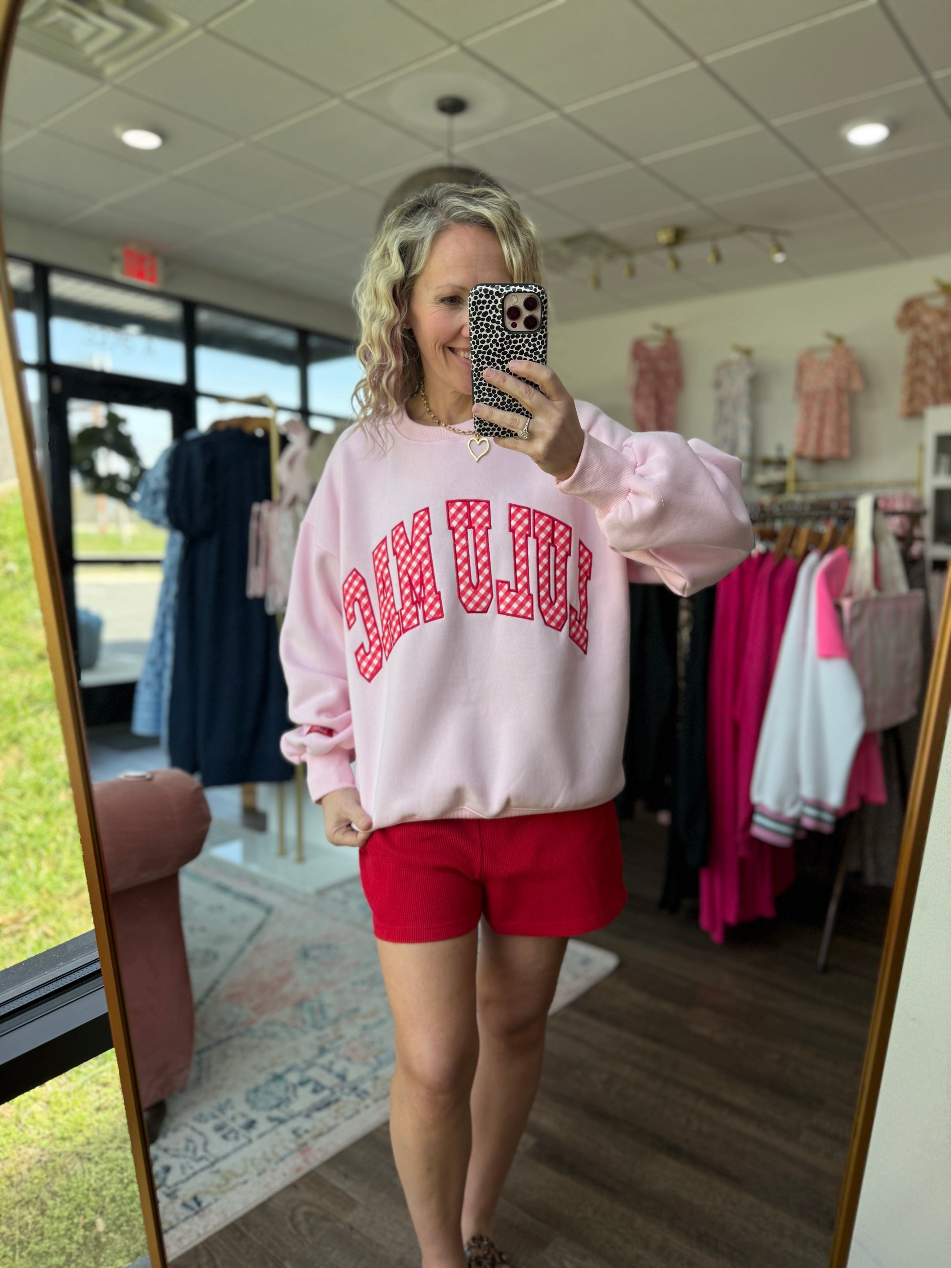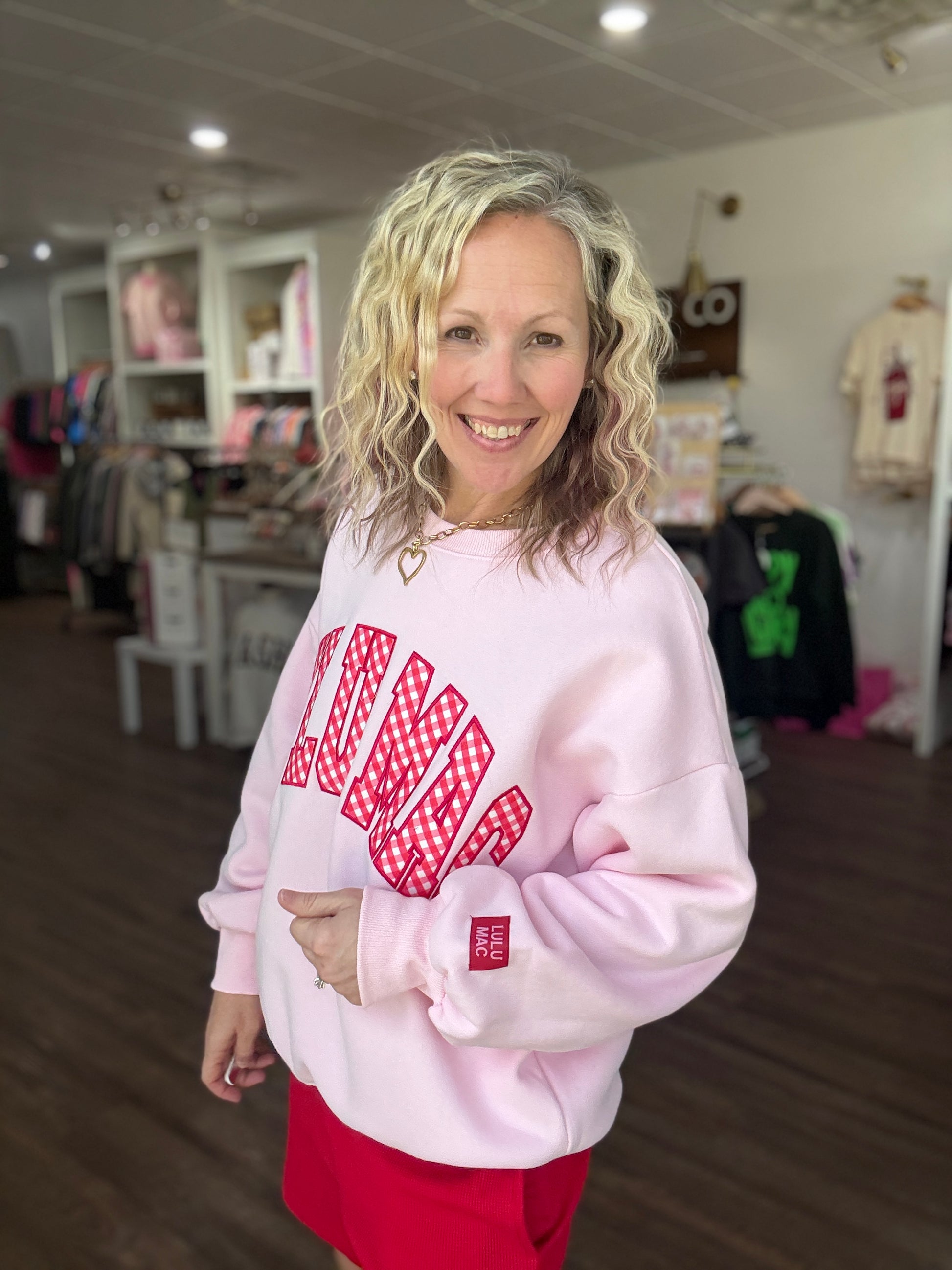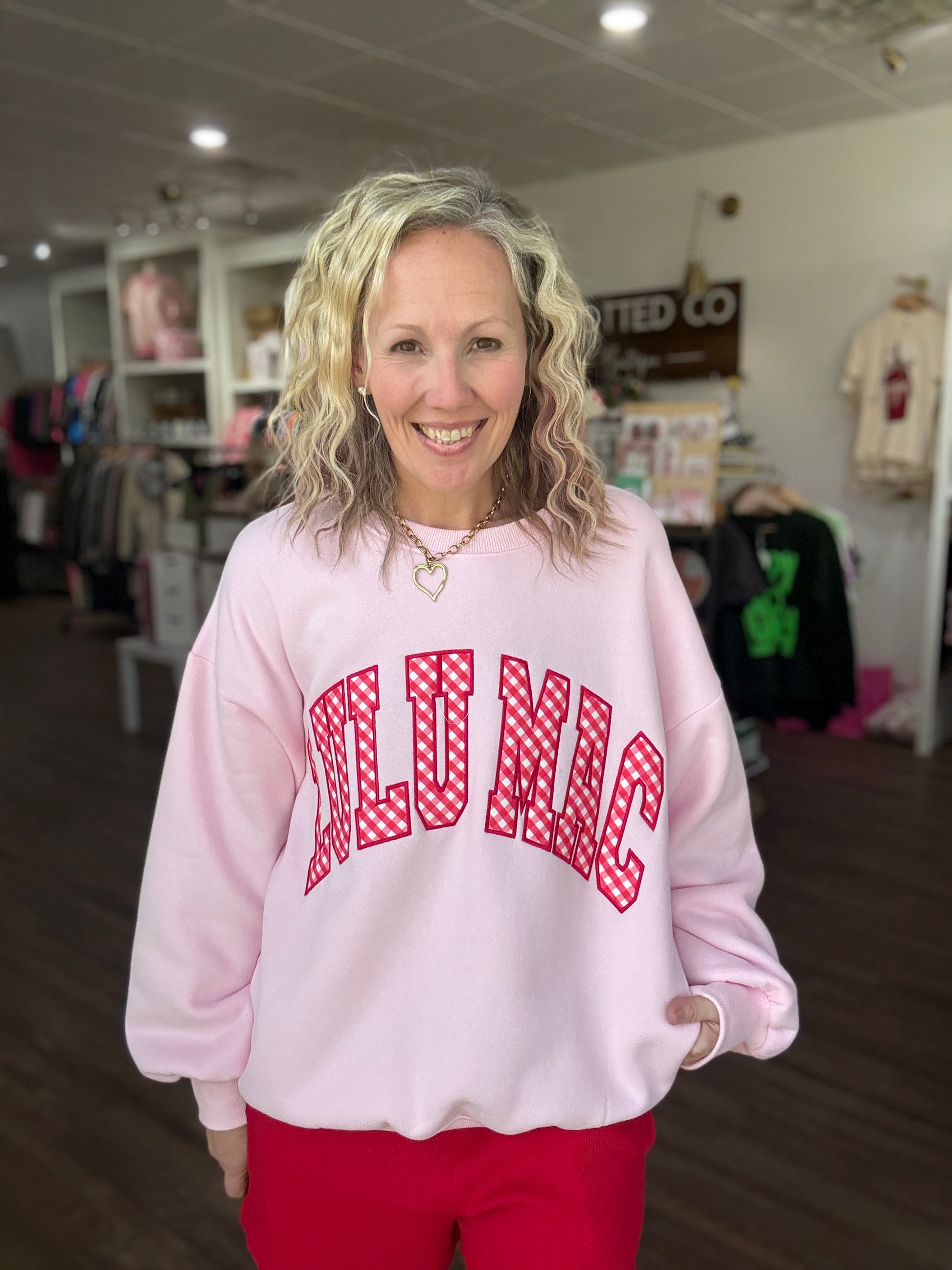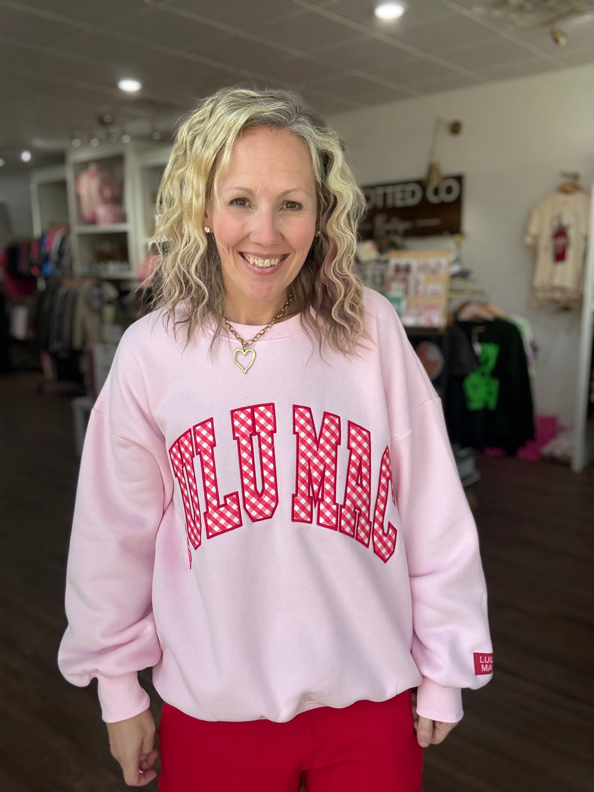Sweet, bold, and full of charm — the Gingham Heart Lulu Mac Sweatshirt is the perfect blend of cozy comfort and standout style. Designed in a beautiful pink hue, this sweatshirt features the beloved Lulu Mac graphic with charming red gingham details that give it a playful, feminine touch.