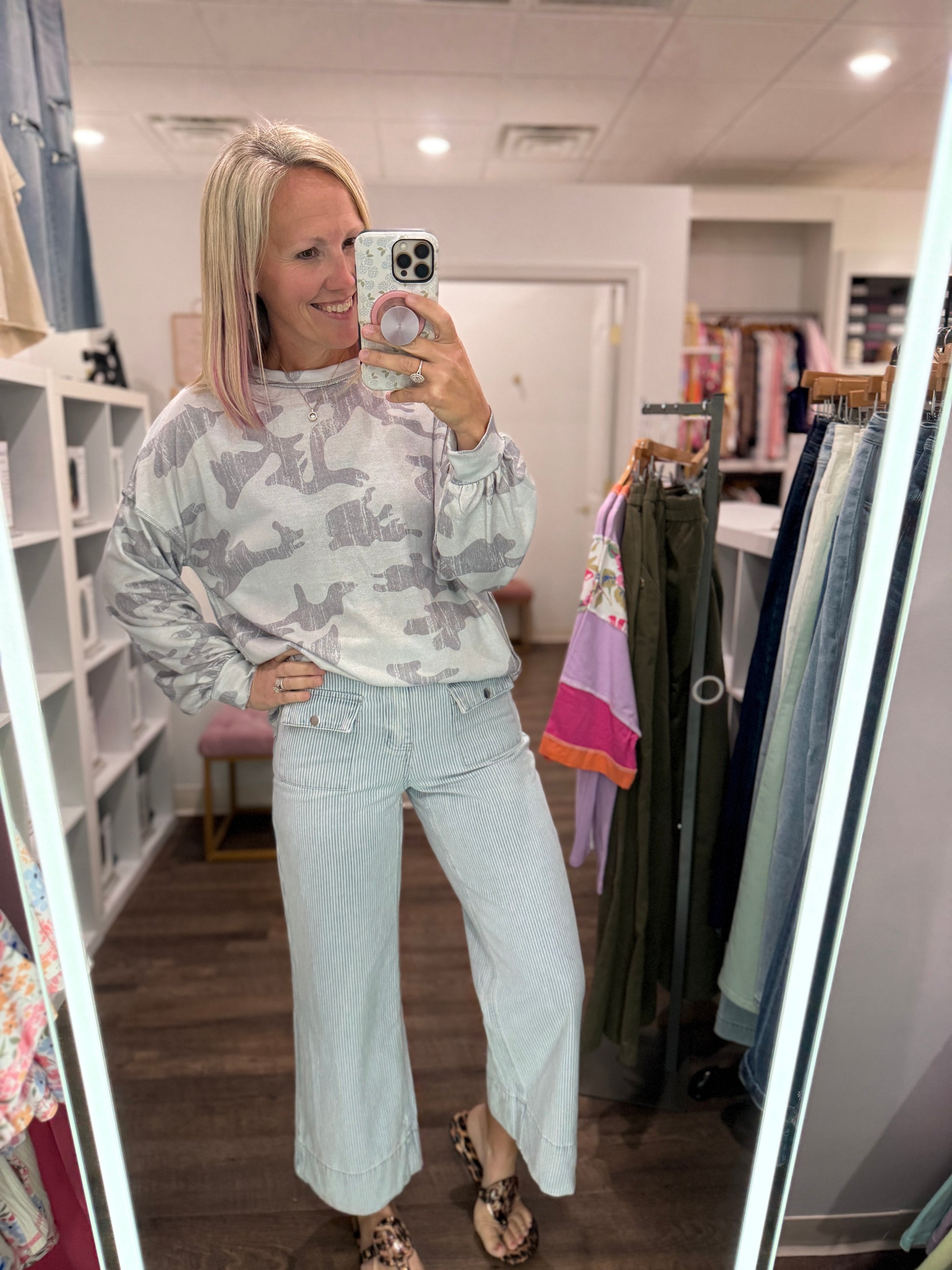 Step into standout style with the Pinstripe Path Wide-Leg Jean—a crisp, modern twist on a classic. Featuring a subtle white pin-stripe pattern, these jeans bring a touch of tailored polish to an easygoing silhouette. The wide-leg cut and cropped length create a breezy, flattering shape, while flap pockets add a dash of utility-chic detail.