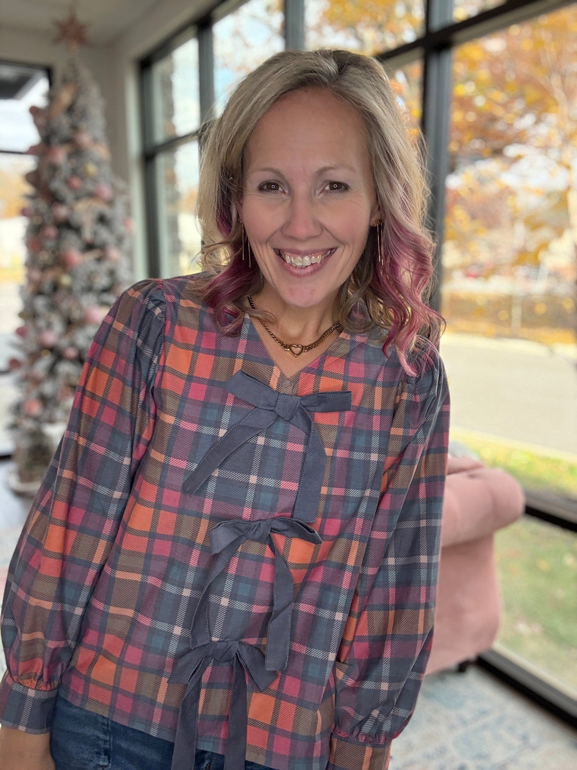 The Plaid & Pretty Bow Top blends vintage charm with a fresh, modern twist. Designed with oversized statement bows, this piece adds a playful, standout touch to your holiday wardrobe. The Patterned in Plaid print brings classic seasonal style while offering fun and flair for anyone who loves to make an entrance.