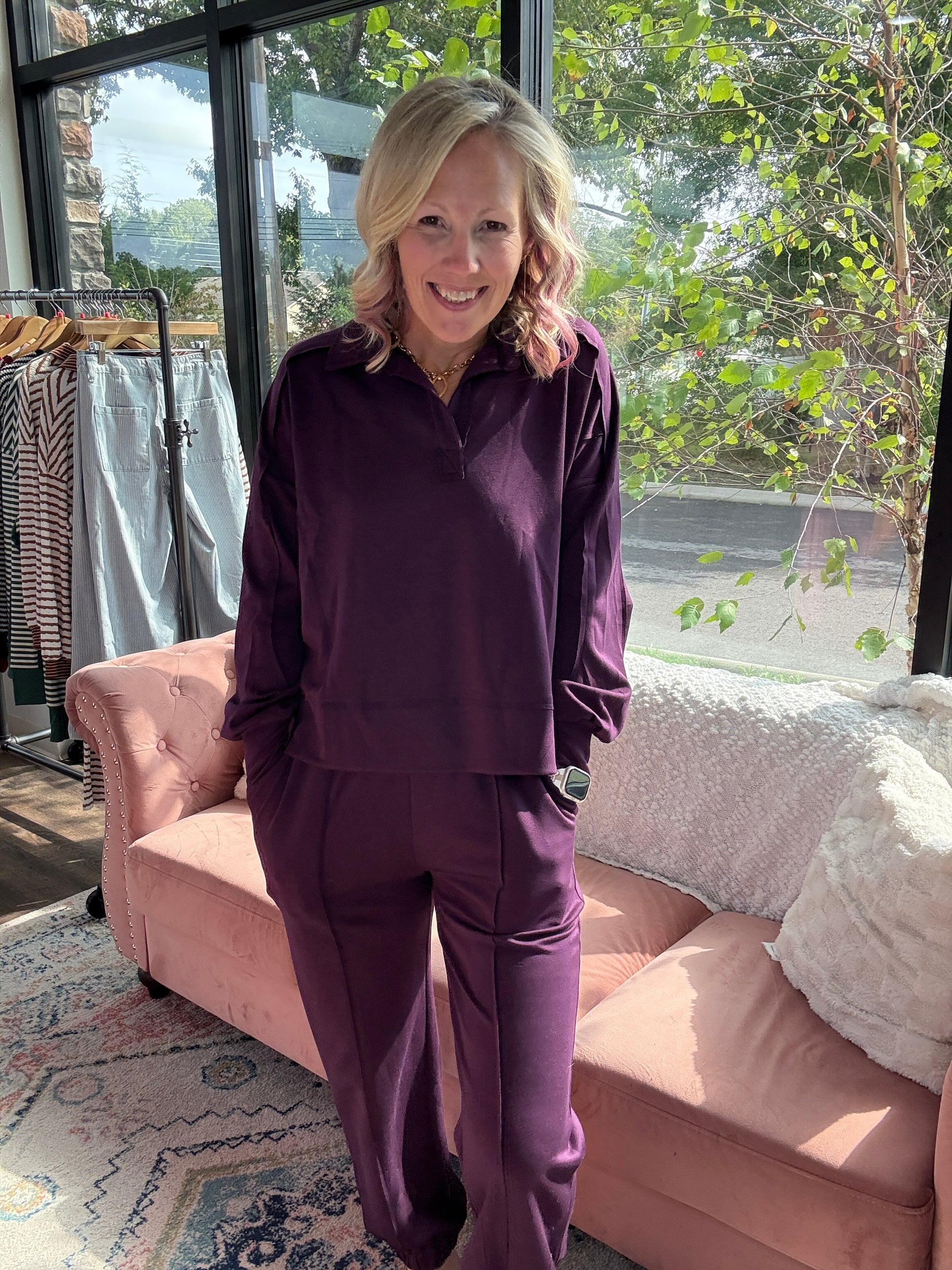 Cozy meets chic in the Plum Reverie Set, a luxe knit ensemble designed for effortless style. Crafted from soft, sumptuous knit, the relaxed-fit pullover features a fold-over collar with a flattering V-neck and subtle raw hem details for modern, understated edge. Perfect for lounging in style, running errands, or layering for cooler days, this set brings elevated comfort to every moment. Not lined, keeping it lightweight and easy to wear.