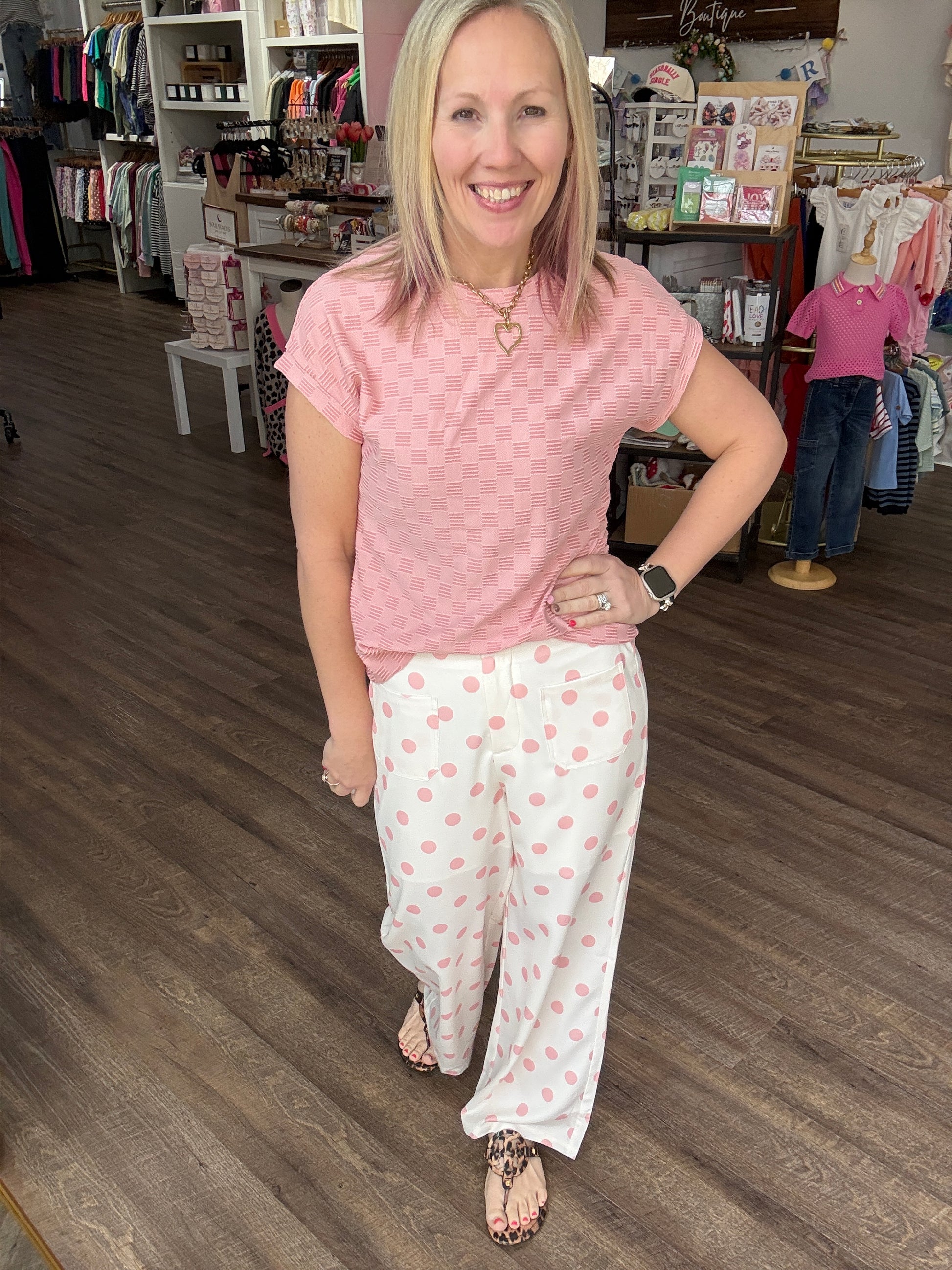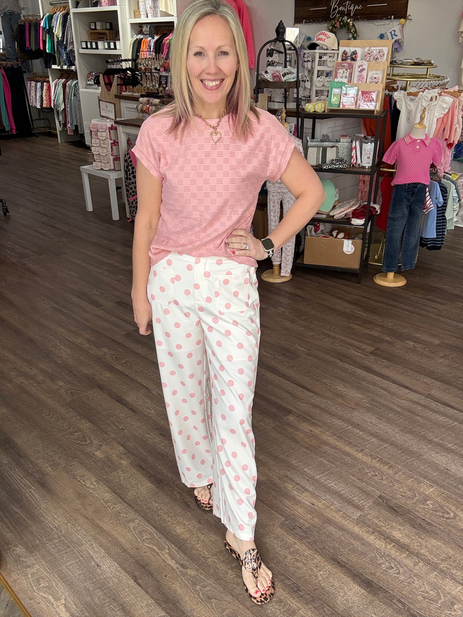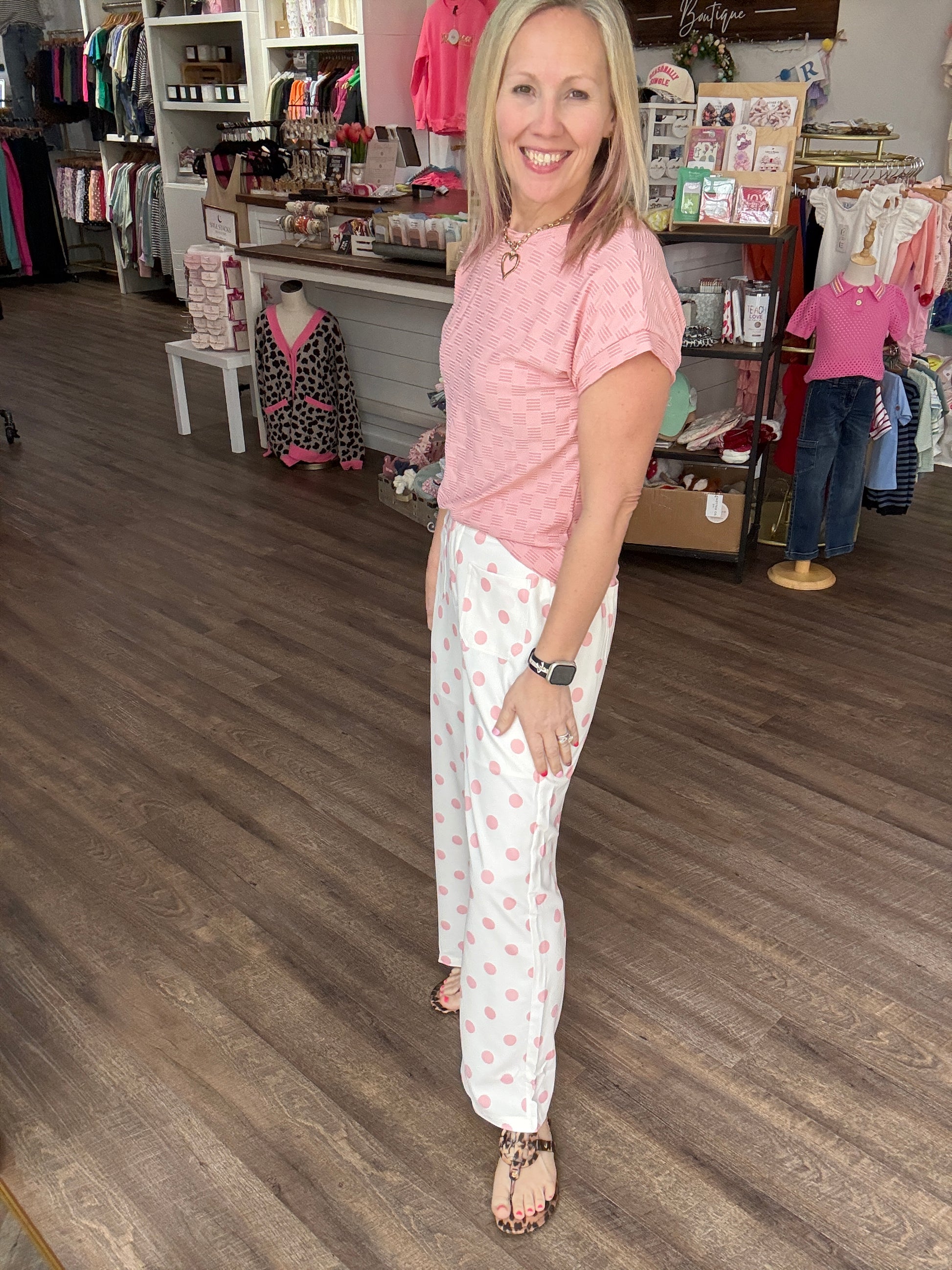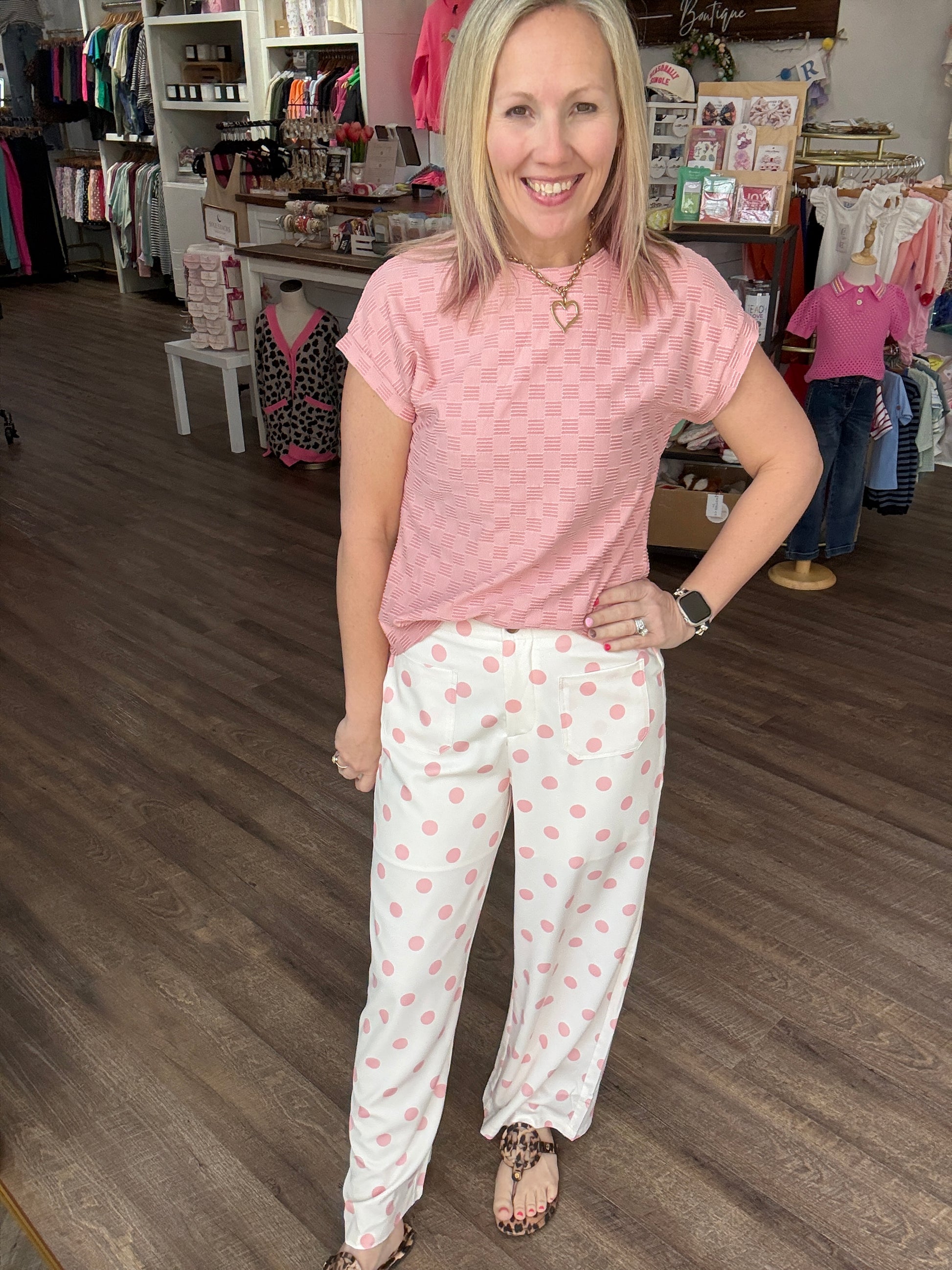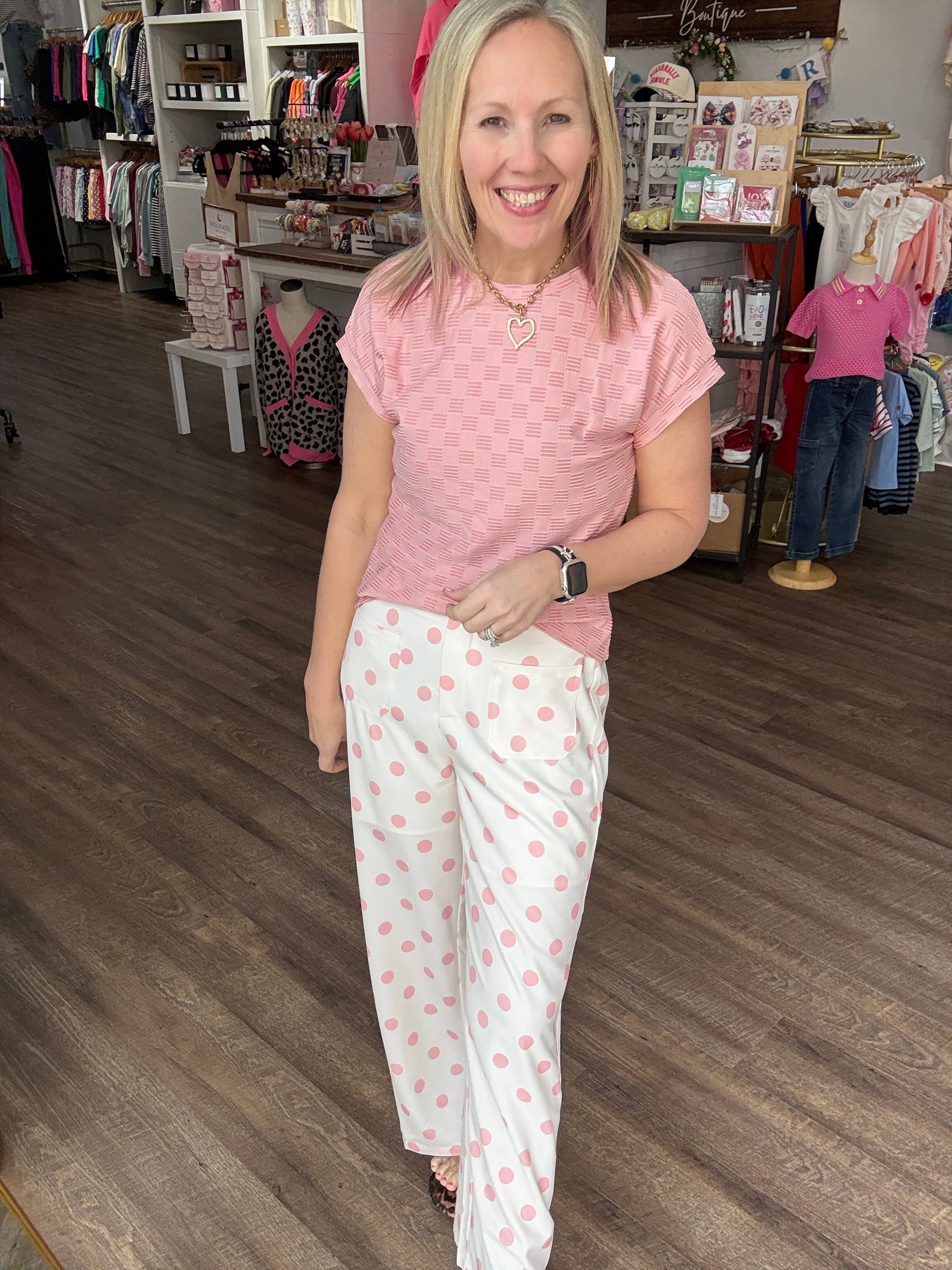 Polished meets playful in the Polka Chic Trousers—a dressy silhouette with the comfort you actually want to wear. Designed in crisp white with soft pink polka dots, these pants are equal parts timeless and on-trend.