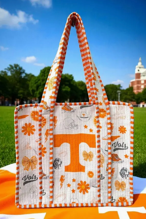 Go Vols Go! π§‘ Official University of Tennessee Tote Whether you're heading to class, tailgating at Neyland, or repping the Vols on the go, this tote is your ultimate game day companion! Featuring the bold Tennessee βTβ front and center, plus playful icons like orange daisies, checkerboard hearts, and Smokey the dog, this tote is bursting with Big Orange pride. Roomy, lightweight, and full of spirit β itβs perfect for carrying everything you need in style. π Officially licensed and ready for every Vol fan! 18 x 15 x 5 inches