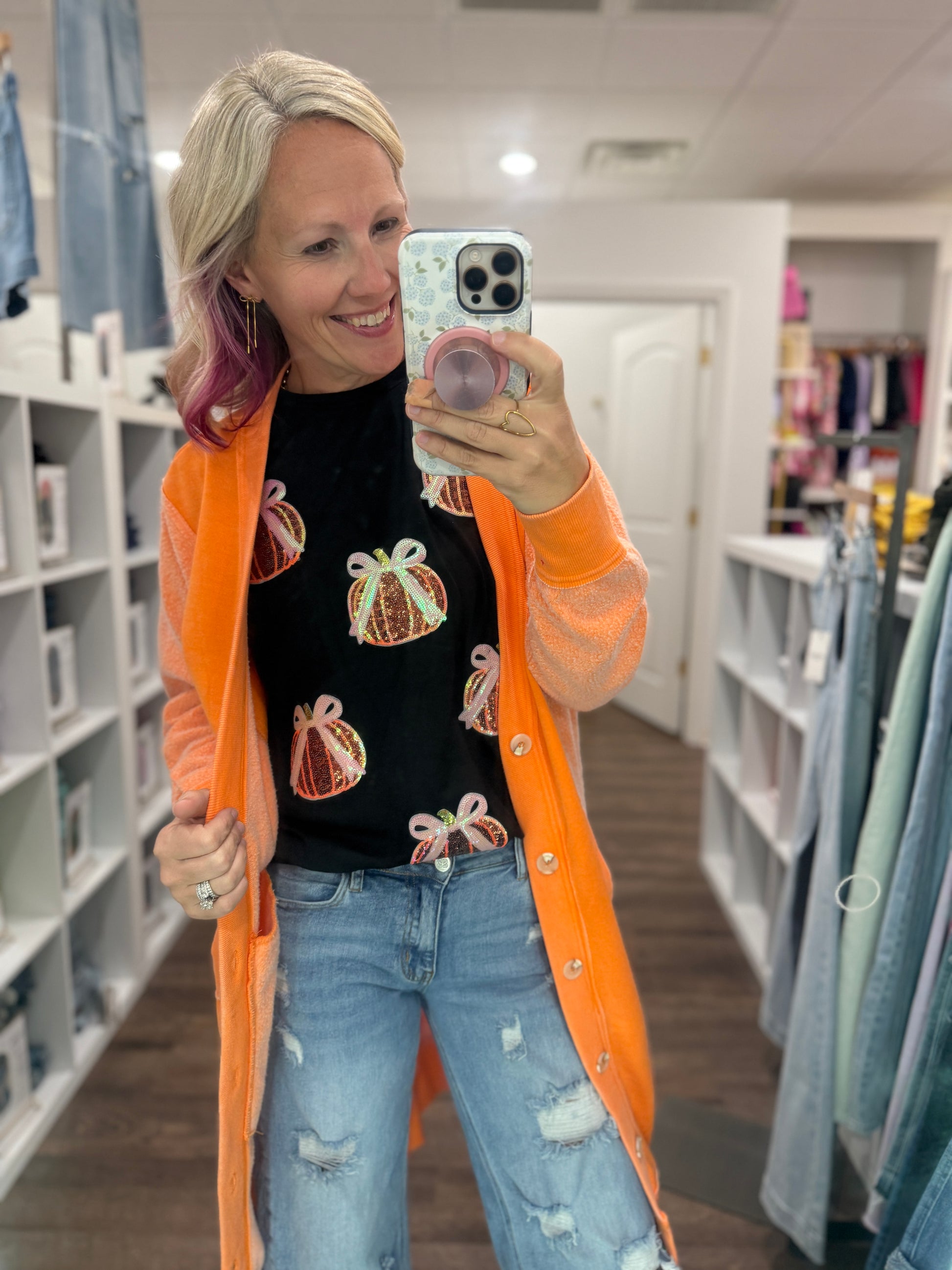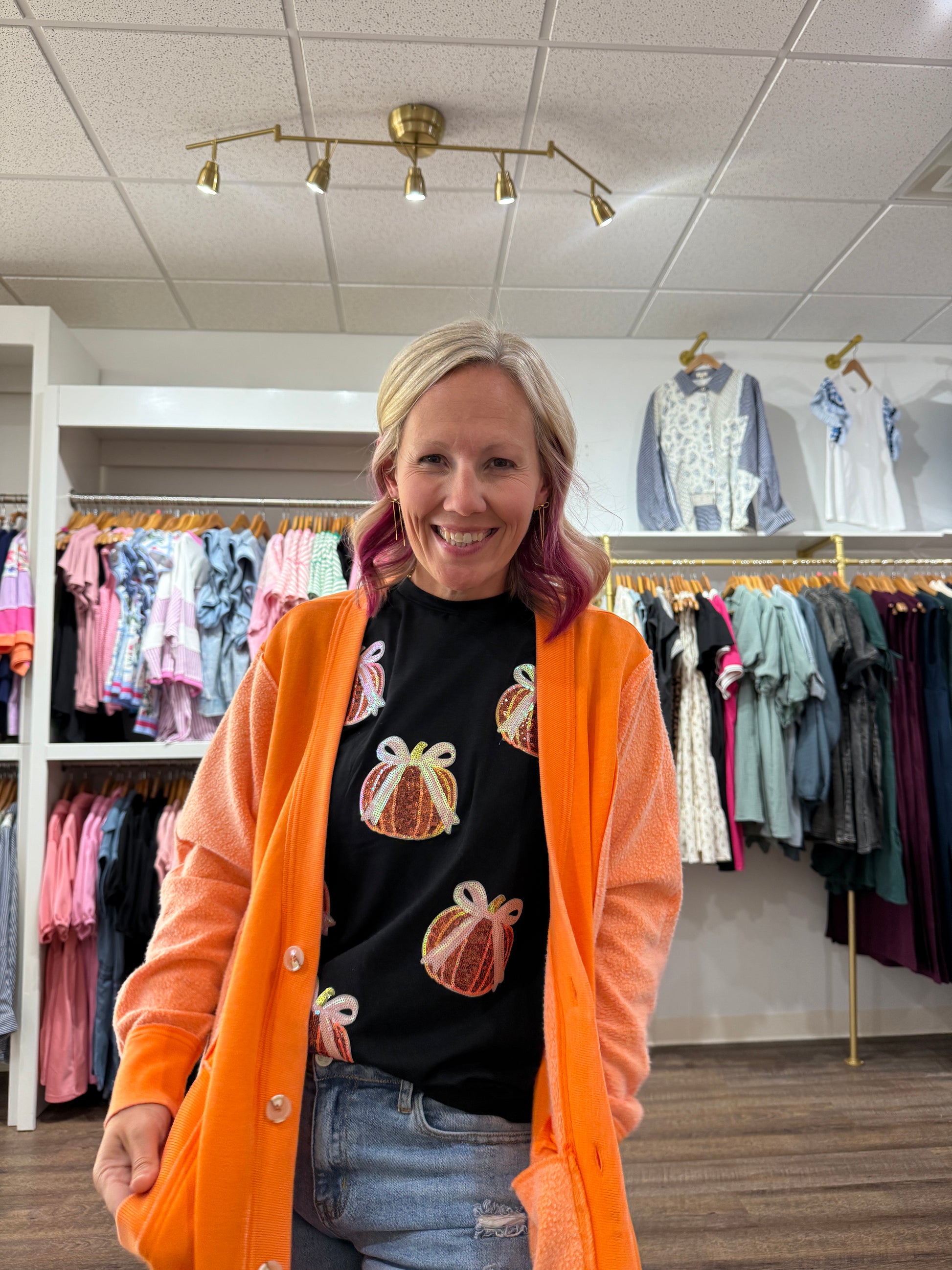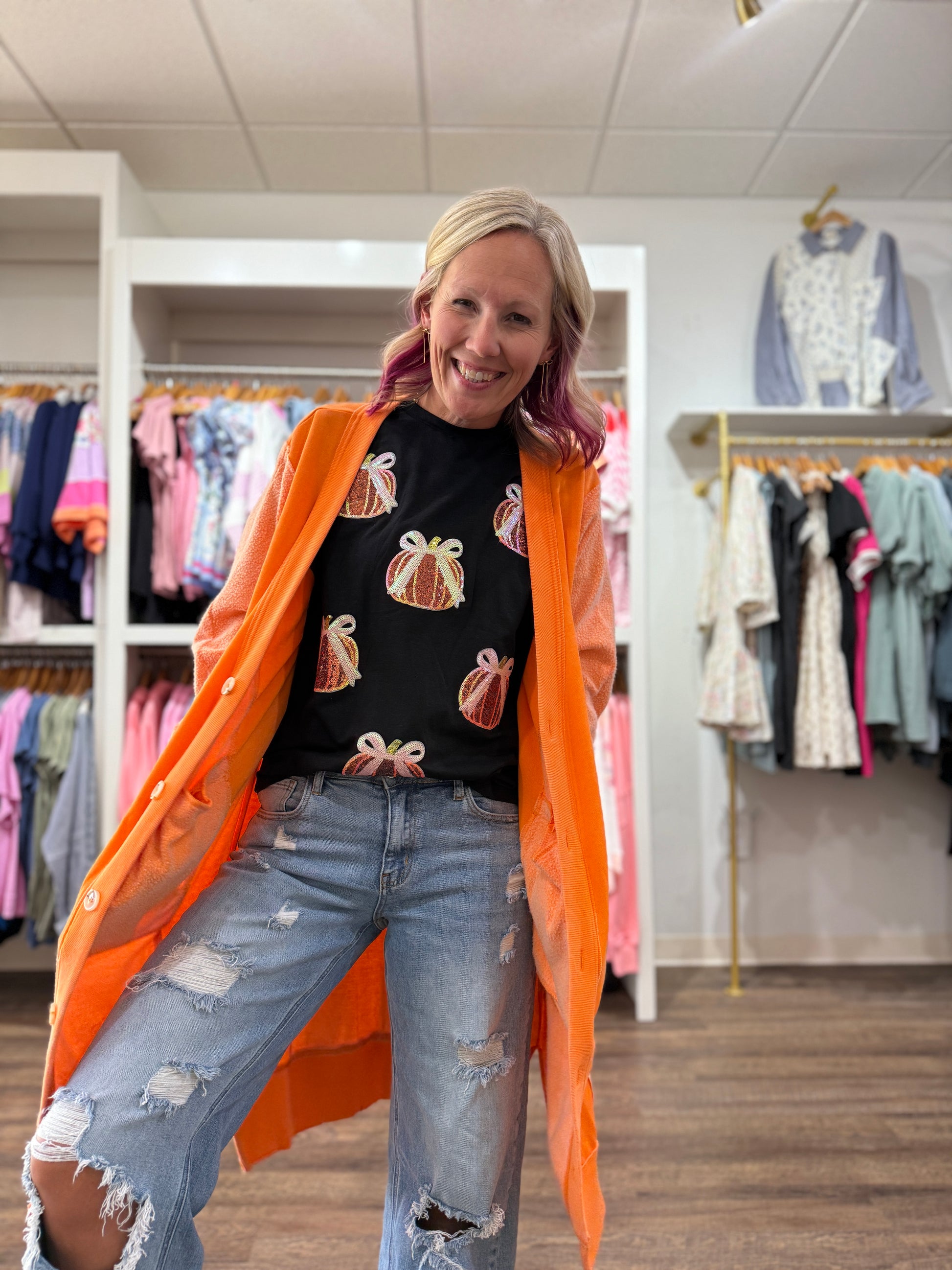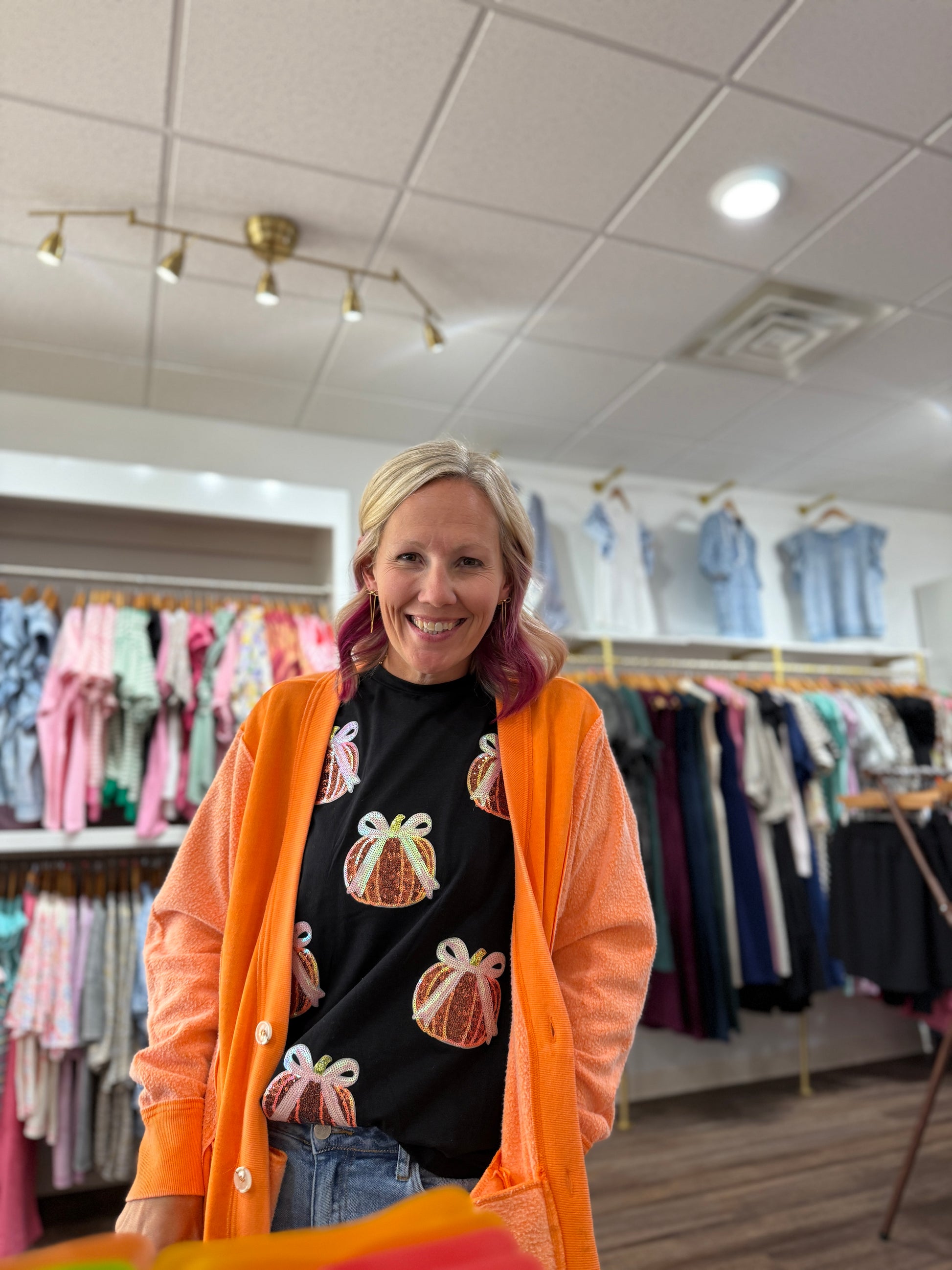 Sweet meets spooky with the Pumpkin Bow Tee — the cutest way to celebrate Halloween! This festive graphic t-shirt features a playful pumpkin topped with a darling bow knot for just the right mix of fun and feminine. Made with a soft, comfy fit, it’s perfect for trick-or-treating, pumpkin patch strolls, or casual nights in with candy corn and scary movies. Pair it with jeans, leggings, or a cozy cardigan for a look that’s all treats, no tricks! 🧡👻