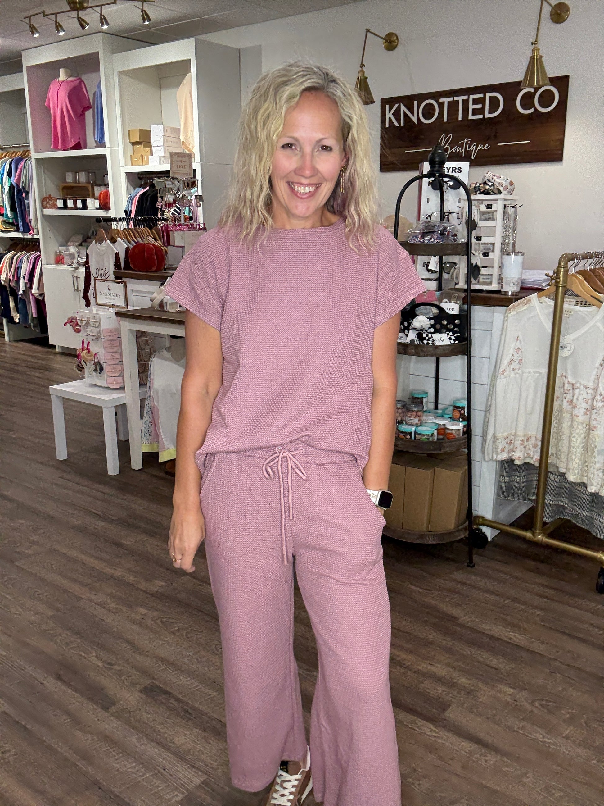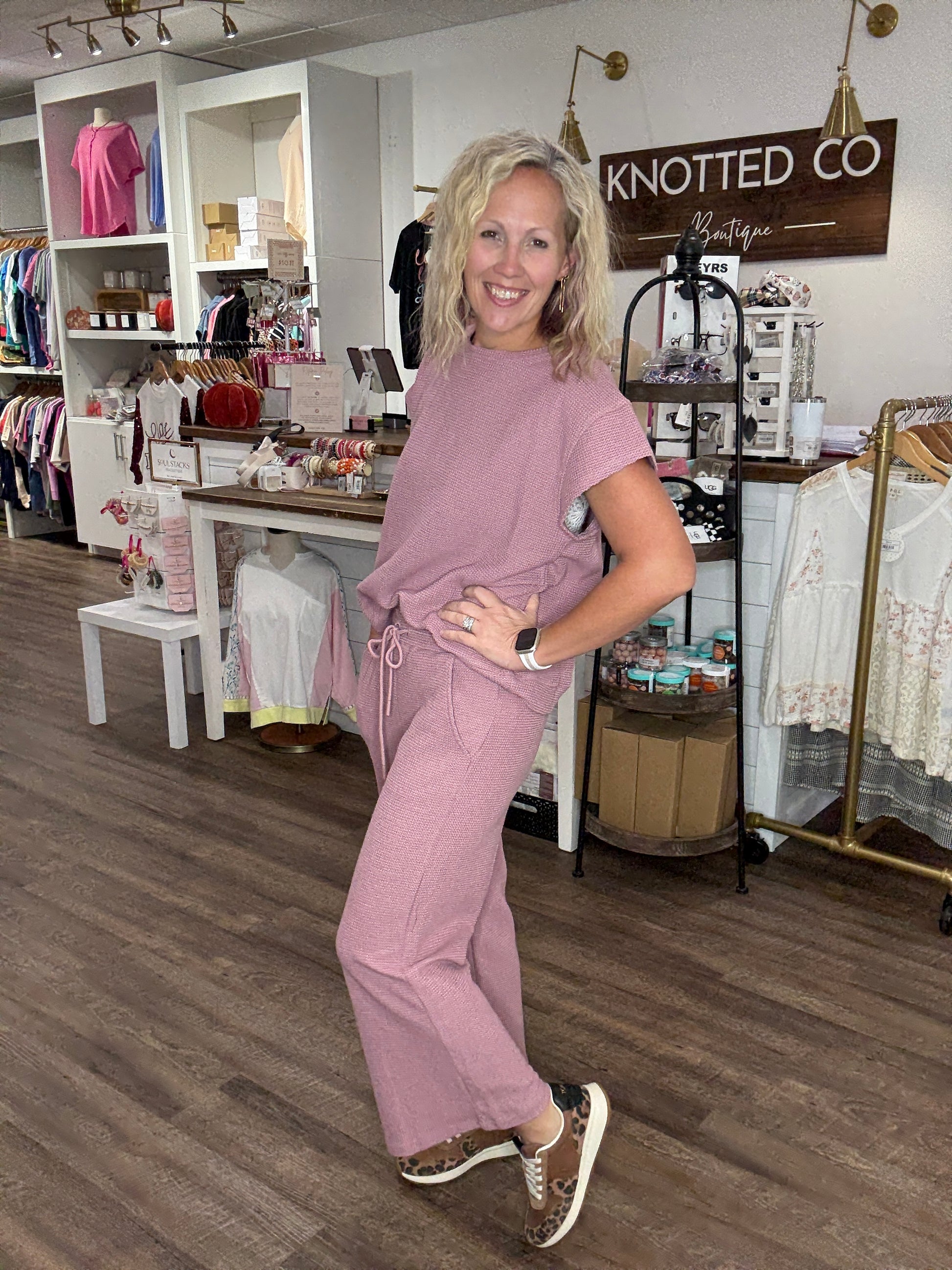 Soft, stylish, and made for fall weather—the Rosewood Textured Set is the ultimate fall-weather go-to. In a dreamy dusty pink hue, this set features a textured sweater fabric that keeps you stylish and comfortable. The short sleeve top pairs effortlessly with the cropped, elastic waist pants that include side pockets for everyday ease. Perfect to layer with a cardigan or sweater. Whether you're lounging, lunching, or running errands, this set brings relaxed polish to every moment.