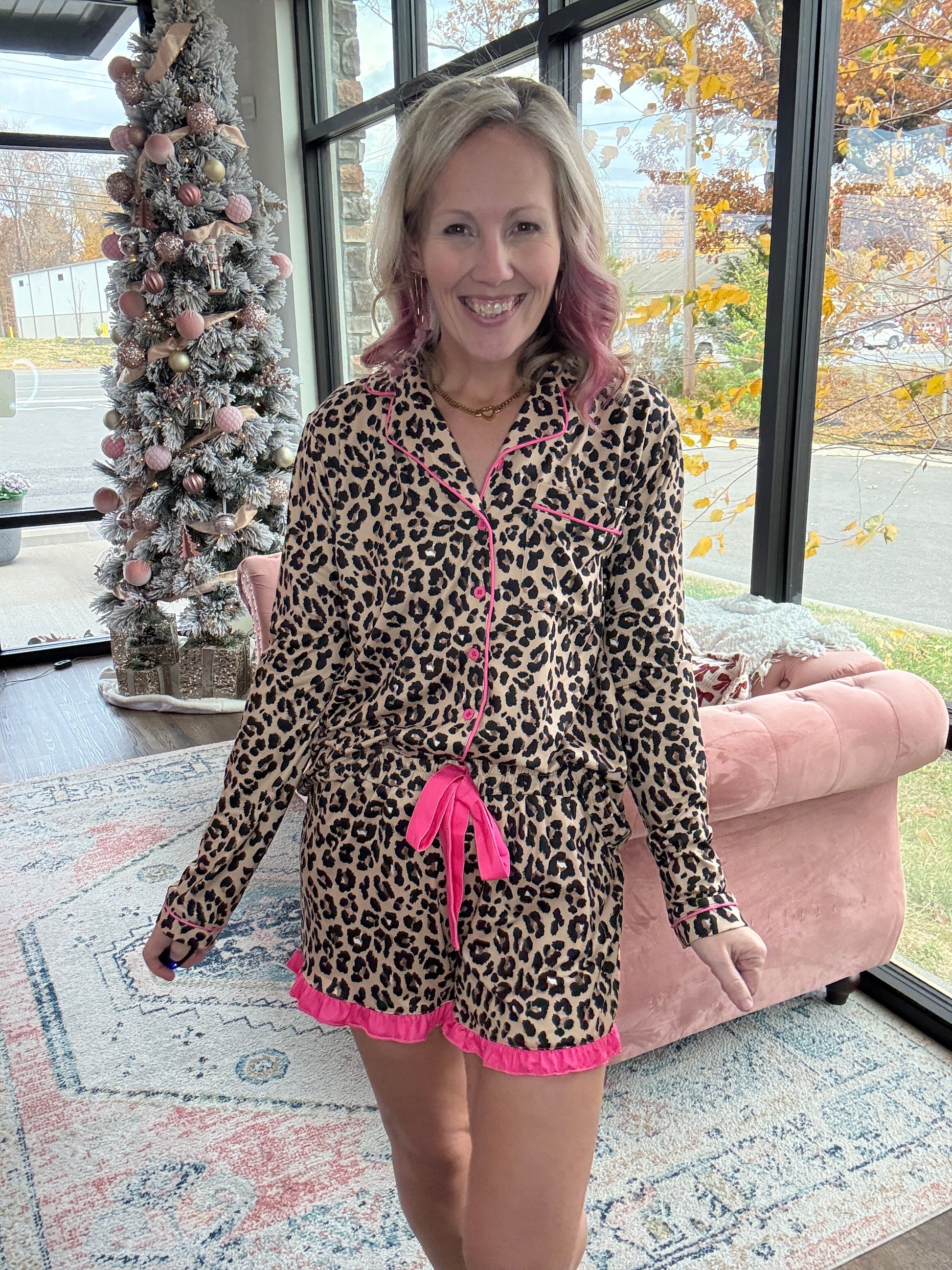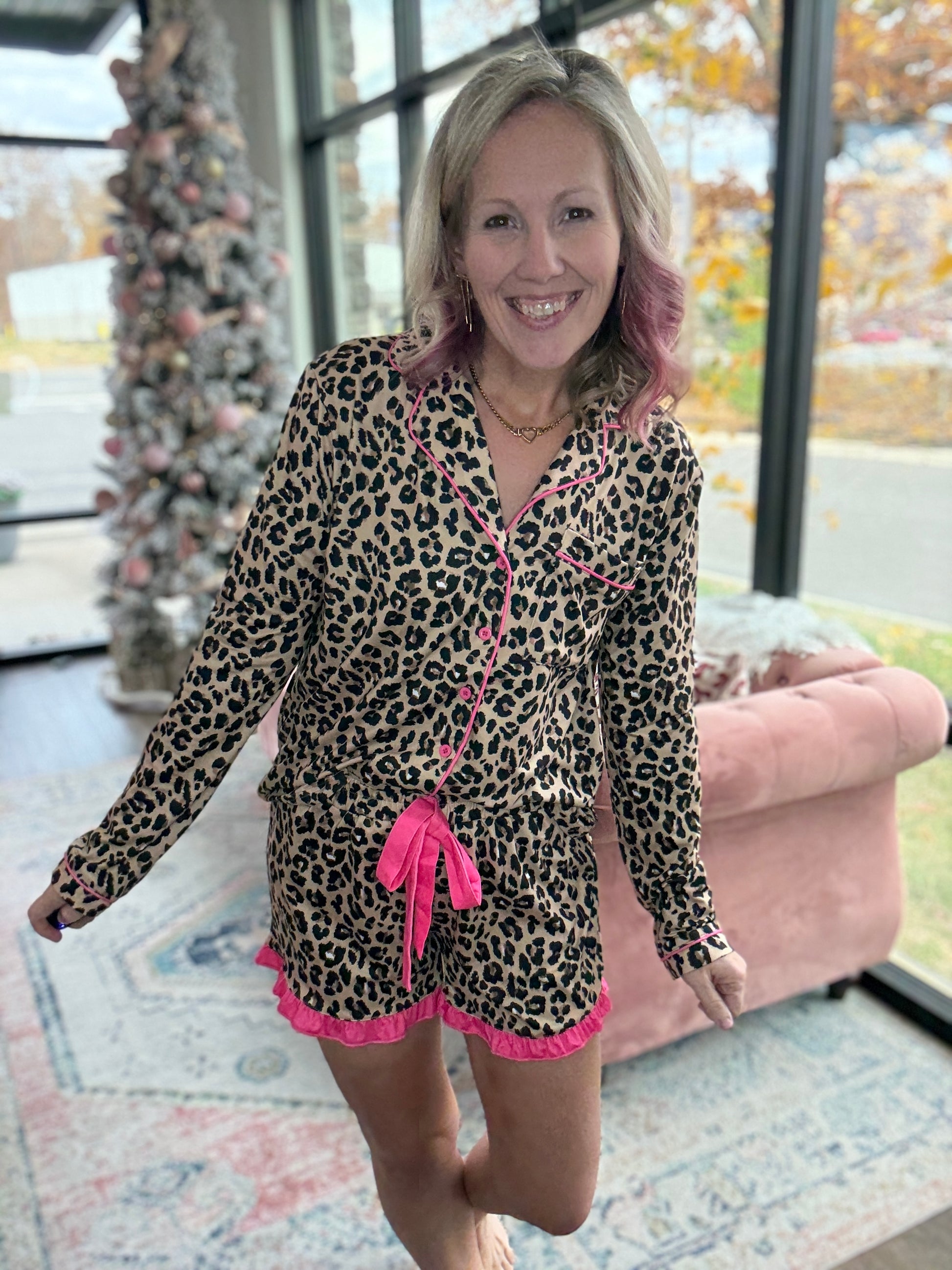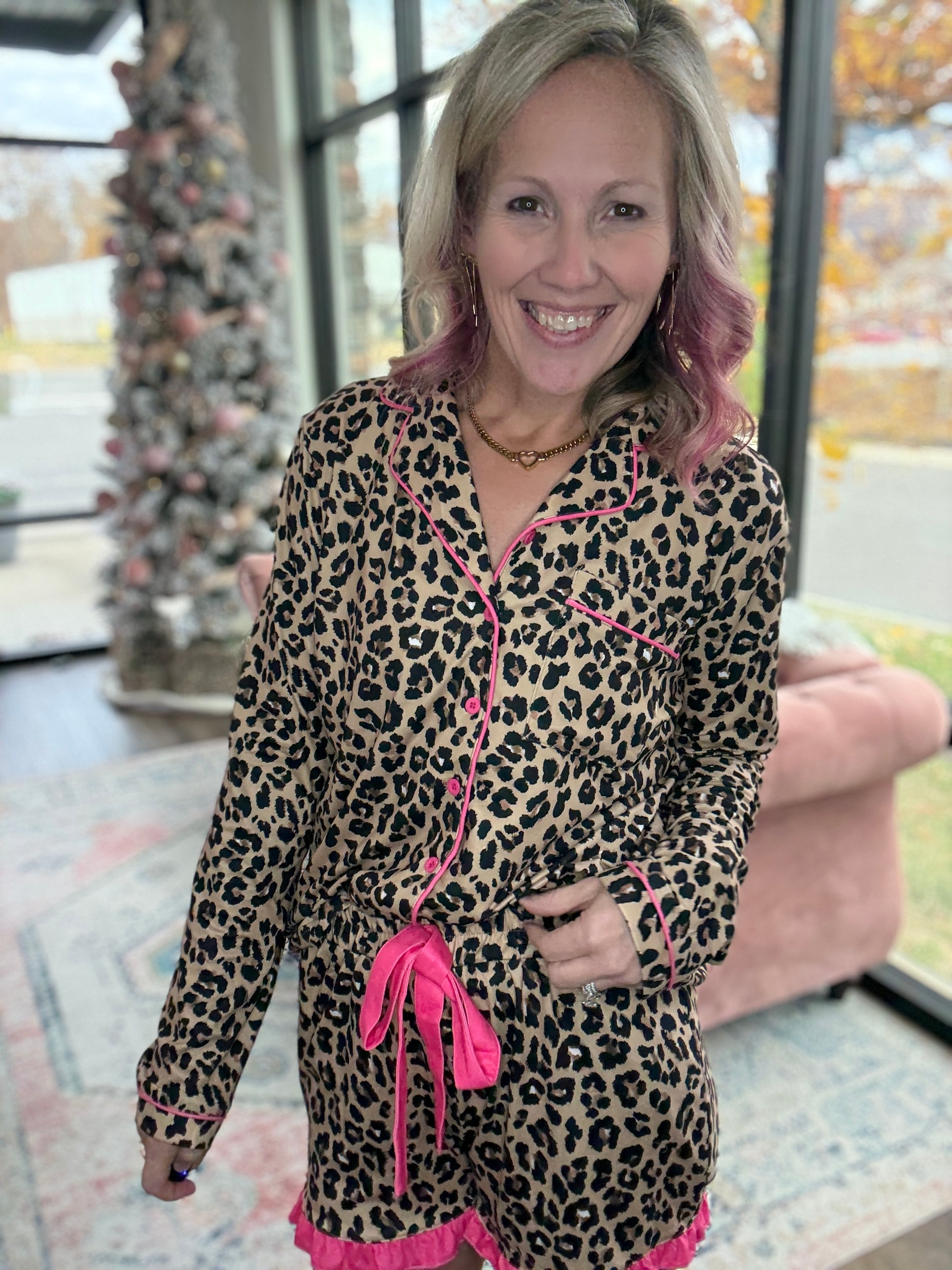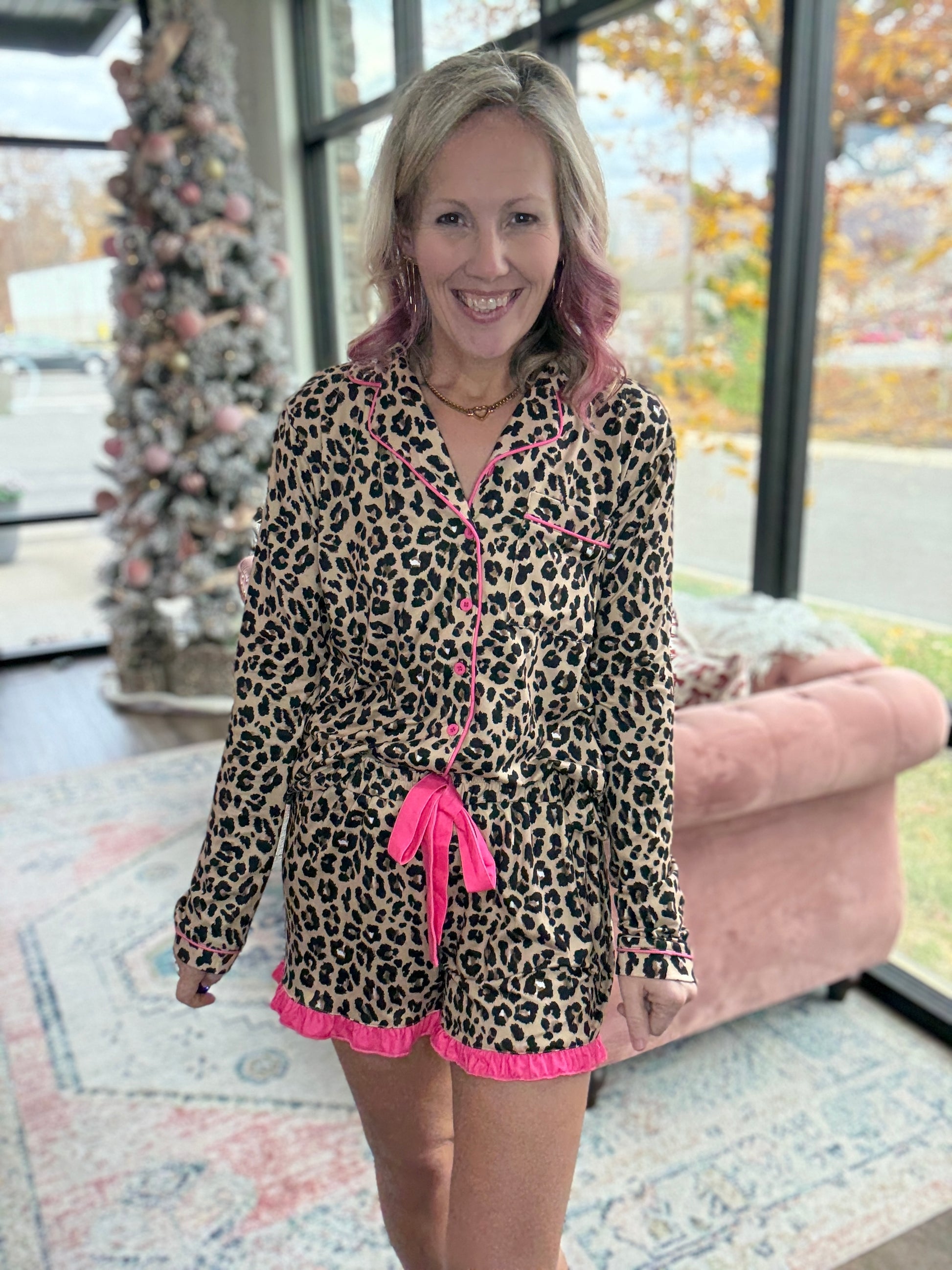 The Sassy Safari Sleep Set brings bold personality and comfort together for the perfect nighttime look. Featuring a fierce leopard print with playful hot pink accents, this two-piece pajama set includes a long sleeve top and matching shorts, both finished with feminine ruffle detailing.