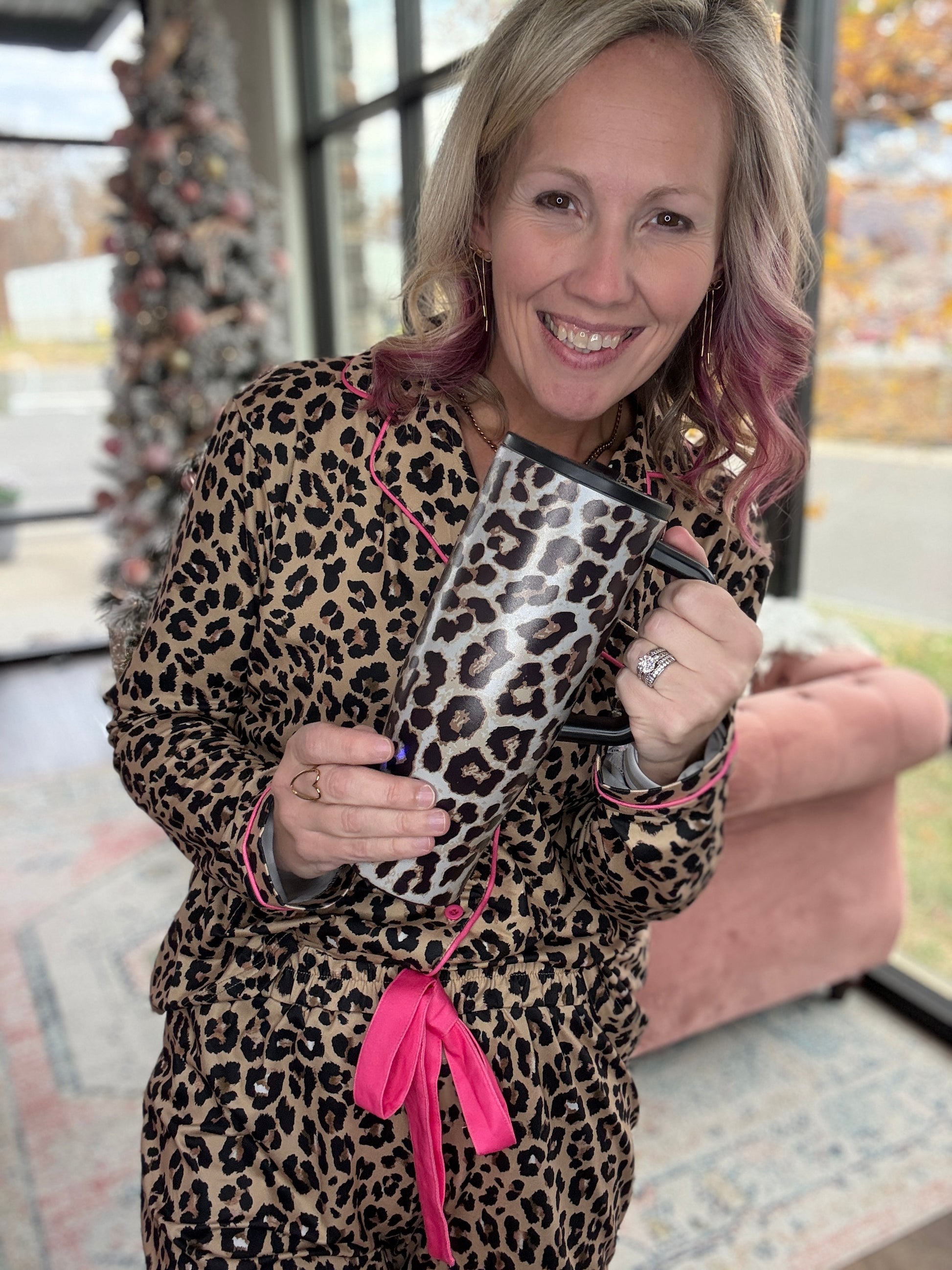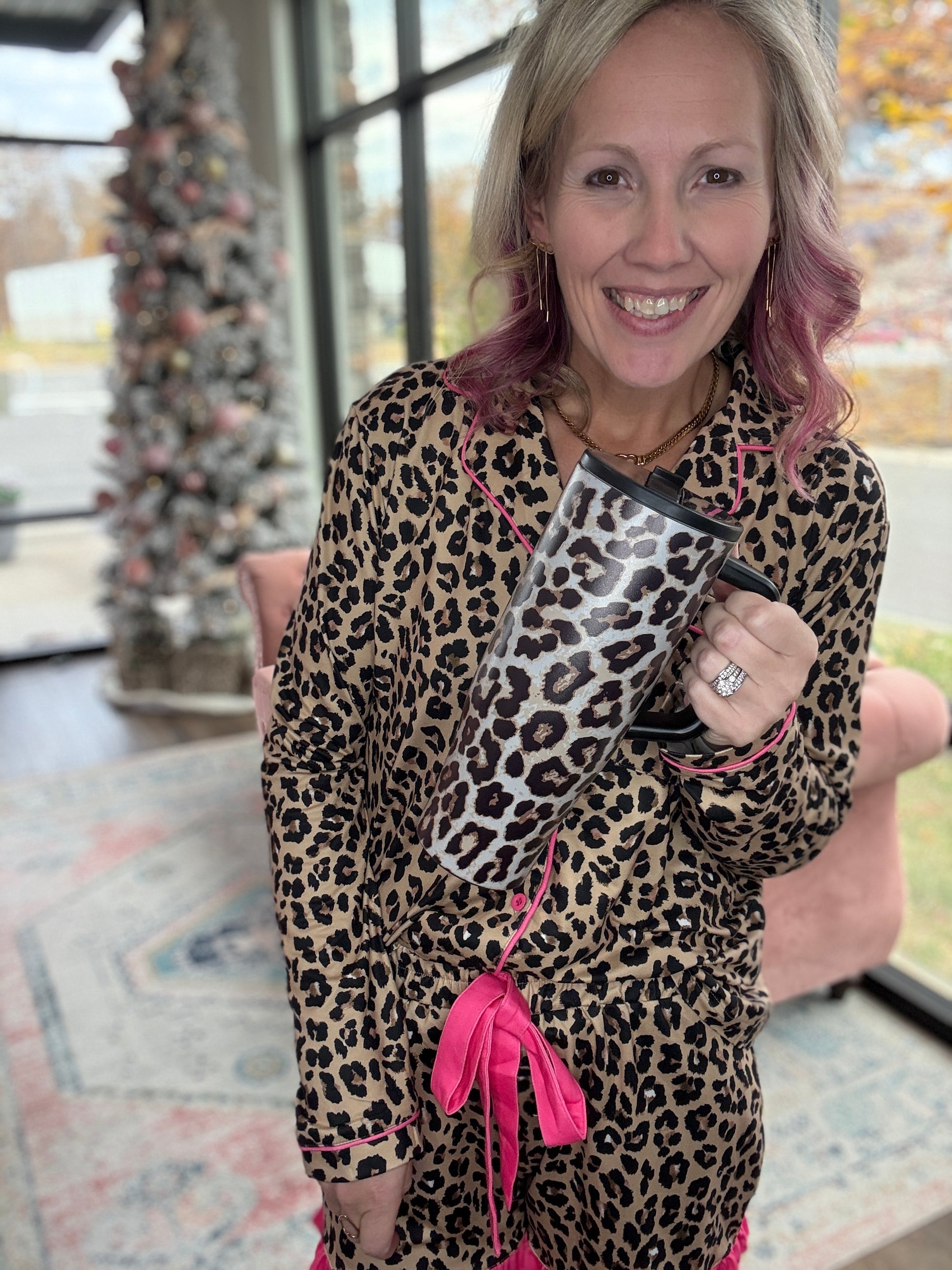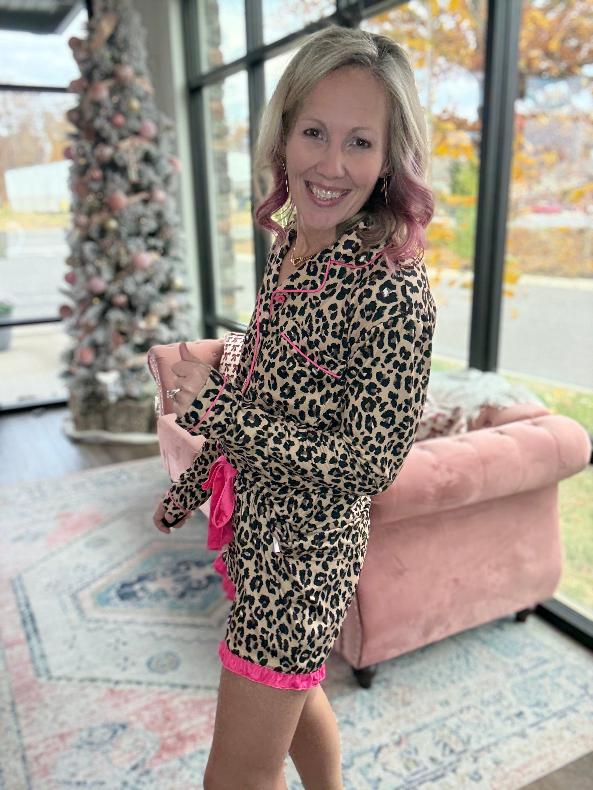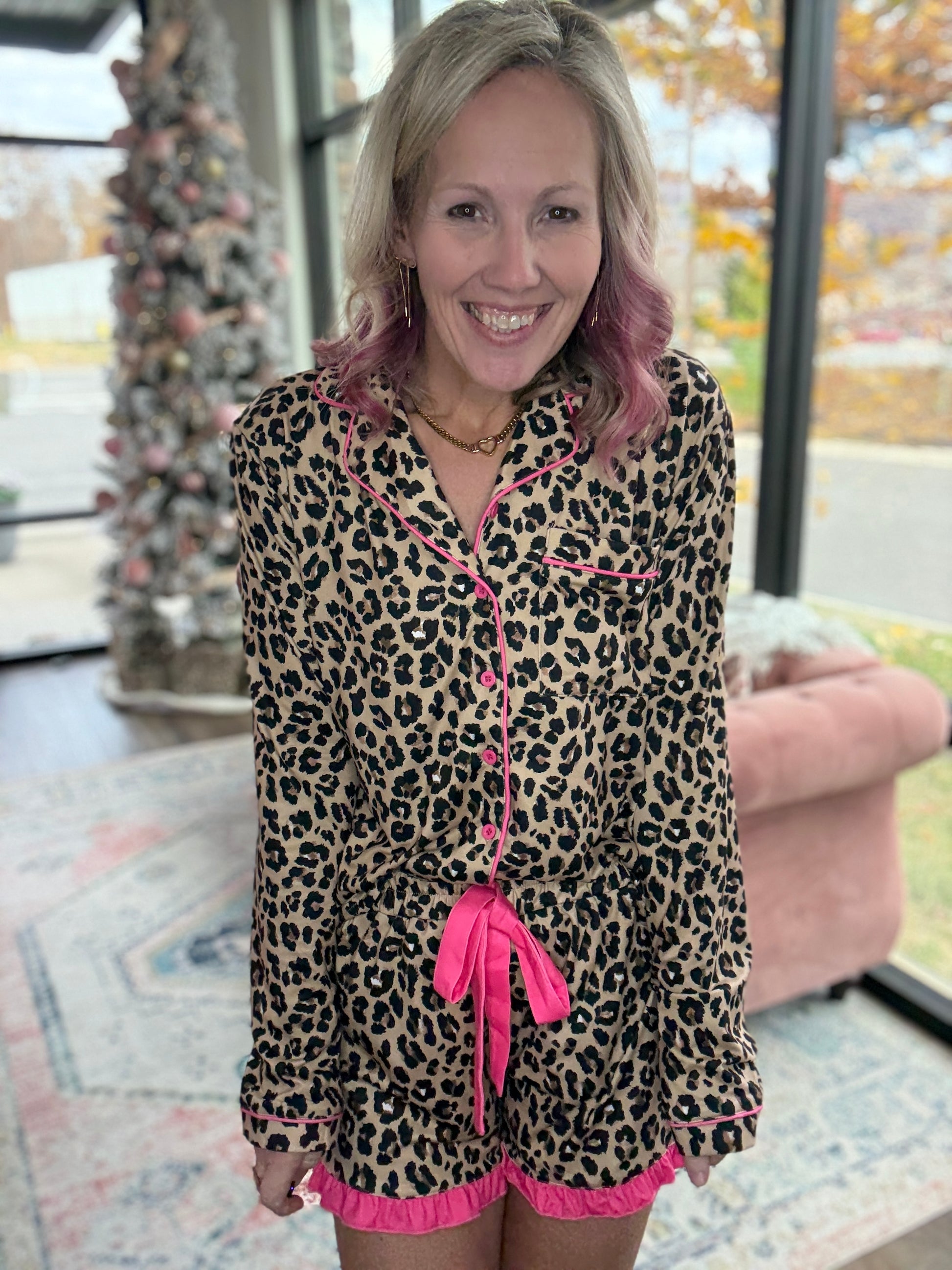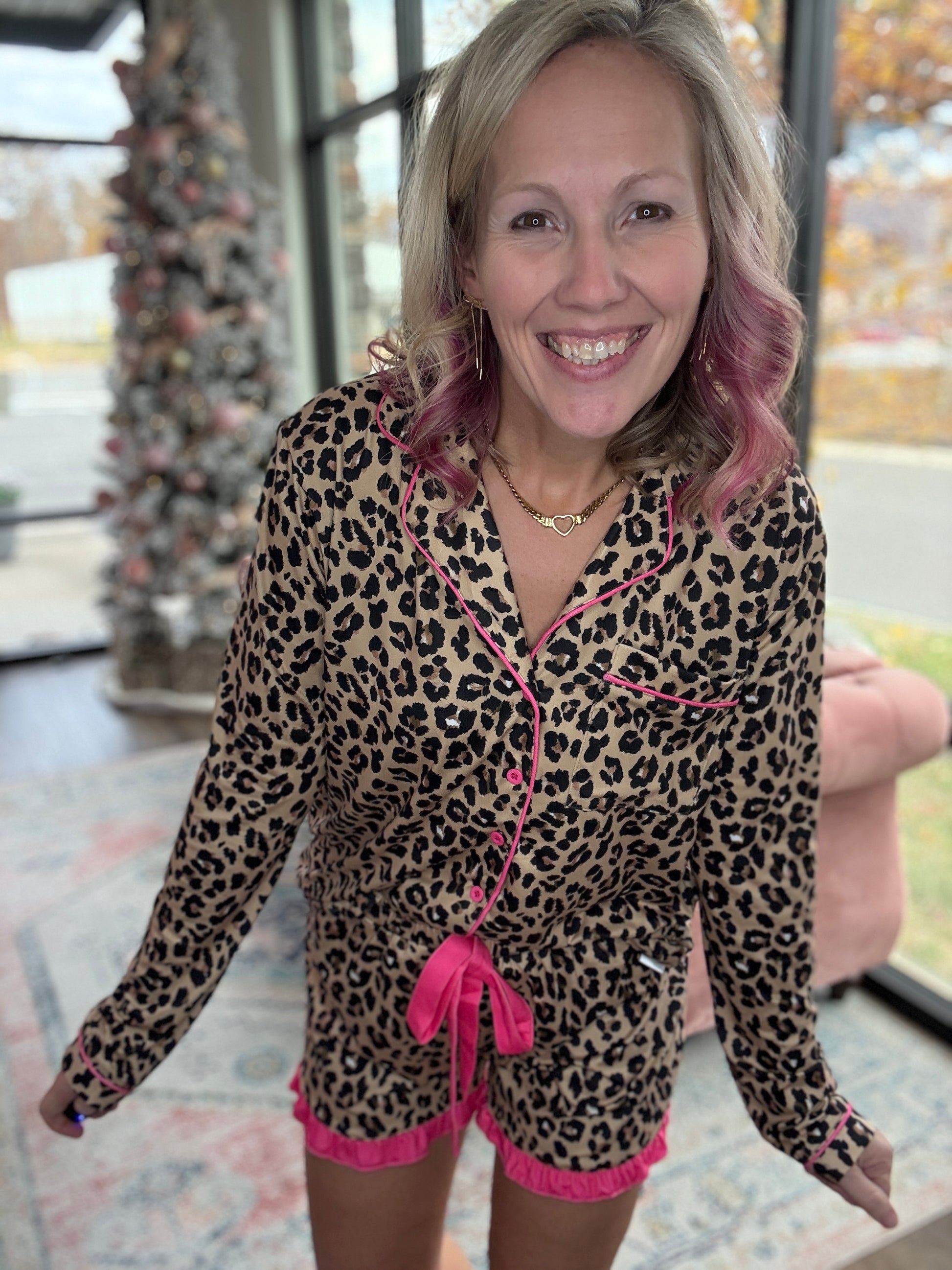 The Sassy Safari Sleep Set brings bold personality and comfort together for the perfect nighttime look. Featuring a fierce leopard print with playful hot pink accents, this two-piece pajama set includes a long sleeve top and matching shorts, both finished with feminine ruffle detailing.