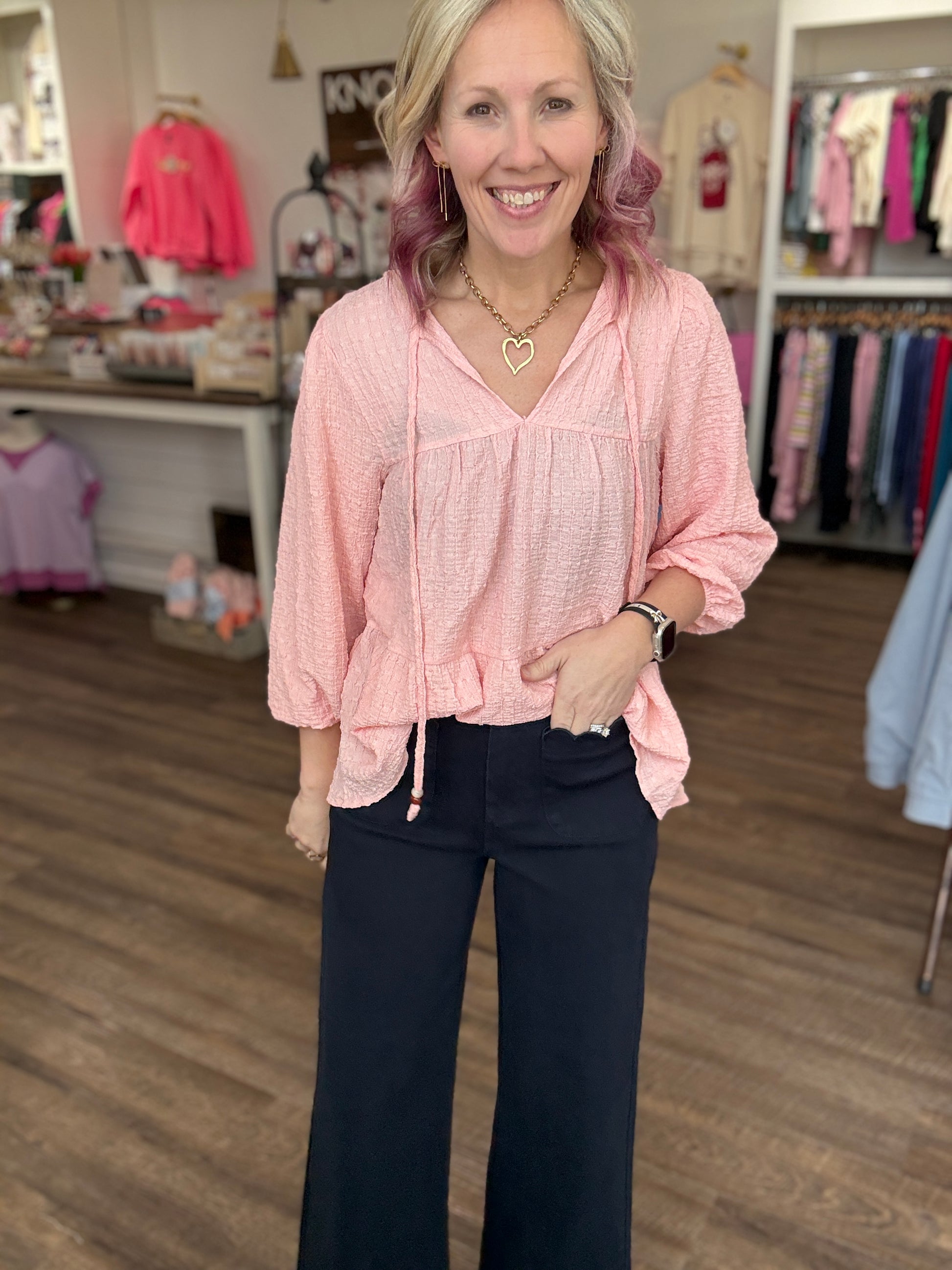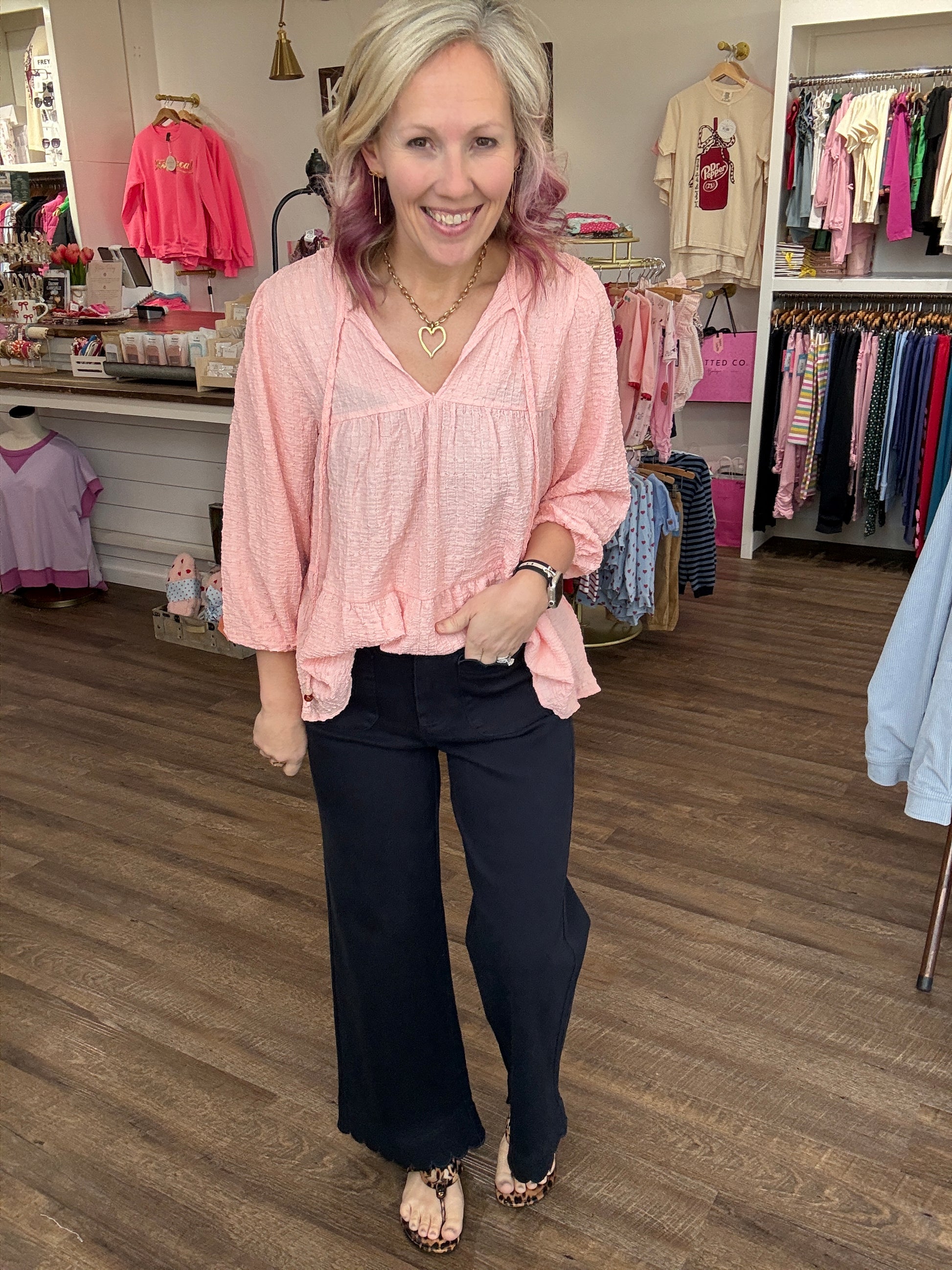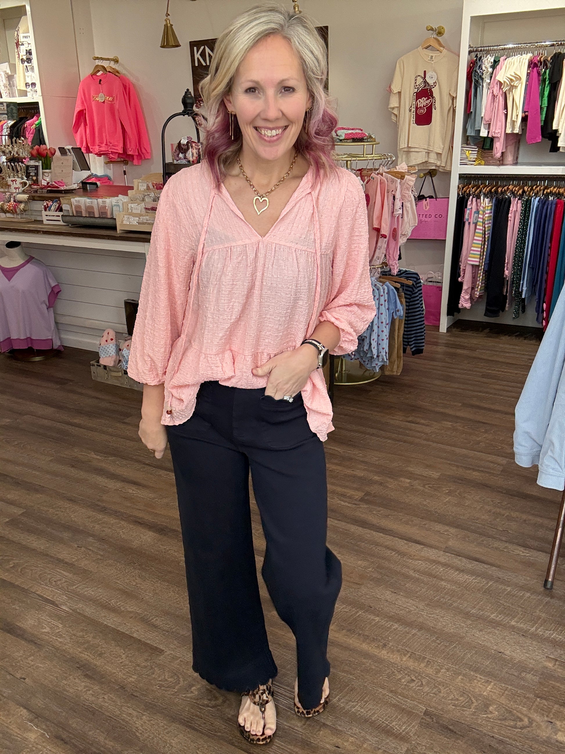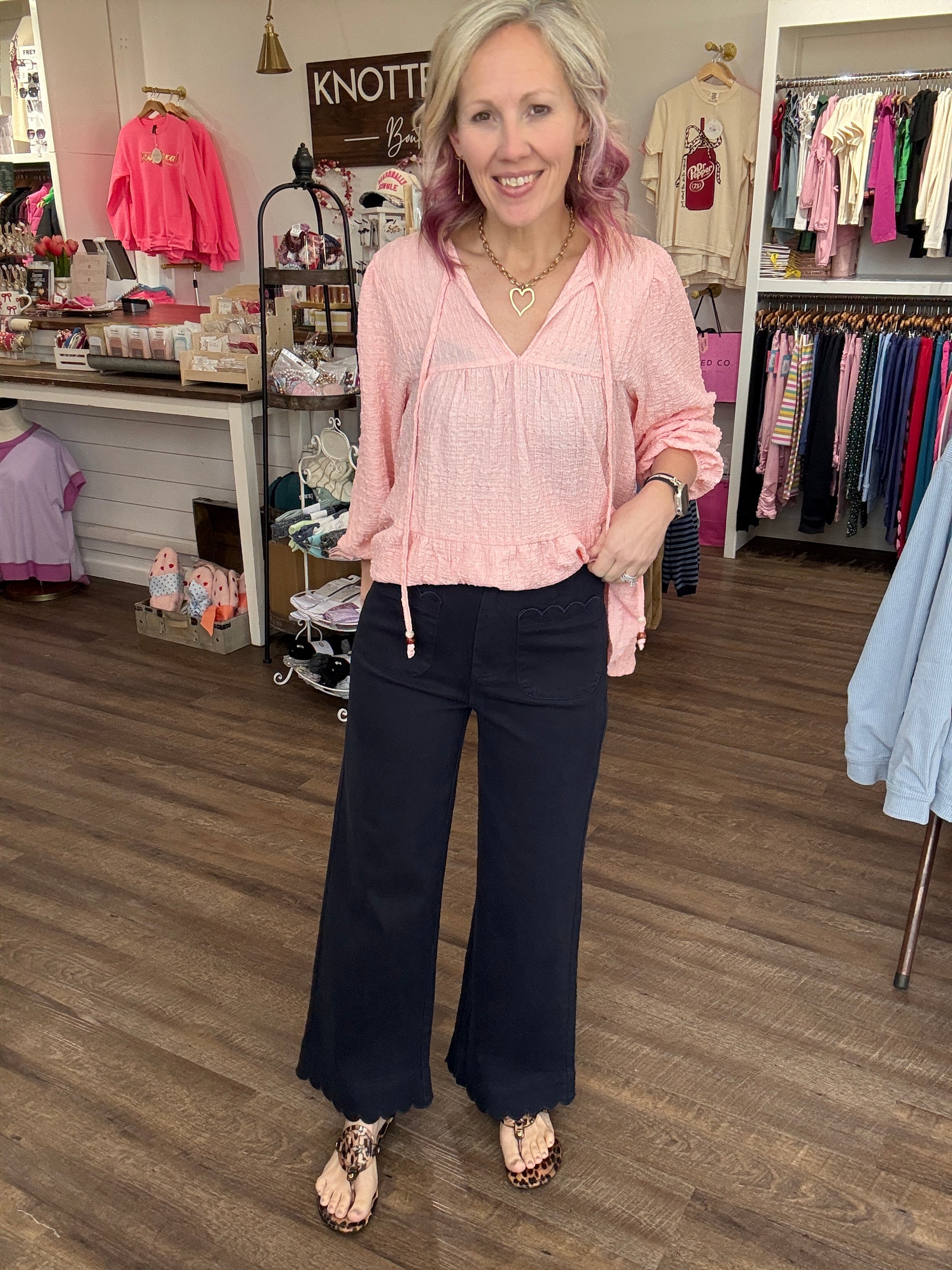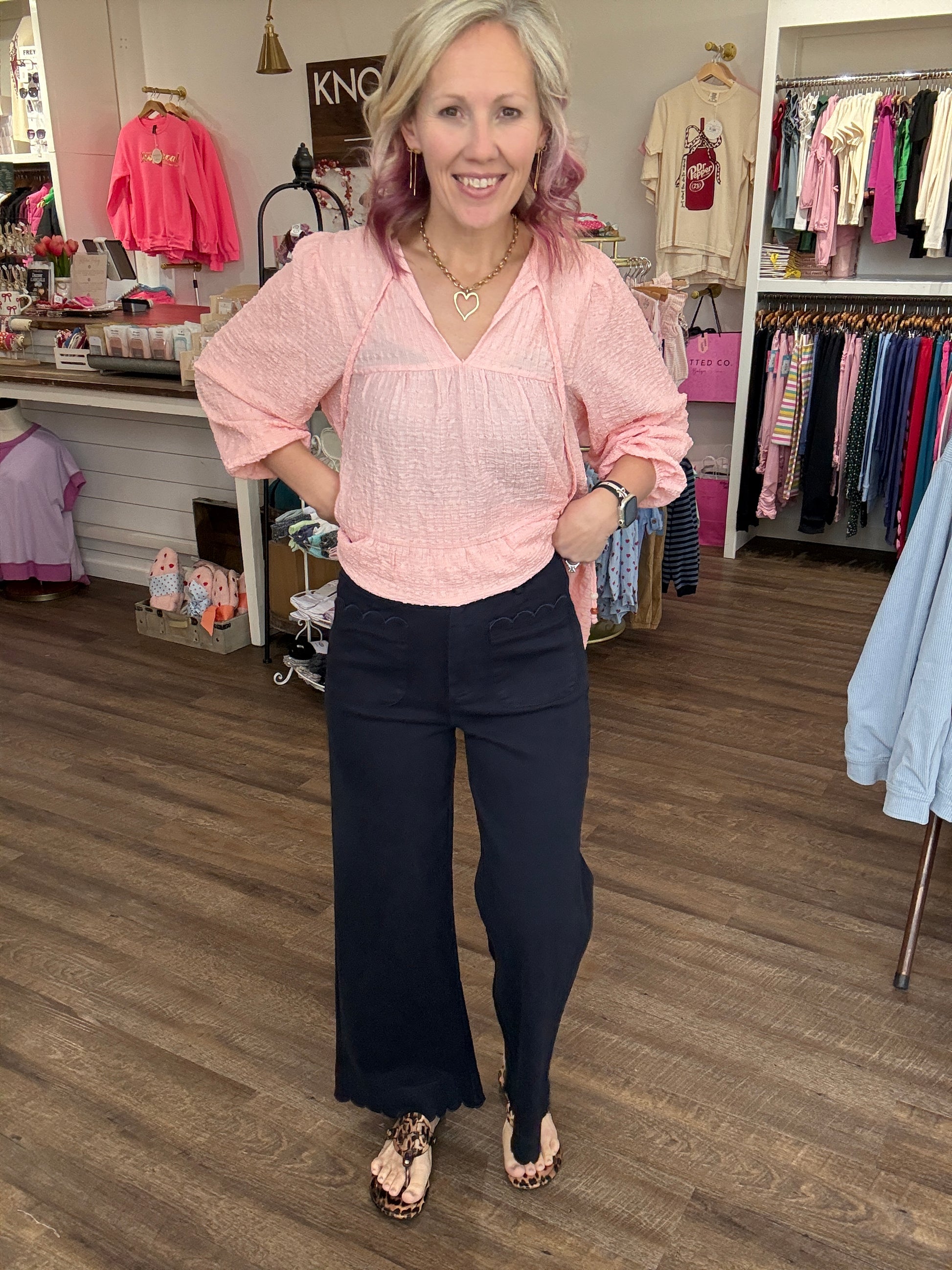 Tailored with a touch of charm, these navy beauties are the statement pant your closet has been waiting for. Designed with a flattering high rise and a flowy wide leg, they instantly elevate any look while keeping things easy and wearable. The scallop trim at the pockets and hem adds the sweetest feminine detail that sets them apart from your everyday trousers.