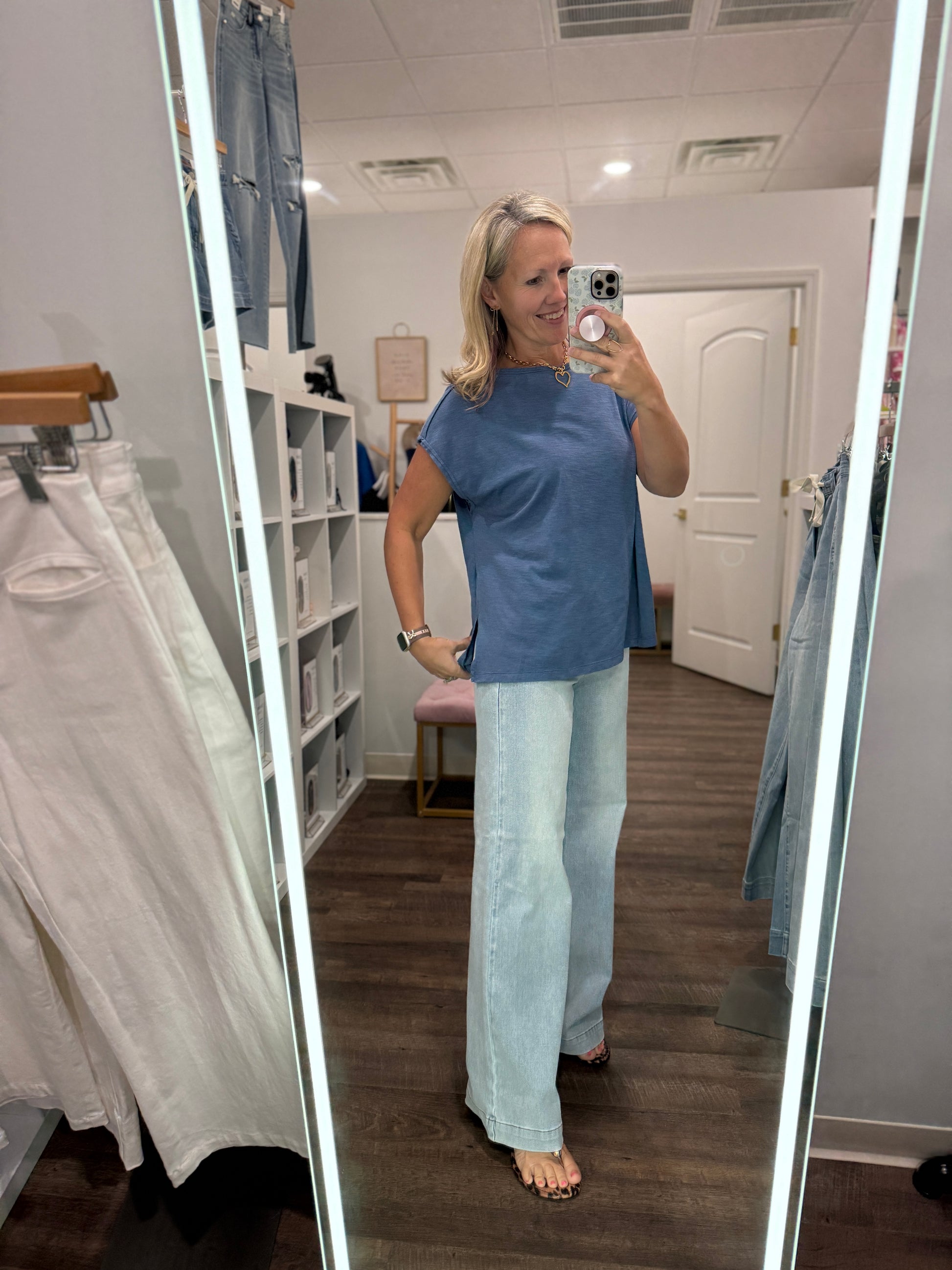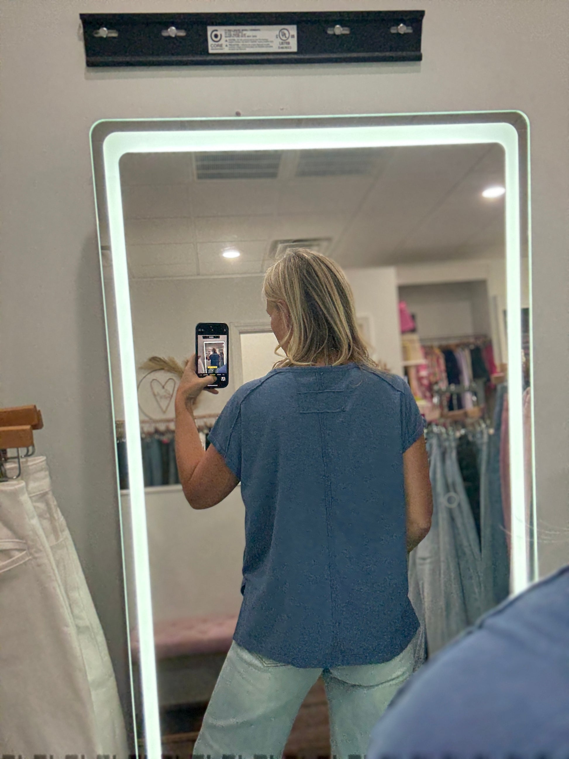 A relaxed, oversized silhouette, flattering flow, while side slits add just the right amount of sway and make front-tucking a breeze. The back features a center seam and exposed stitching, giving it that perfectly undone, casual-chic vibe.