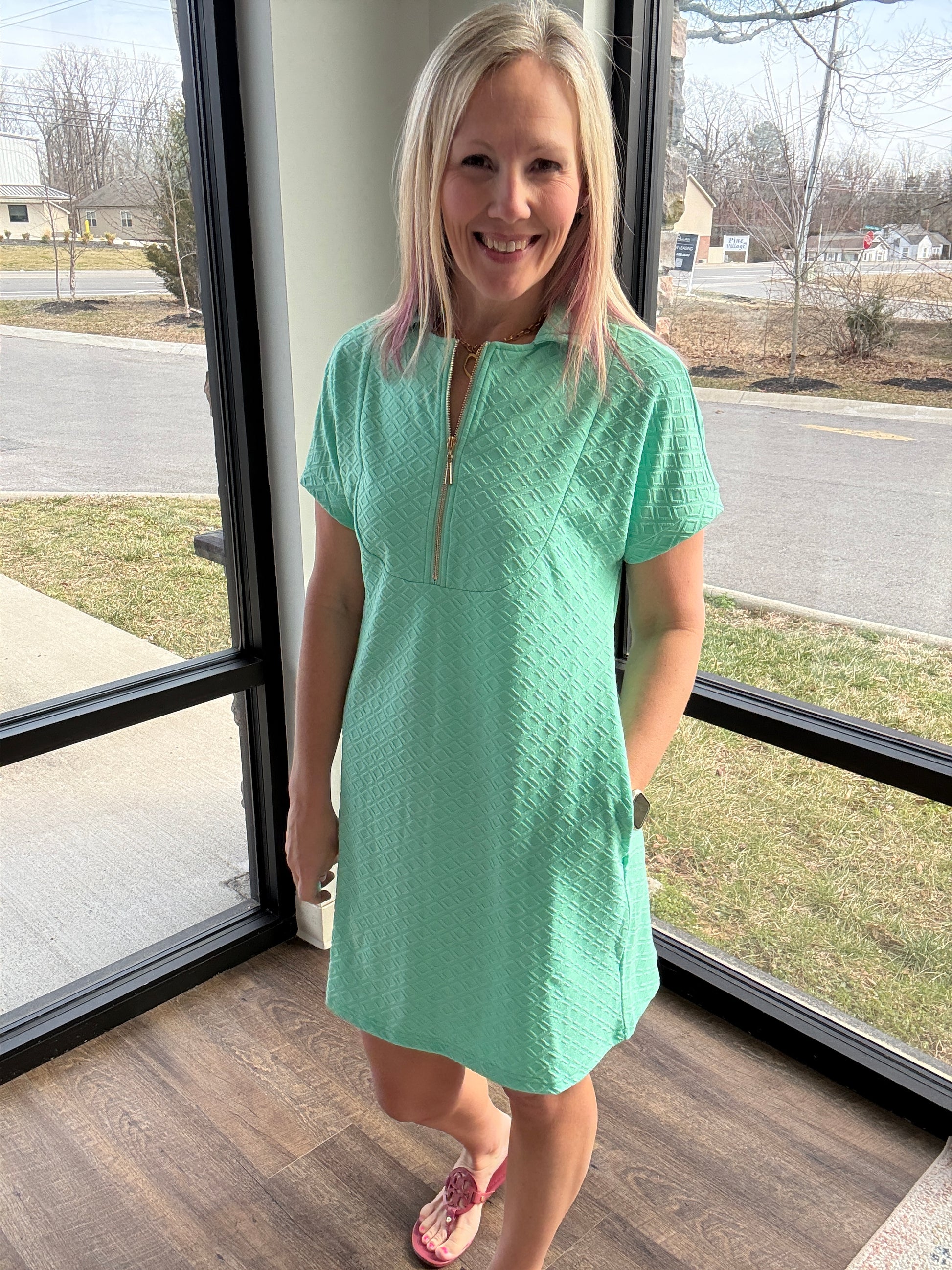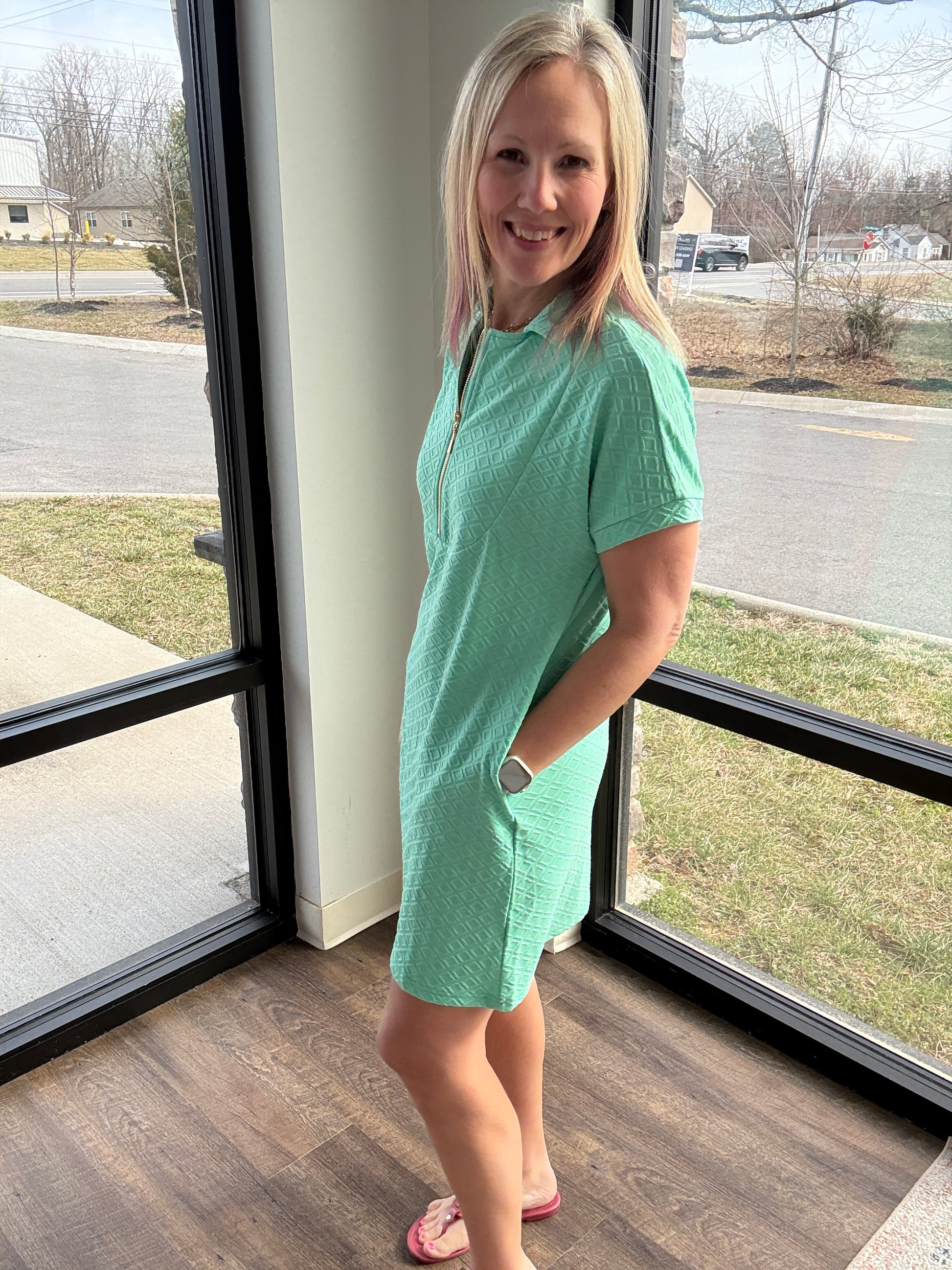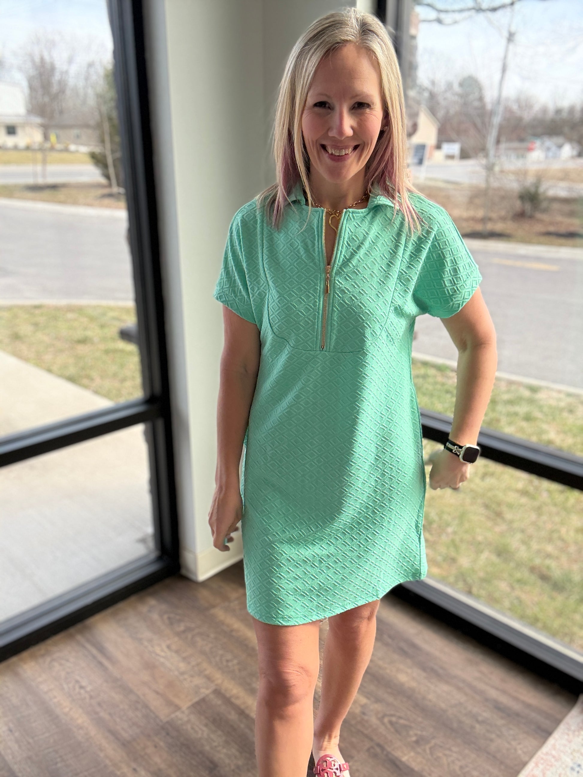 Fresh, polished, and made for spring moments — the Spearmint Zip Charm Dress is the perfect blend of playful color and effortless style. Designed in a beautiful spring green spearmint shade, this dress features a unique textured fabric that adds subtle dimension and interest.