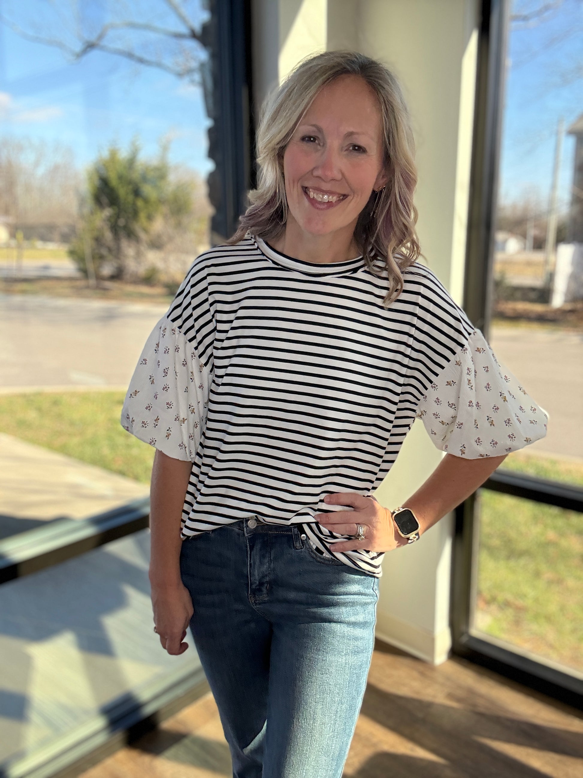 Bright, cheerful, and made for the season—the Spring Patchwork Puff Sleeve Top brings all the sunny-day energy you’ve been craving. Crafted from a super soft, stretchy knit, this top features a classic black-and-white striped bodice paired with bold floral puff sleeves for the perfect mix of playful and polished.