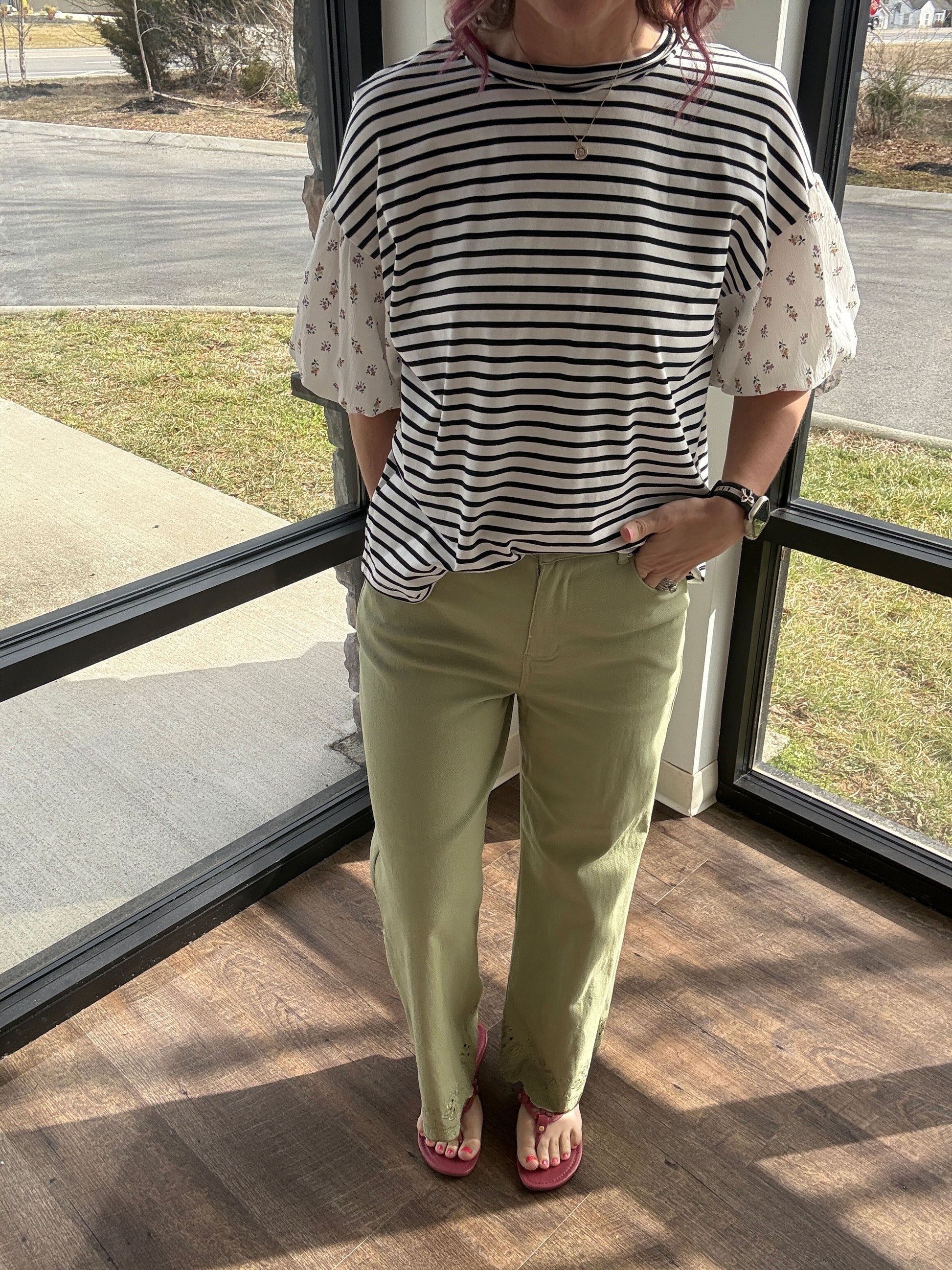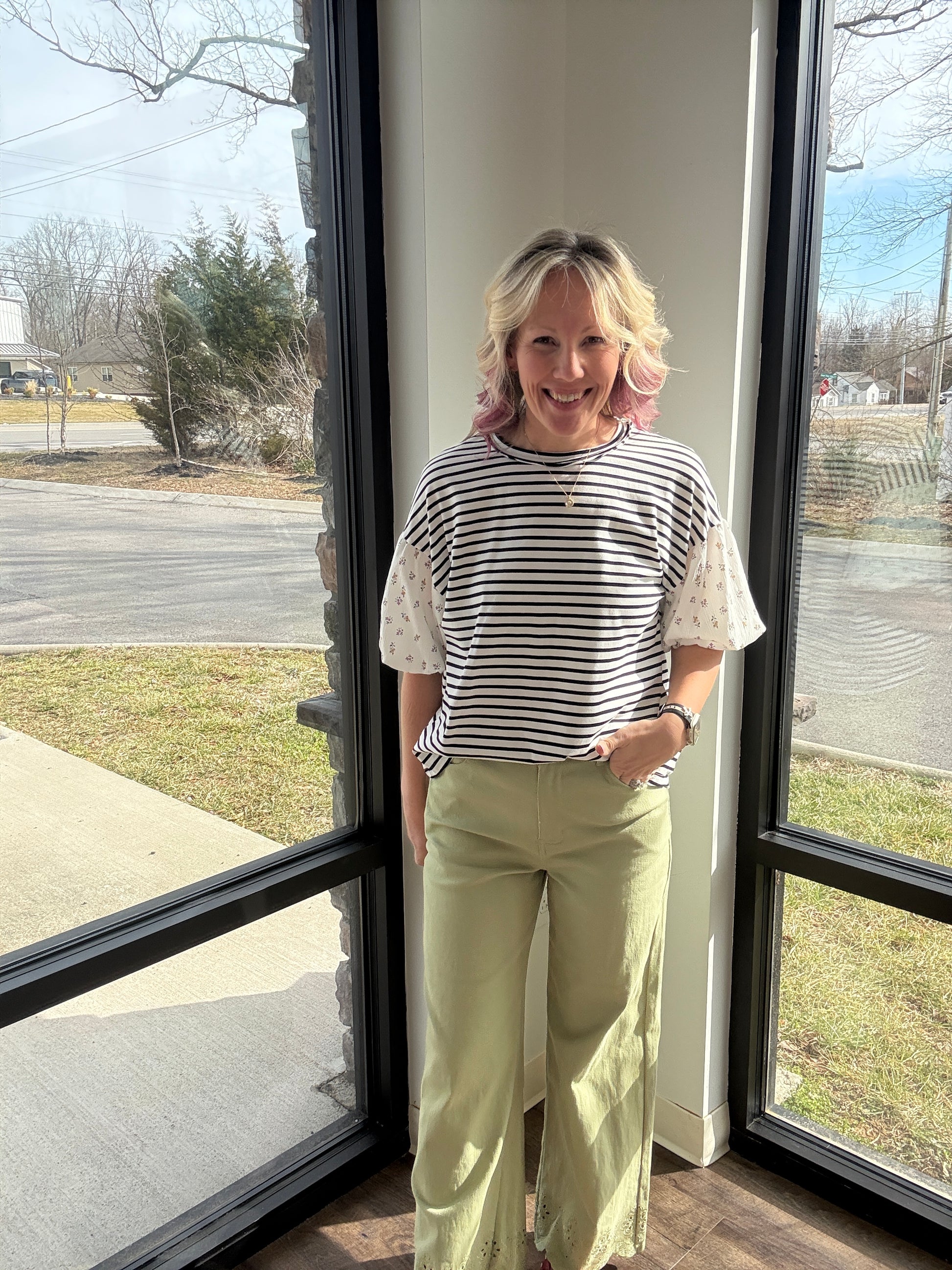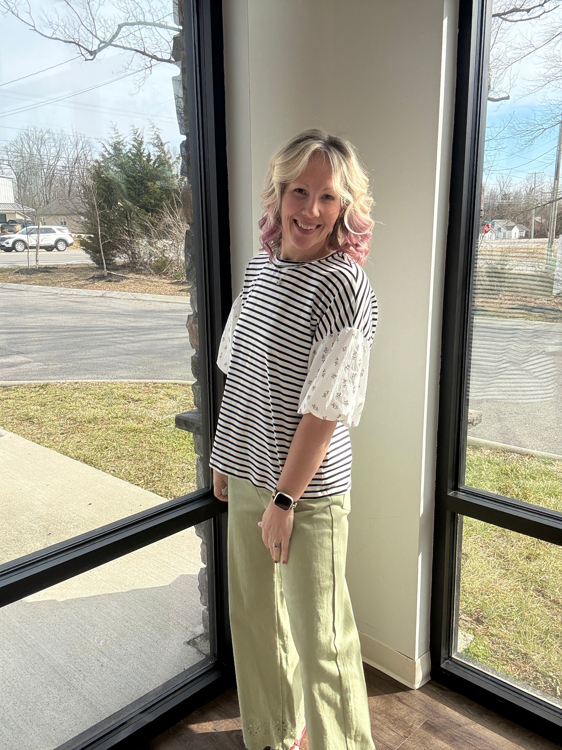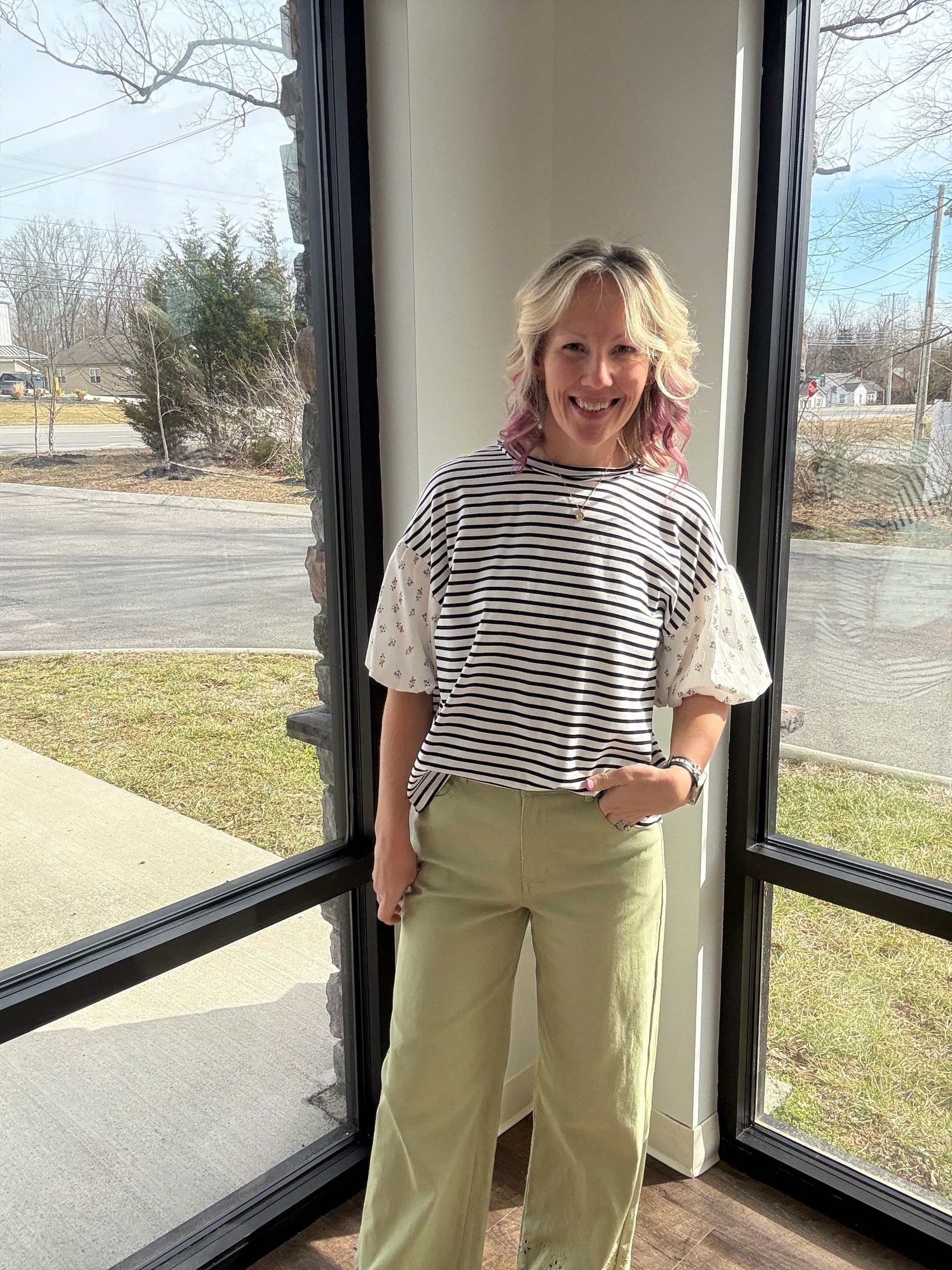 The round neckline and easy fit make it an everyday favorite, while the contrast sleeves add that boutique pop that sets it apart. It’s the top that truly screams spring—lightweight, comfy, and bursting with personality.