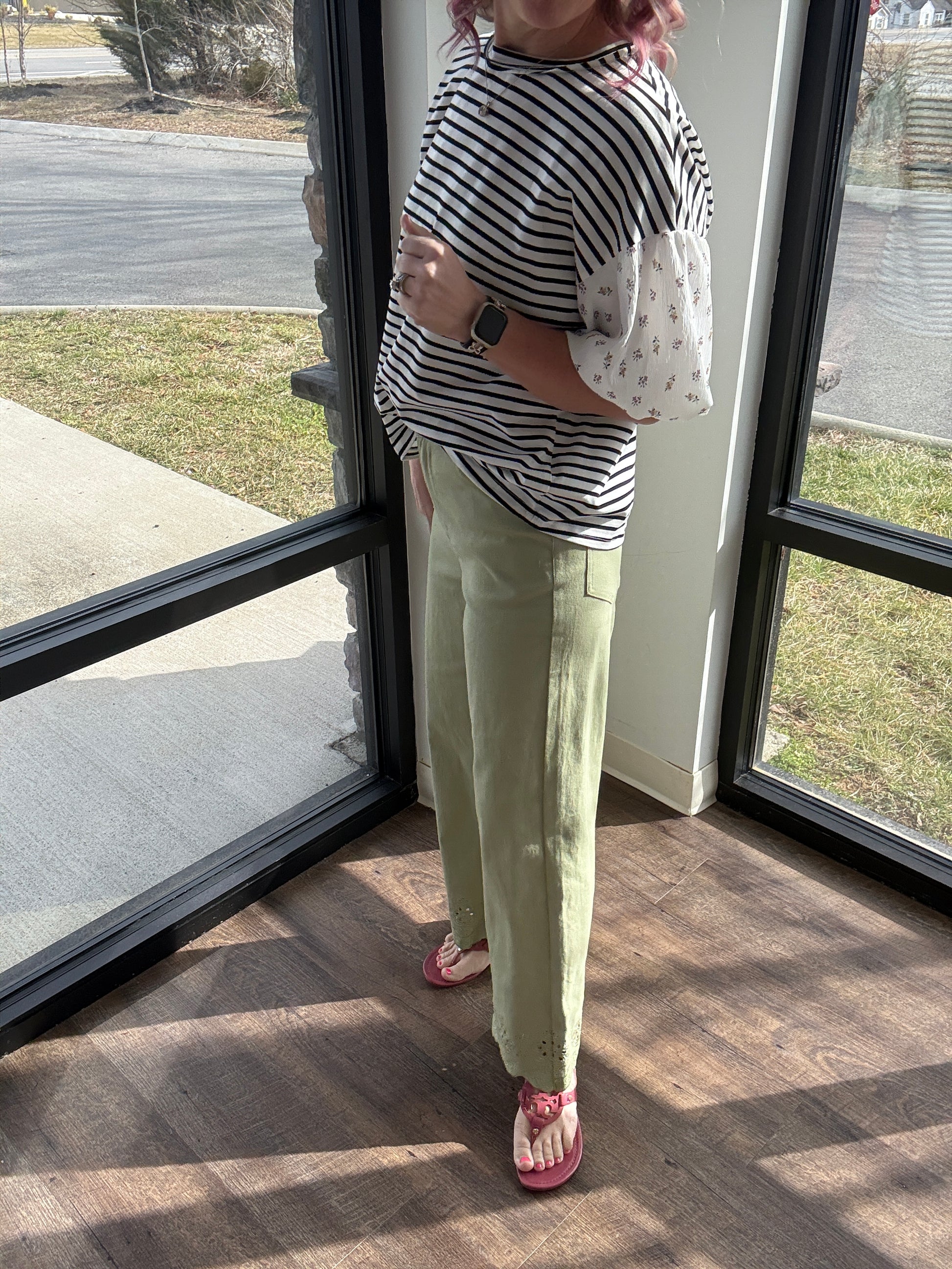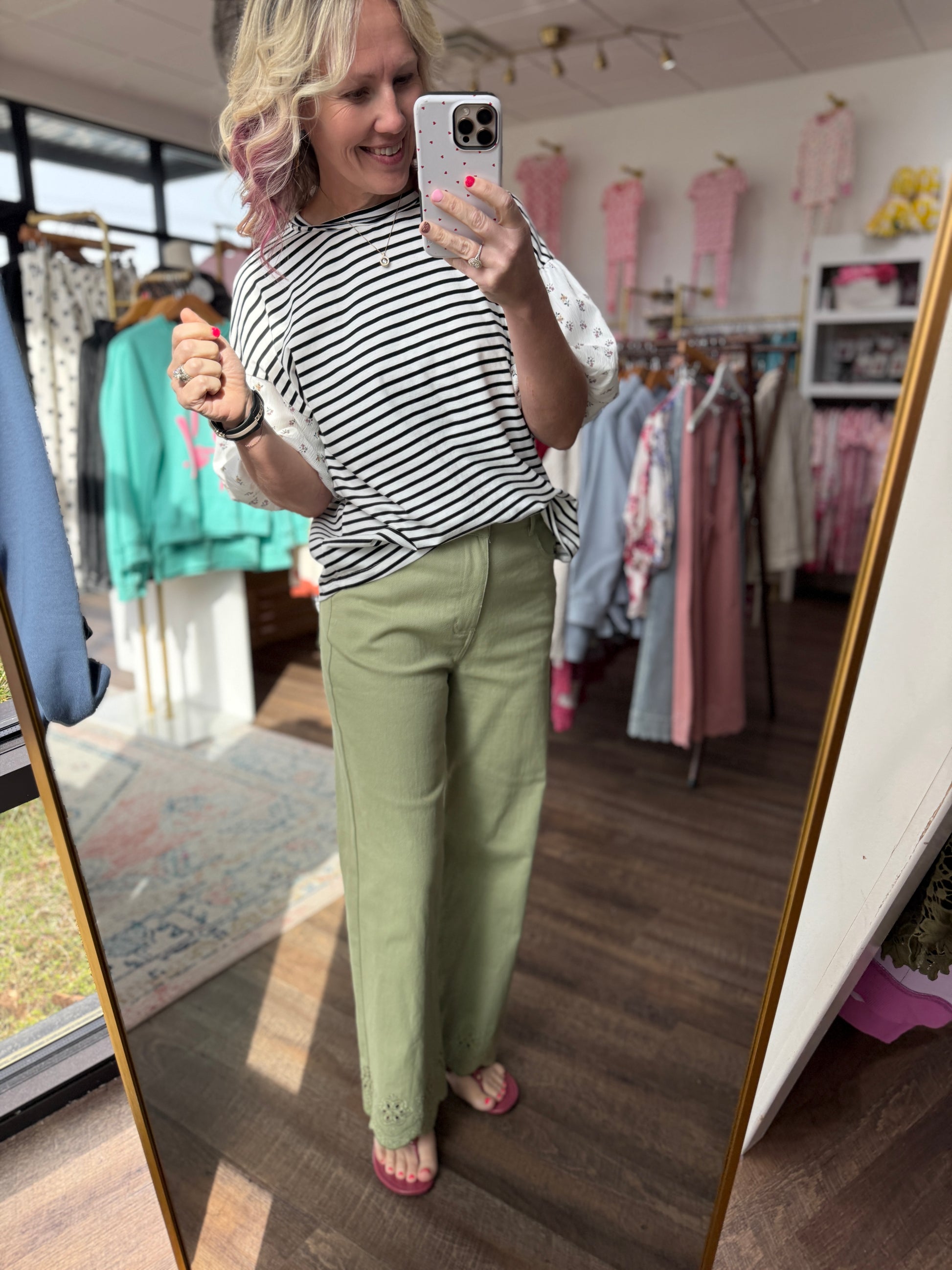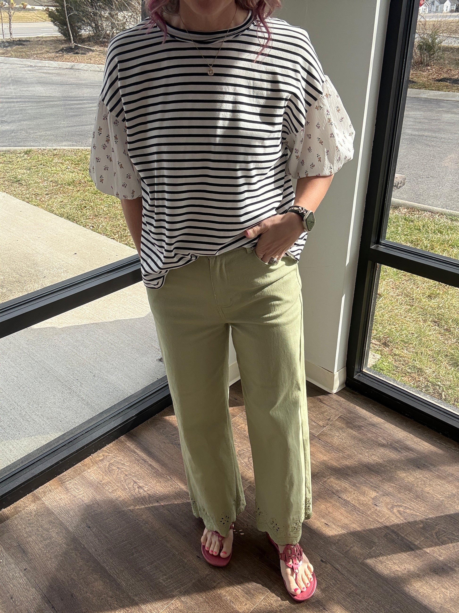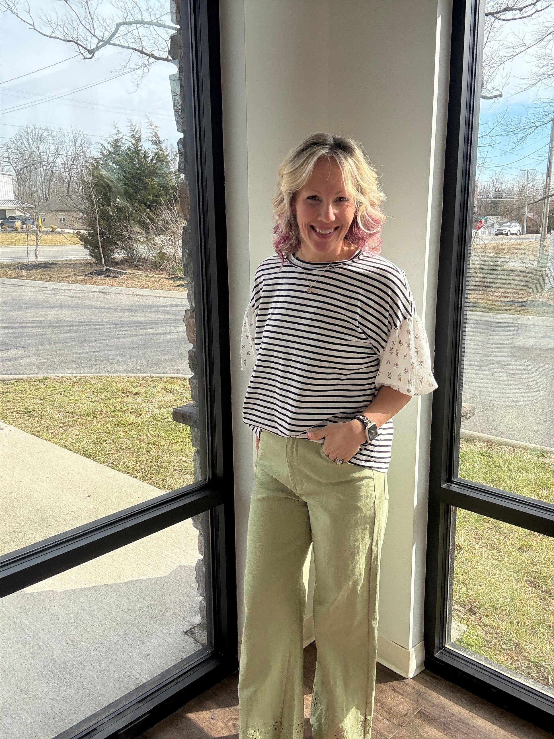 The round neckline and easy fit make it an everyday favorite, while the contrast sleeves add that boutique pop that sets it apart. It’s the top that truly screams spring—lightweight, comfy, and bursting with personality.