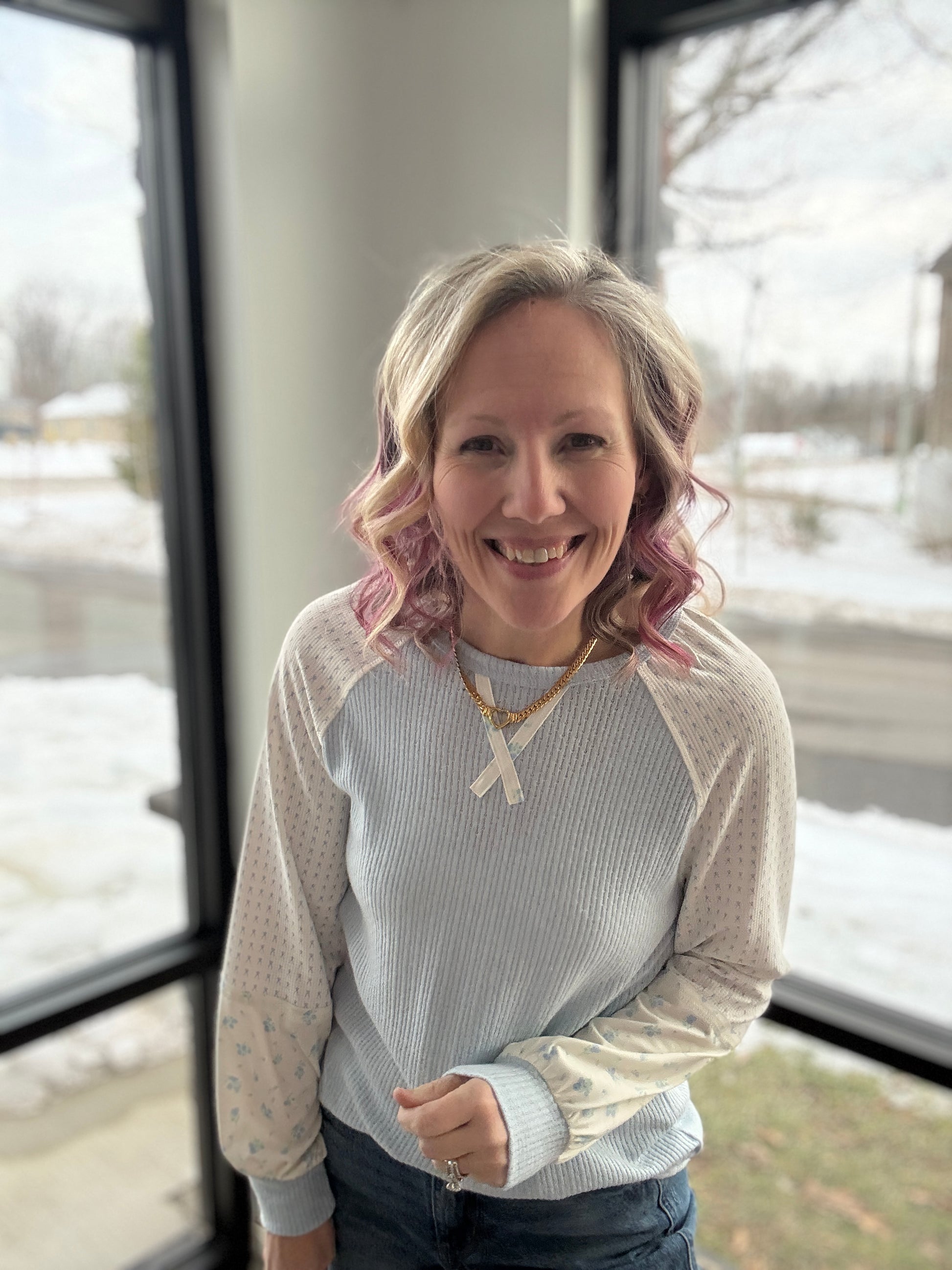 The mix of textures and prints gives this top that boutique-loved look while still feeling easy and wearable. Lightweight yet cozy, it’s ideal for transitional weather and effortless everyday styling. Pair it with your favorite denim, white jeans, or layer it under a vest for a fresh spring outfit.