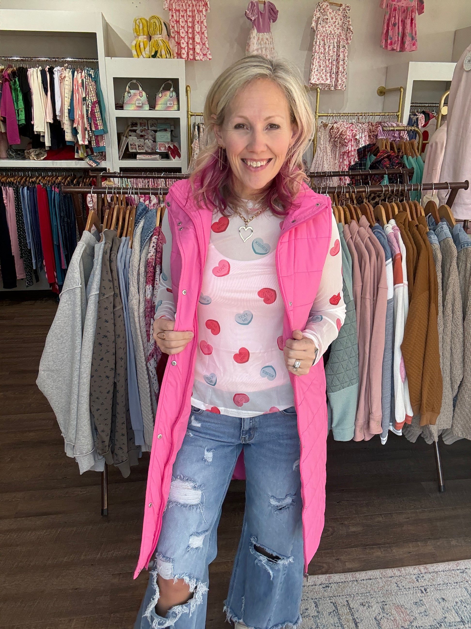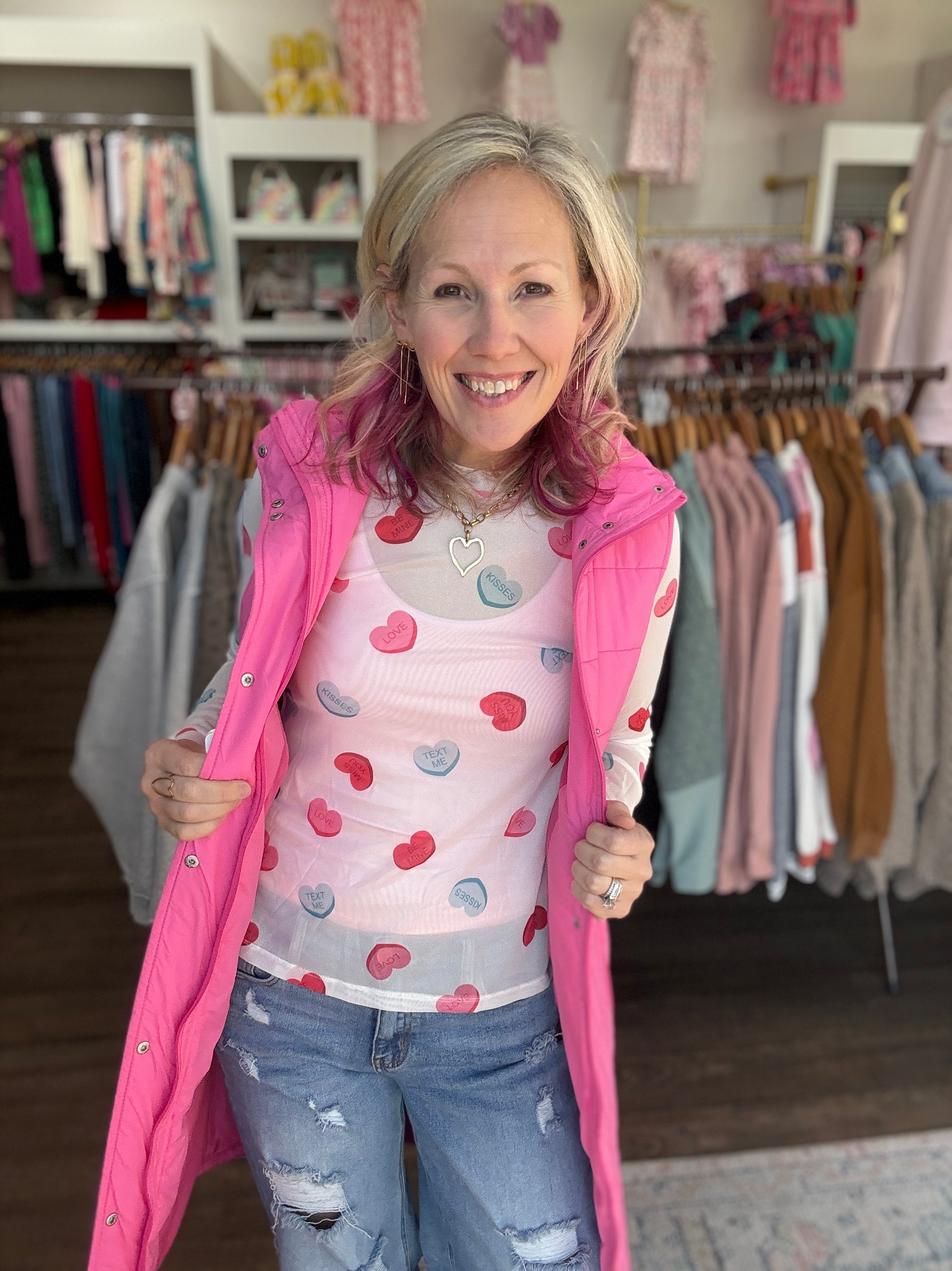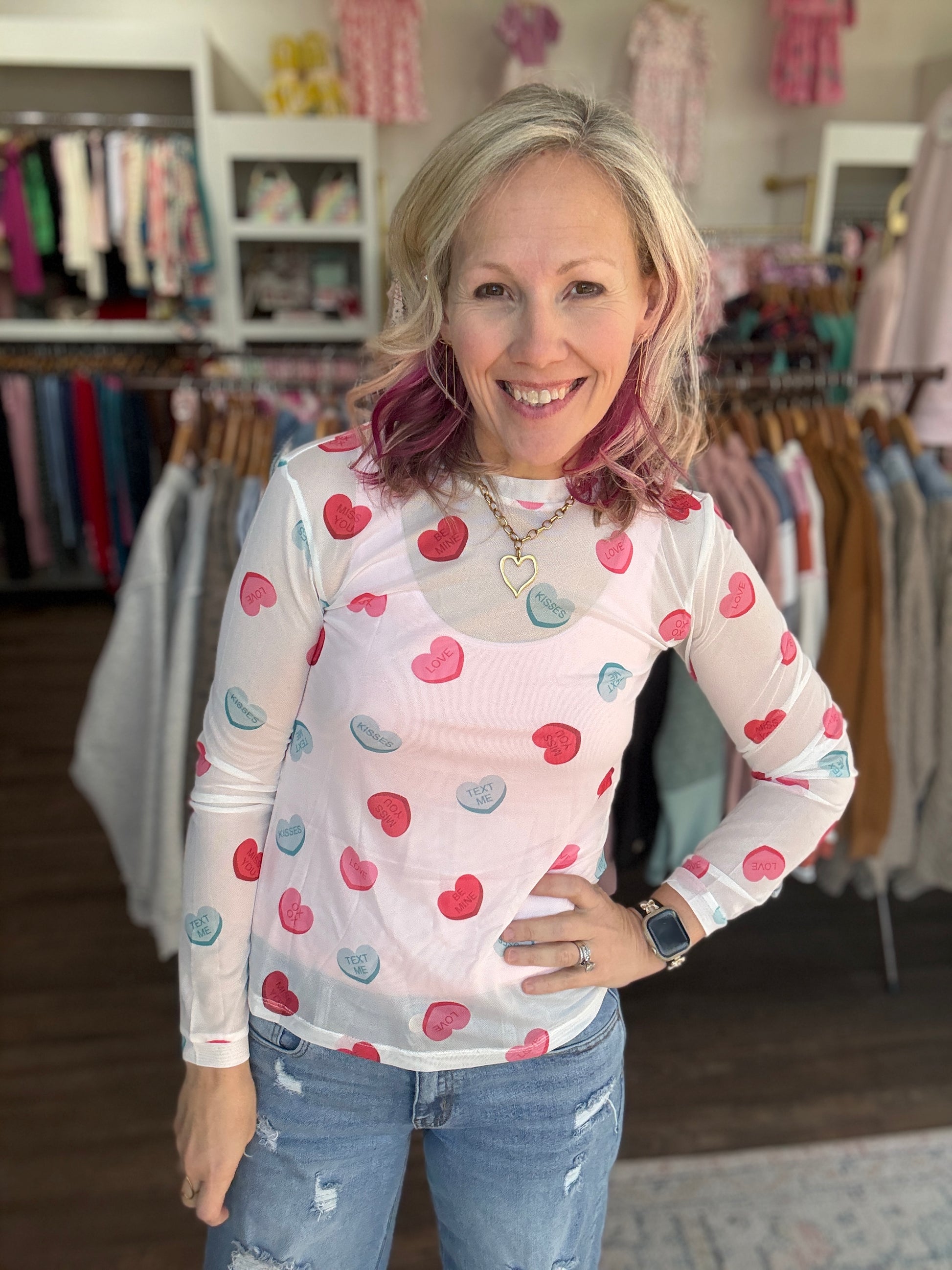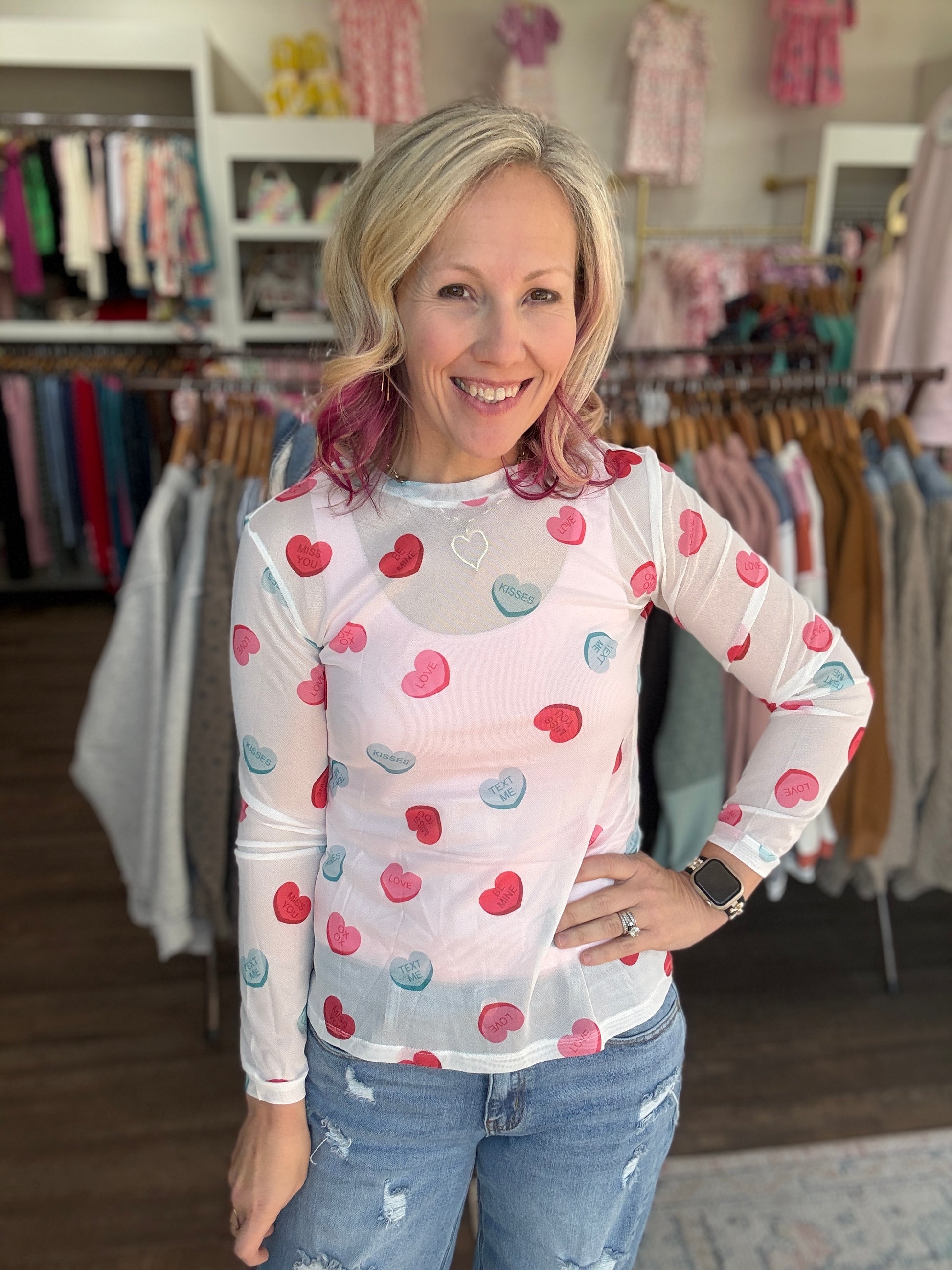 Add a flirty pop to your Valentine’s looks with the Sweethearts Mesh Layering Top. This sheer white mesh top is sprinkled with red, pink, and light blue hearts for the prettiest playful vibe that’s made for layering.
